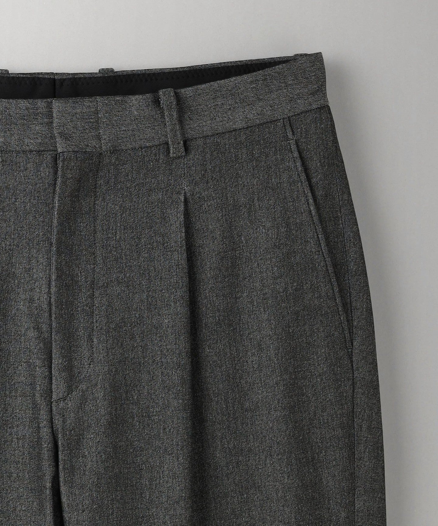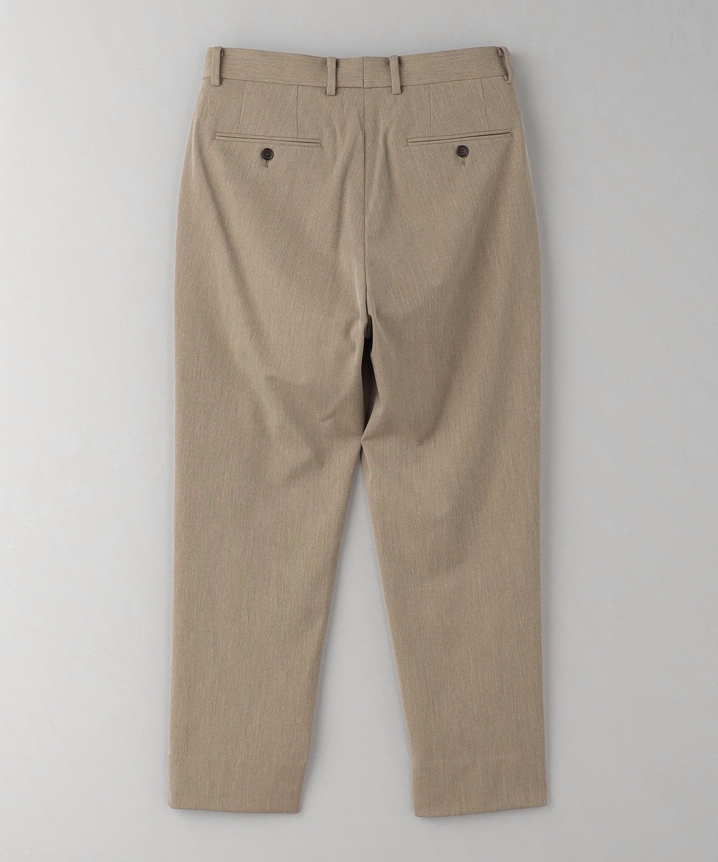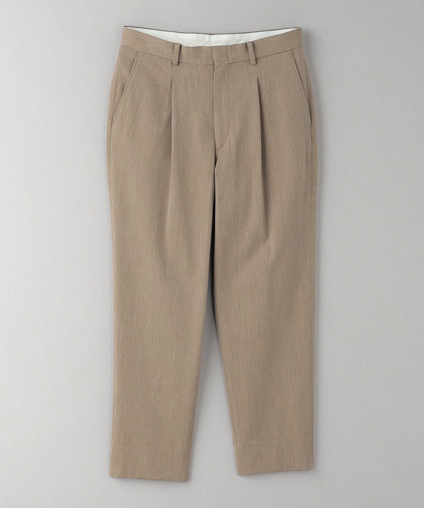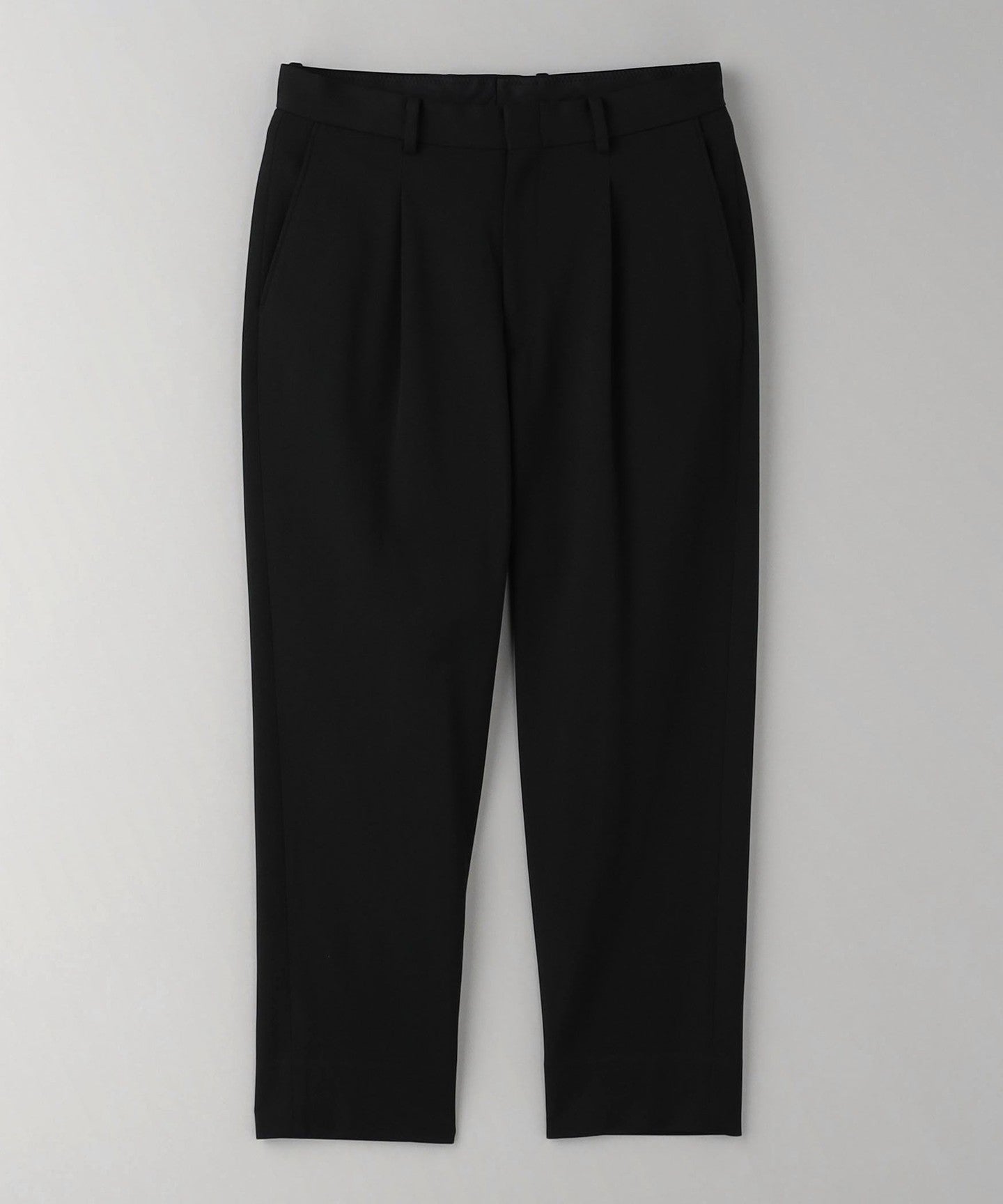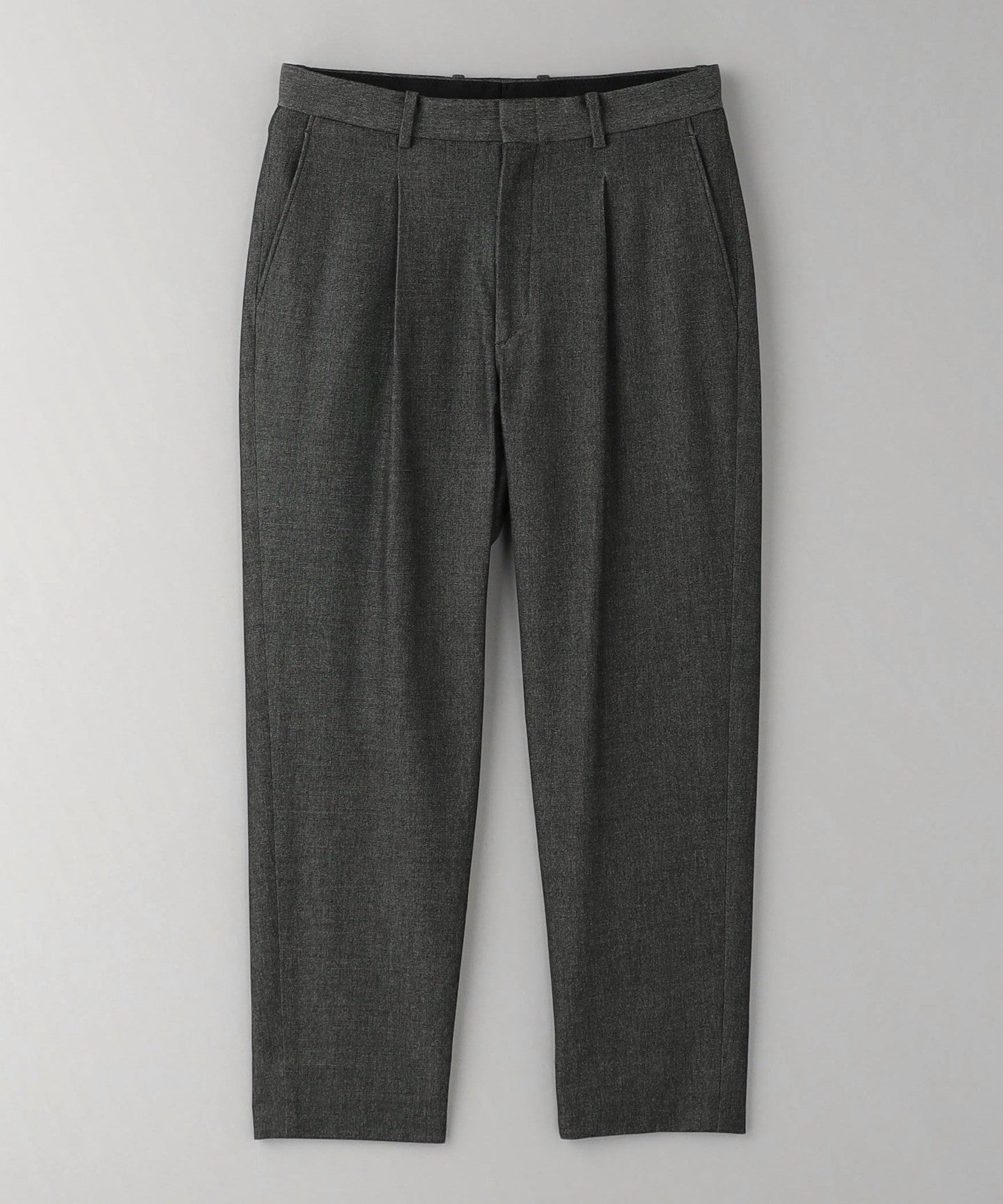 There are tucks around the waist to give room from the hips to the thighs, and the tapered silhouette gradually narrows towards the hem.