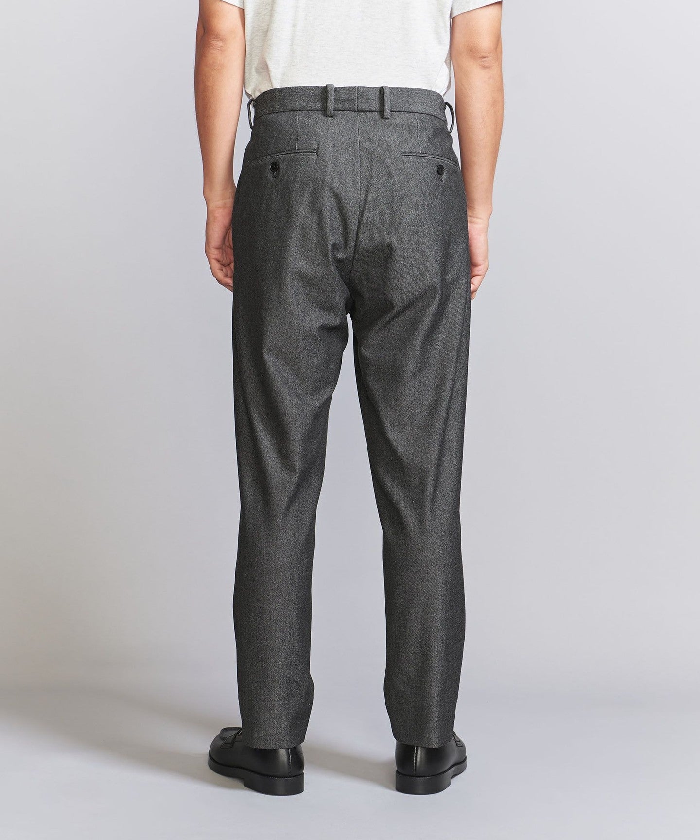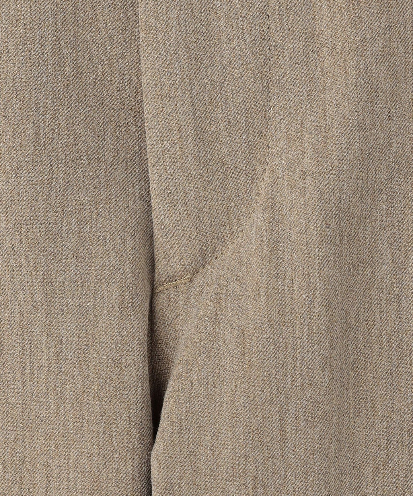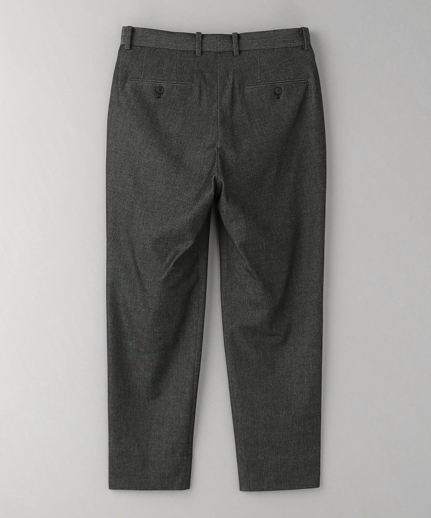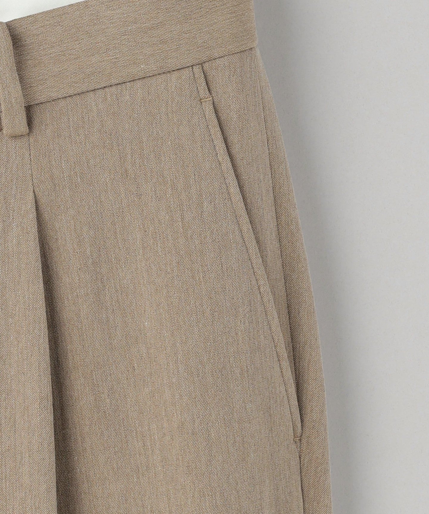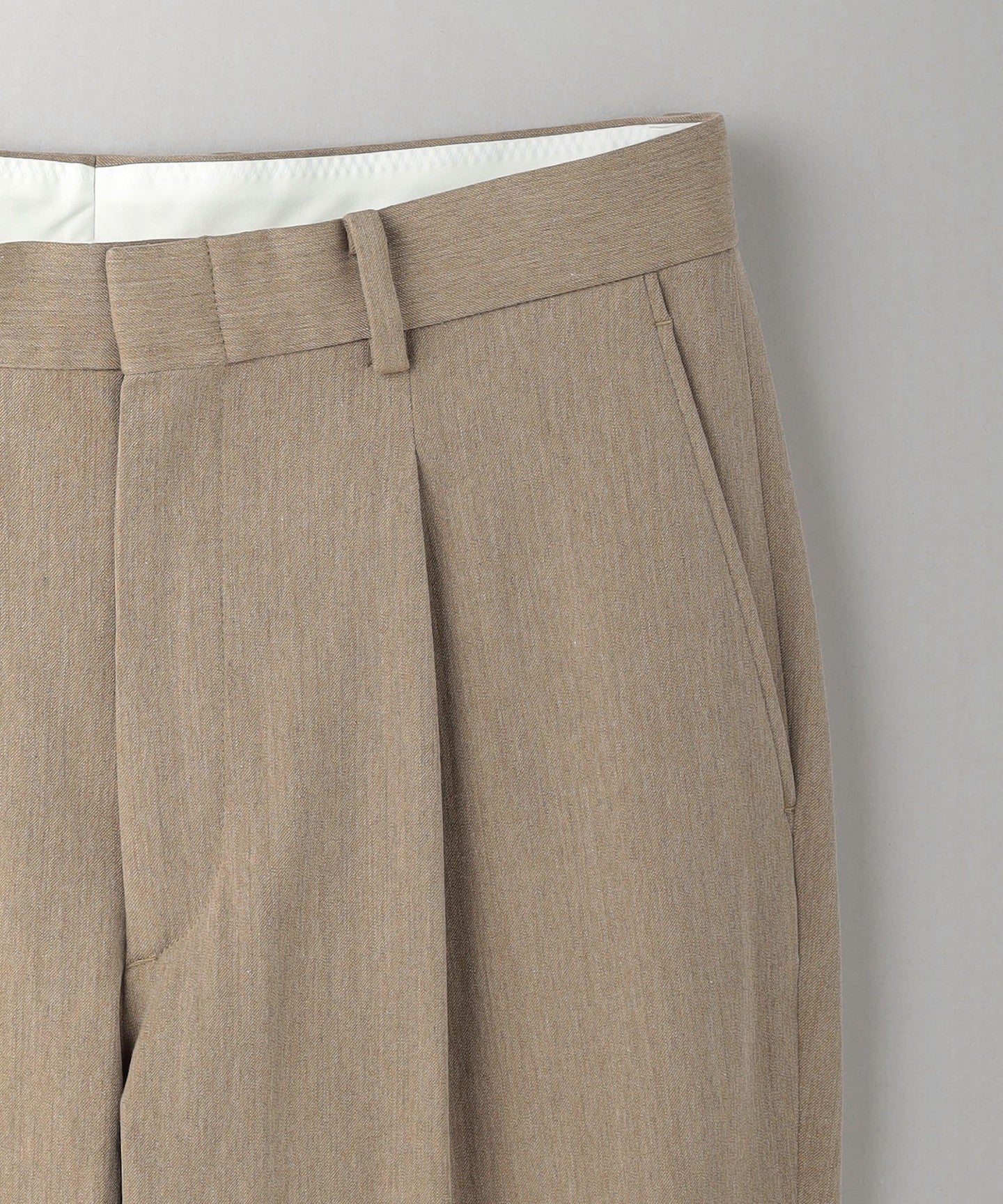 There are tucks around the waist to give room from the hips to the thighs, and the tapered silhouette gradually narrows towards the hem.