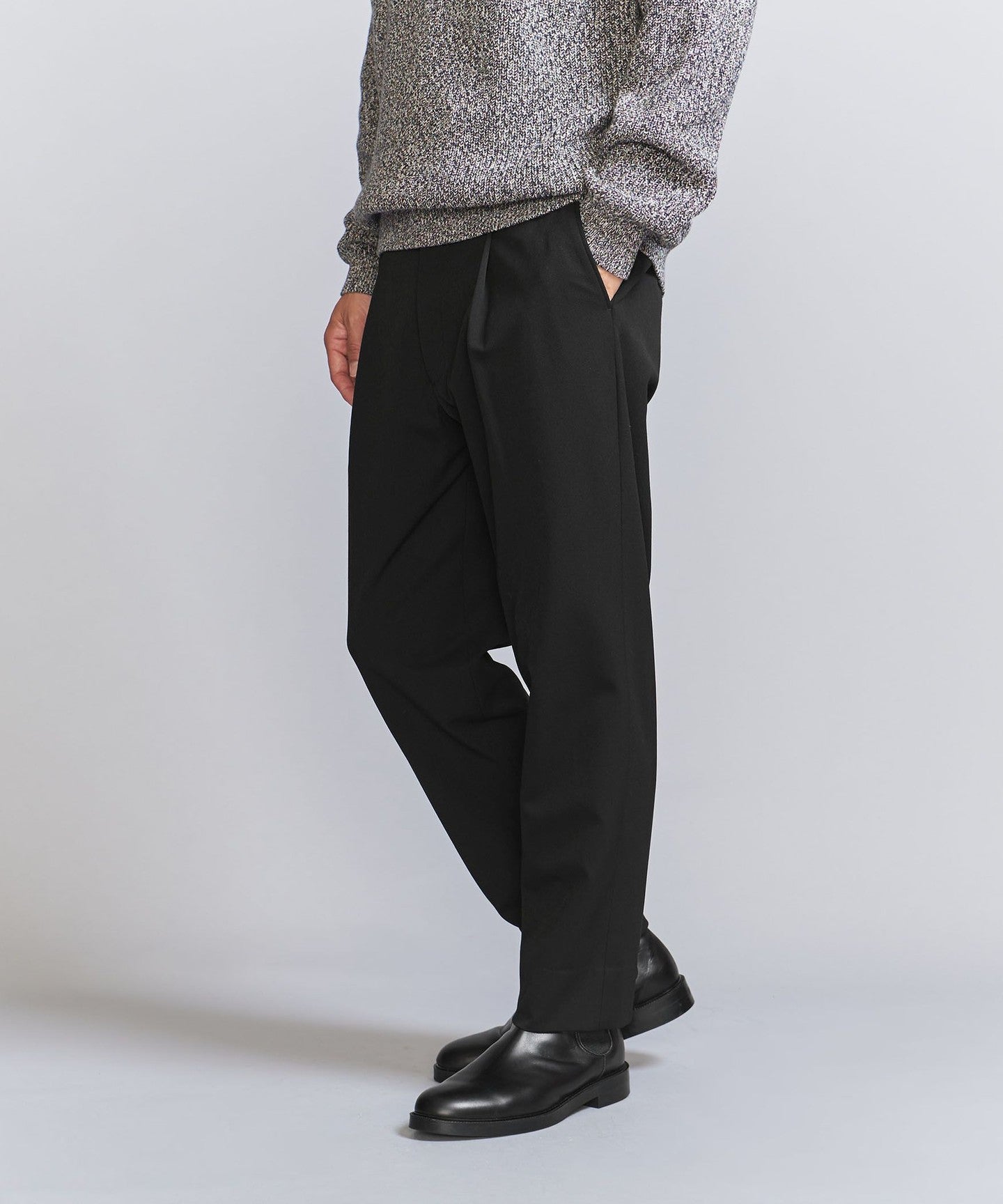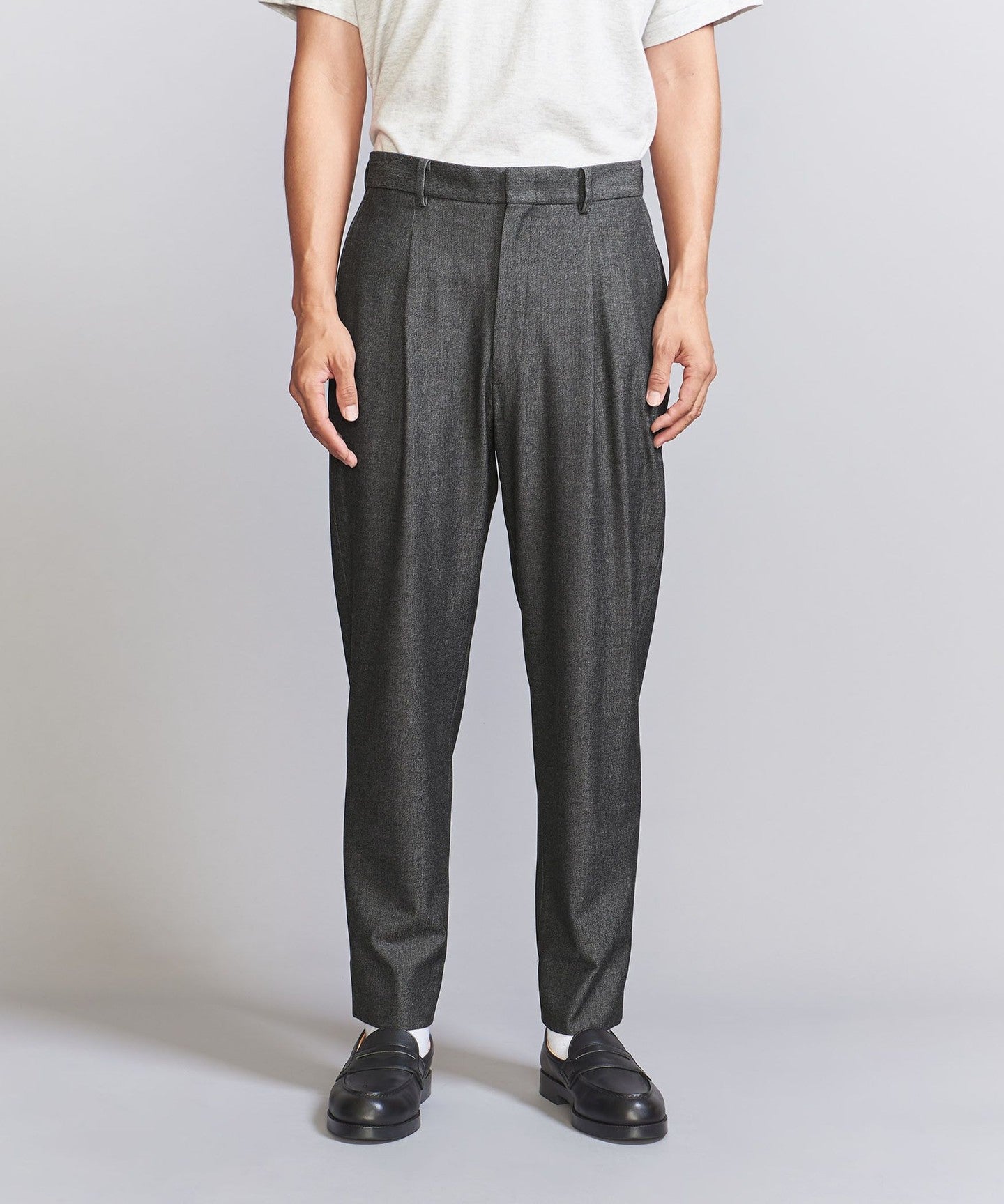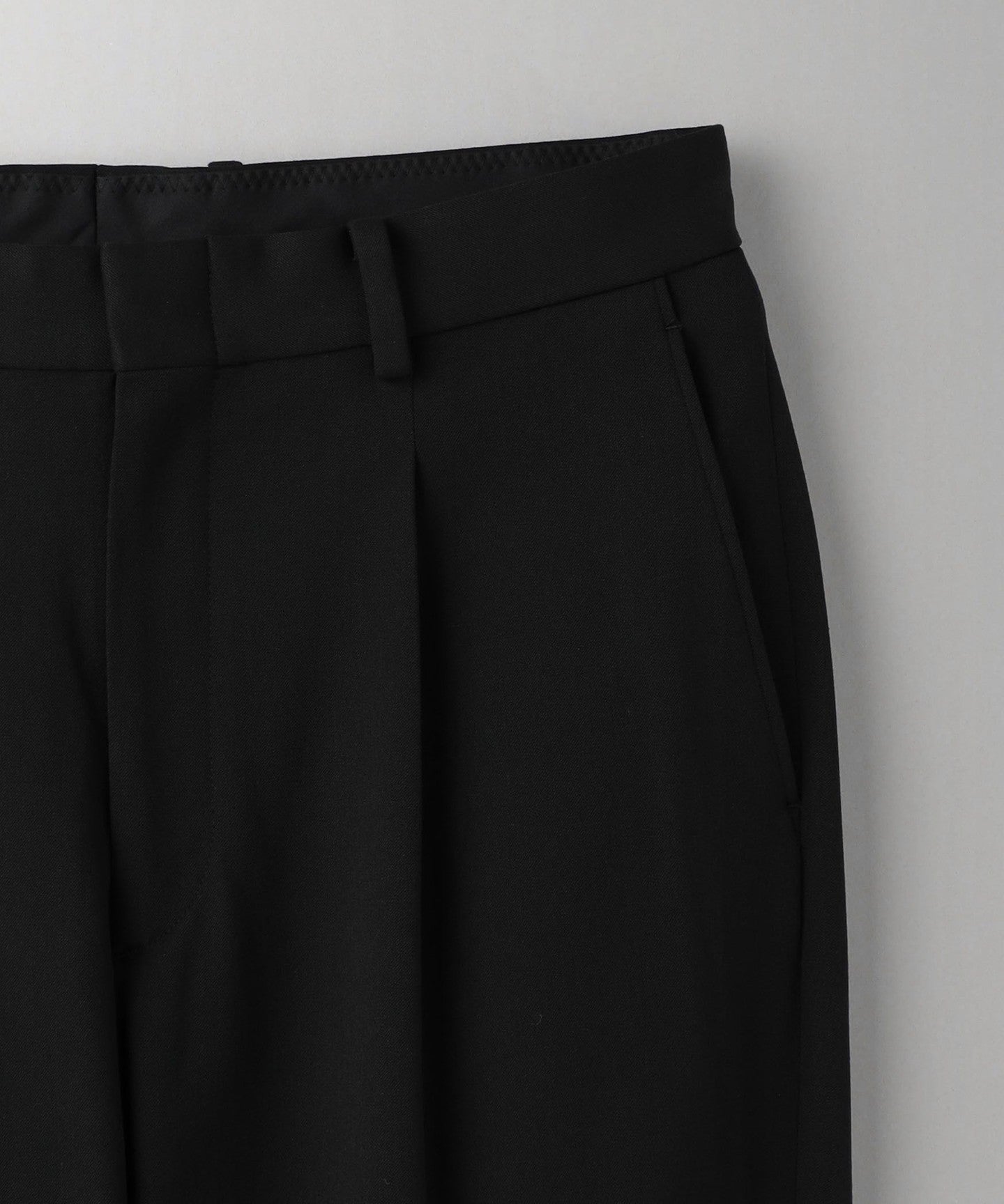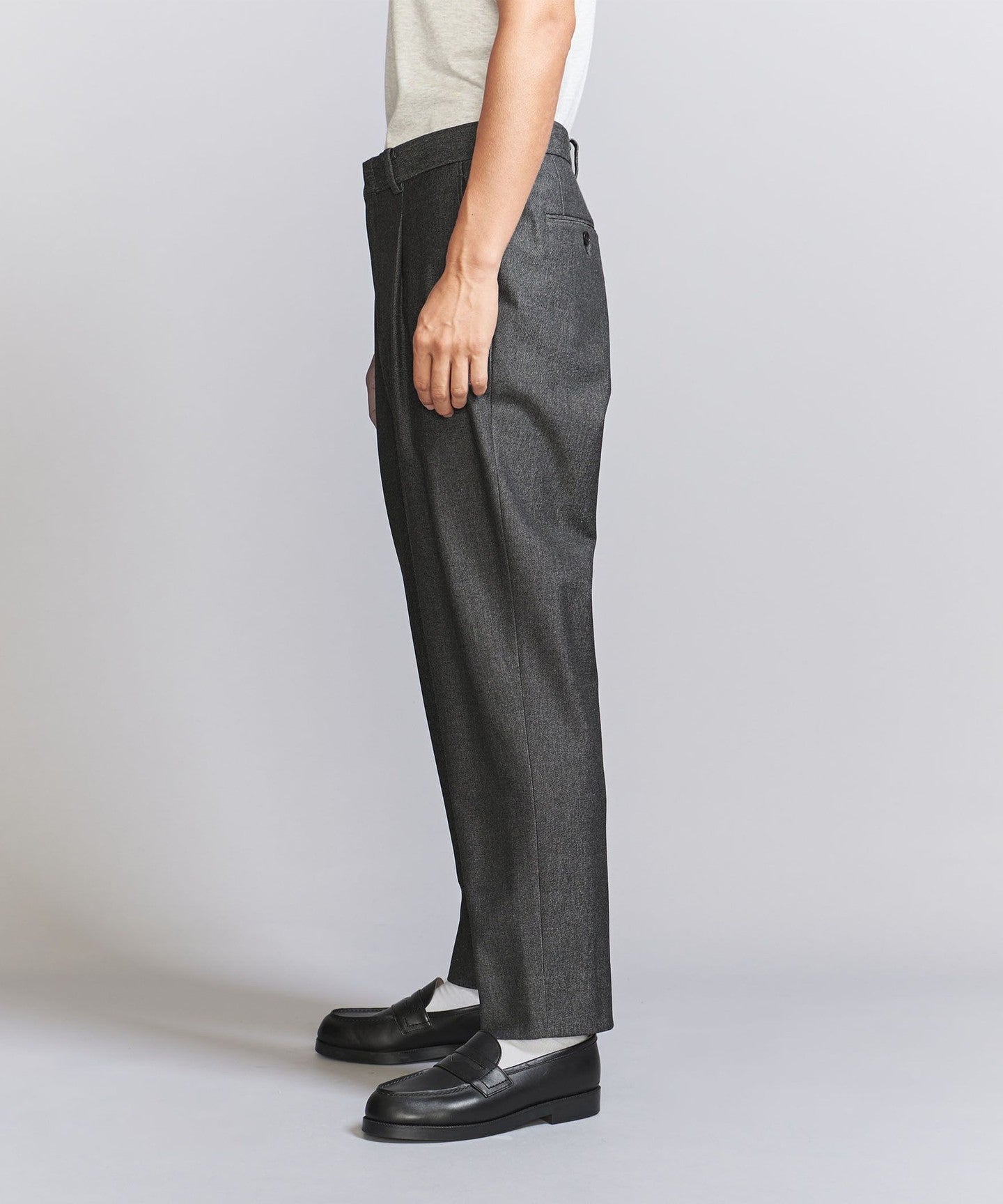 There are tucks around the waist to give room from the hips to the thighs, and the tapered silhouette gradually narrows towards the hem.