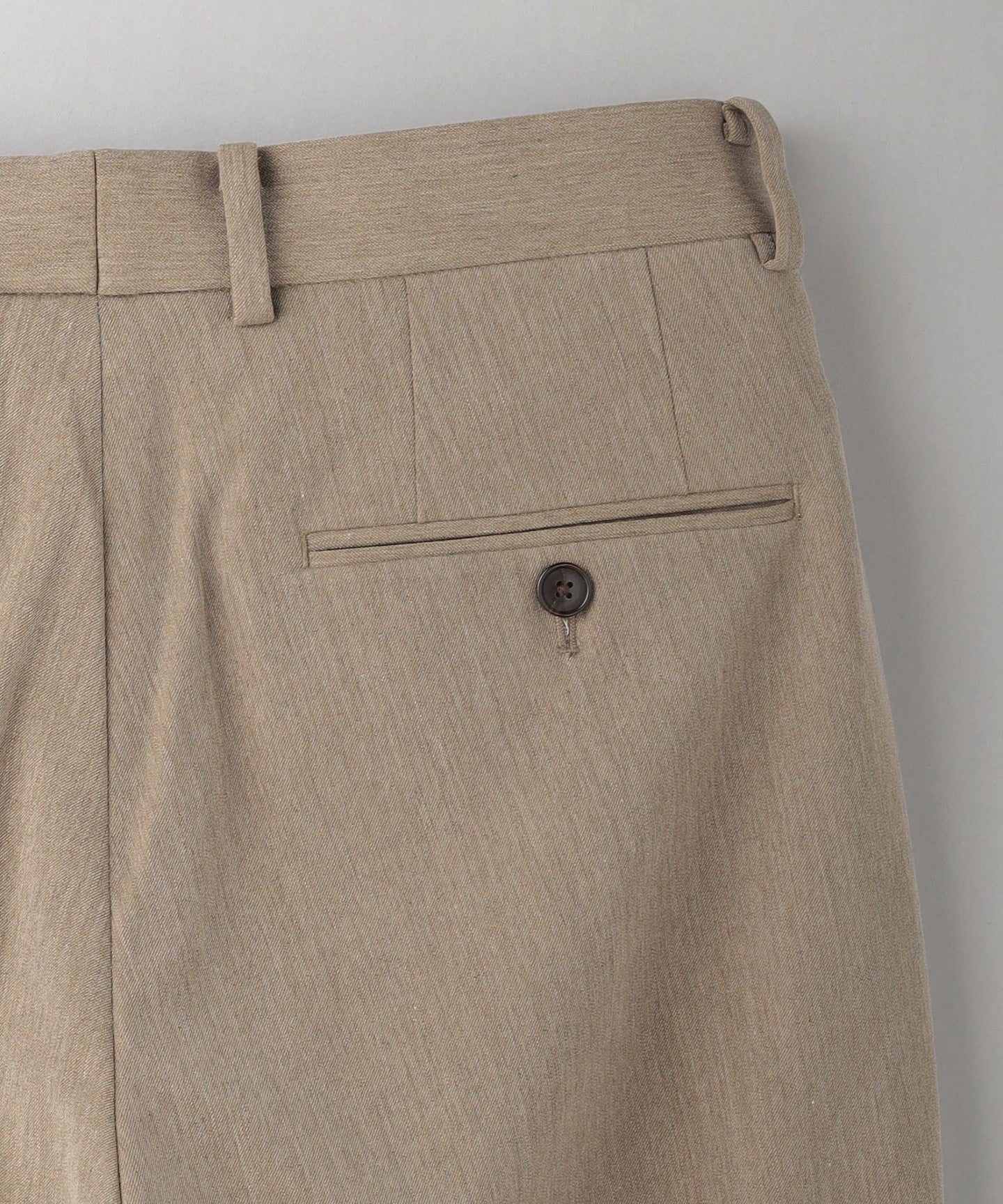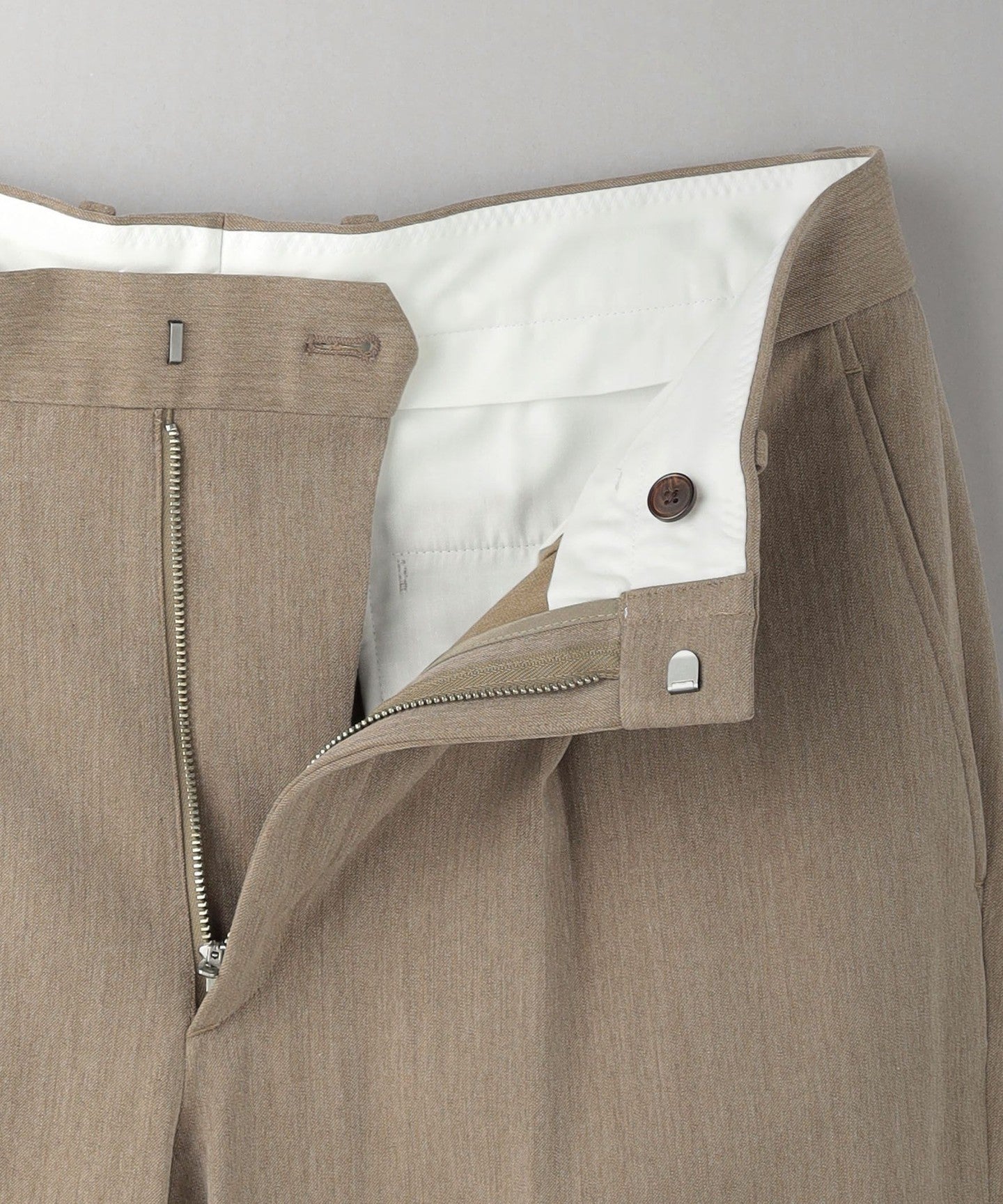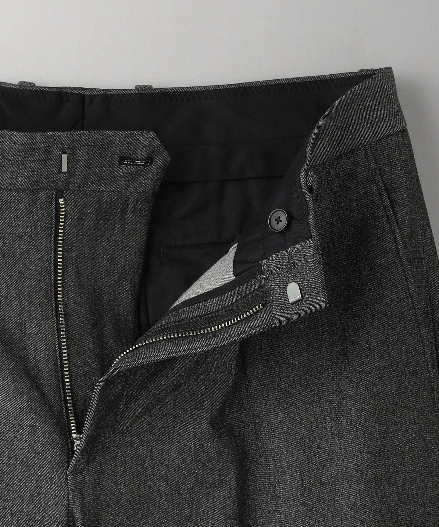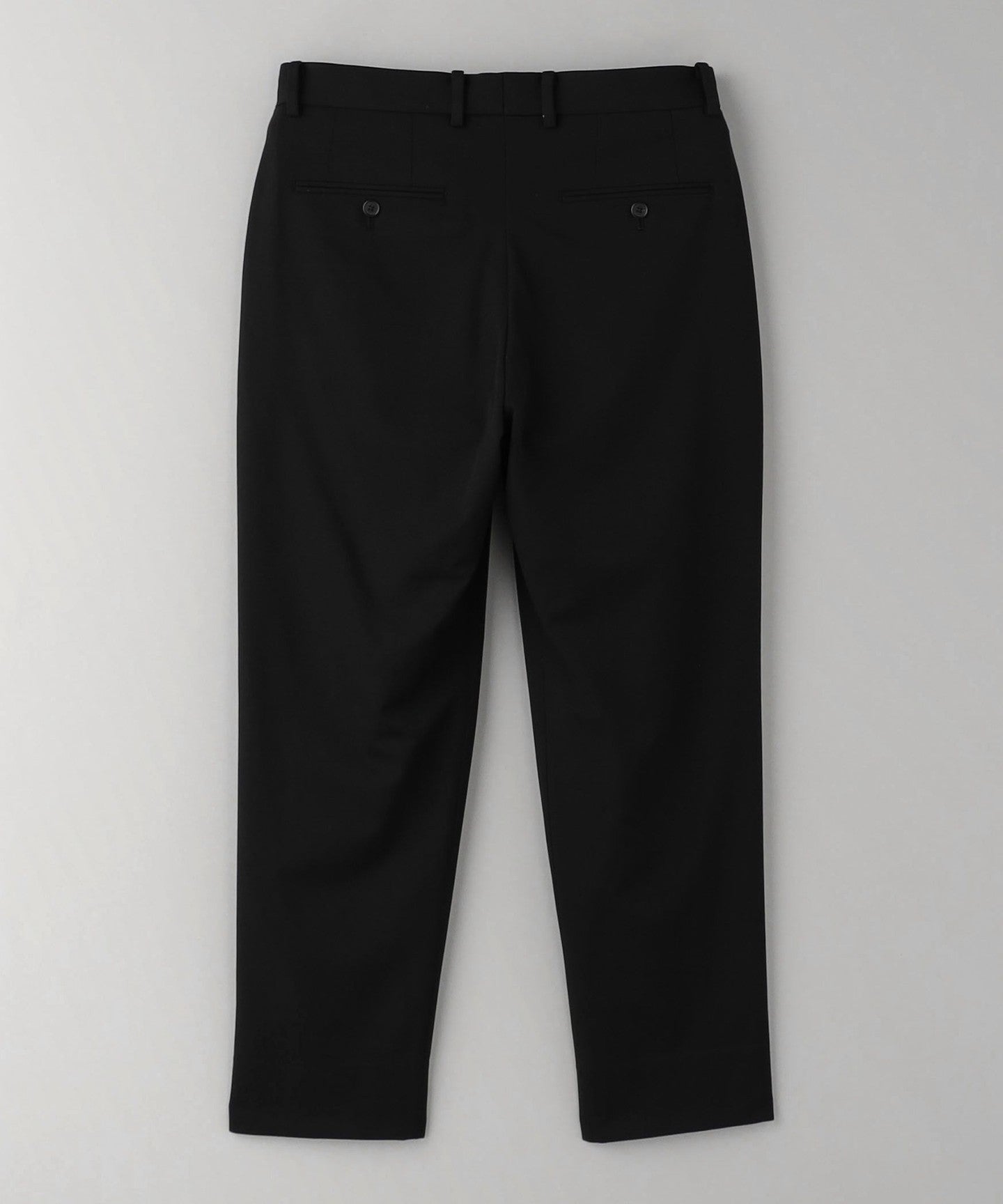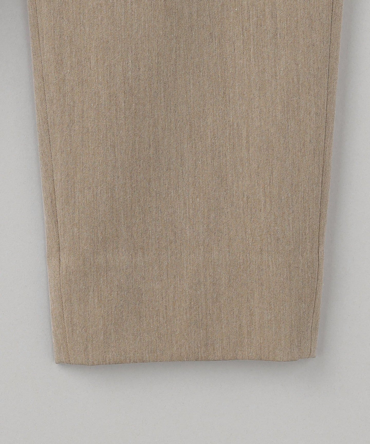 There are tucks around the waist to give room from the hips to the thighs, and the tapered silhouette gradually narrows towards the hem.