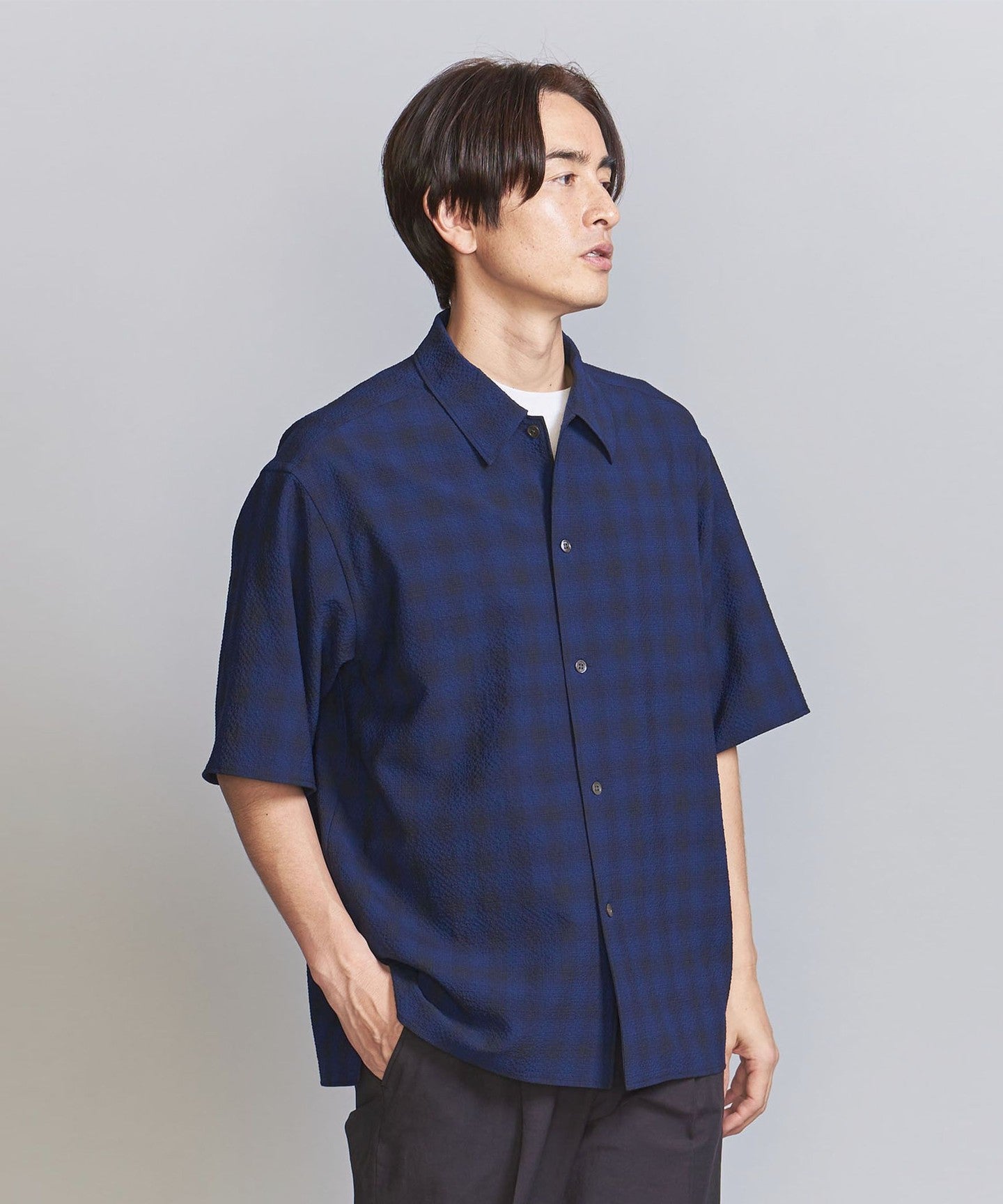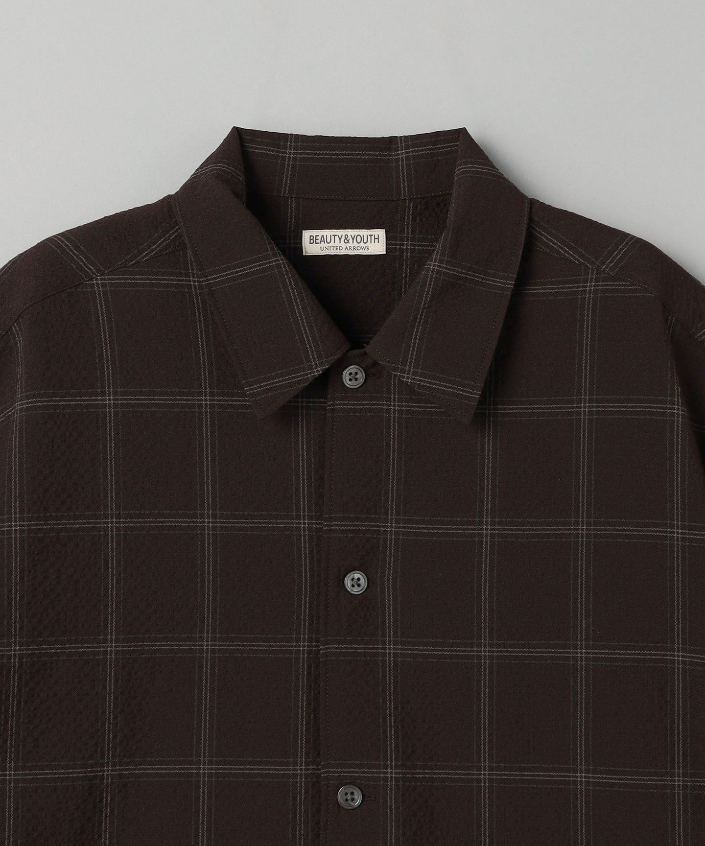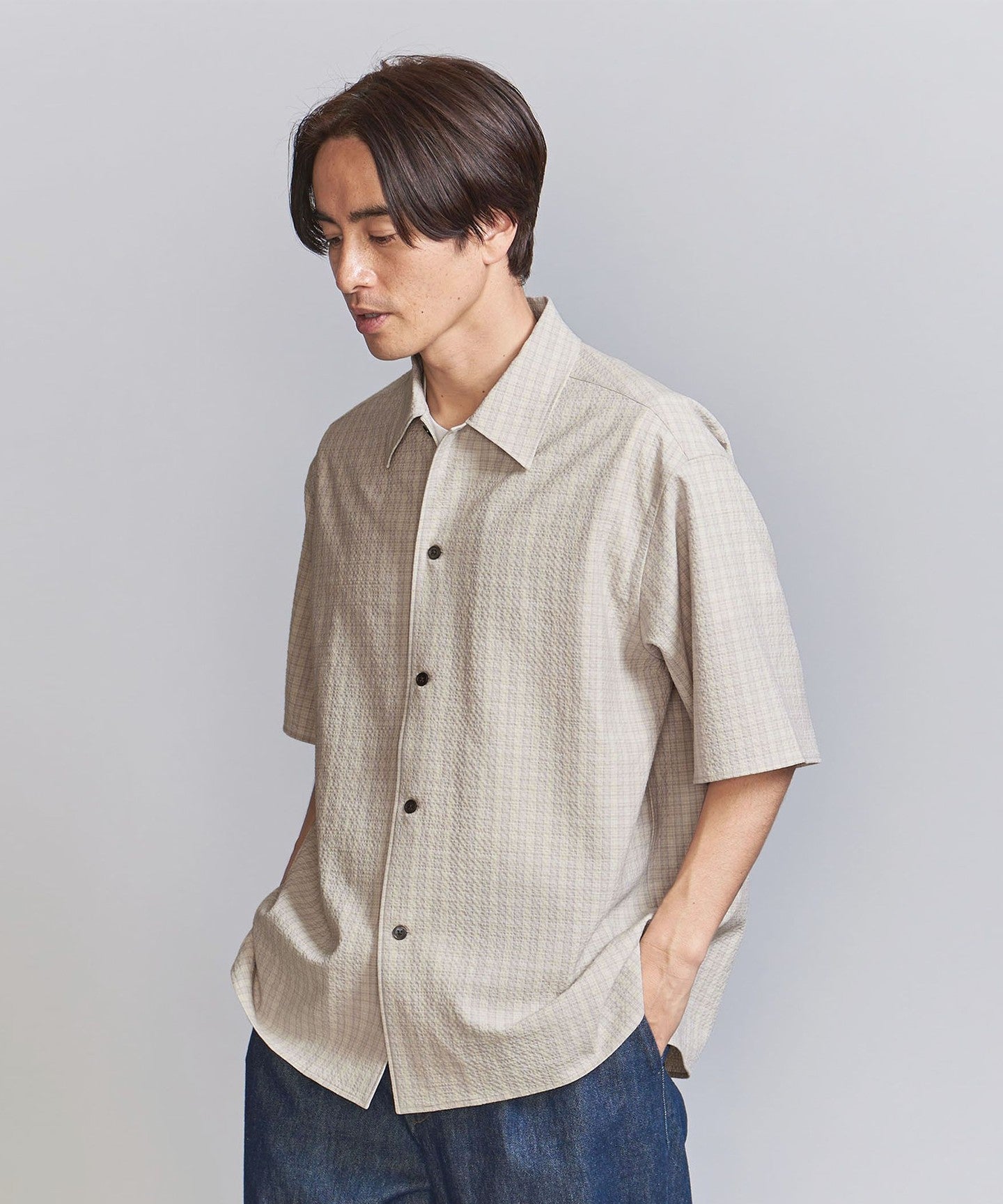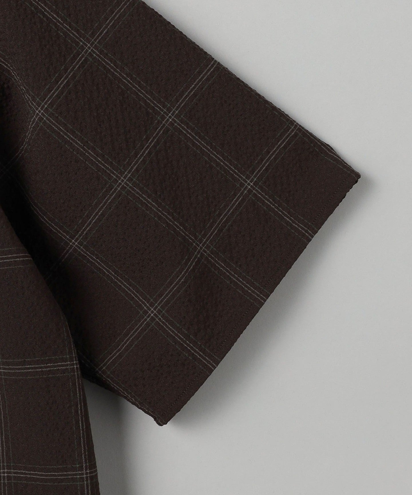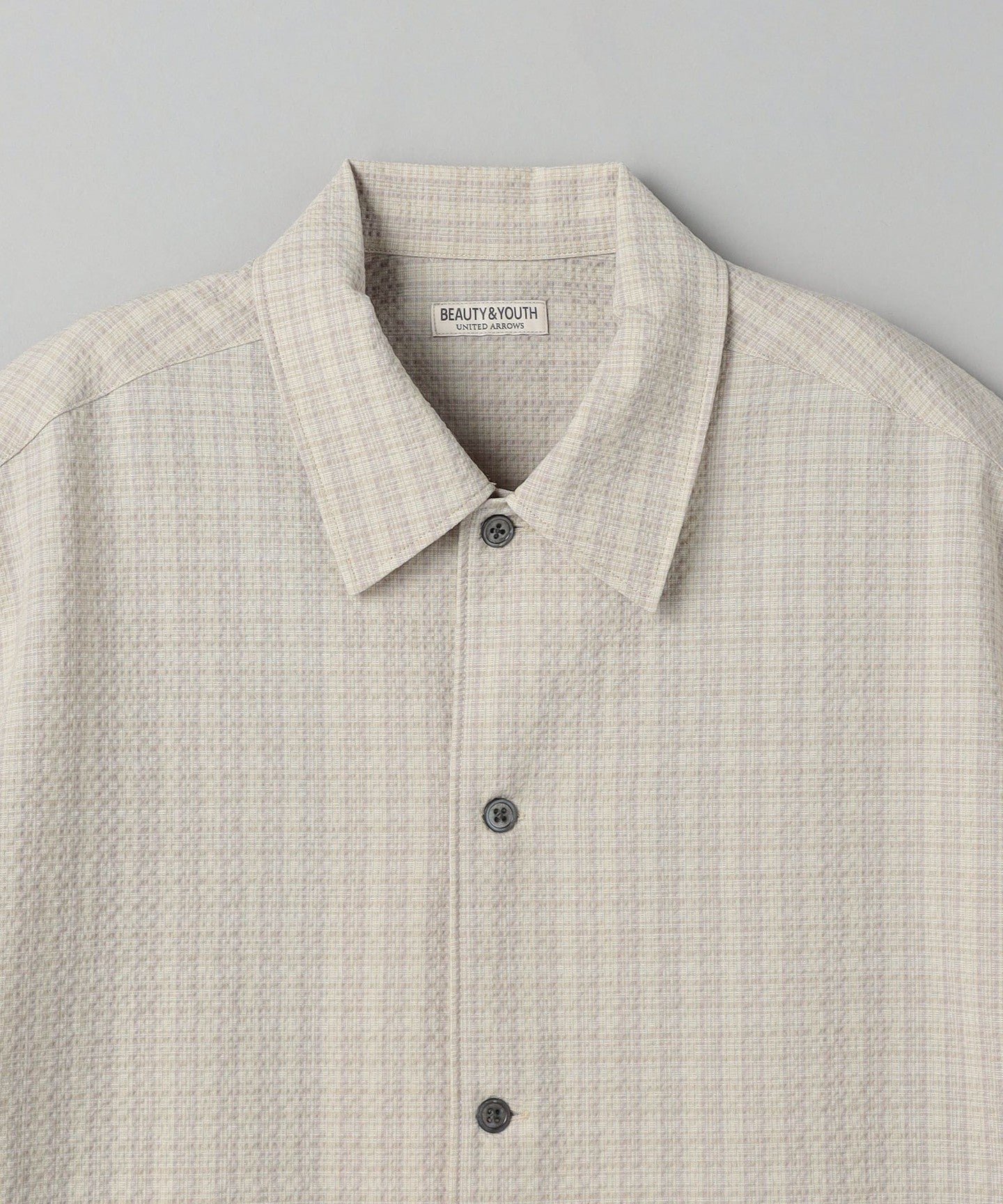 A short-sleeved shirt made of worsted seersucker fabric with an elegant surface texture.