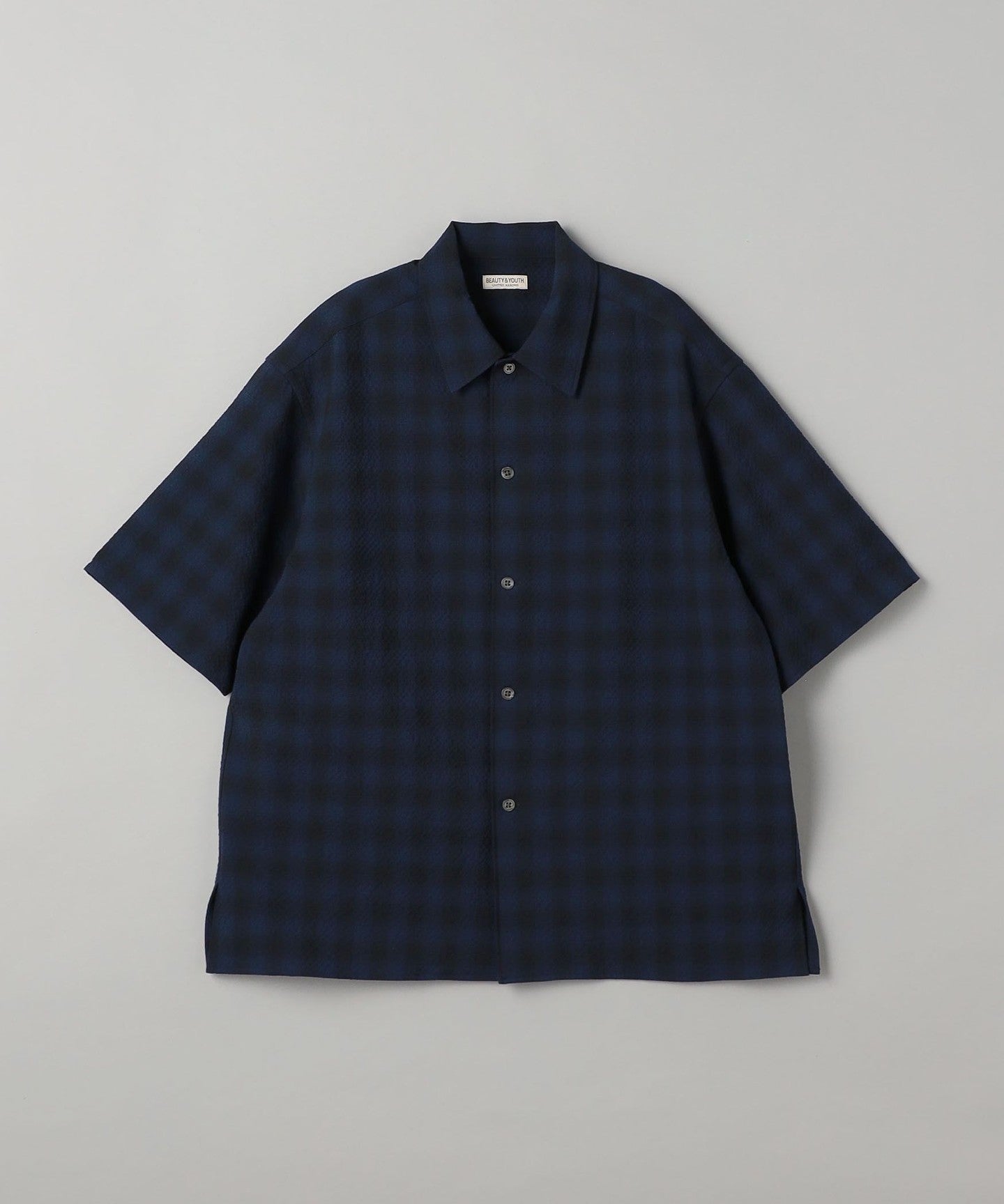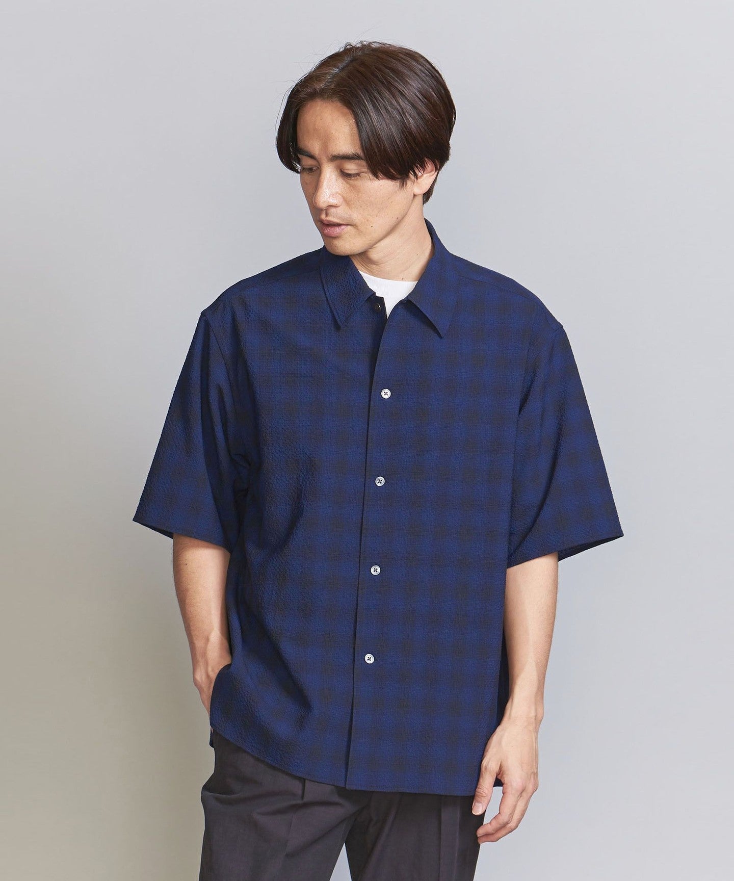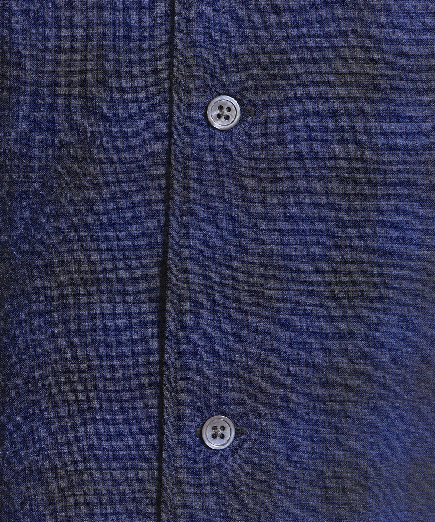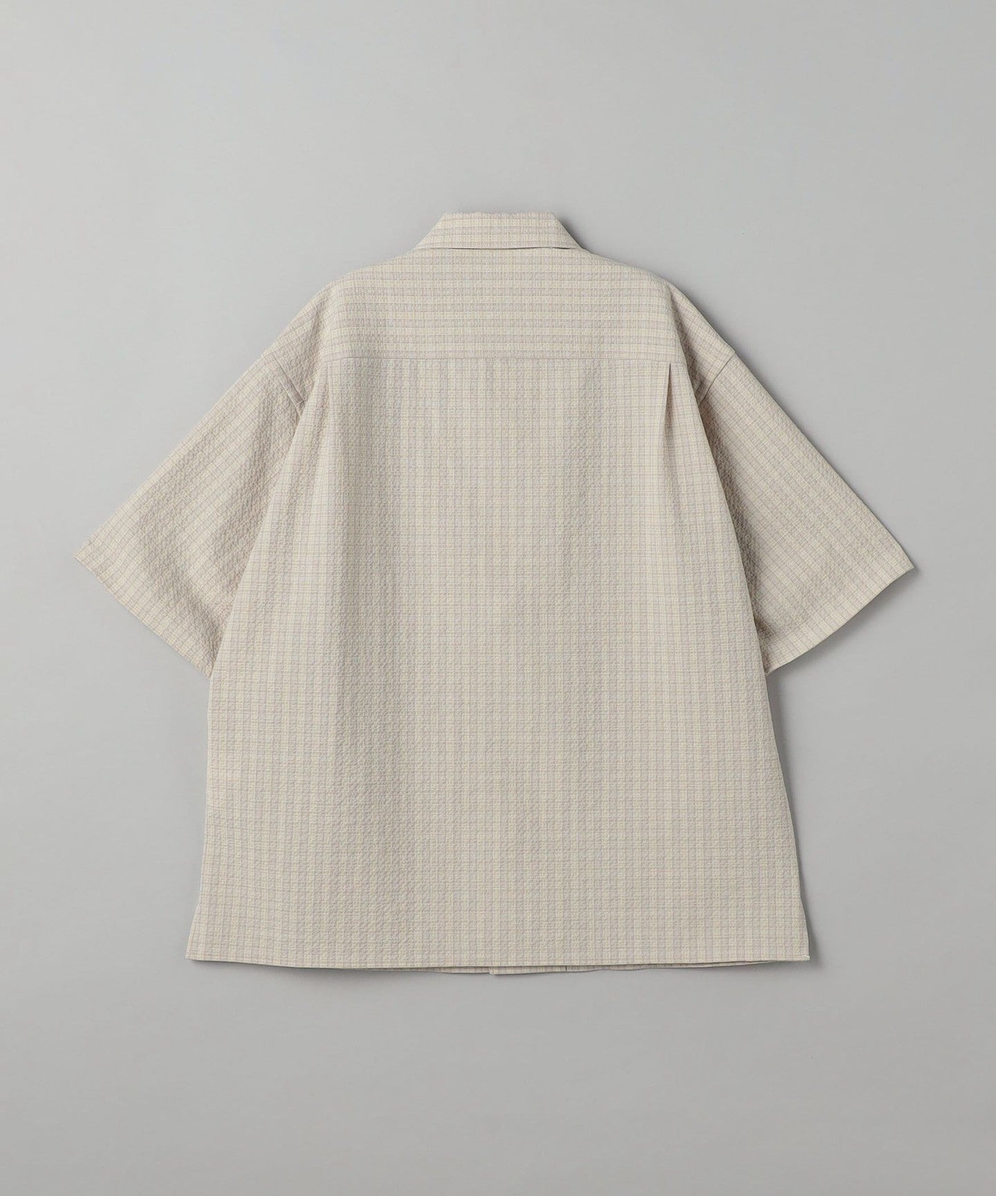 A short-sleeved shirt made of worsted seersucker fabric with an elegant surface texture.