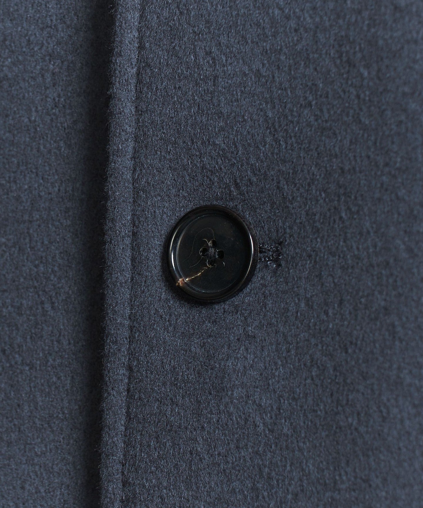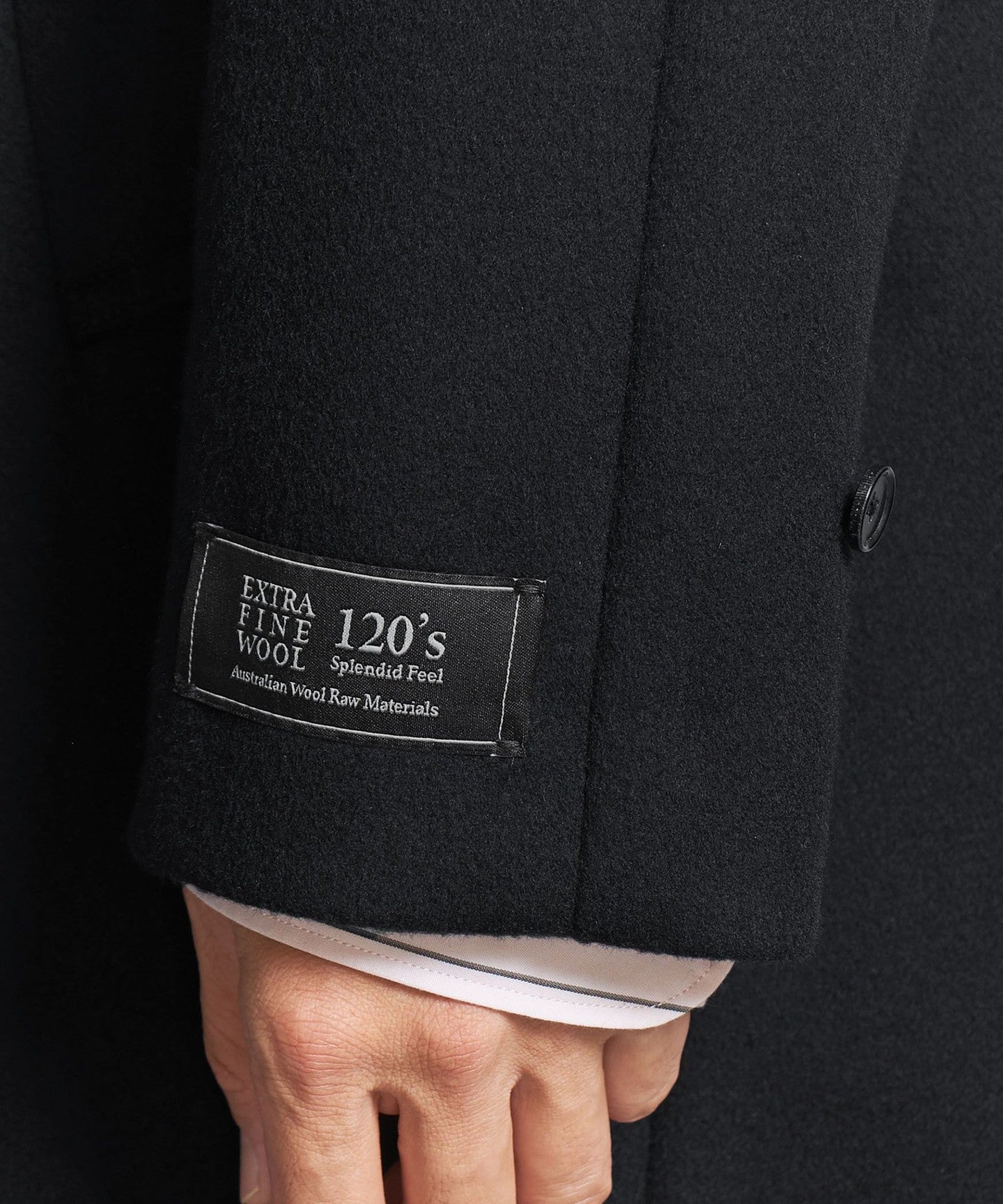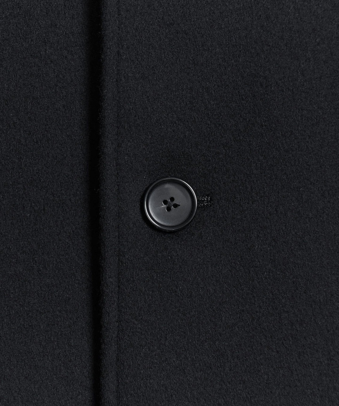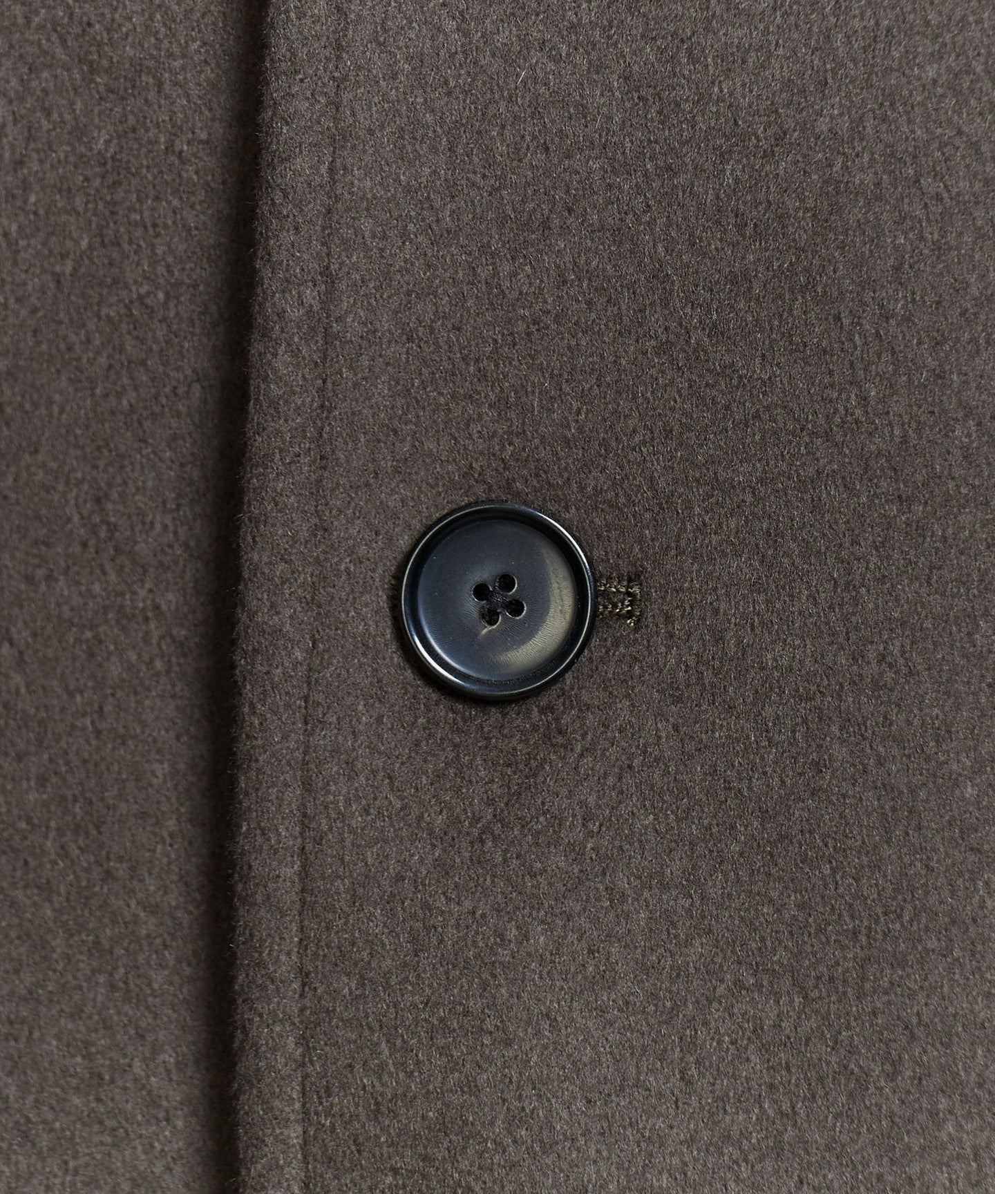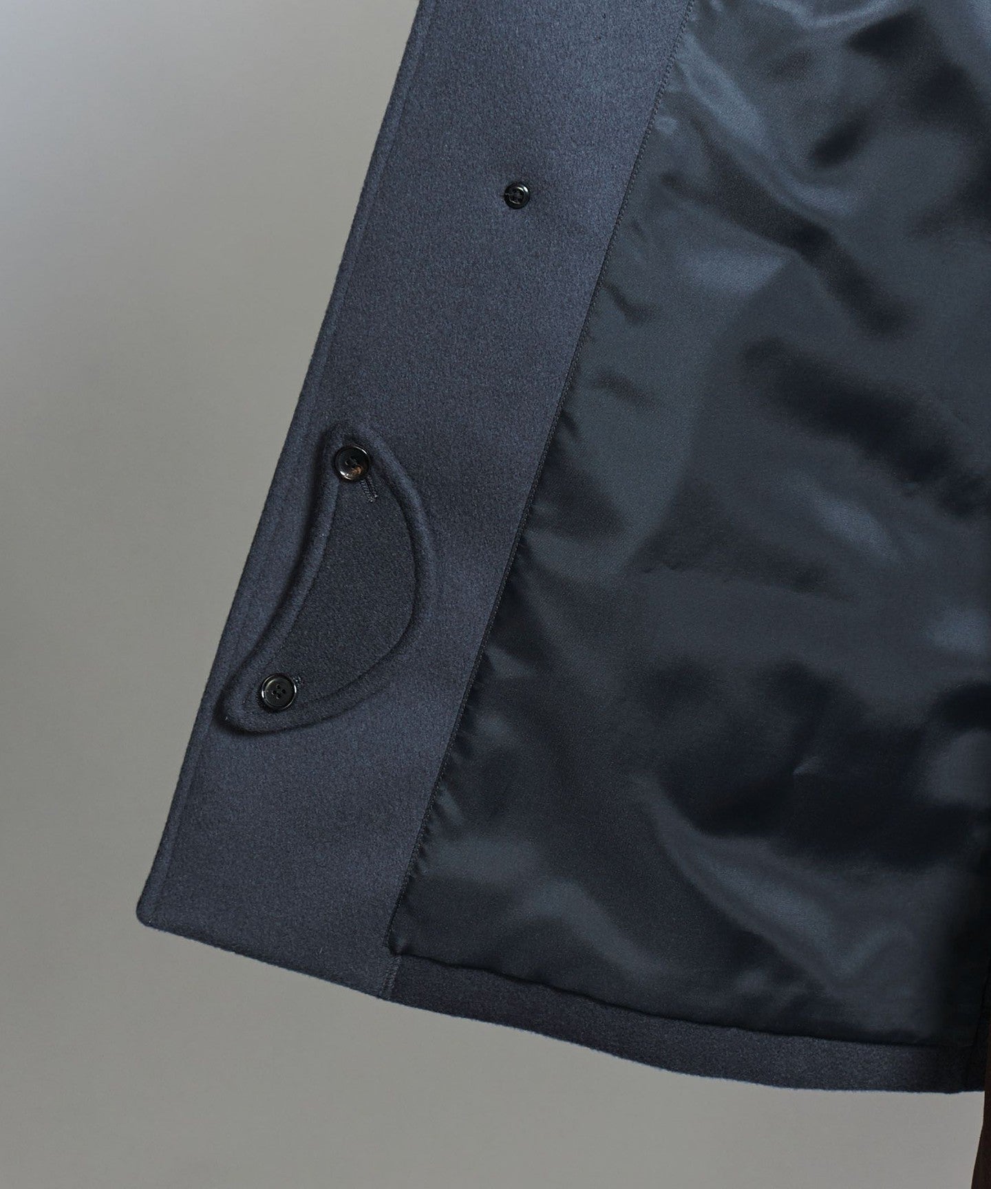 A Balmacaan coat made of wool melton fabric, luxuriously using high-quality Super 120 wool material.