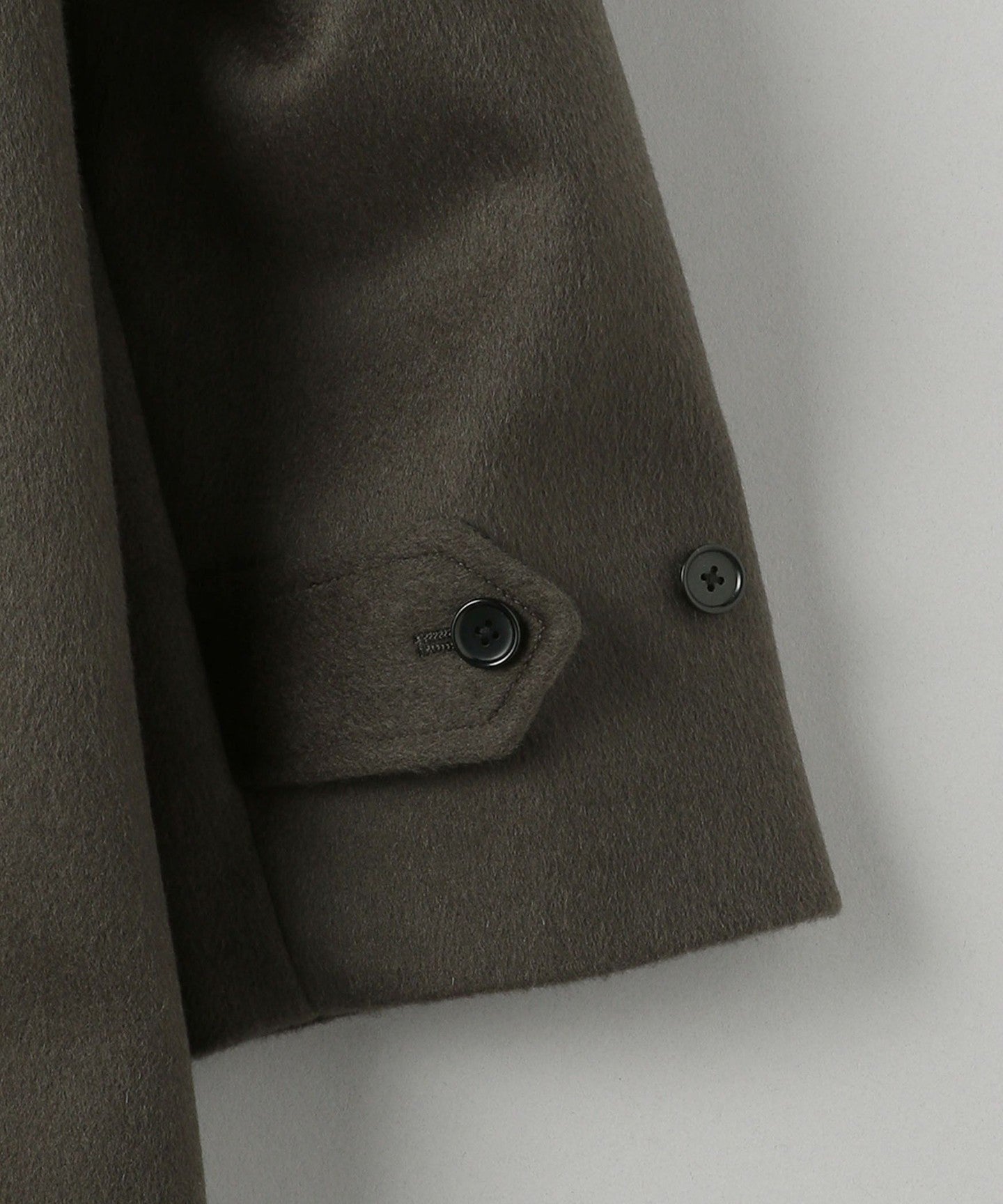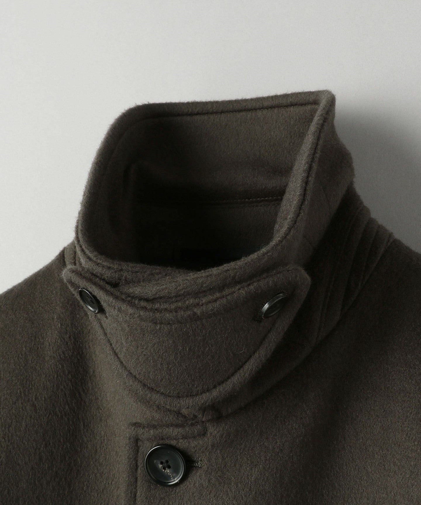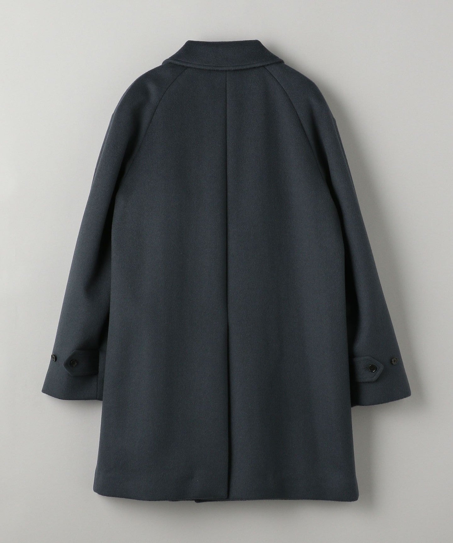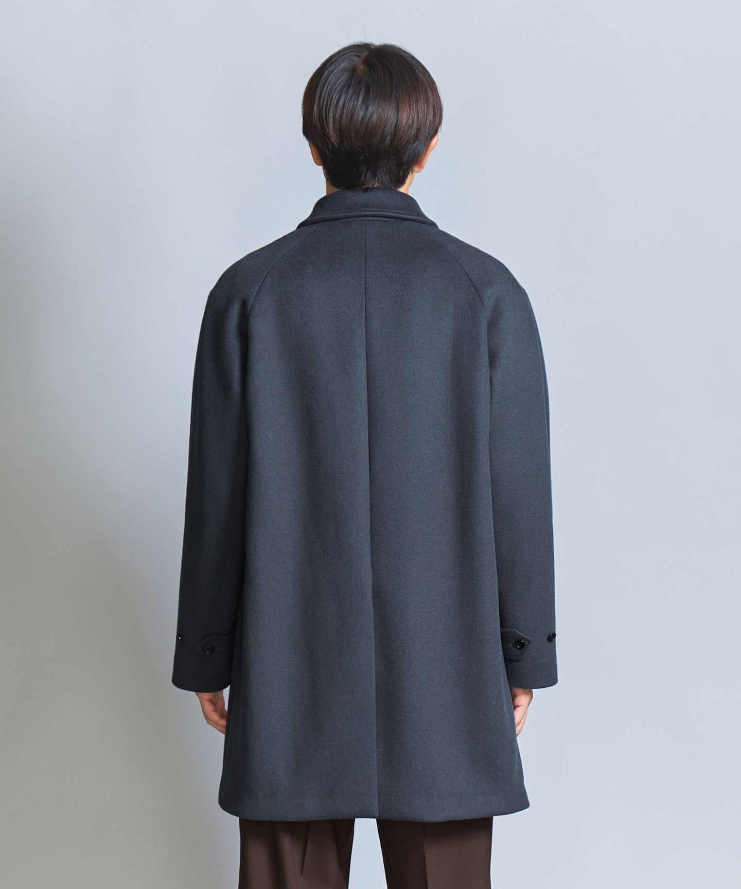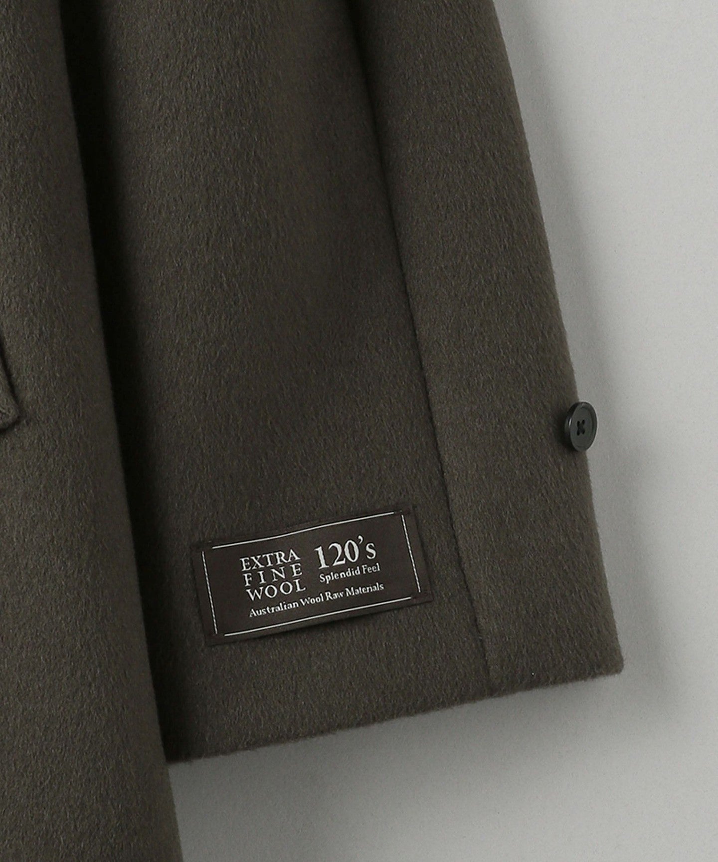 A Balmacaan coat made of wool melton fabric, luxuriously using high-quality Super 120 wool material.