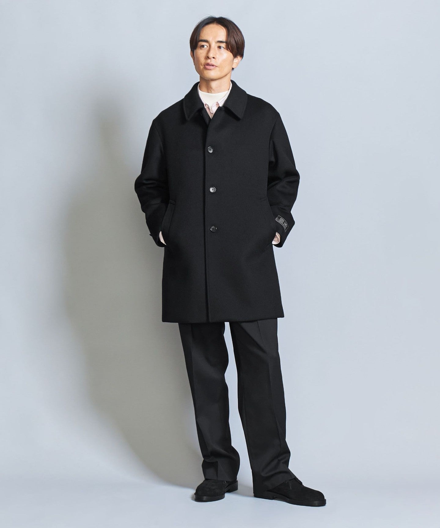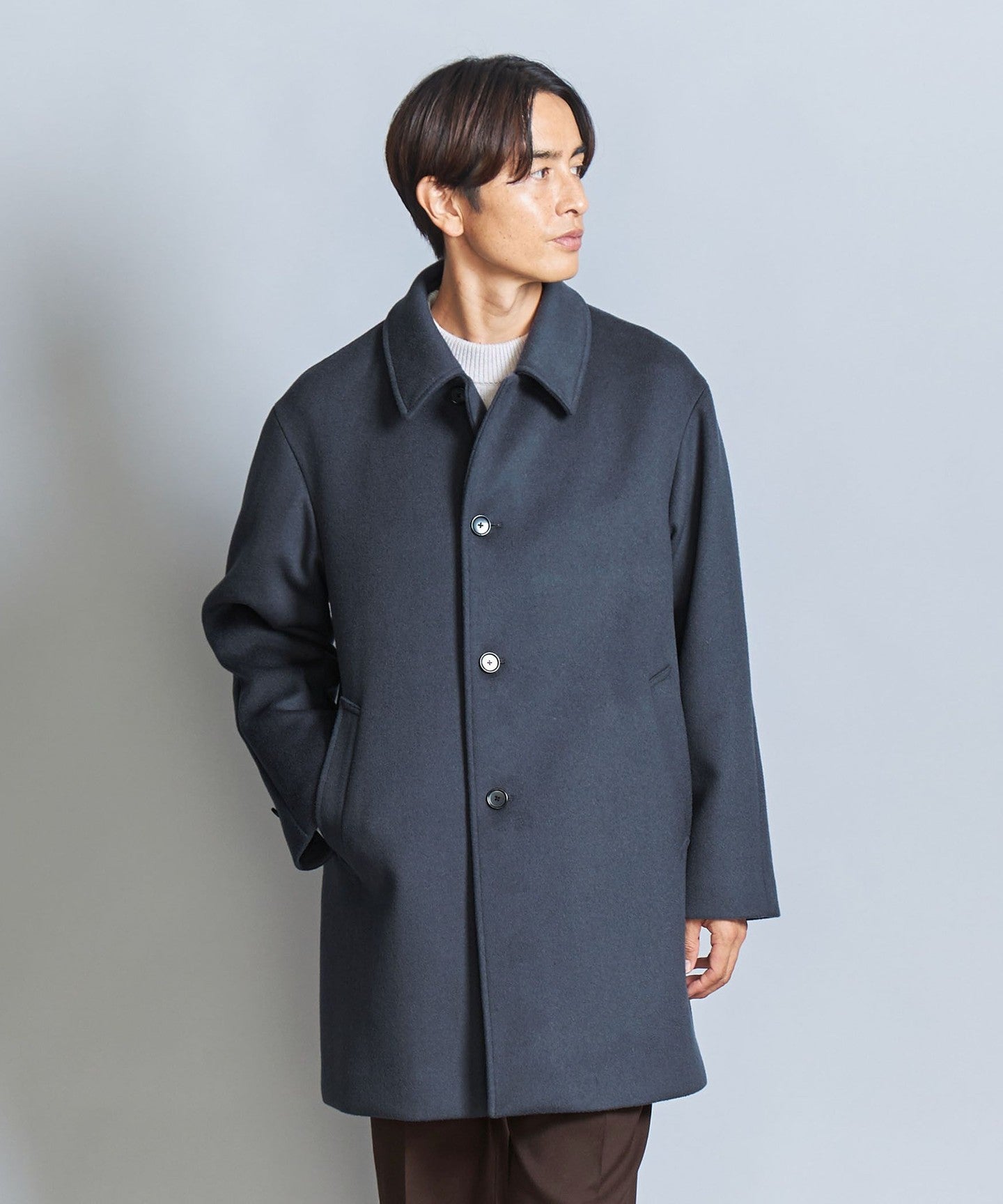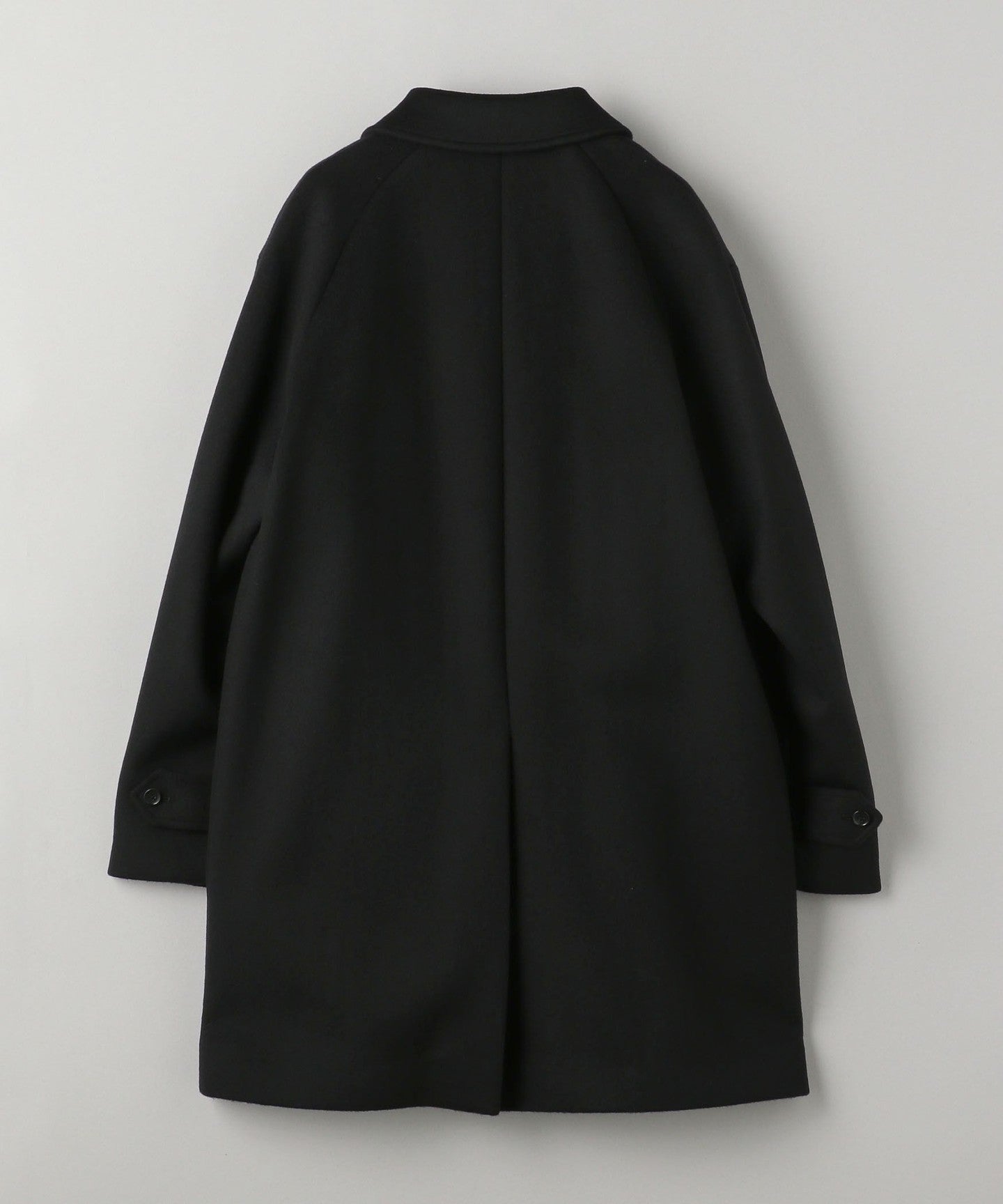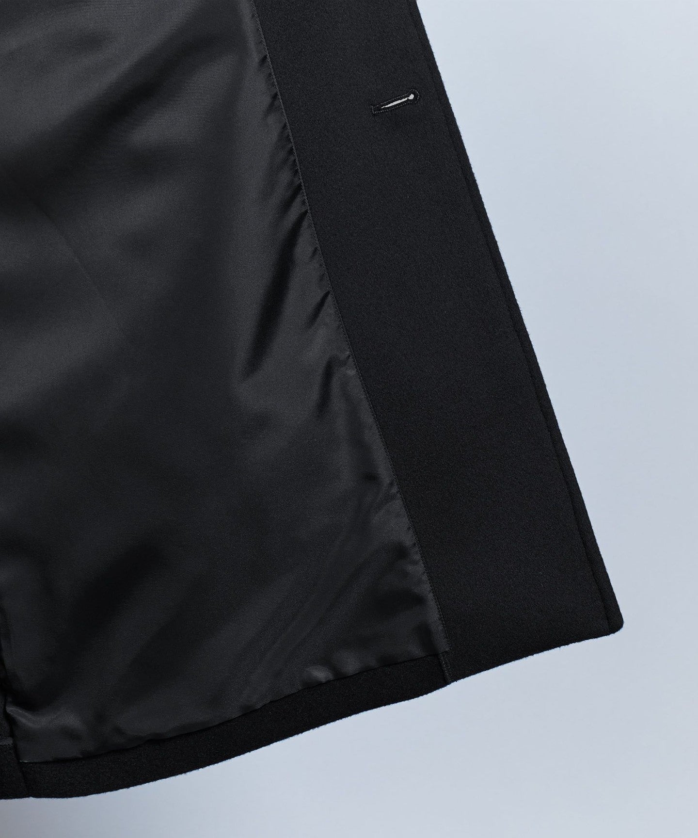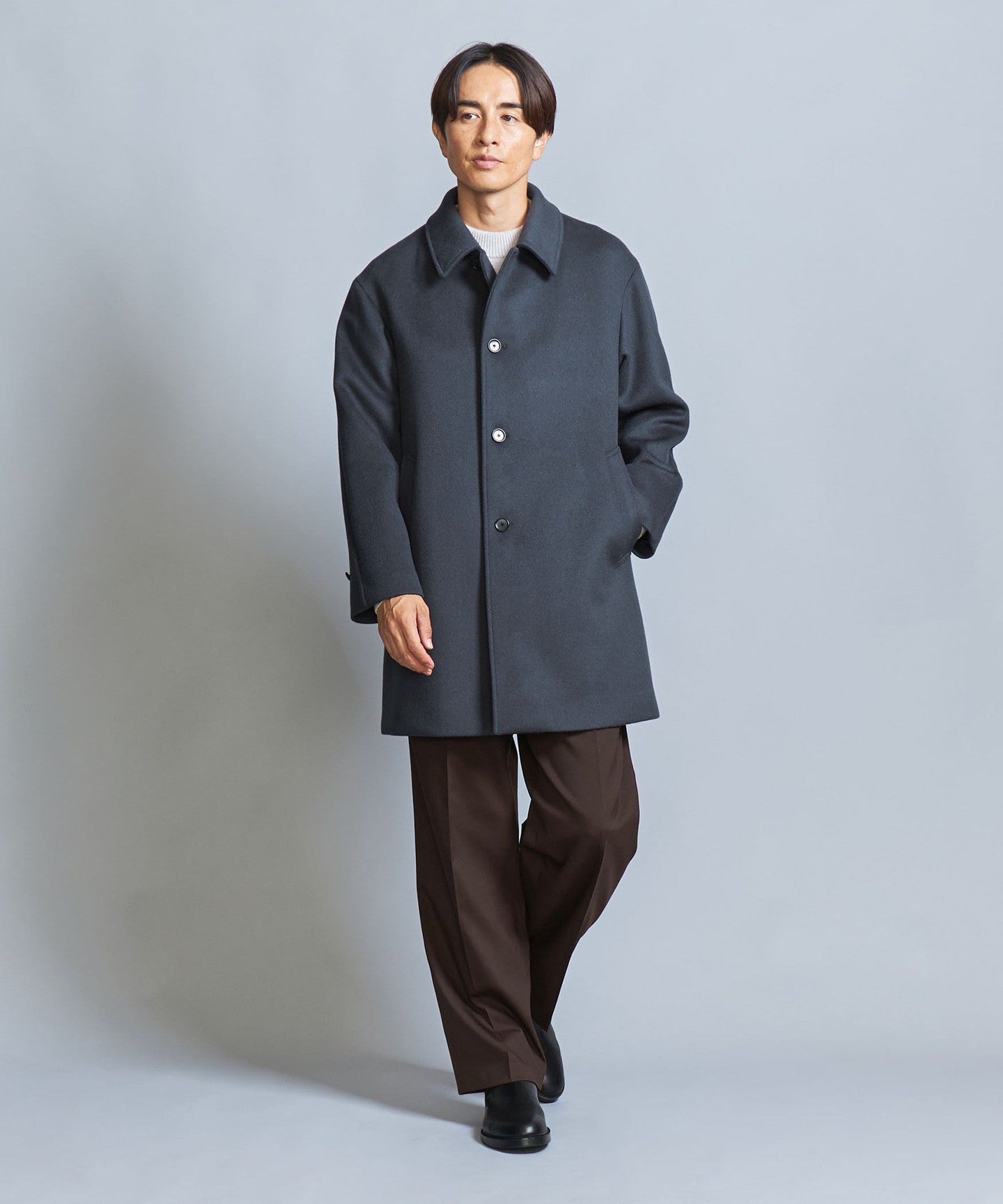 A Balmacaan coat made of wool melton fabric, luxuriously using high-quality Super 120 wool material.