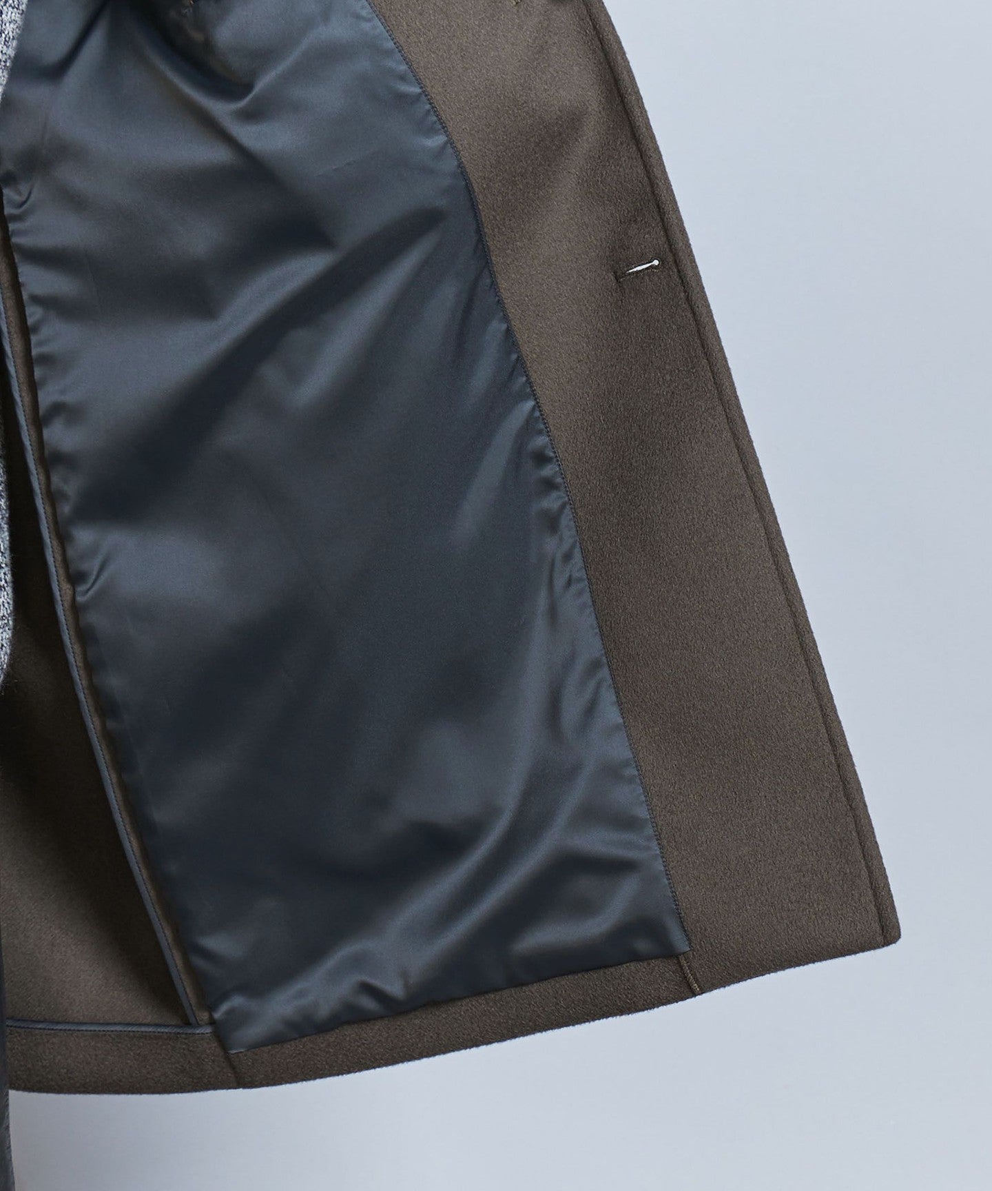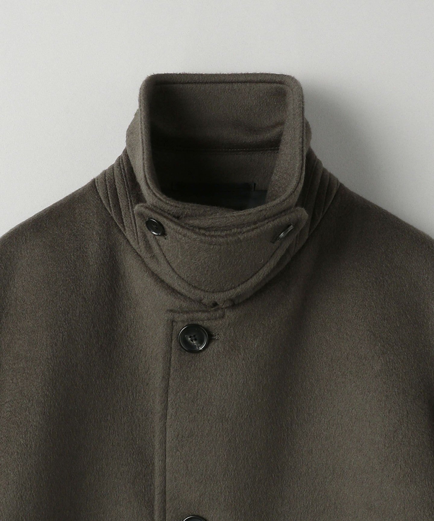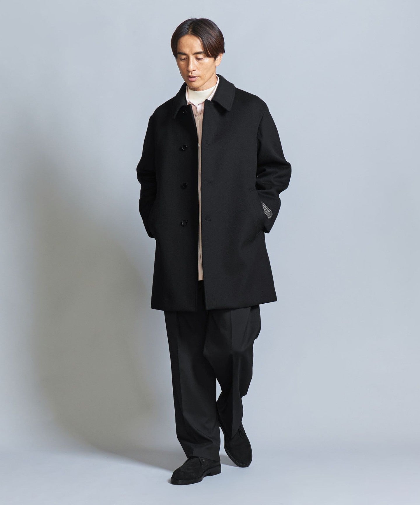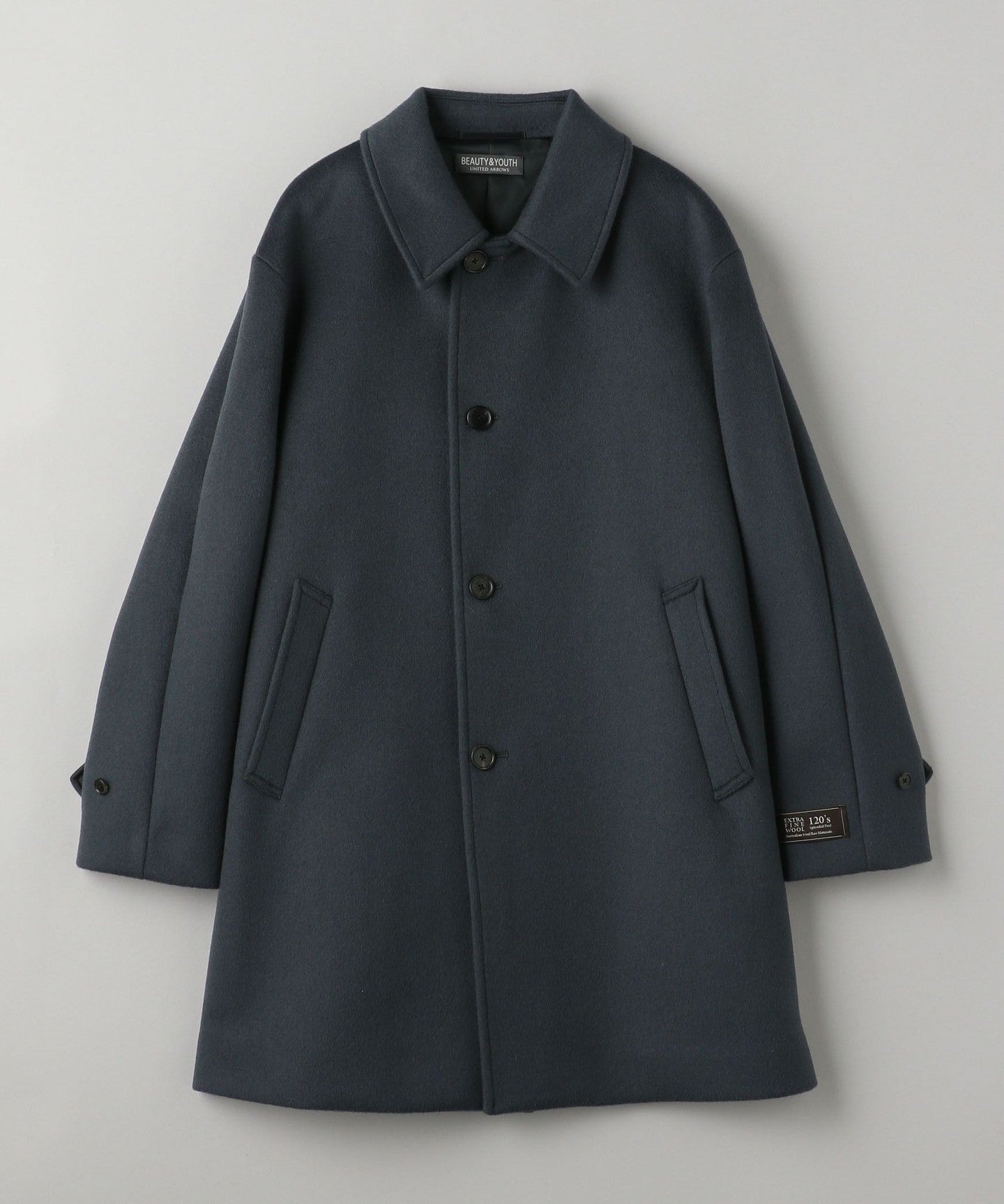 A Balmacaan coat made of wool melton fabric, luxuriously using high-quality Super 120 wool material.