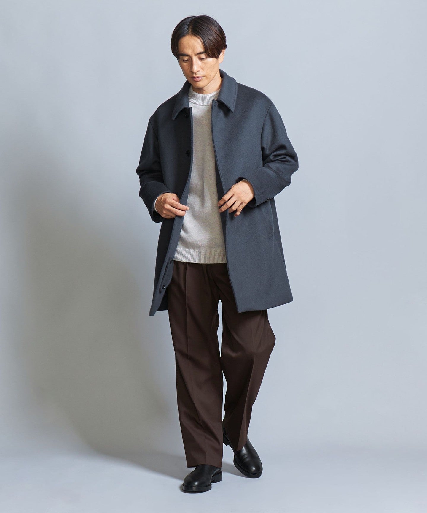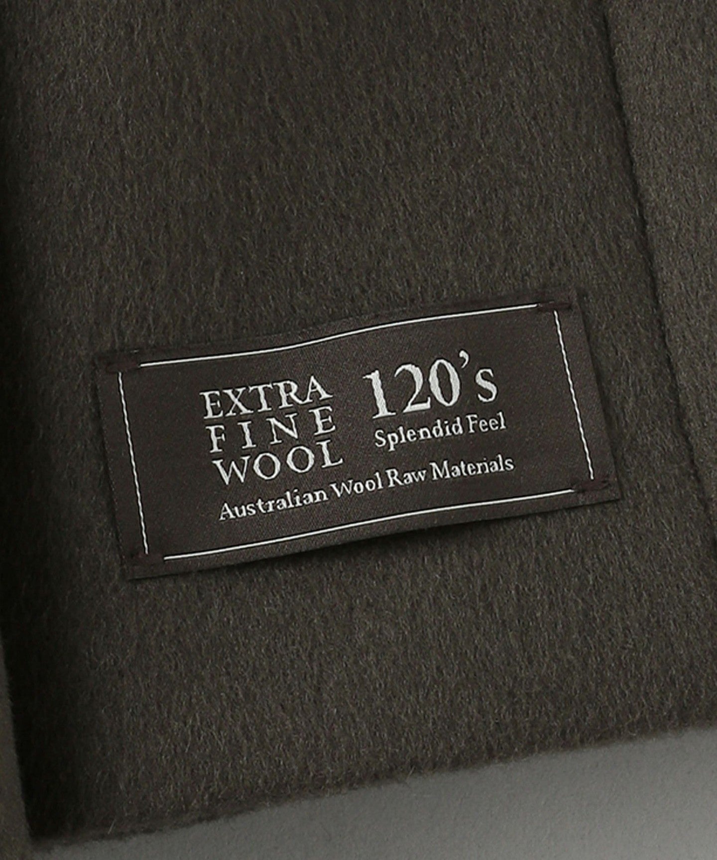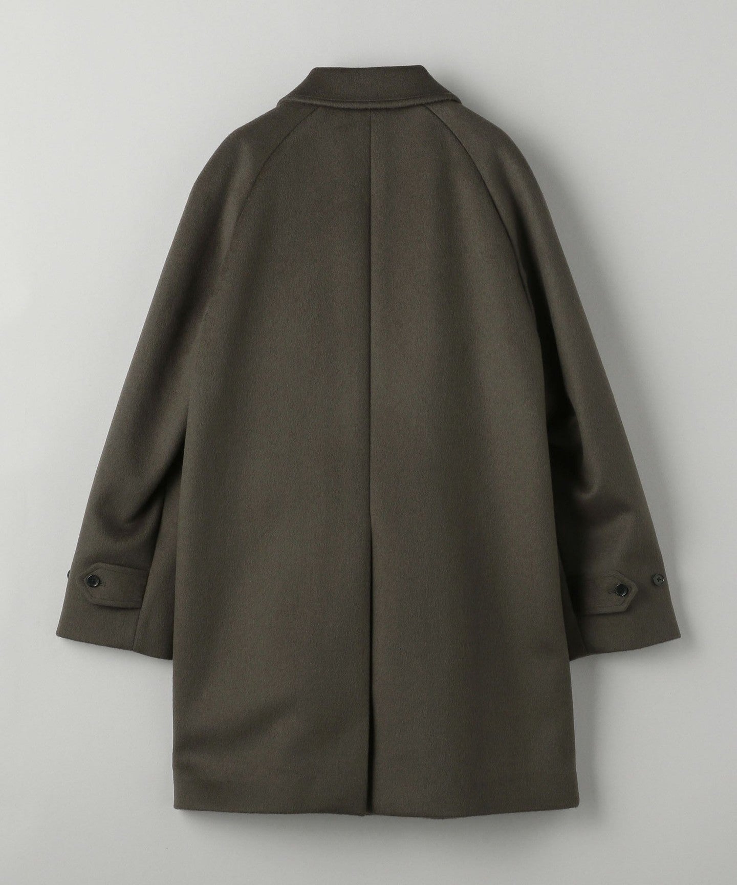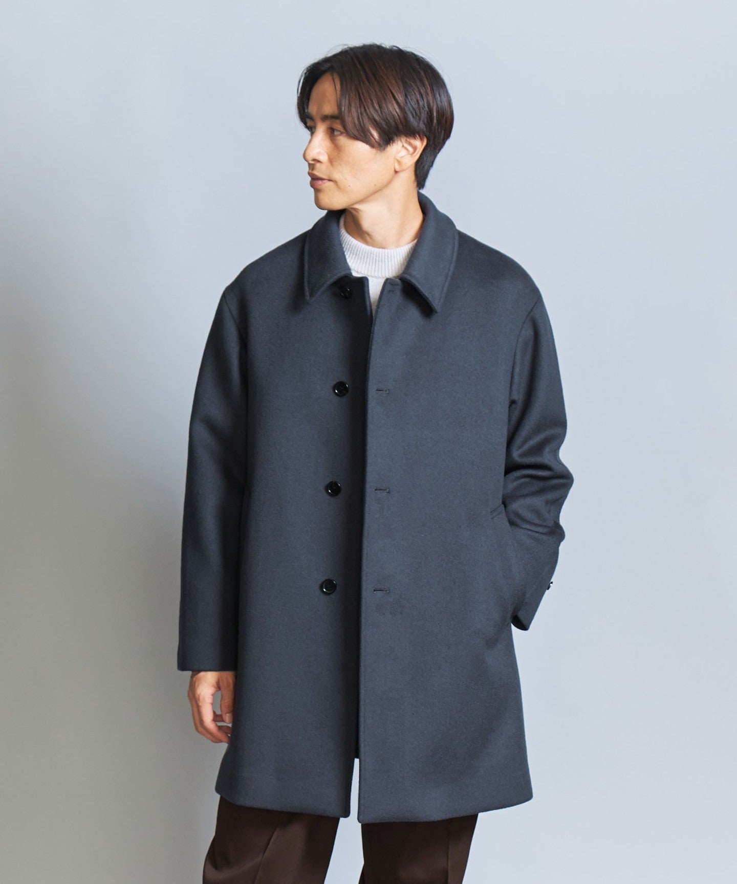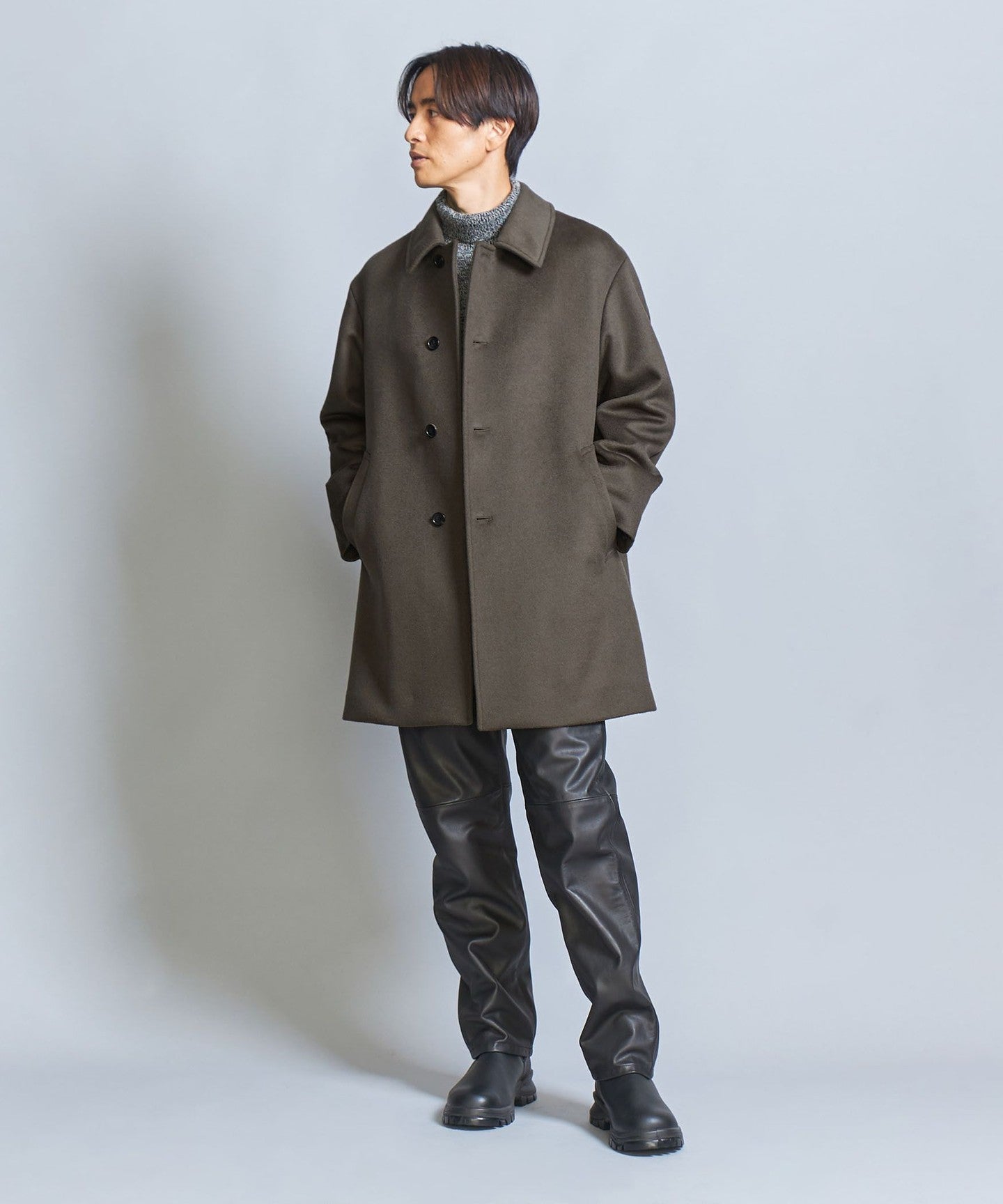 A Balmacaan coat made of wool melton fabric, luxuriously using high-quality Super 120 wool material.