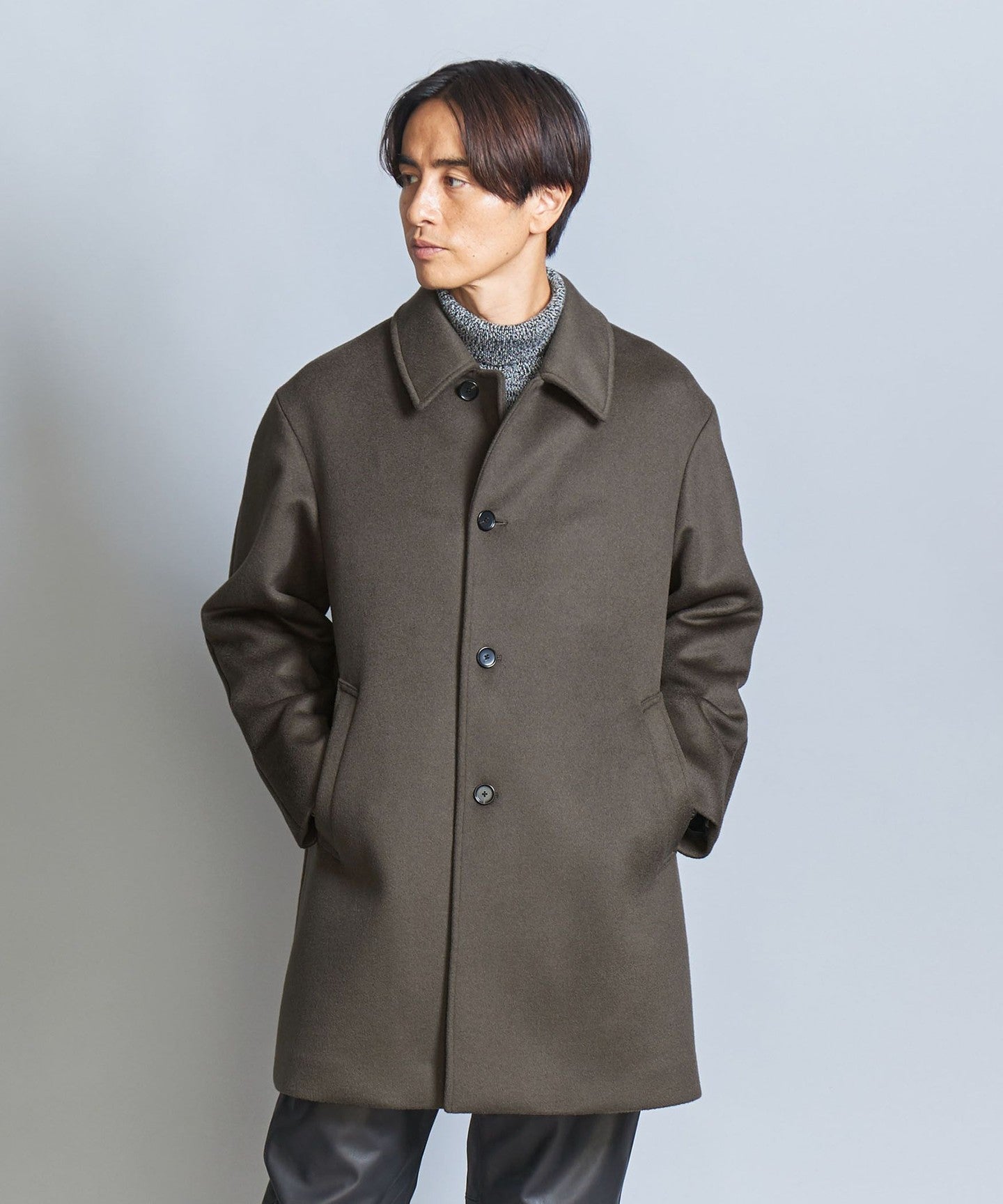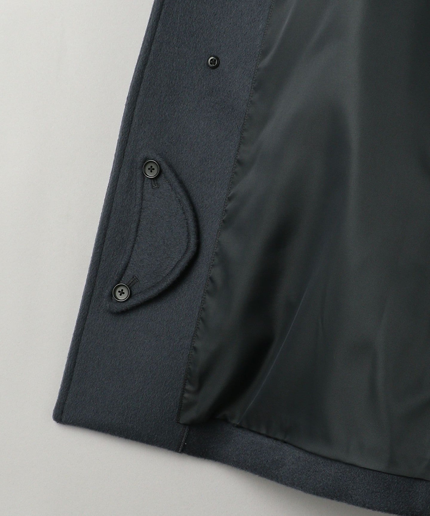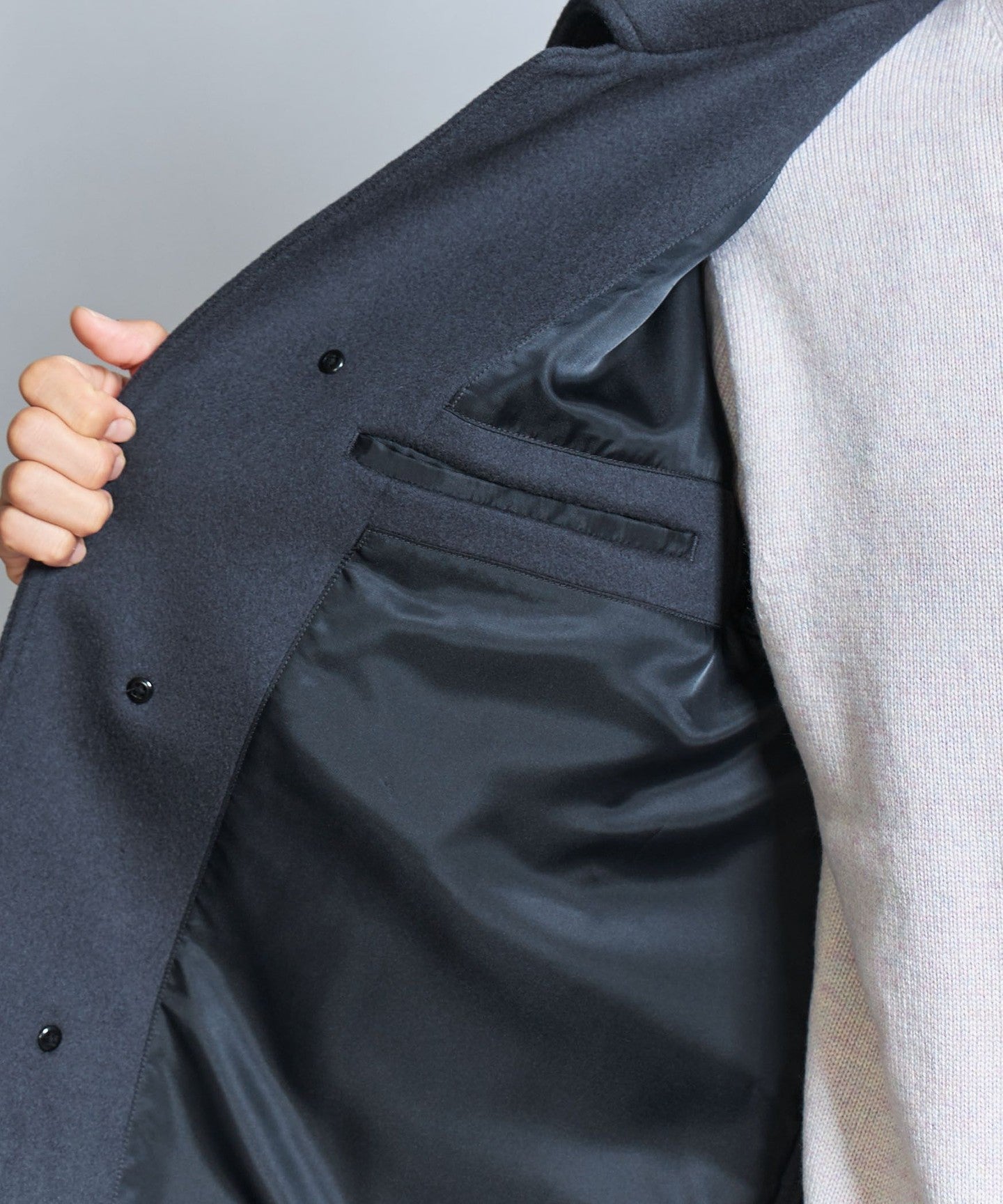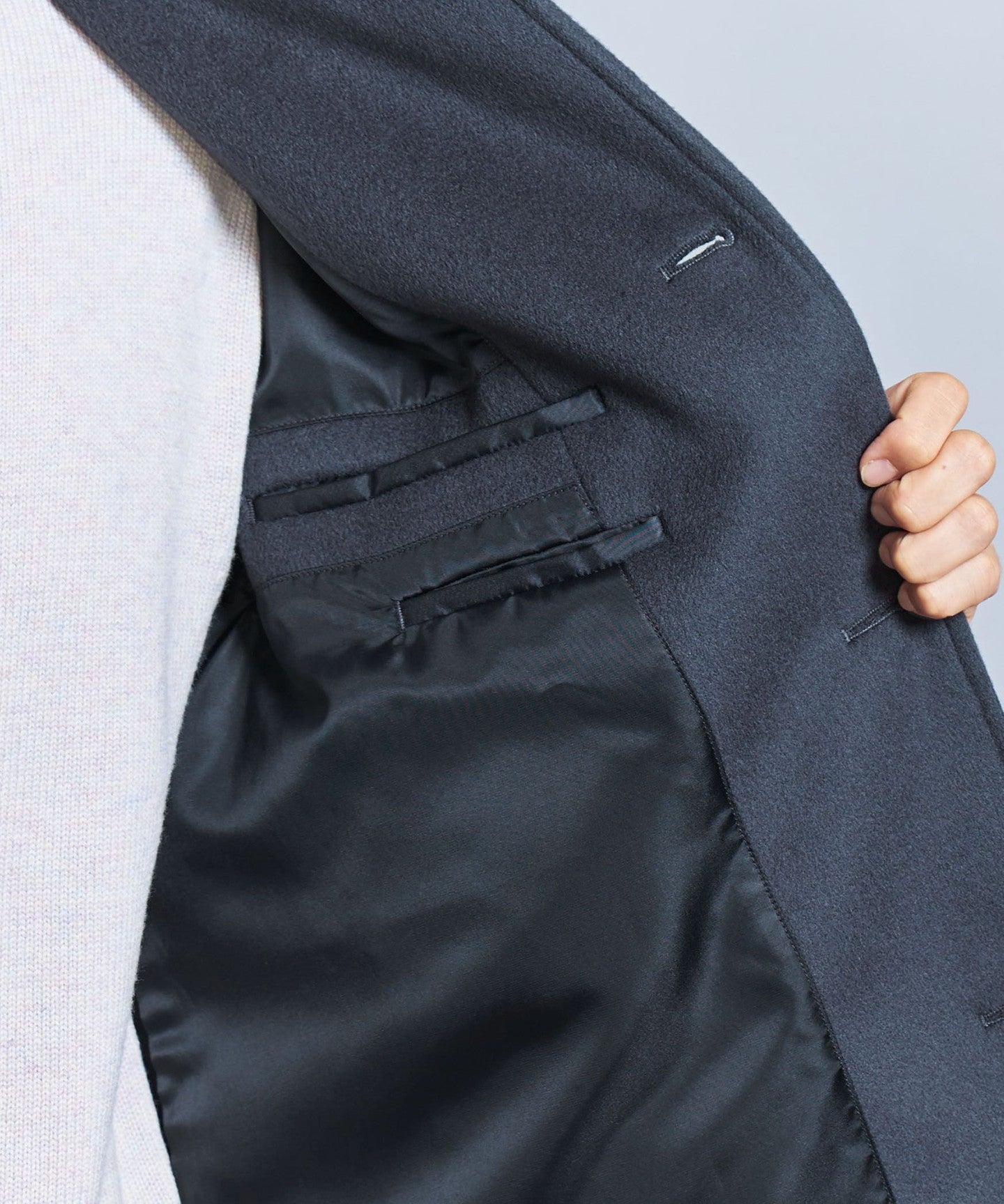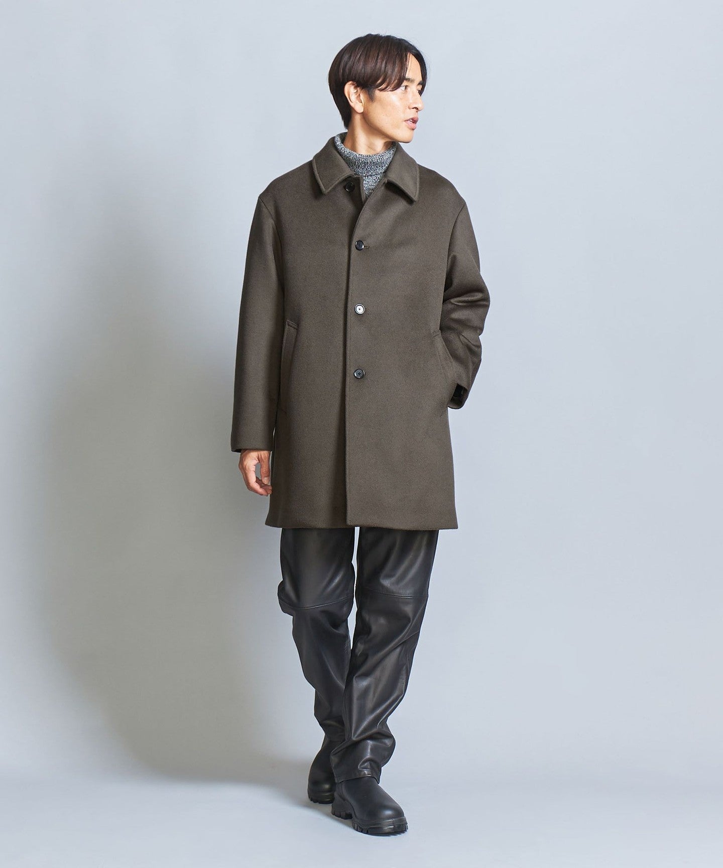A Balmacaan coat made of wool melton fabric, luxuriously using high-quality Super 120 wool material.