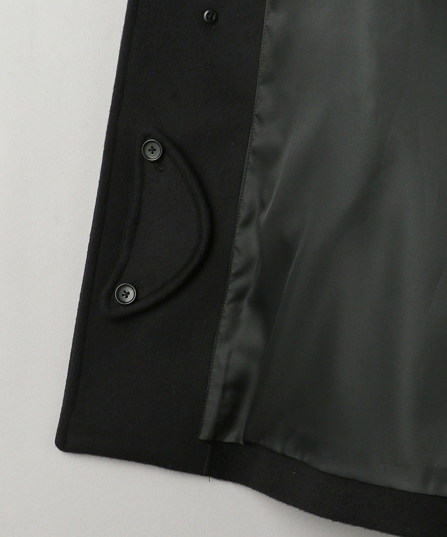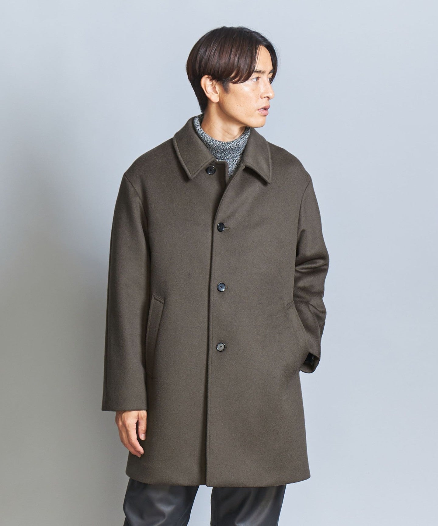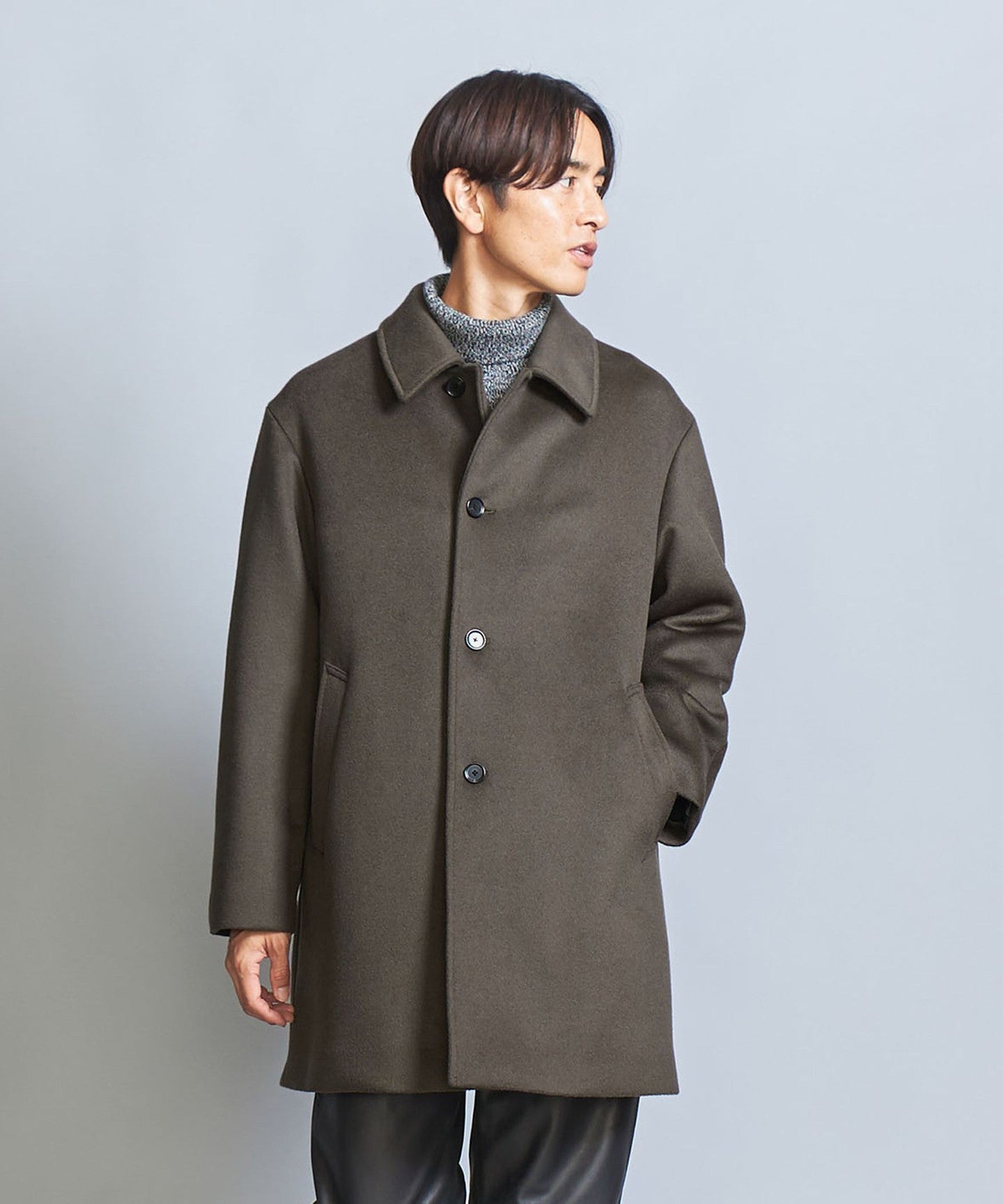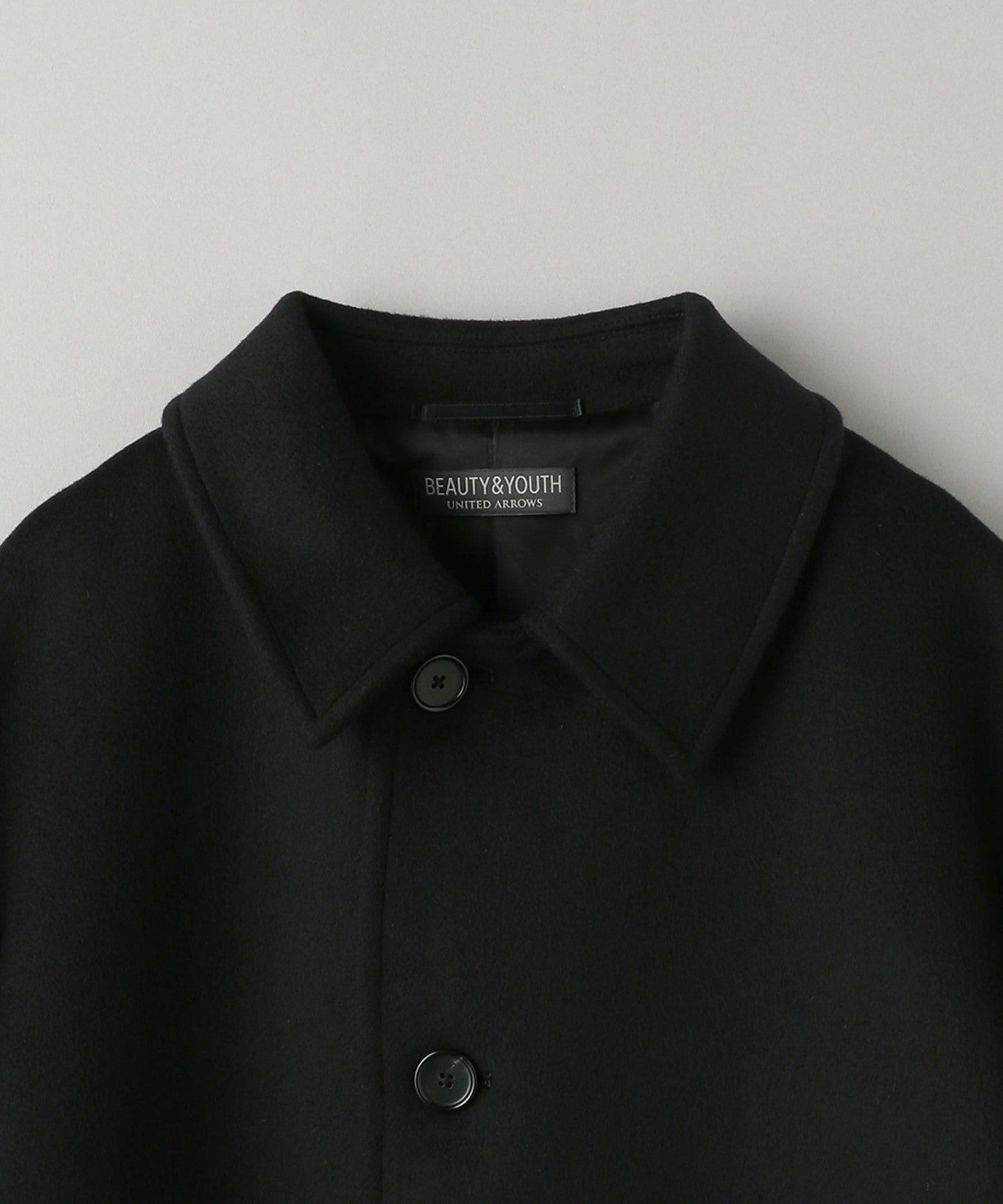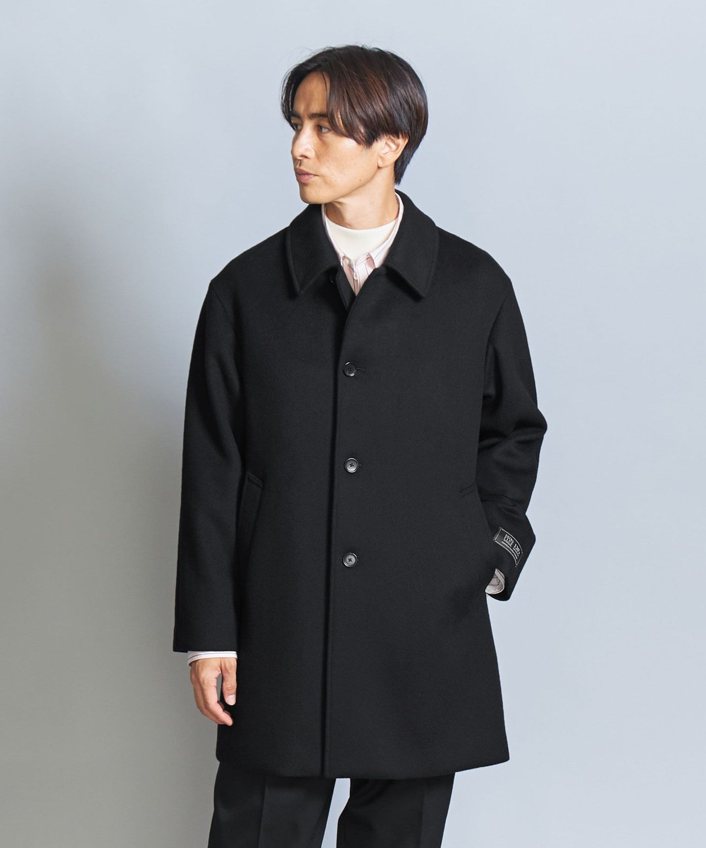 A Balmacaan coat made of wool melton fabric, luxuriously using high-quality Super 120 wool material.