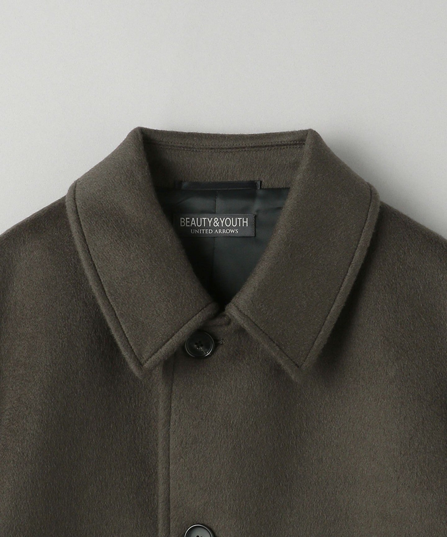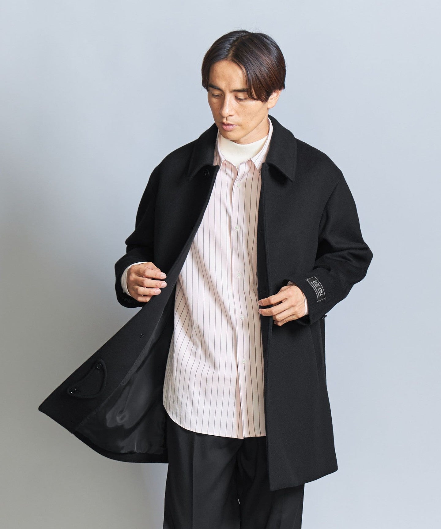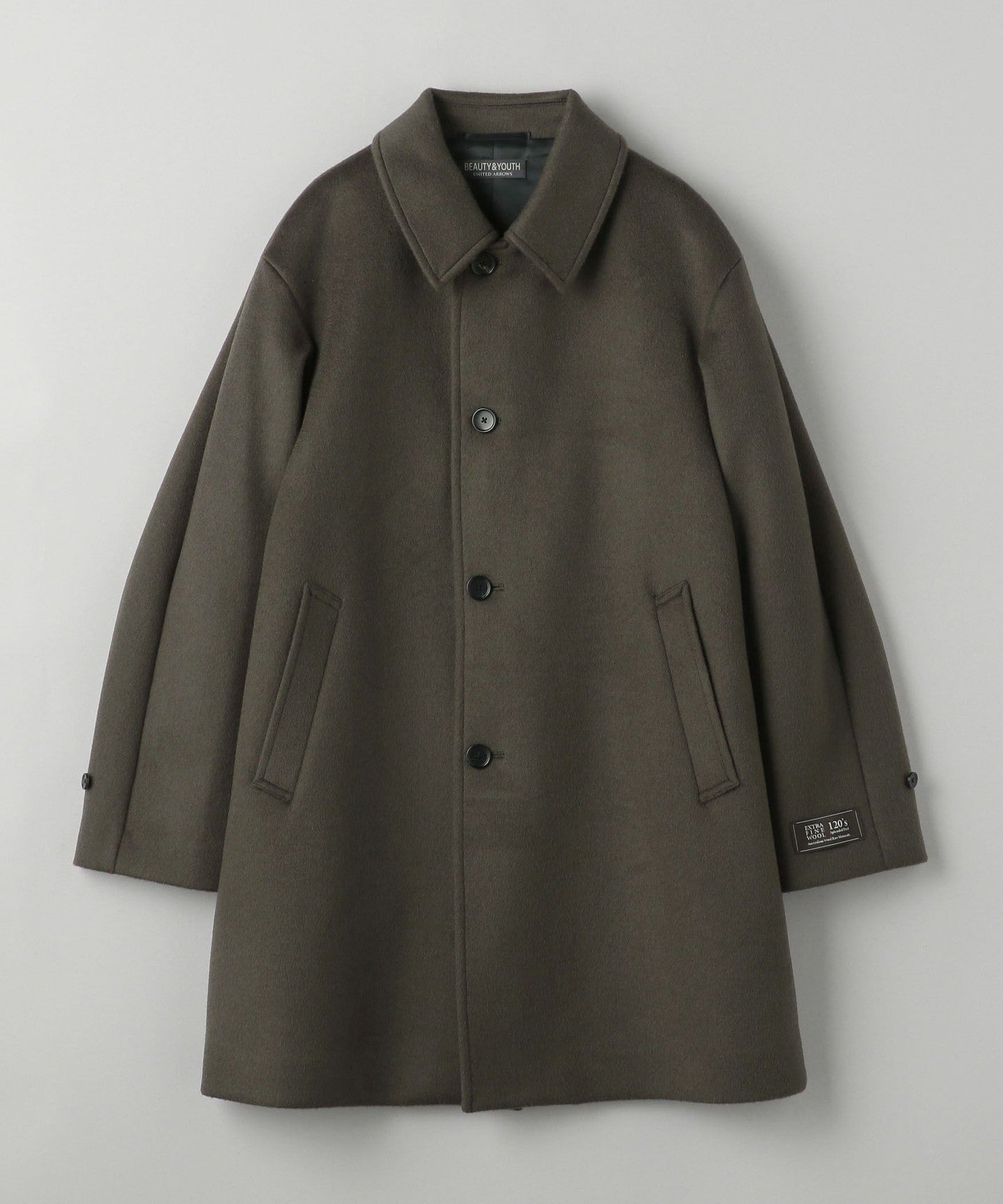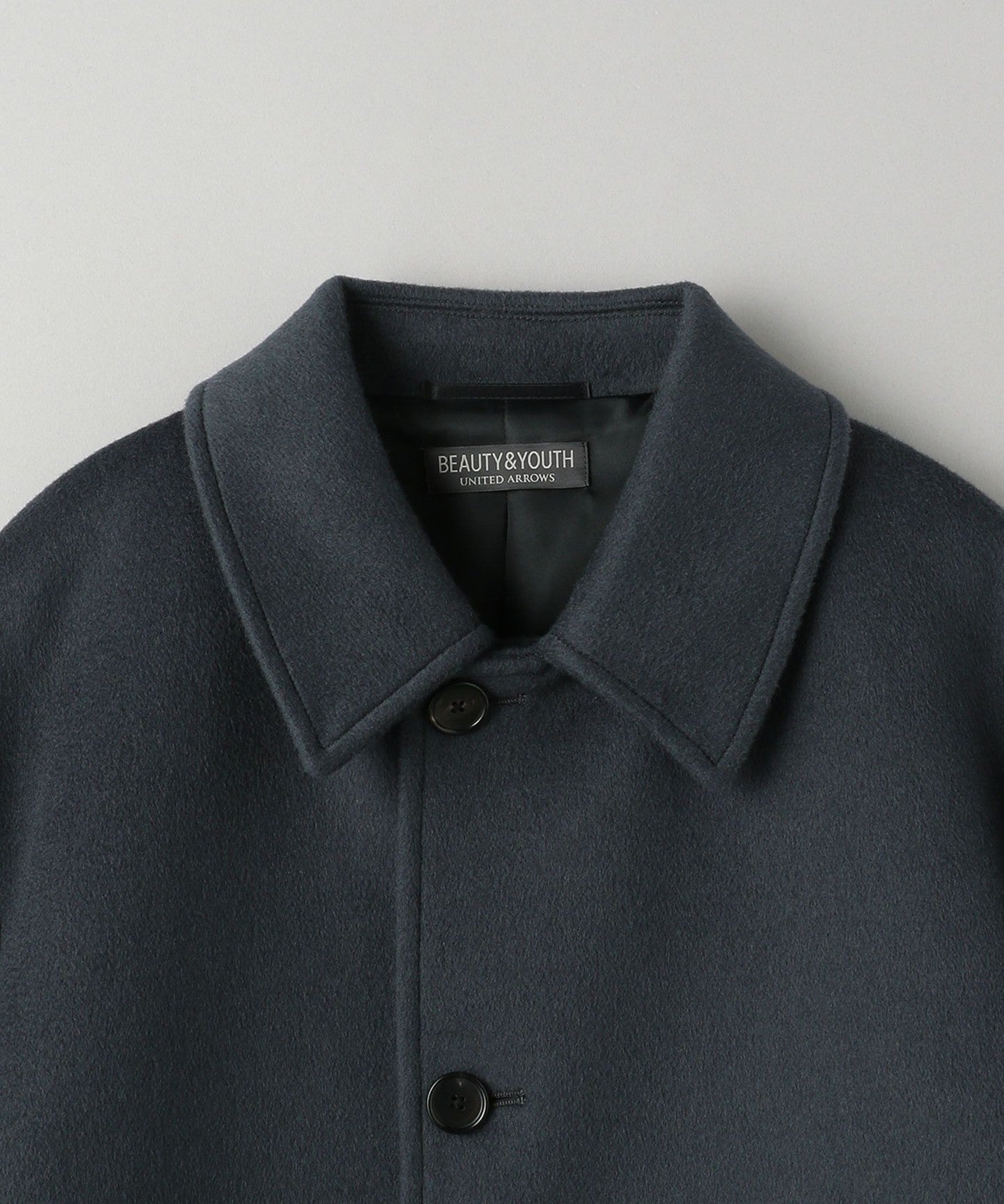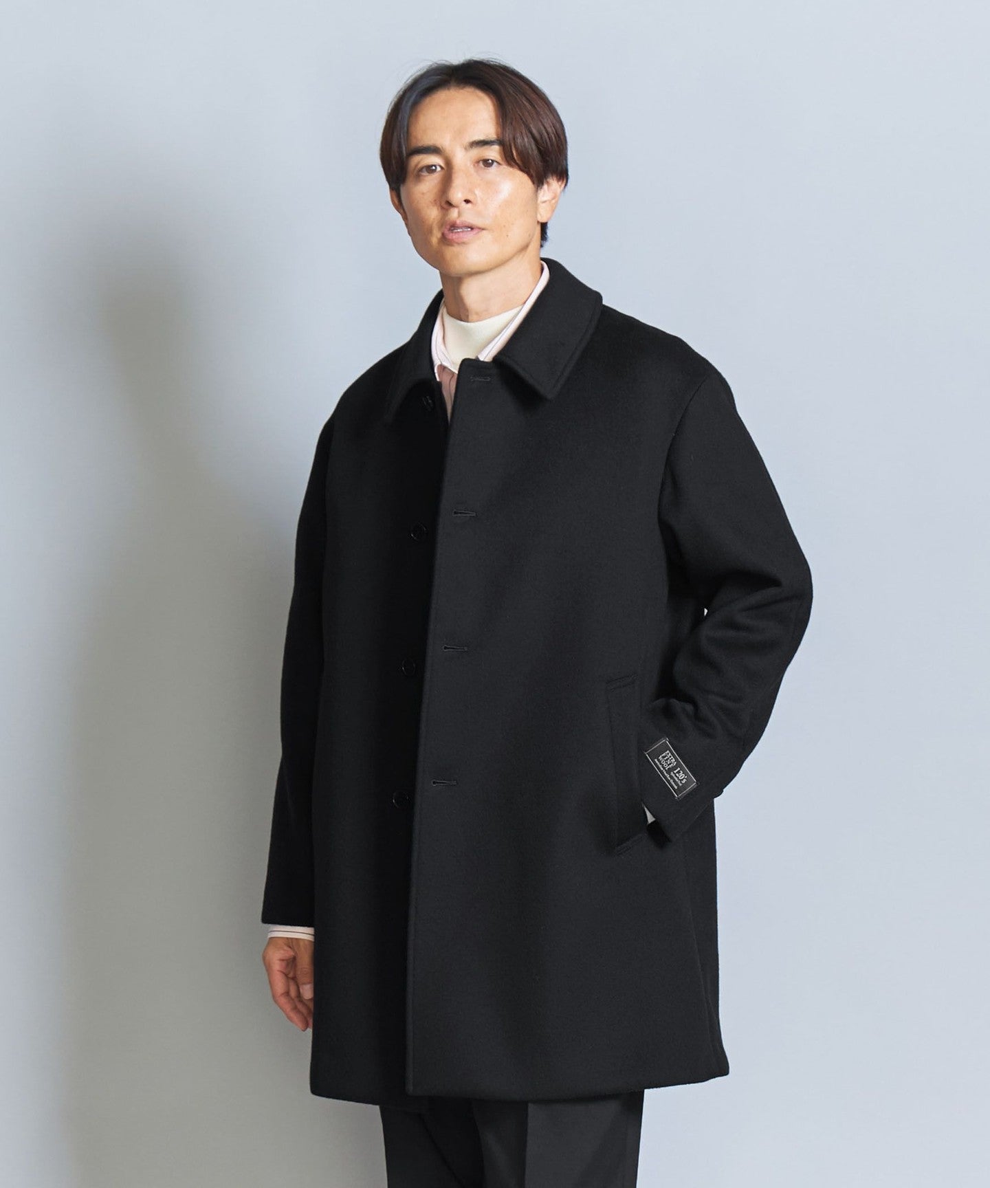 A Balmacaan coat made of wool melton fabric, luxuriously using high-quality Super 120 wool material.