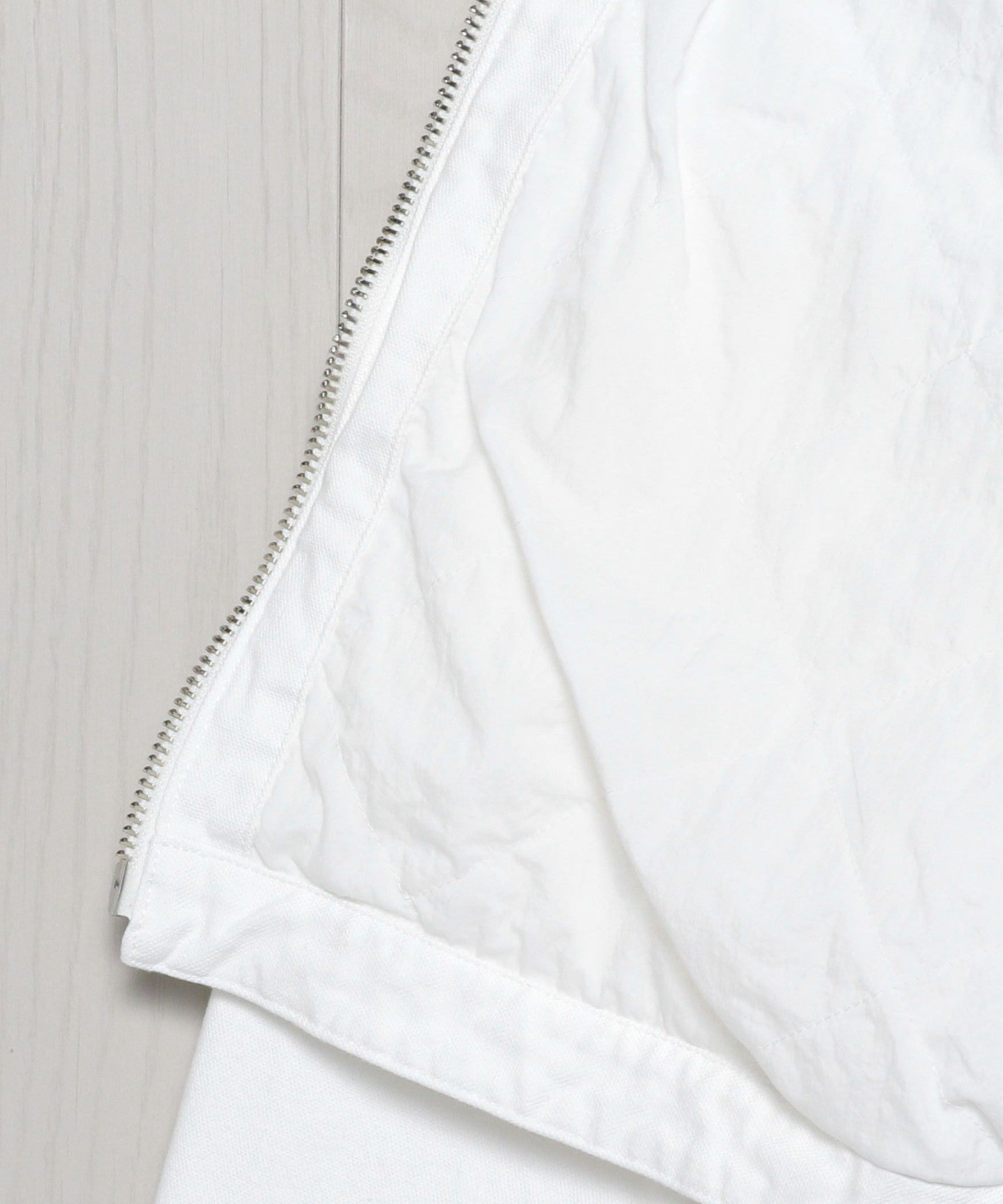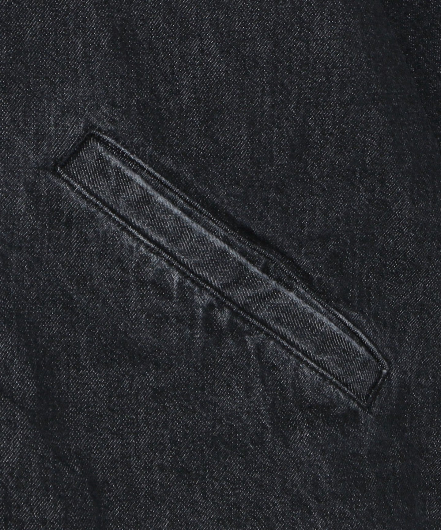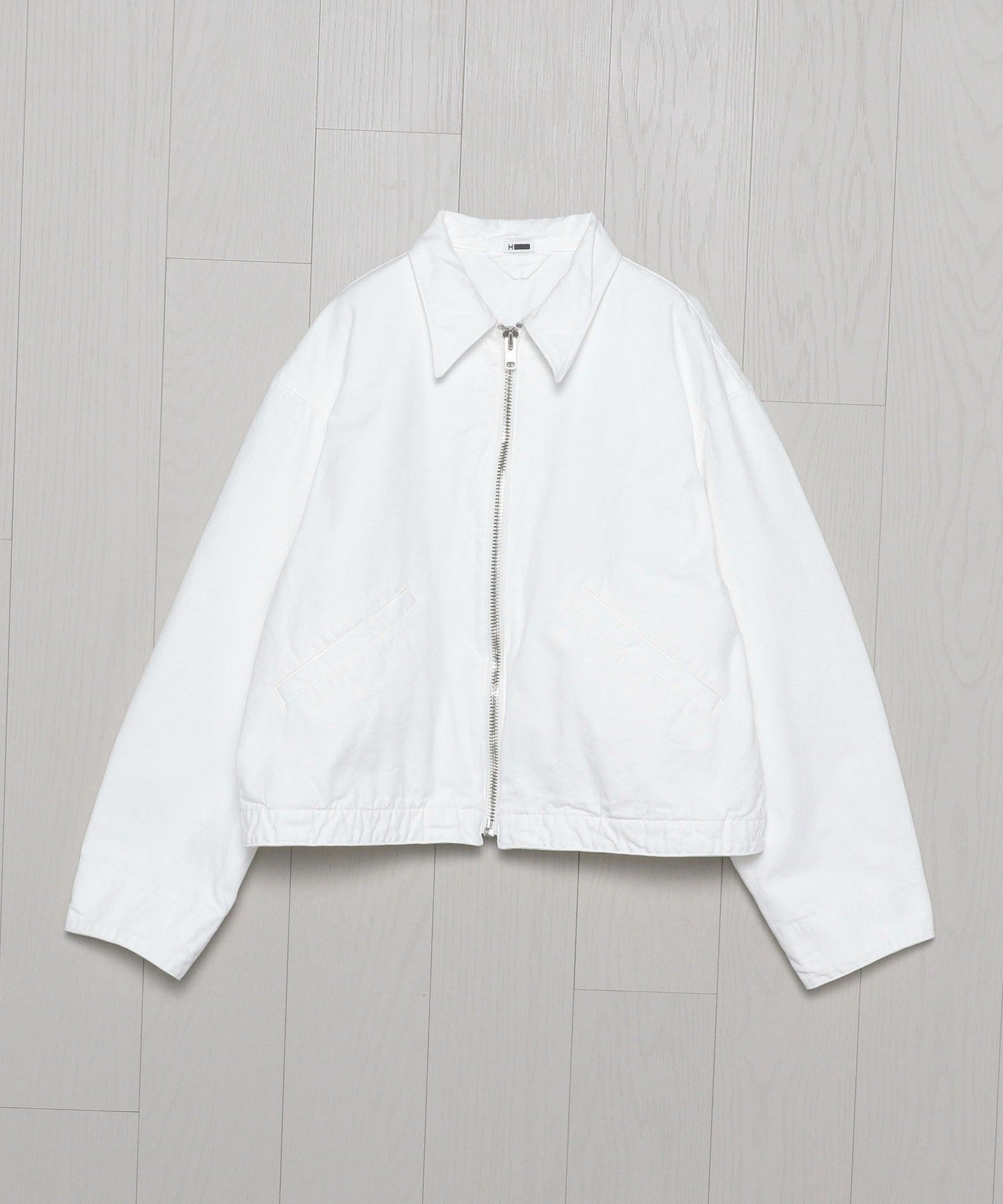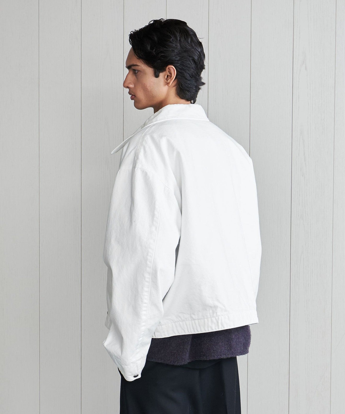 This denim jacket is based on classic workwear and features a minimalist design. It has a clean, short length and a wide silhouette. The lining is thin and quilted, making it versatile for the transitional seasons of spring and autumn. The white version is made from thick duck with minimal unevenness, and is characterized by a beautiful white color thanks to a special bleaching process. The gray version is made from bleached sulfurized black denim, with a moderate seam texture that gives it a stylish look.