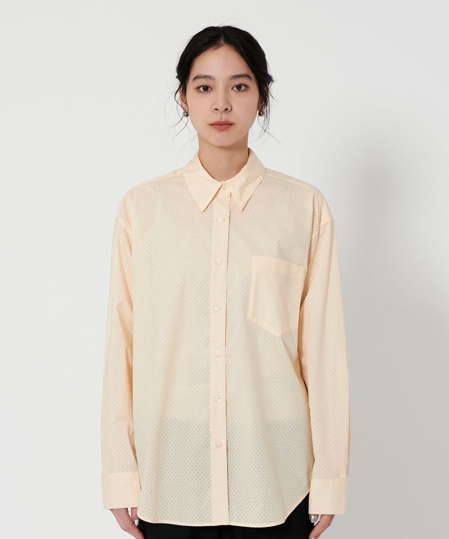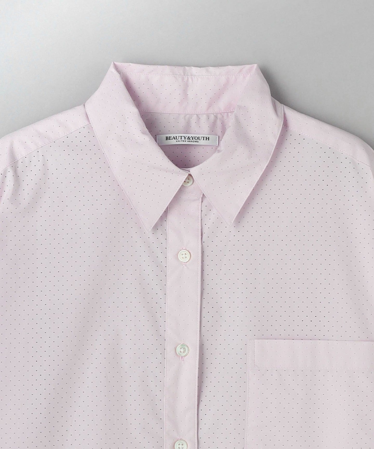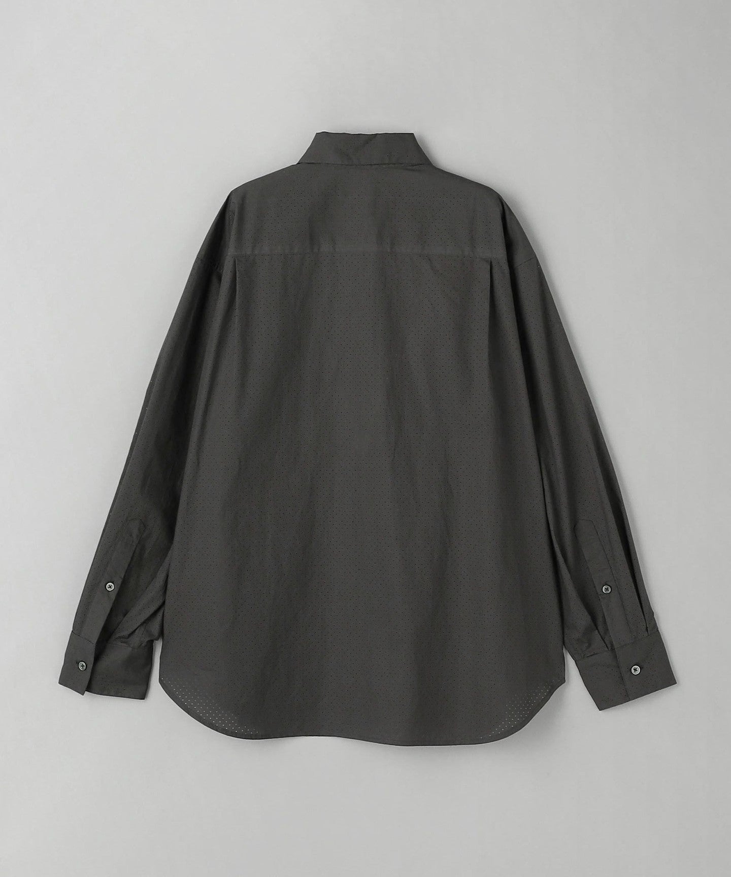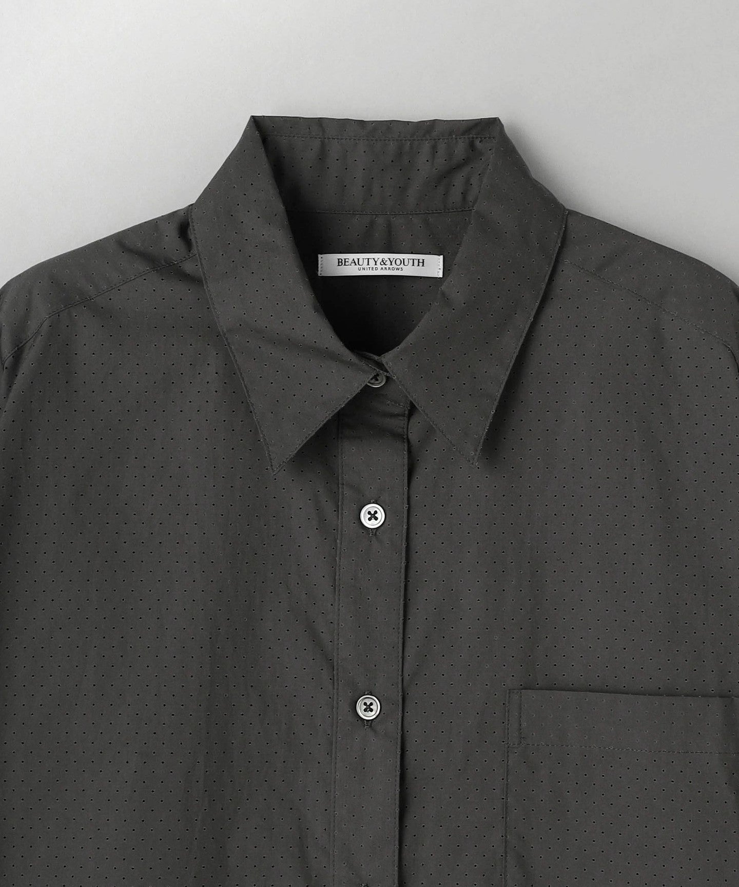 A regular collar shirt with a fresh punched material.