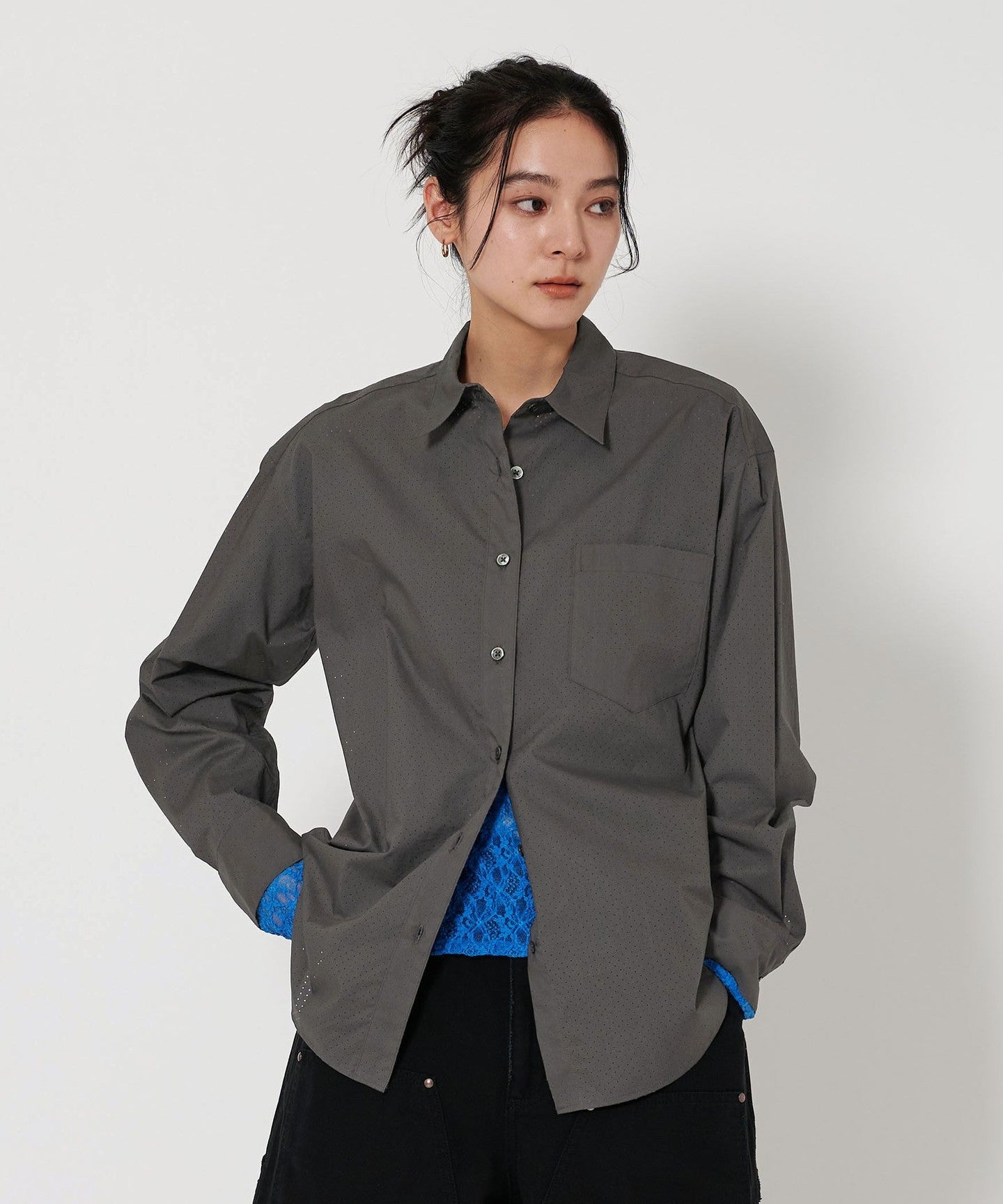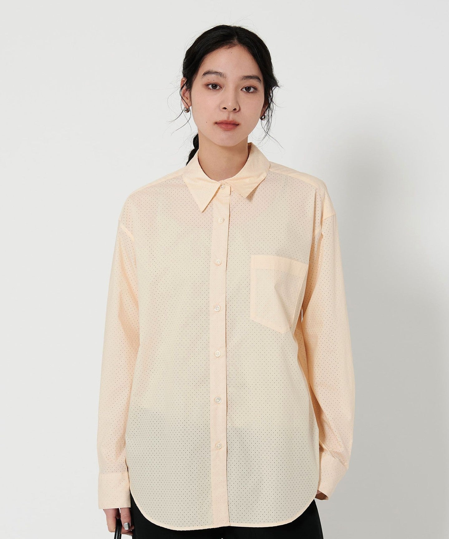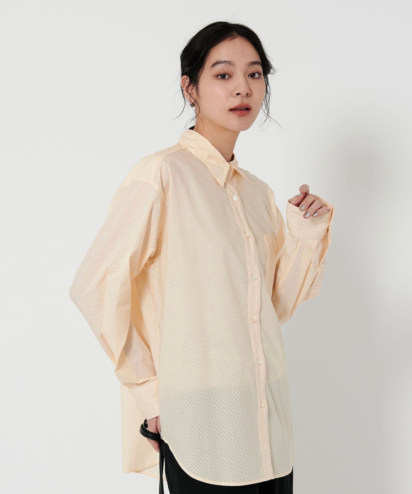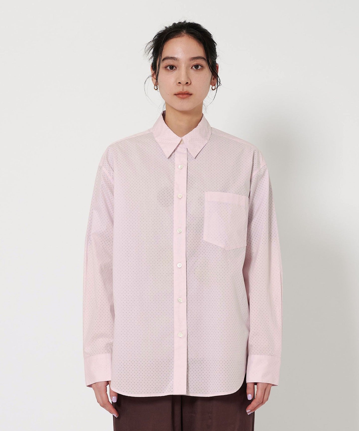 A regular collar shirt with a fresh punched material.