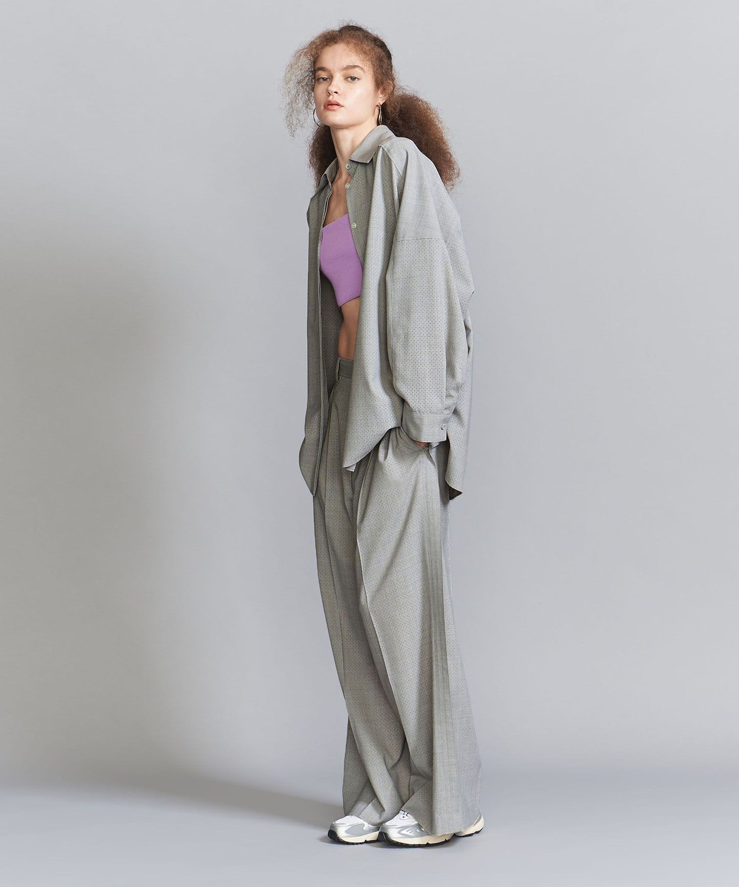 We recommend pairing it with wide slacks made of the same material.