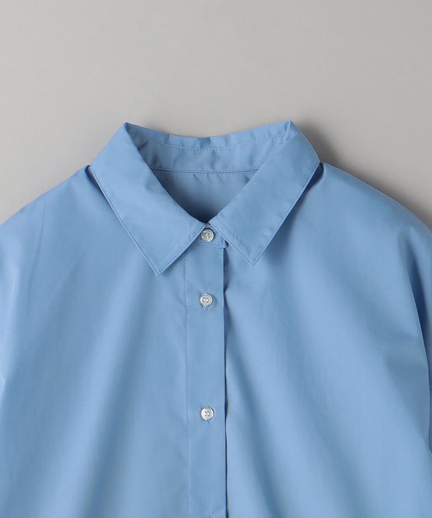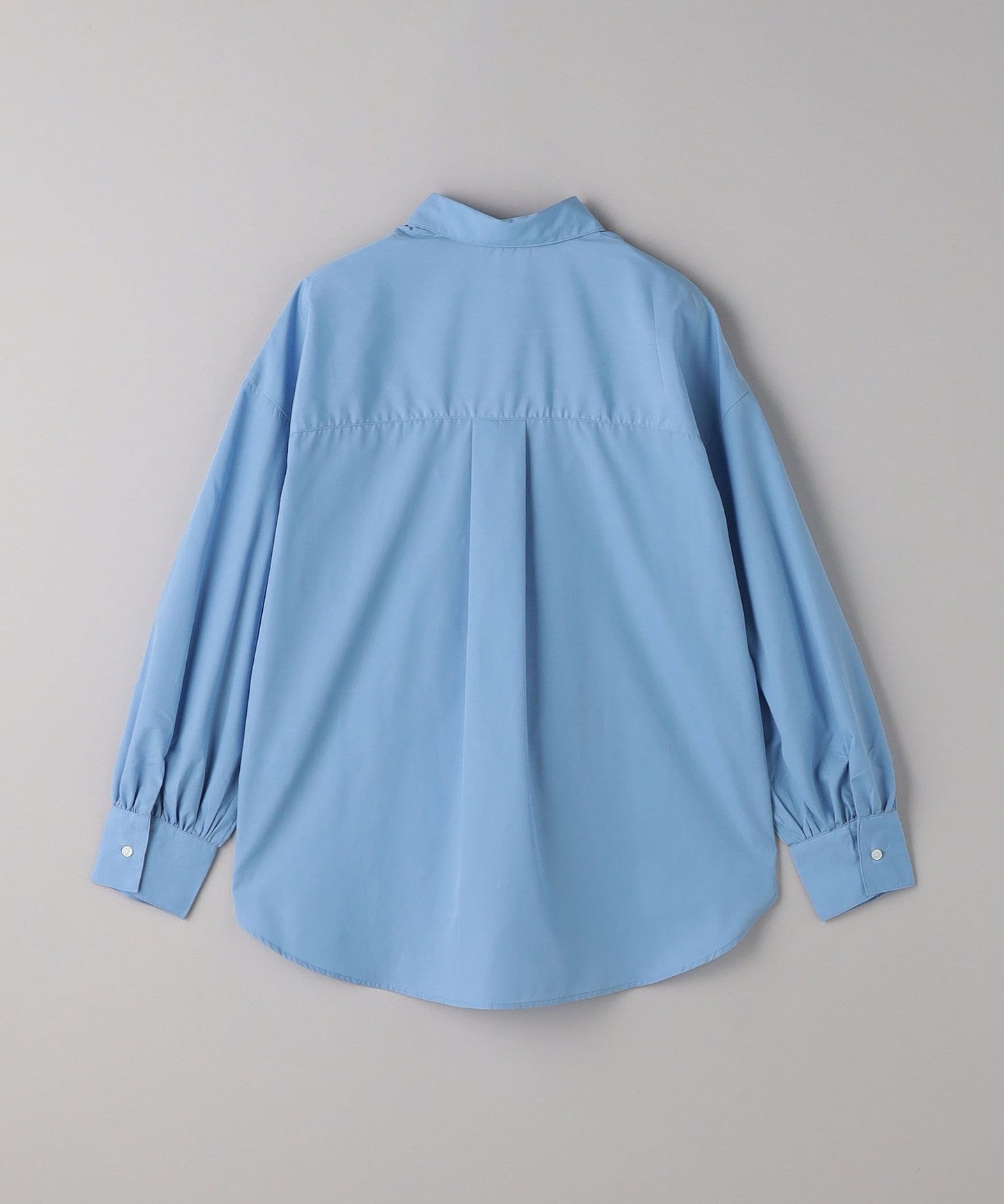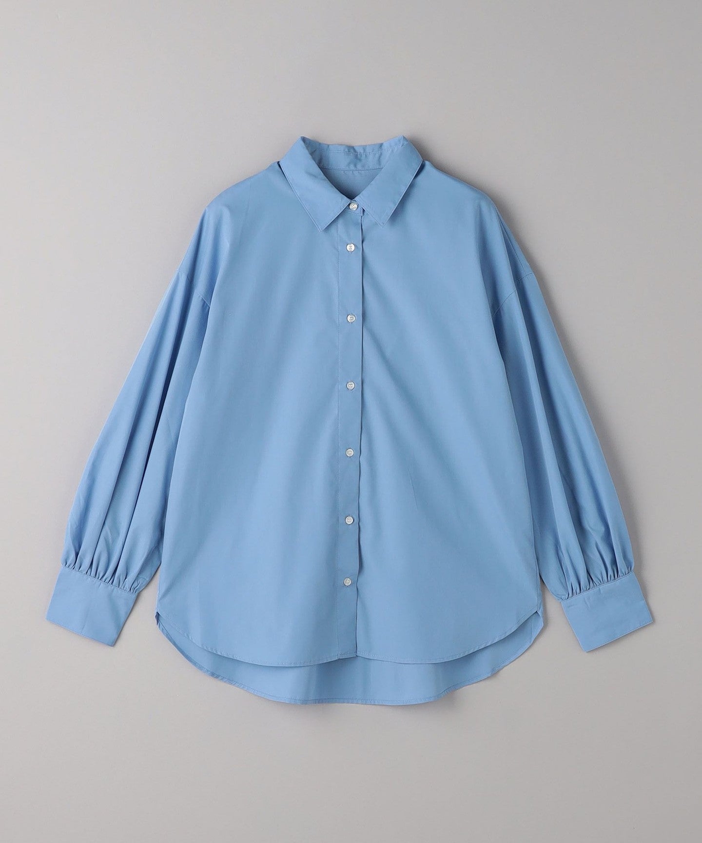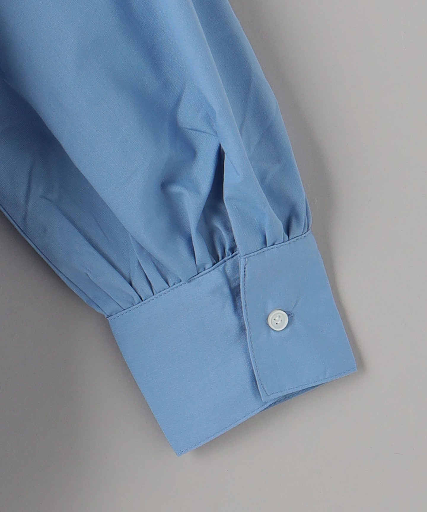 The shirt has a wide body with dropped shoulders and voluminous sleeves with gathered cuffs, creating a soft, feminine silhouette.