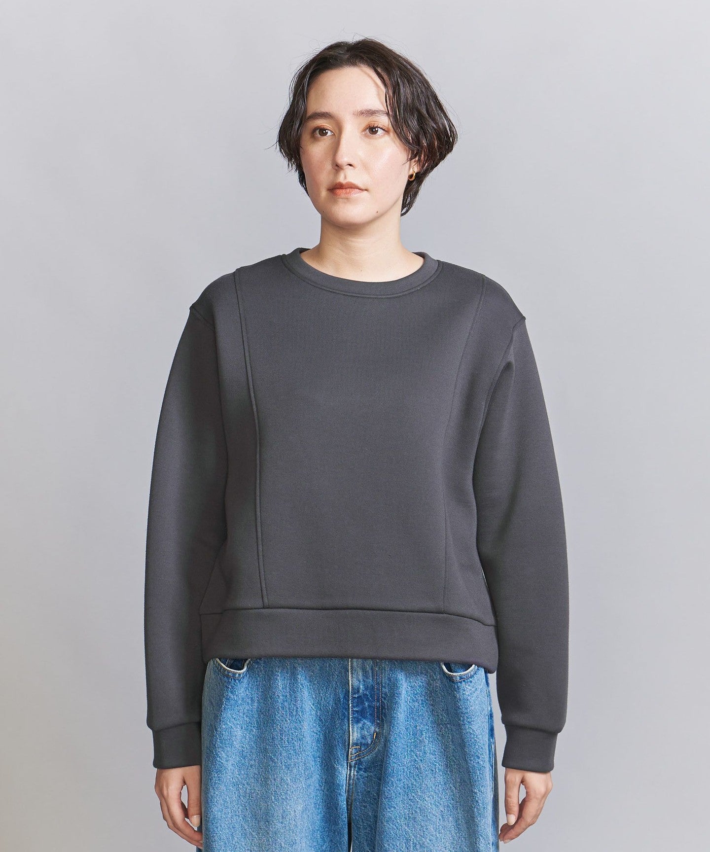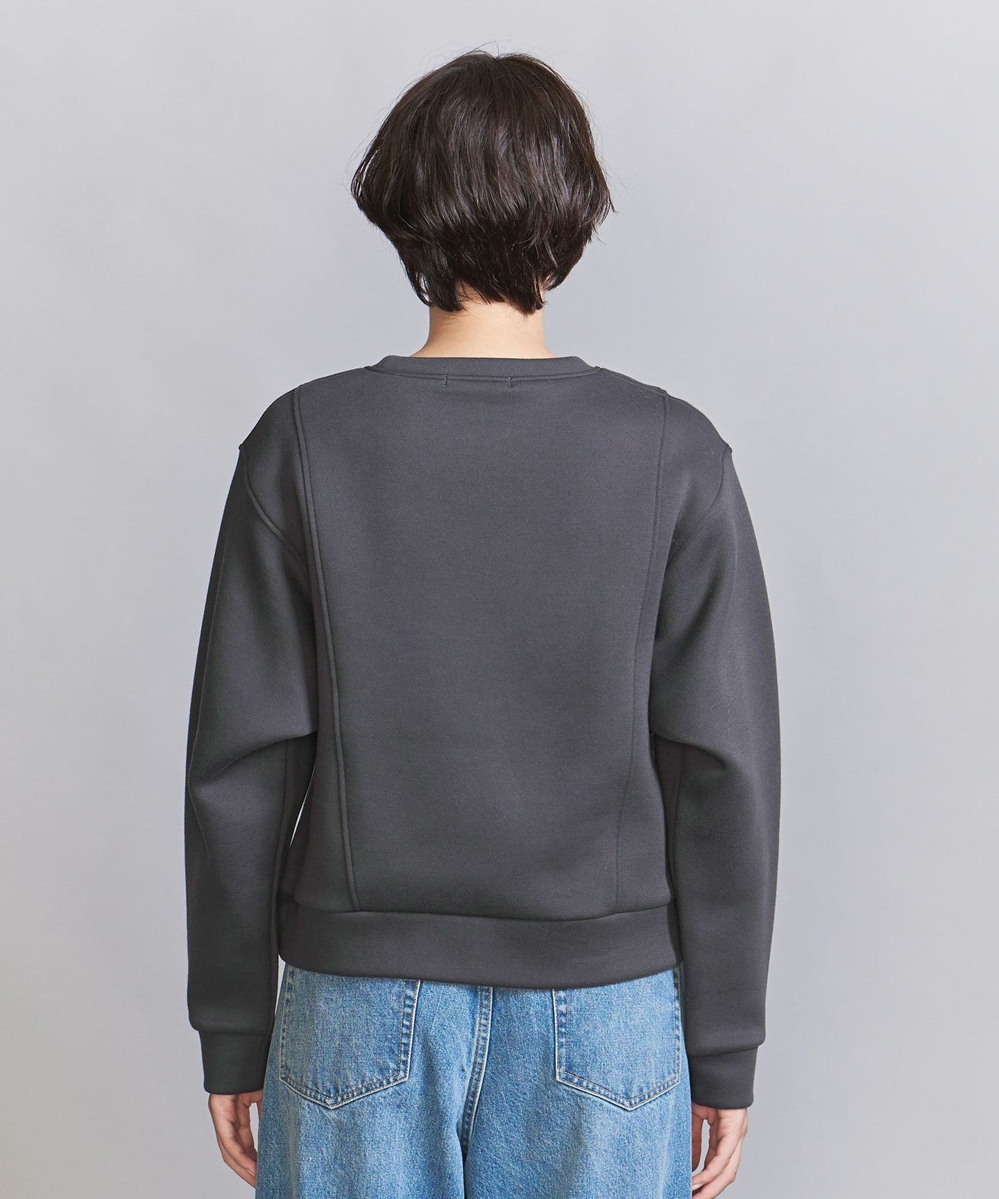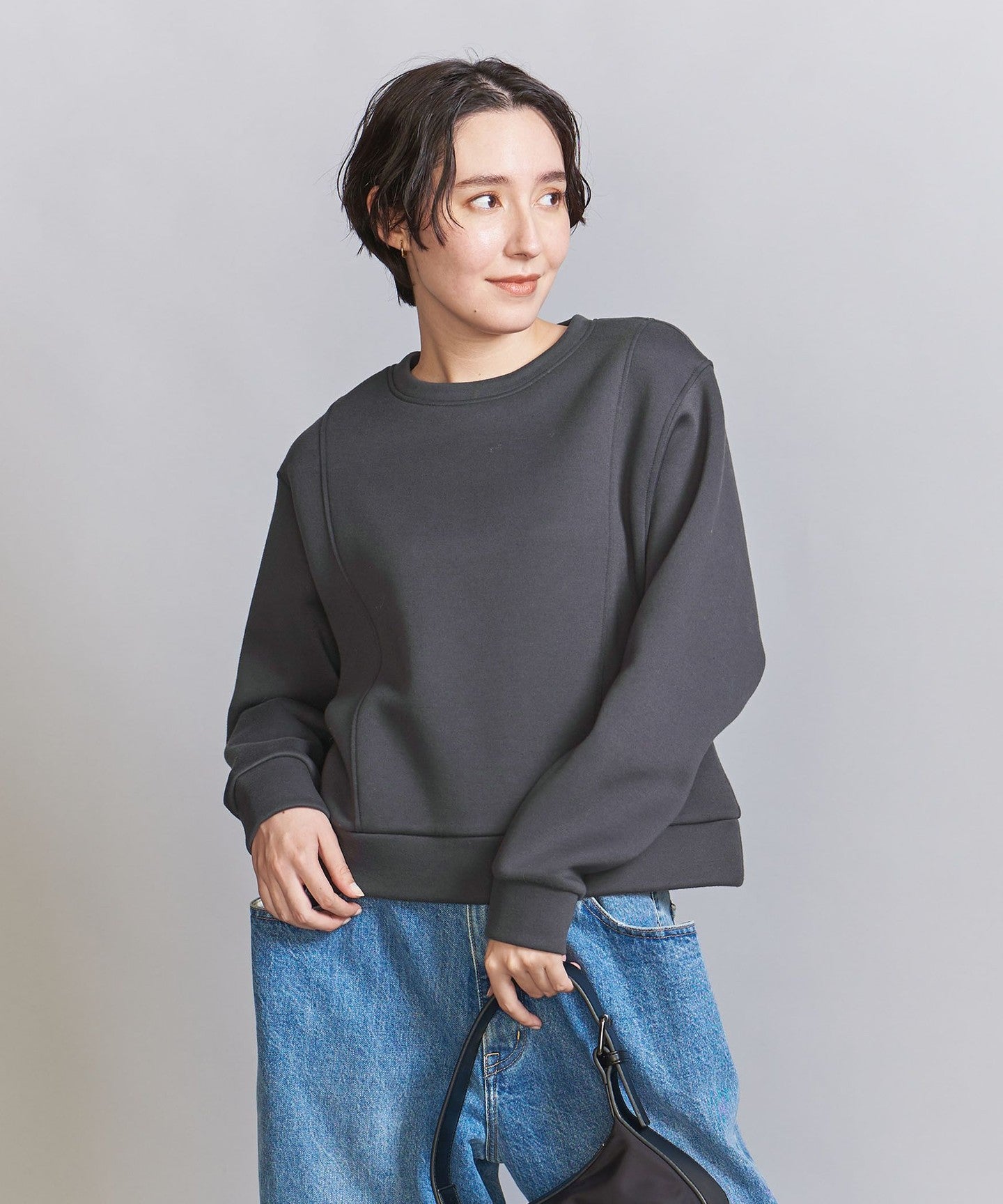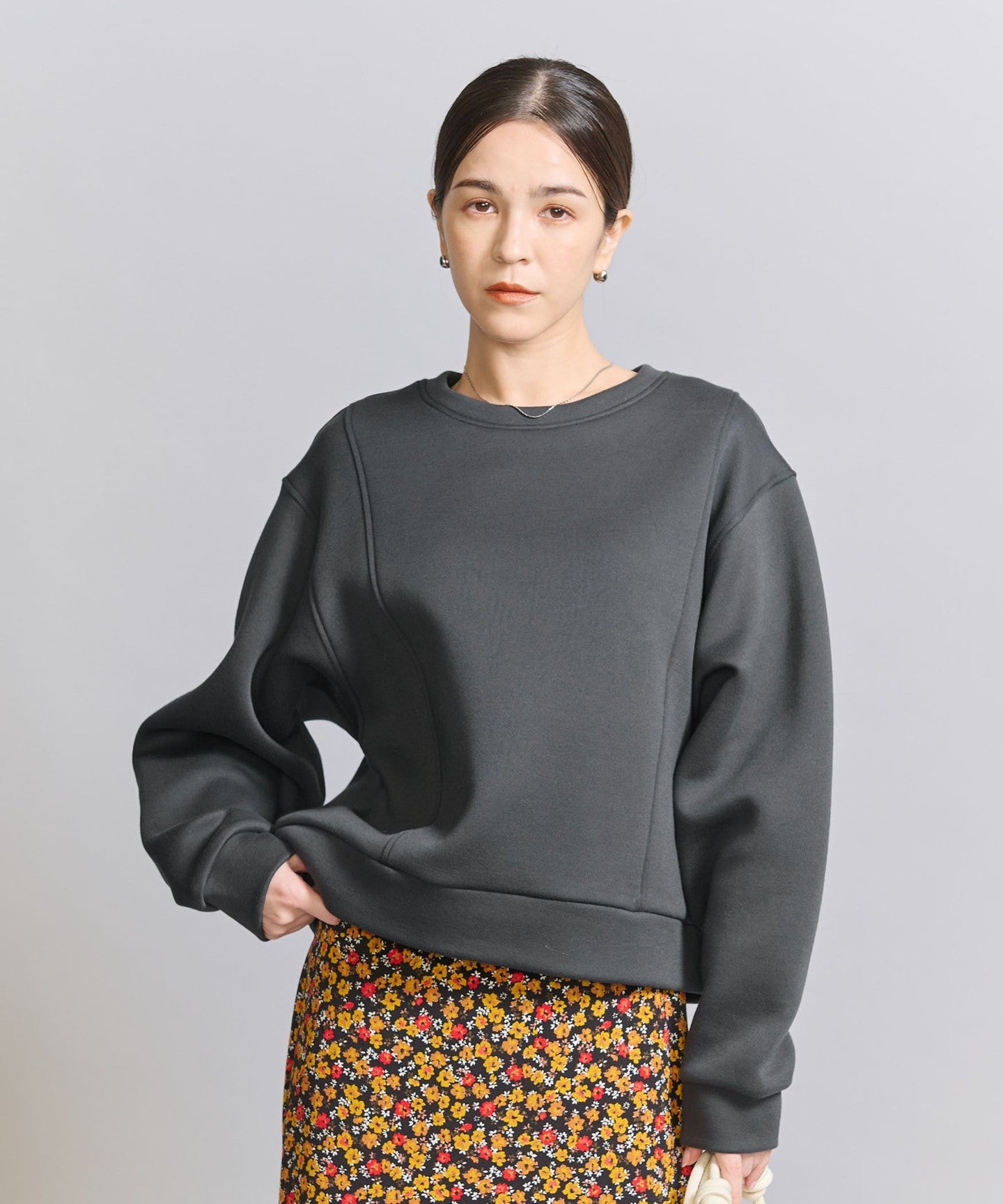 It goes well with bottoms that have details, such as side-line pants, and also with high-waisted wide pants.
