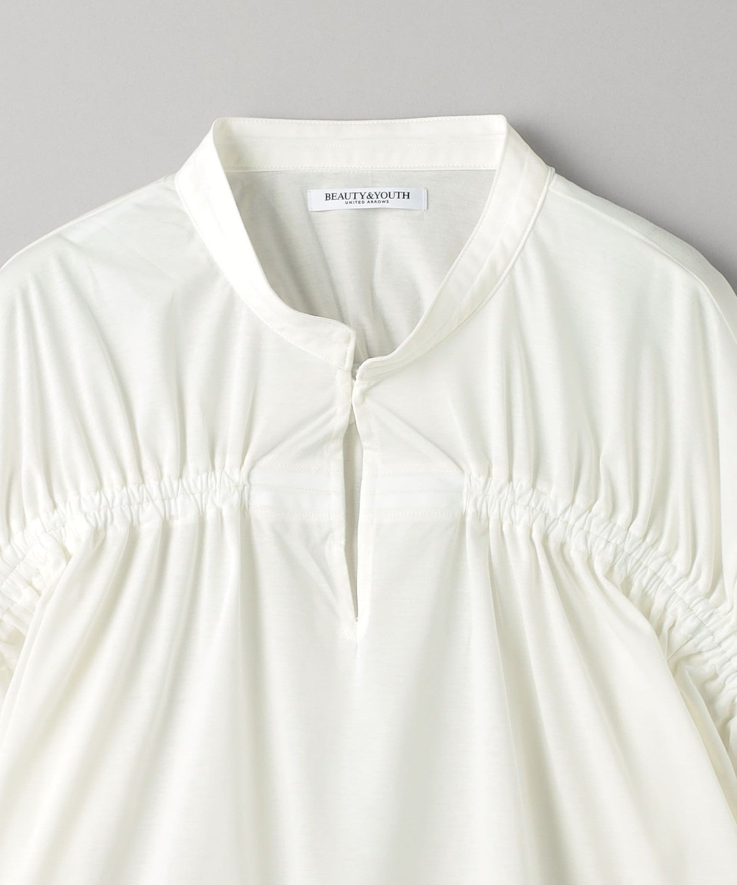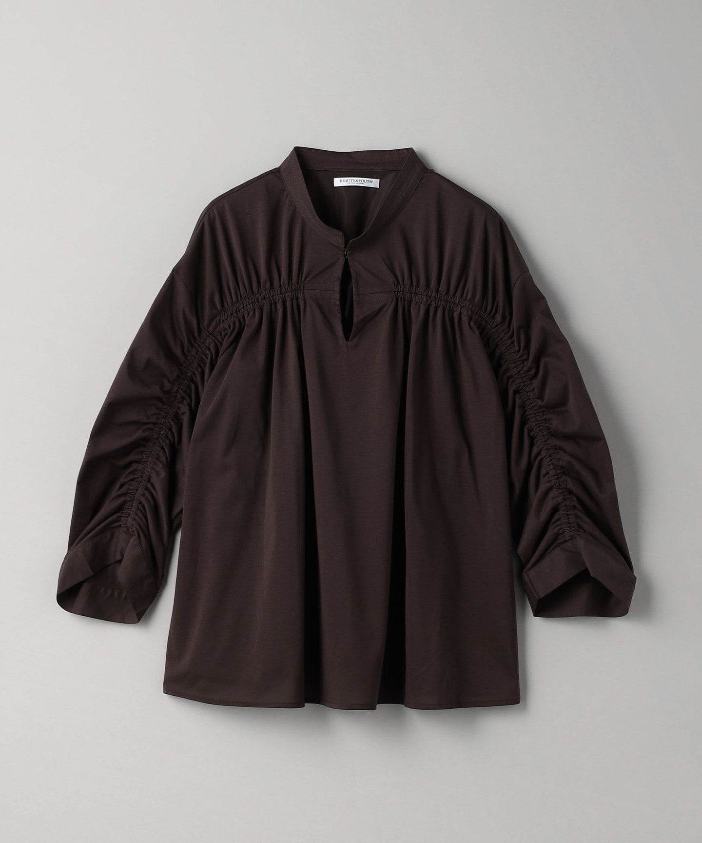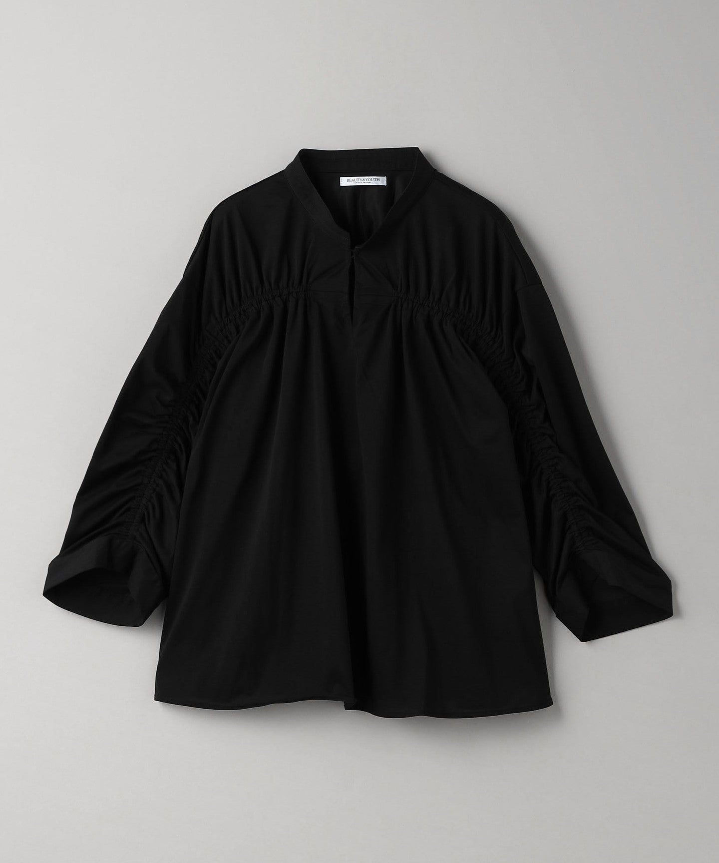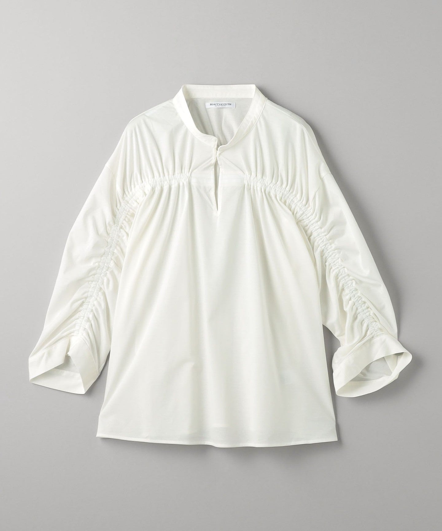 A pullover top with a gathered design made from woven fabric-like cut and sew material.