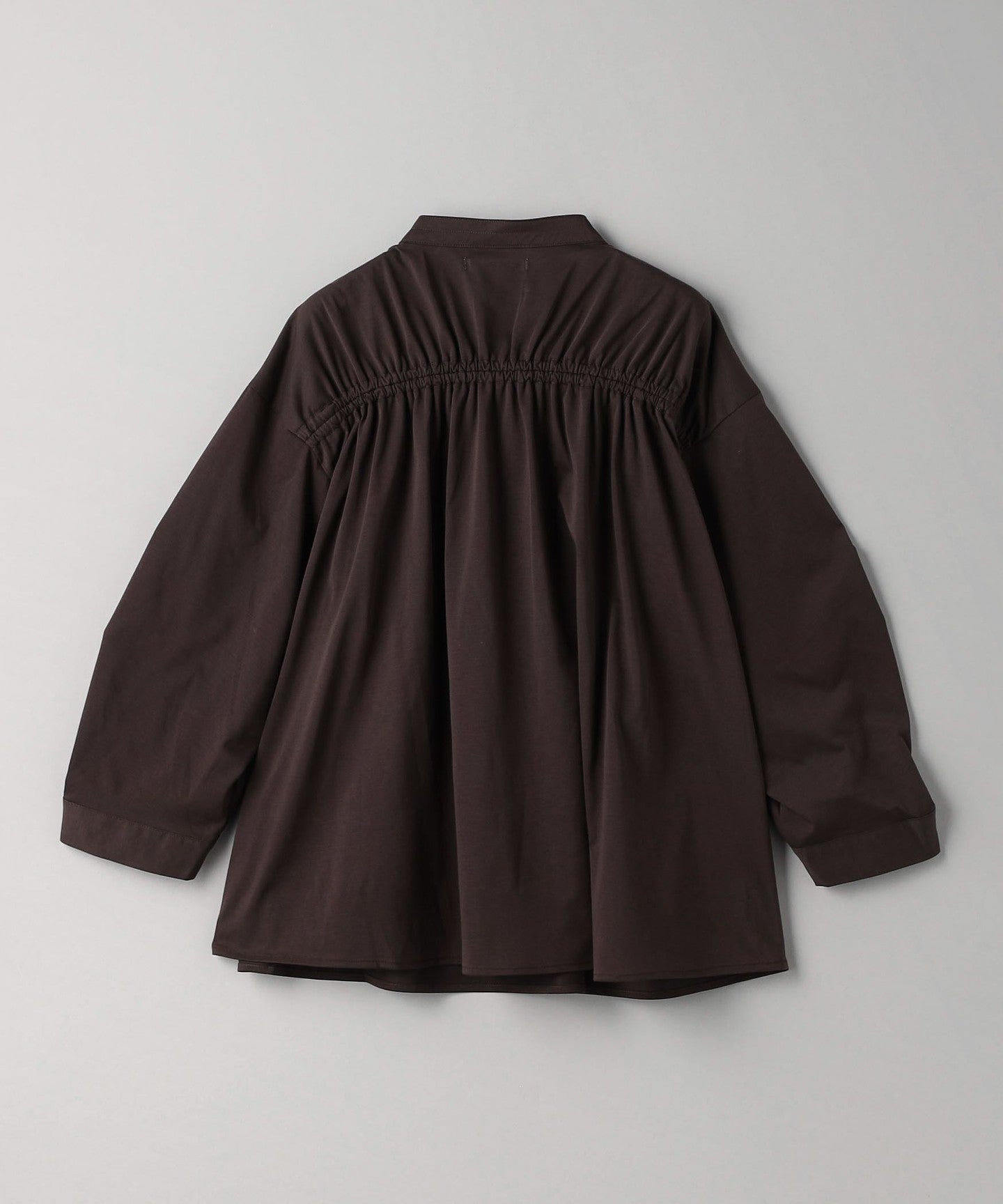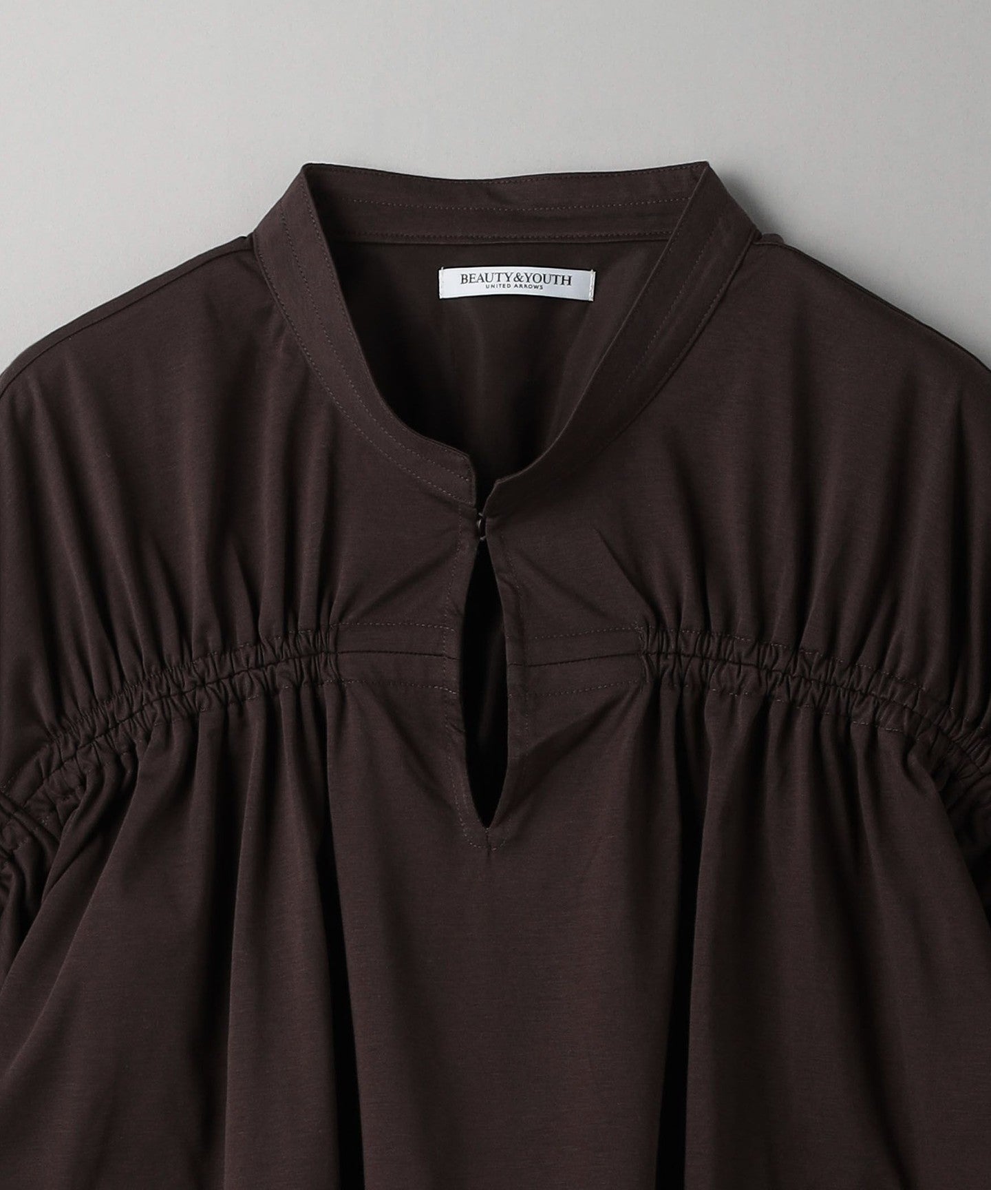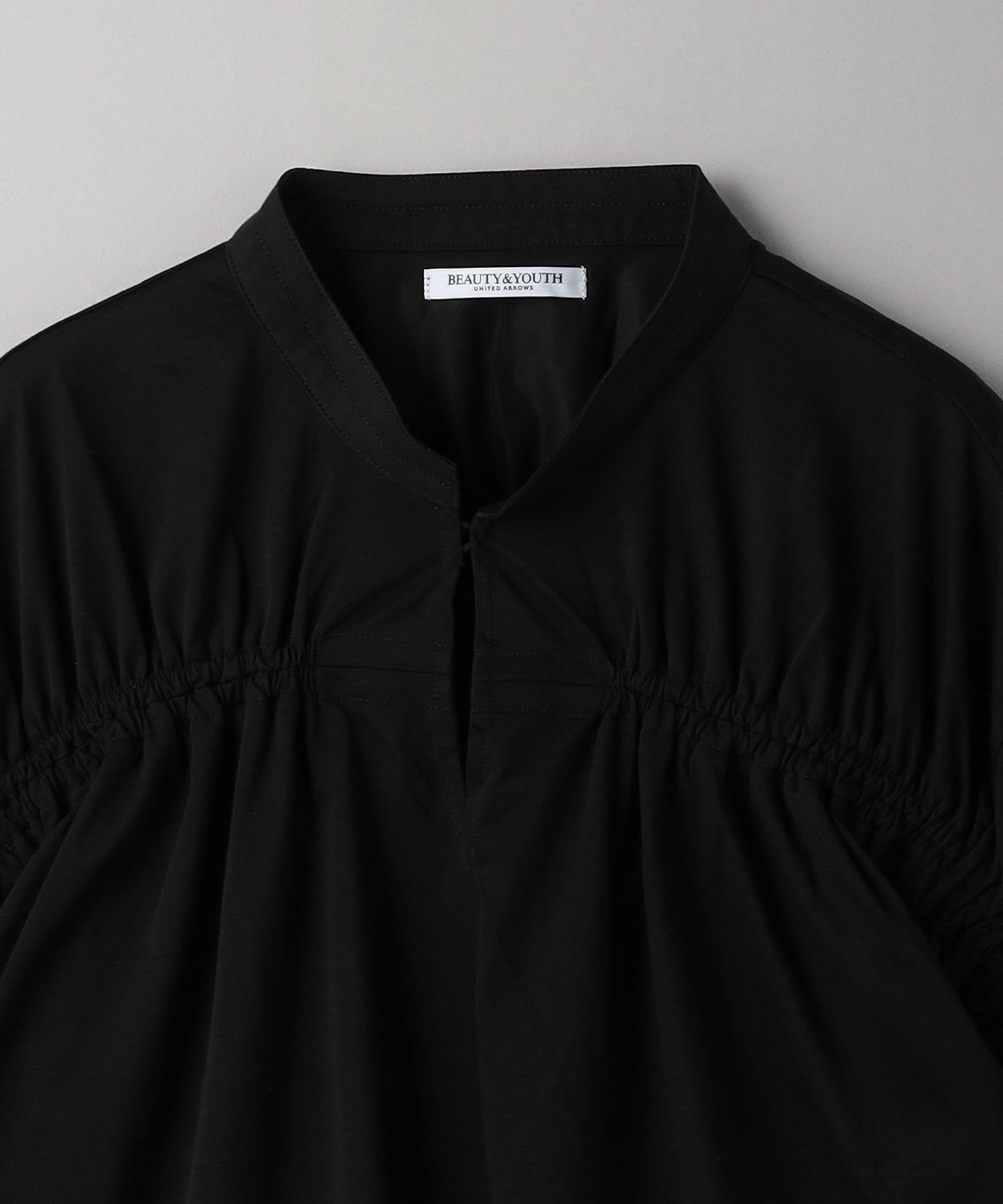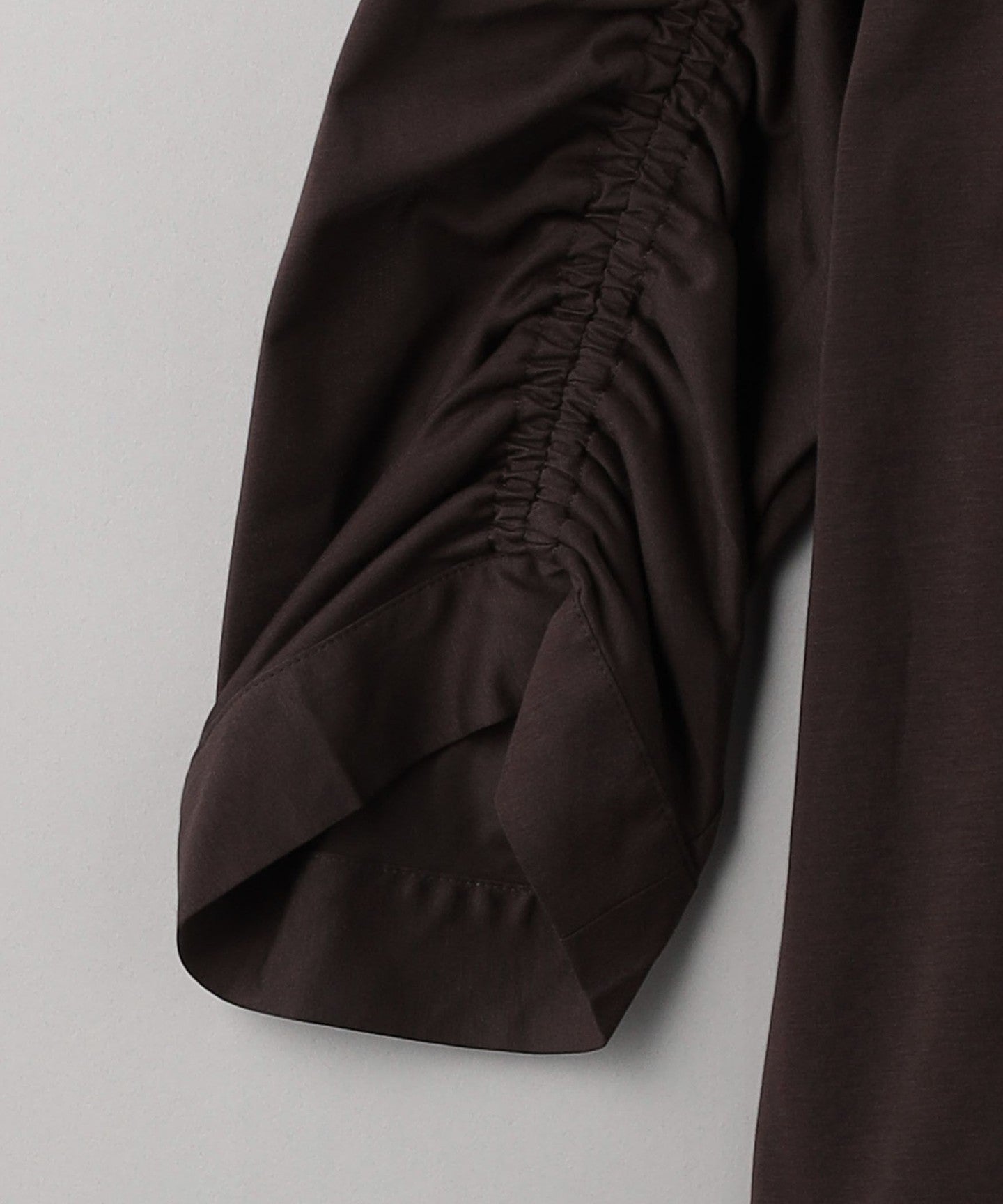 A pullover top with a gathered design made from woven fabric-like cut and sew material.
