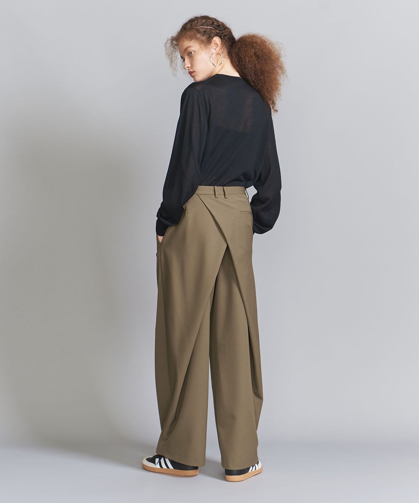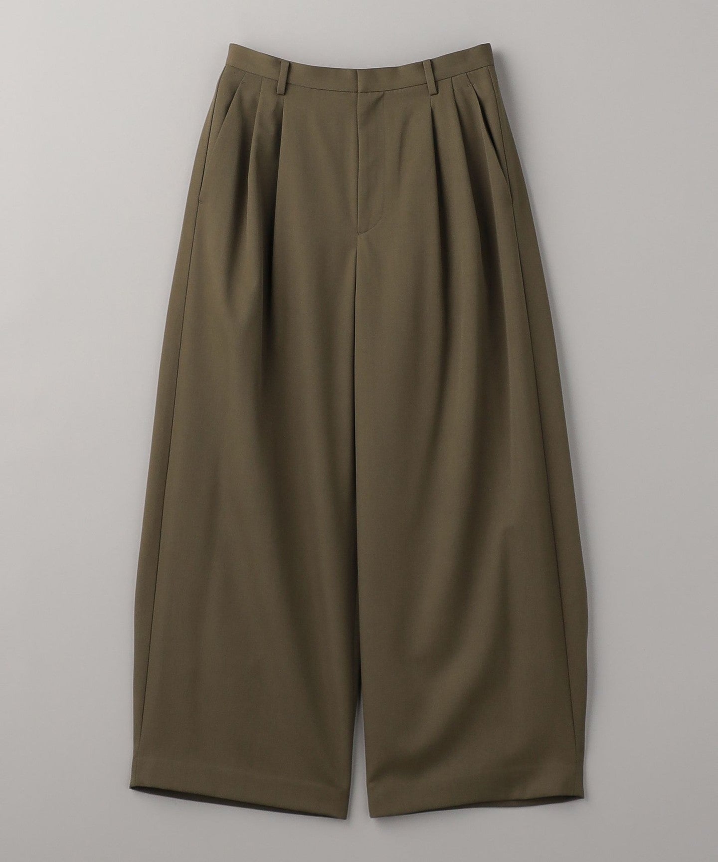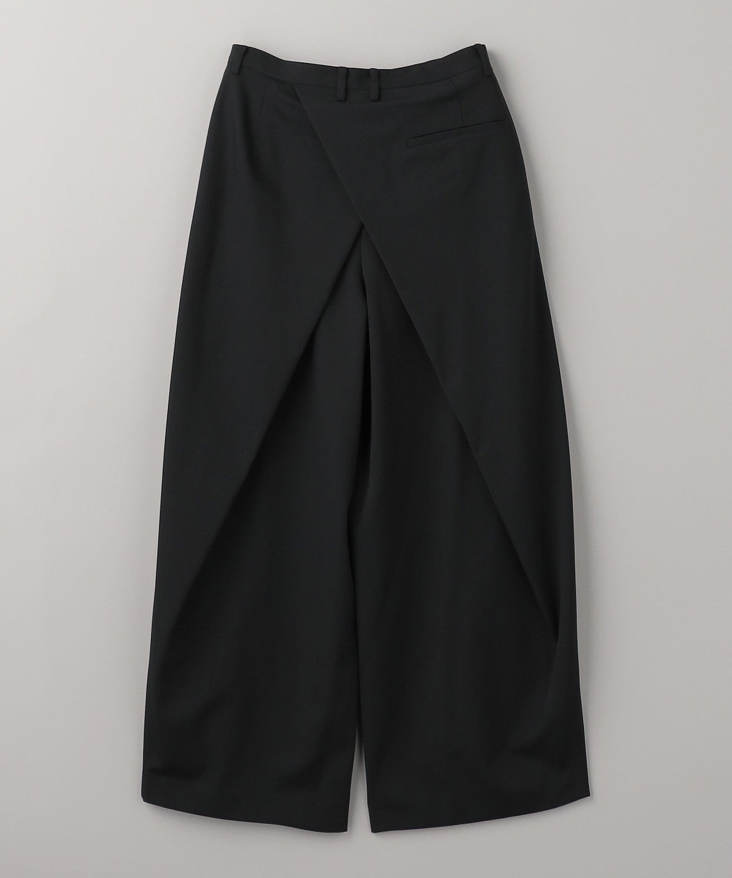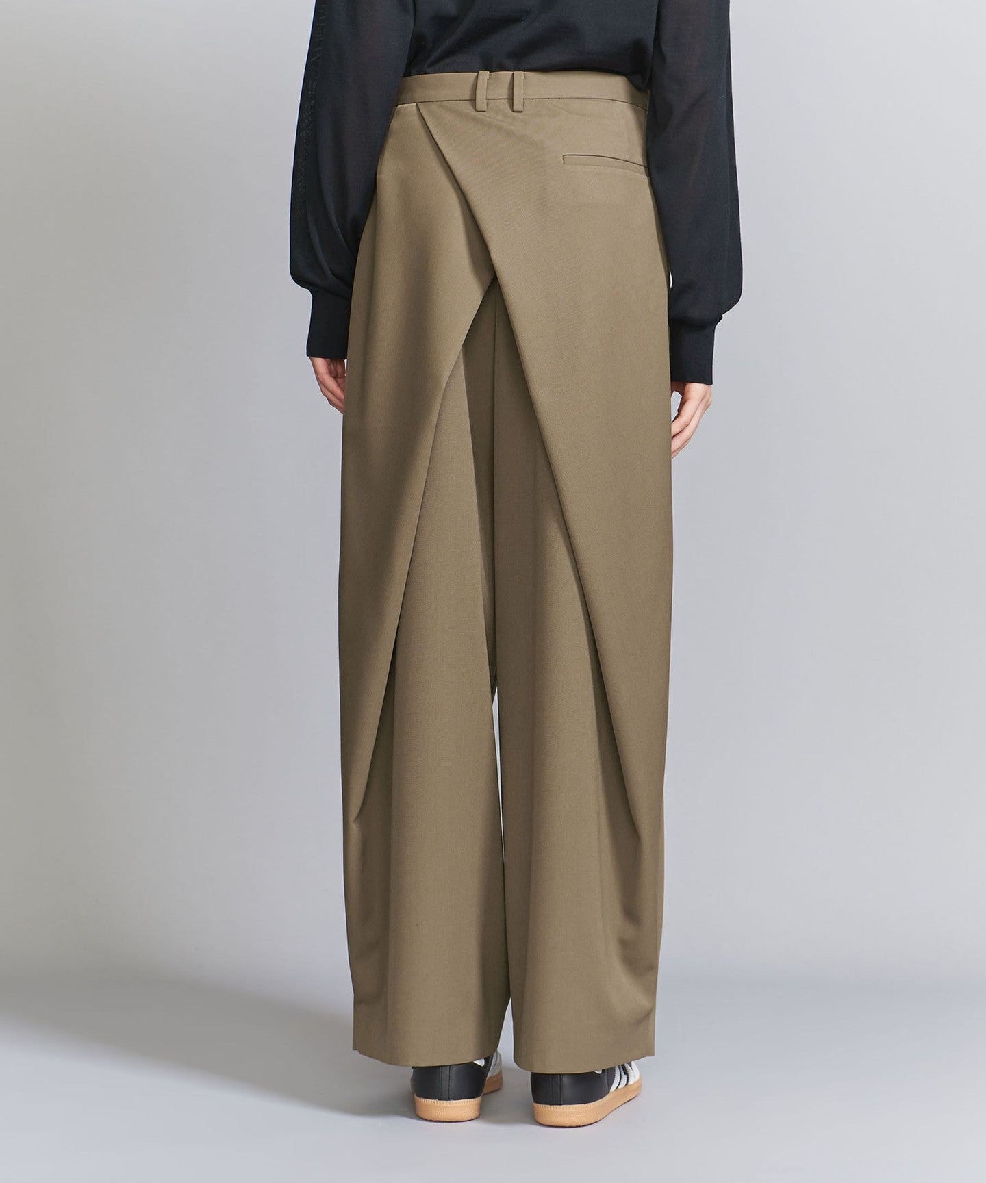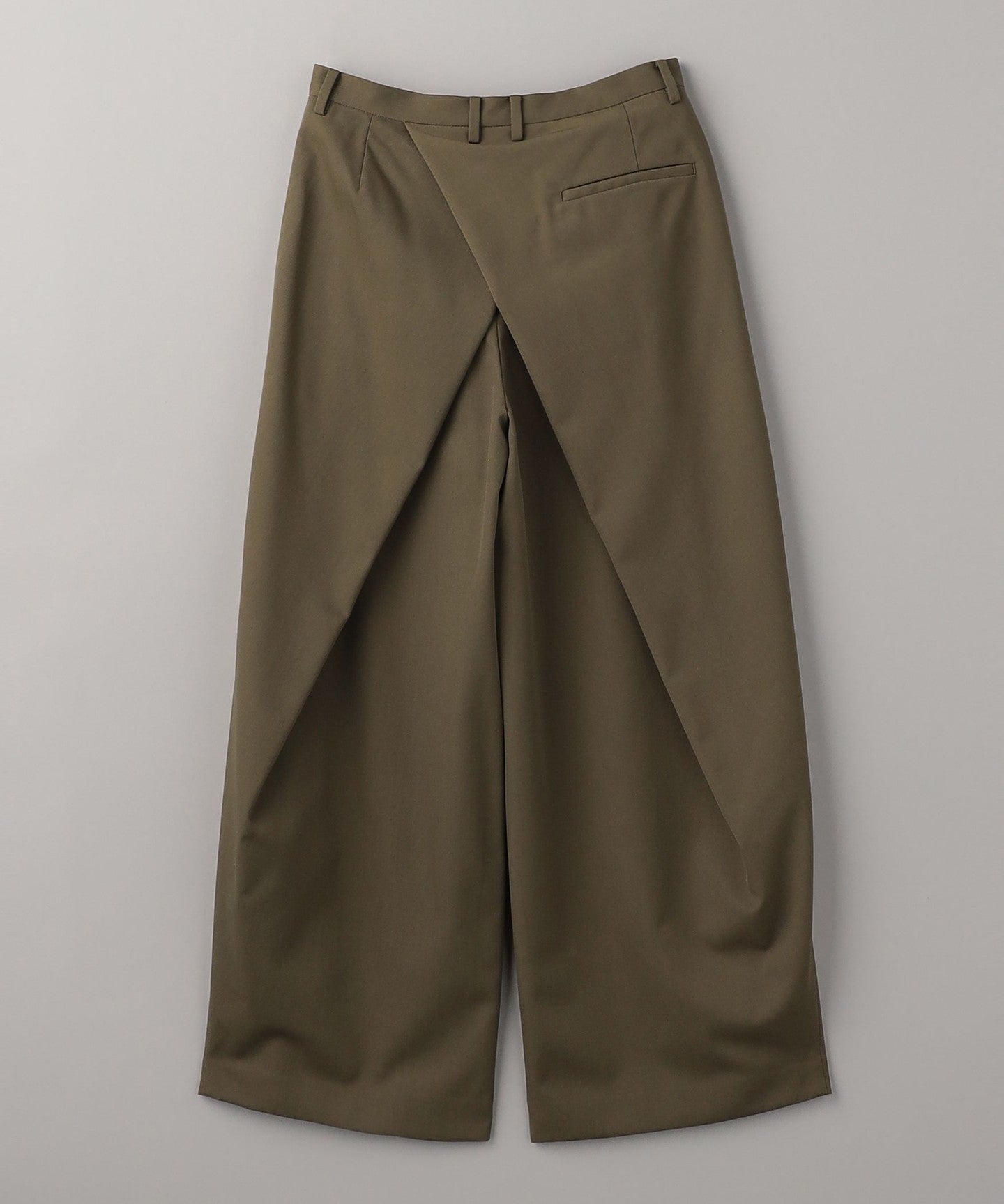 From the front, they look like basic two-pleat pants, but the back wrap at the hem gives them a unique silhouette, giving them a unique look.
