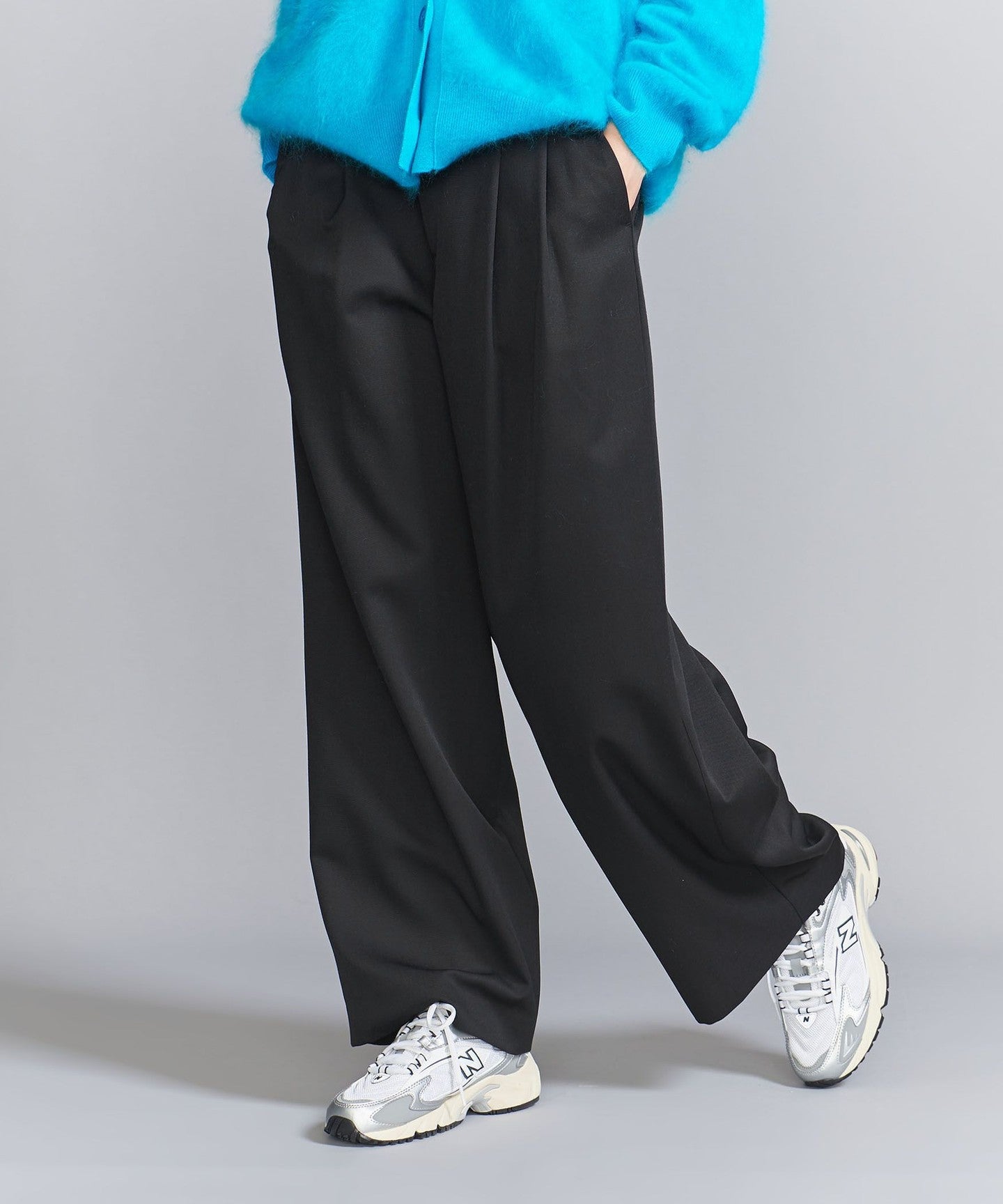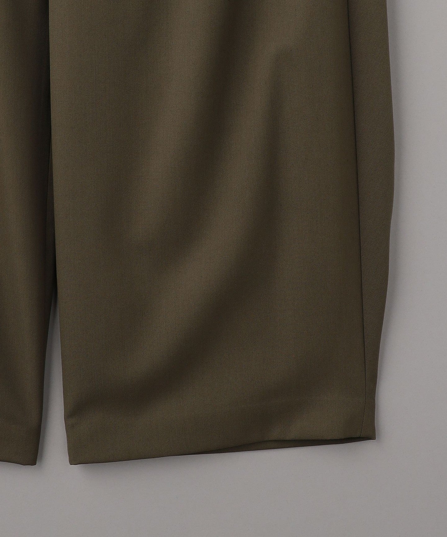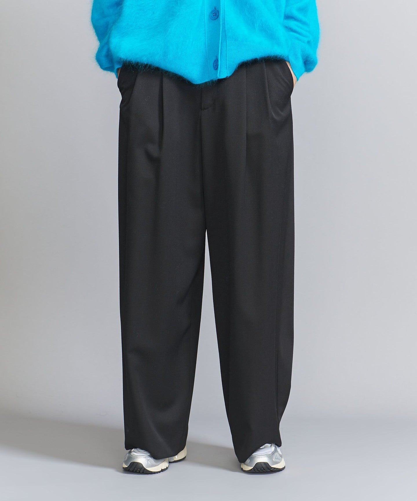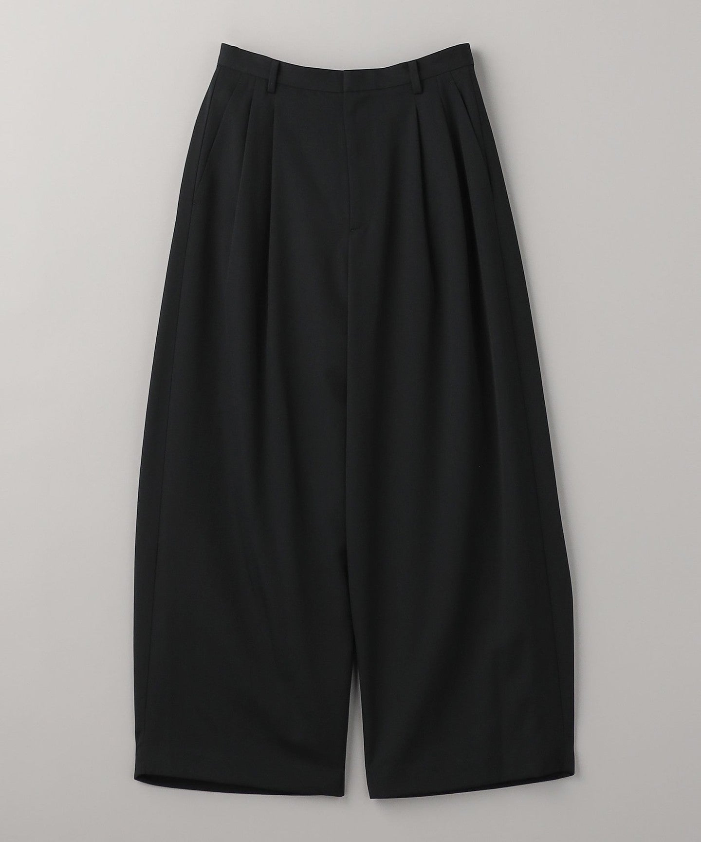 From the front, they look like basic two-pleat pants, but the back wrap at the hem gives them a unique silhouette, giving them a unique look.