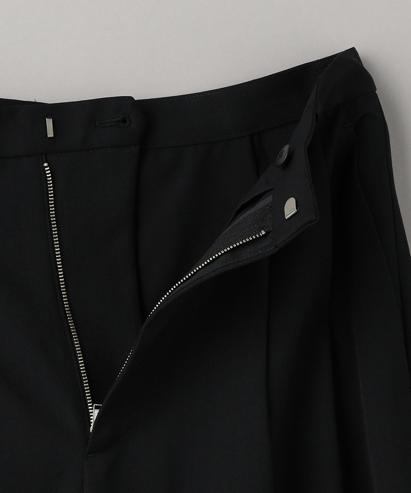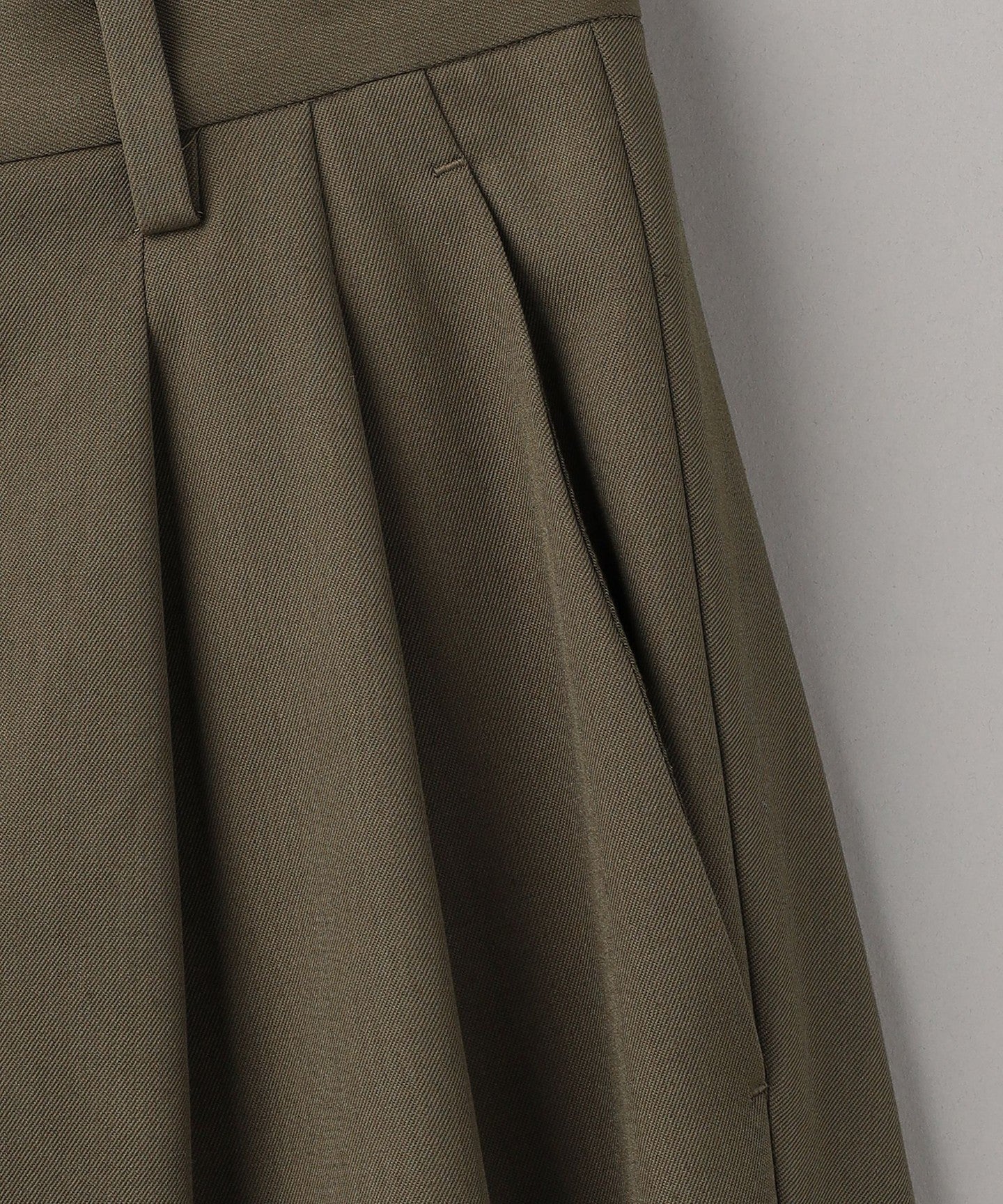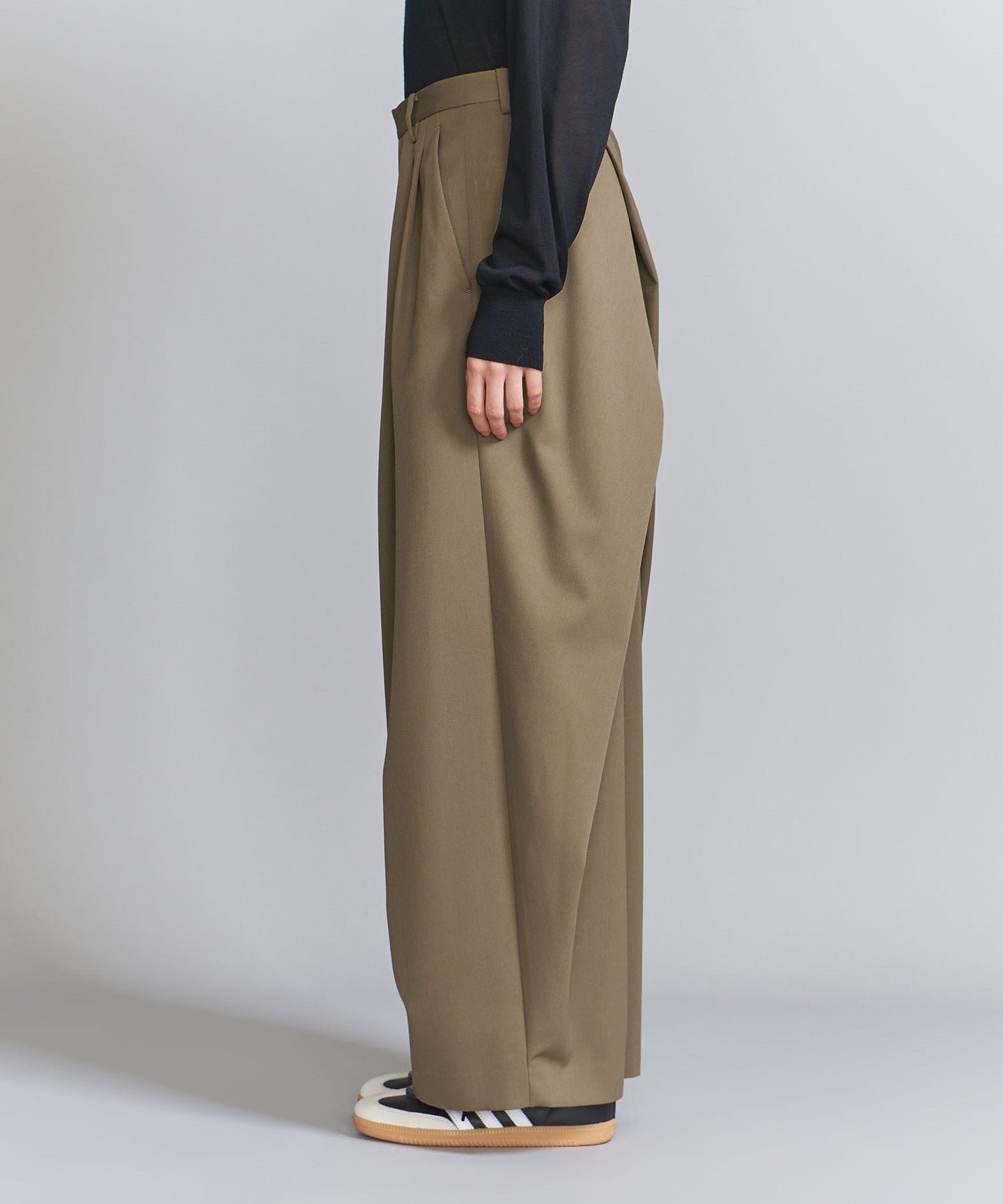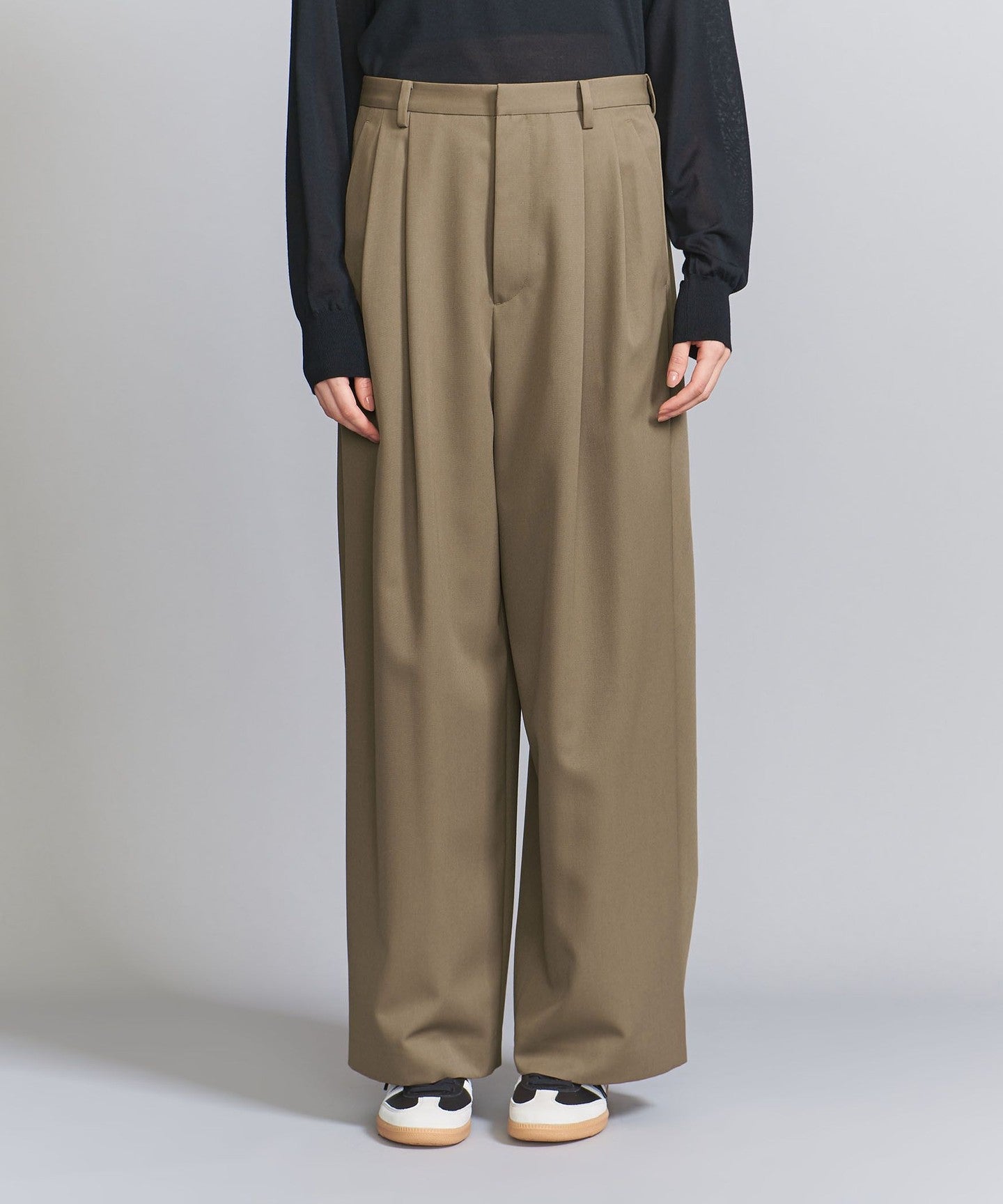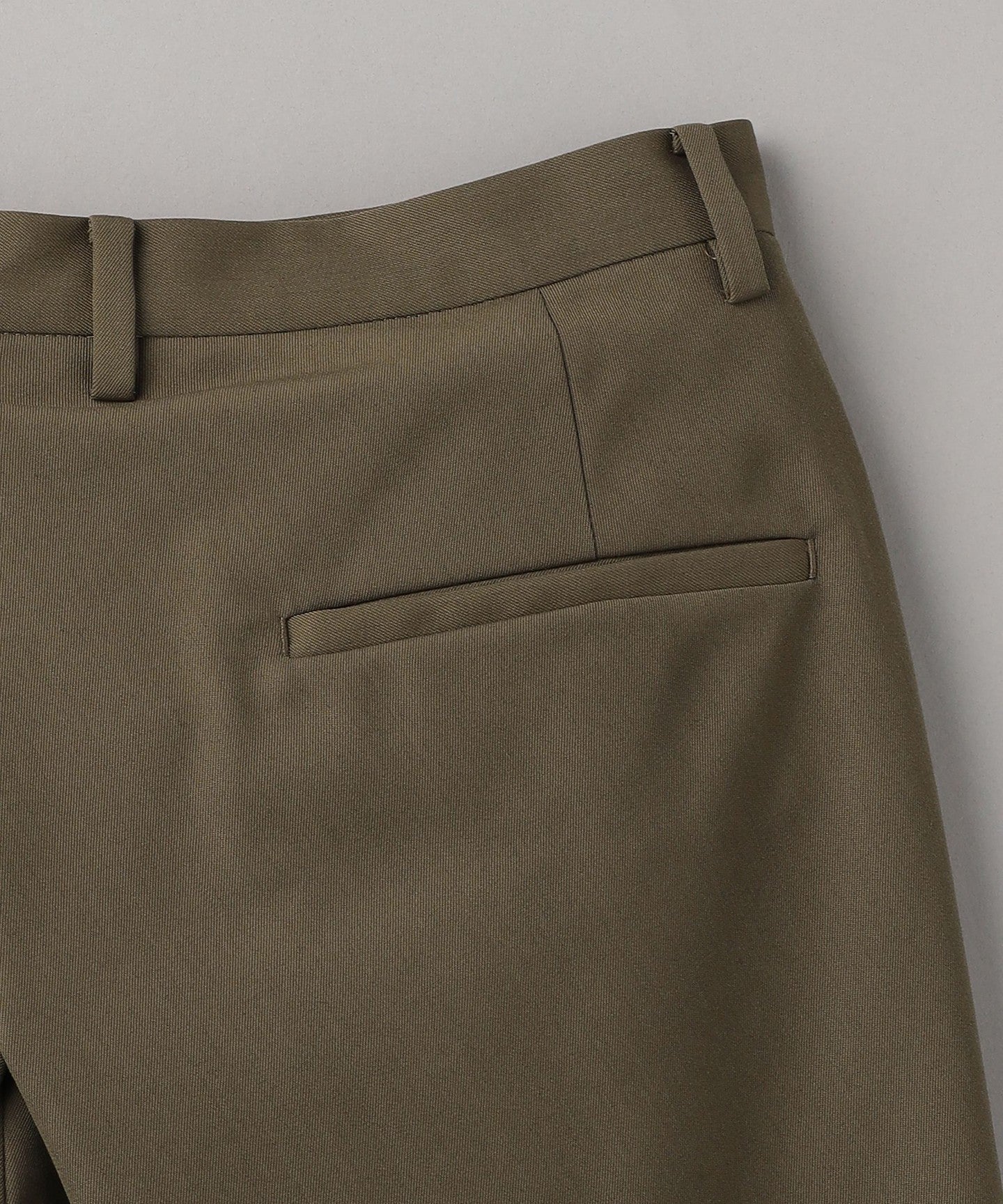 From the front, they look like basic two-pleat pants, but the back wrap at the hem gives them a unique silhouette, giving them a unique look.