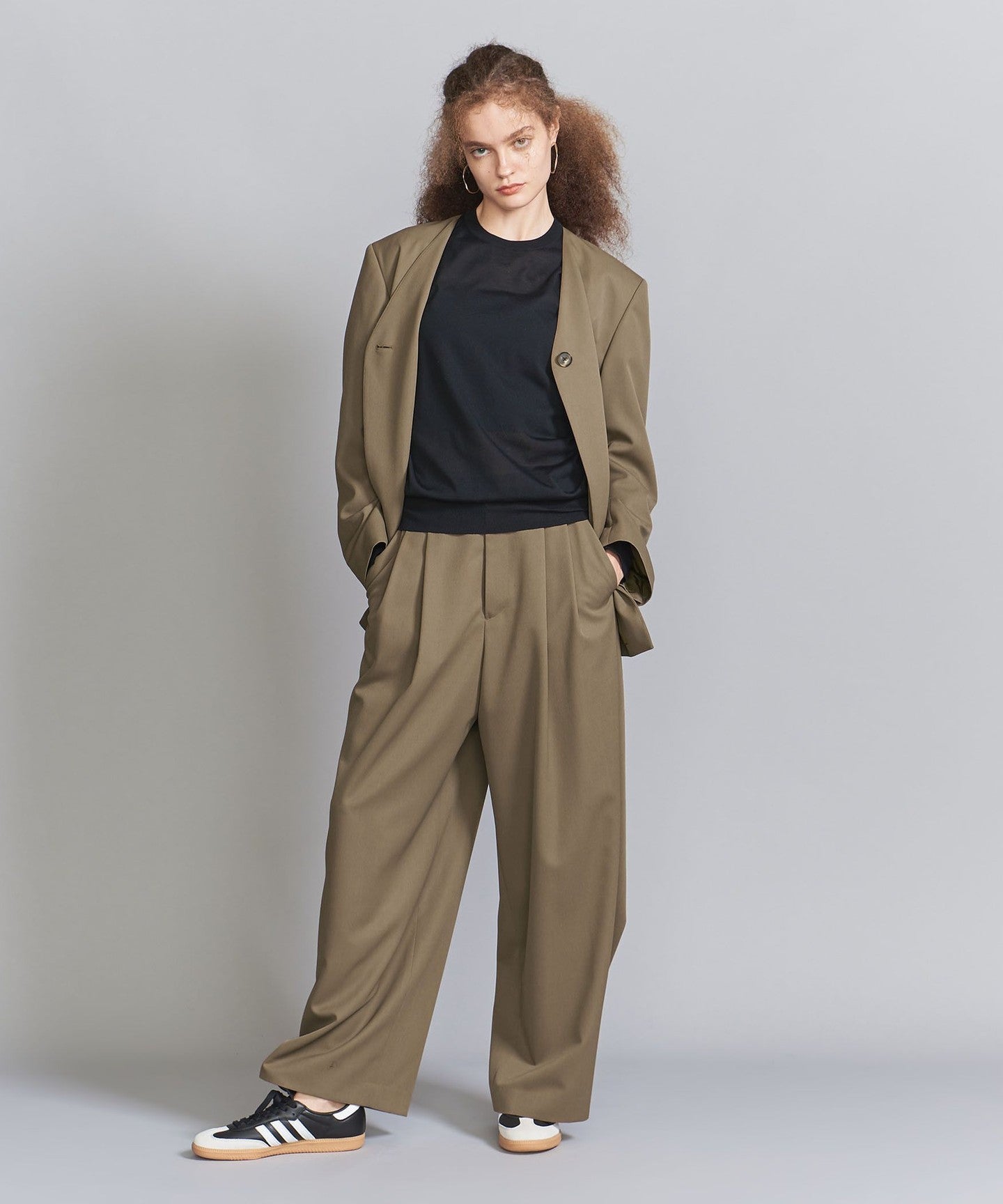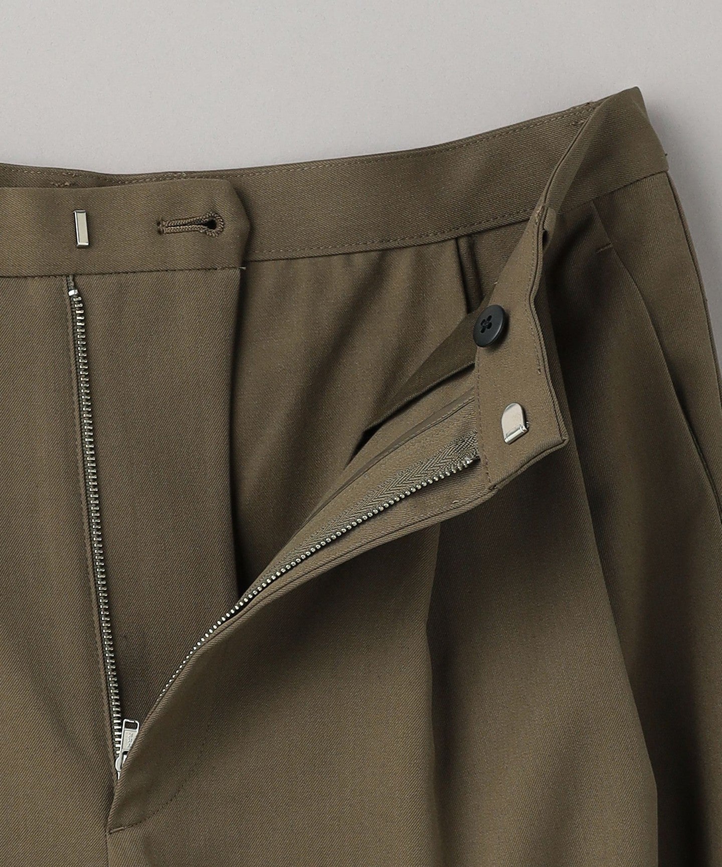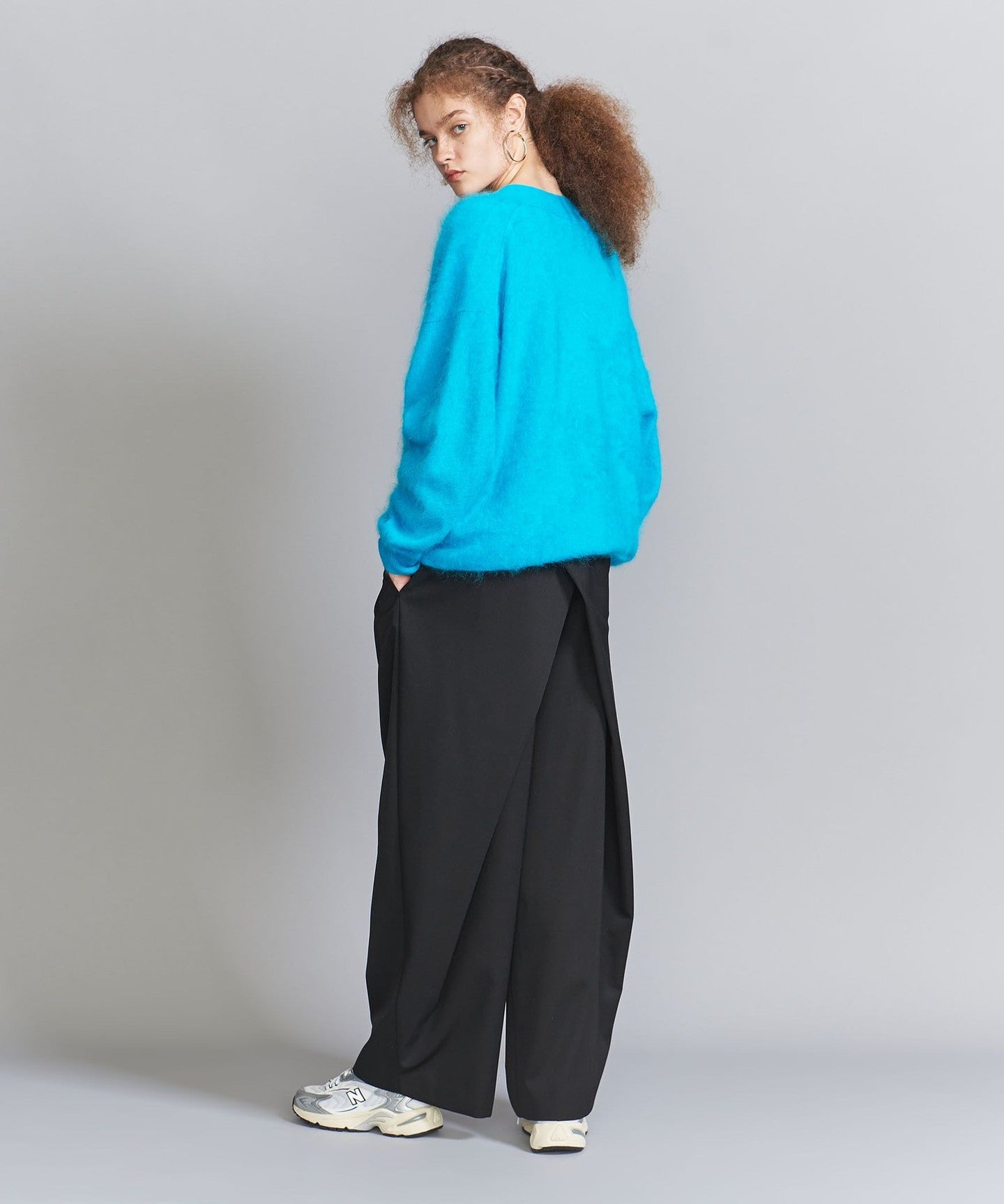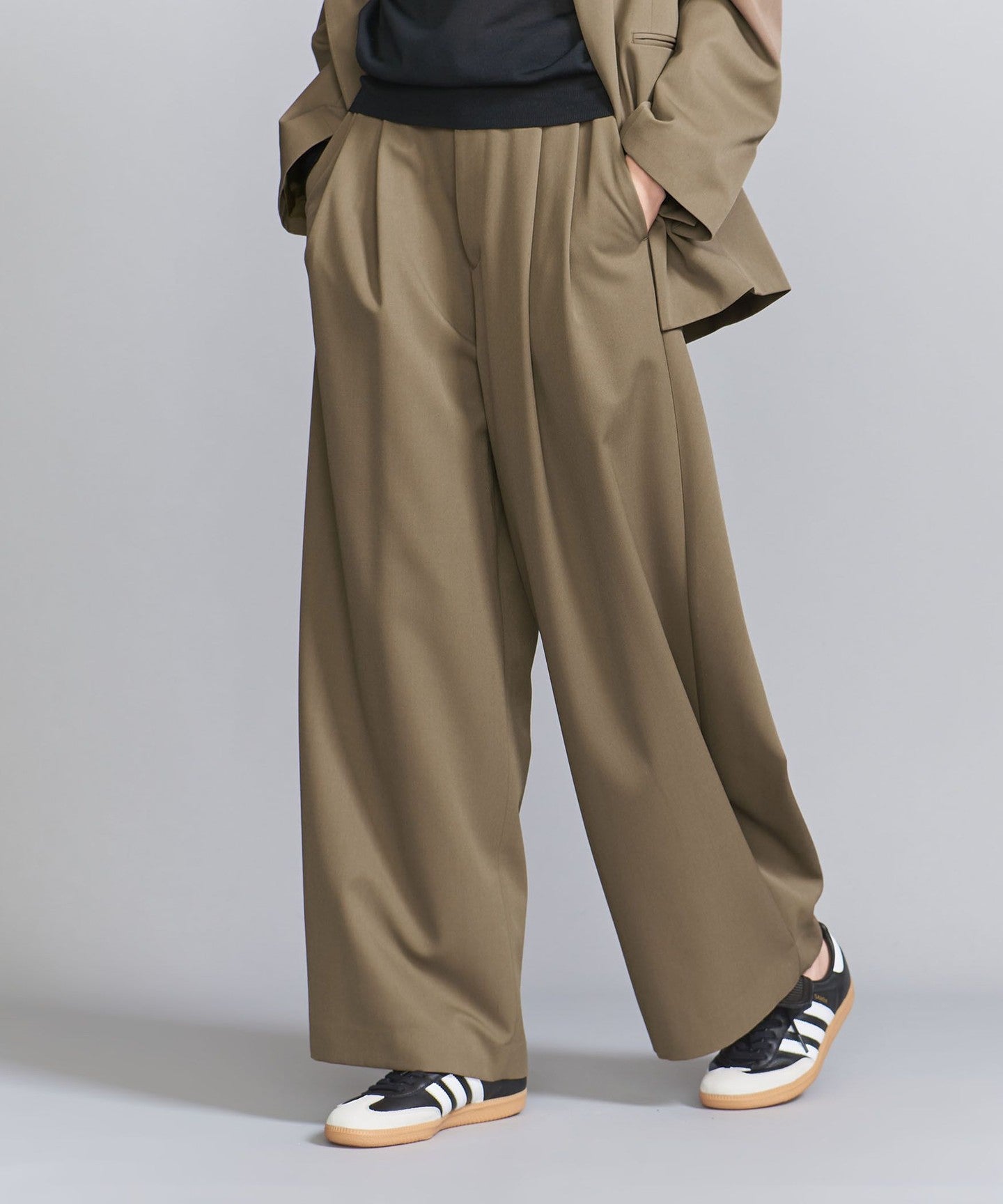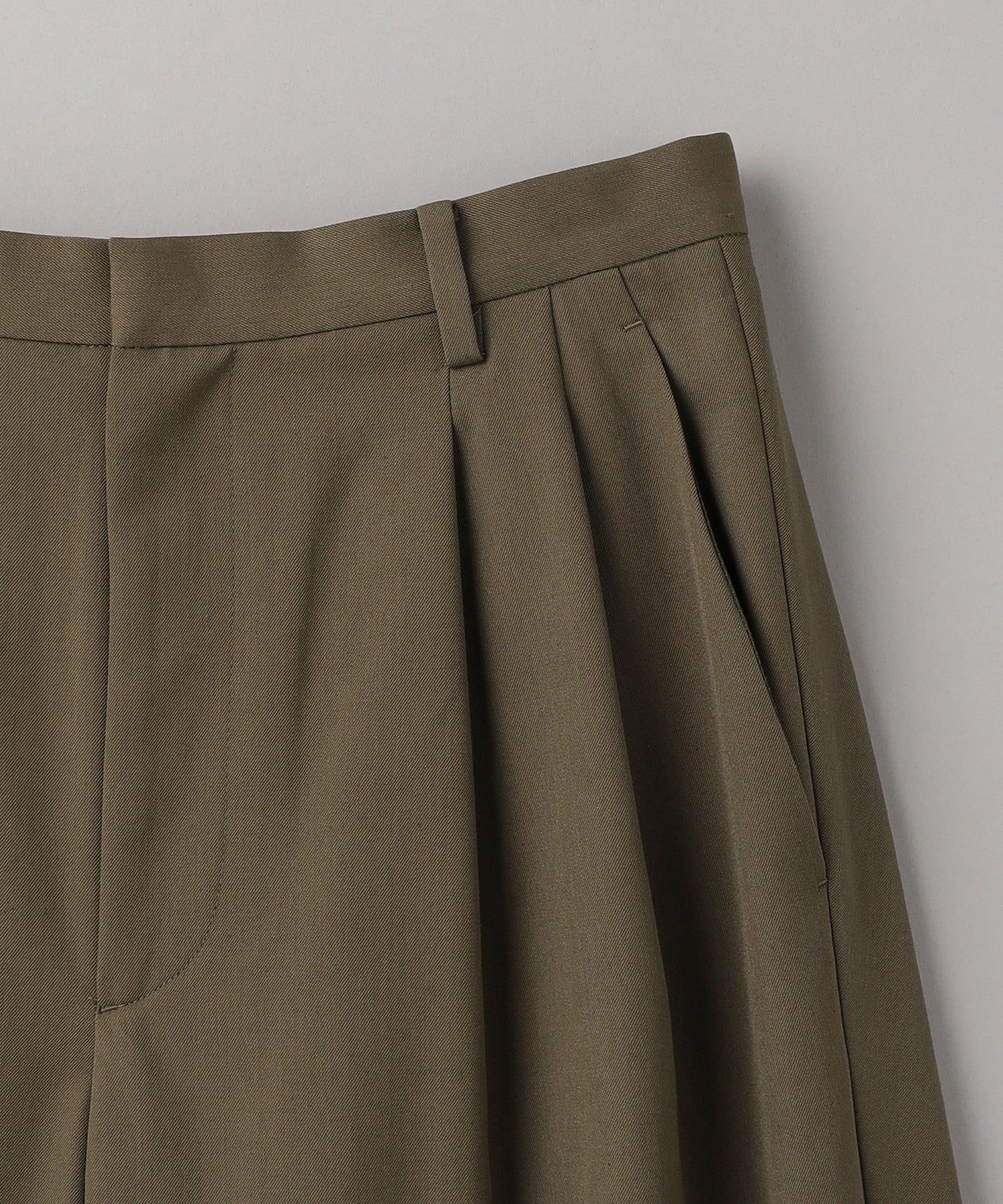 From the front, they look like basic two-pleat pants, but the back wrap at the hem gives them a unique silhouette, giving them a unique look.
