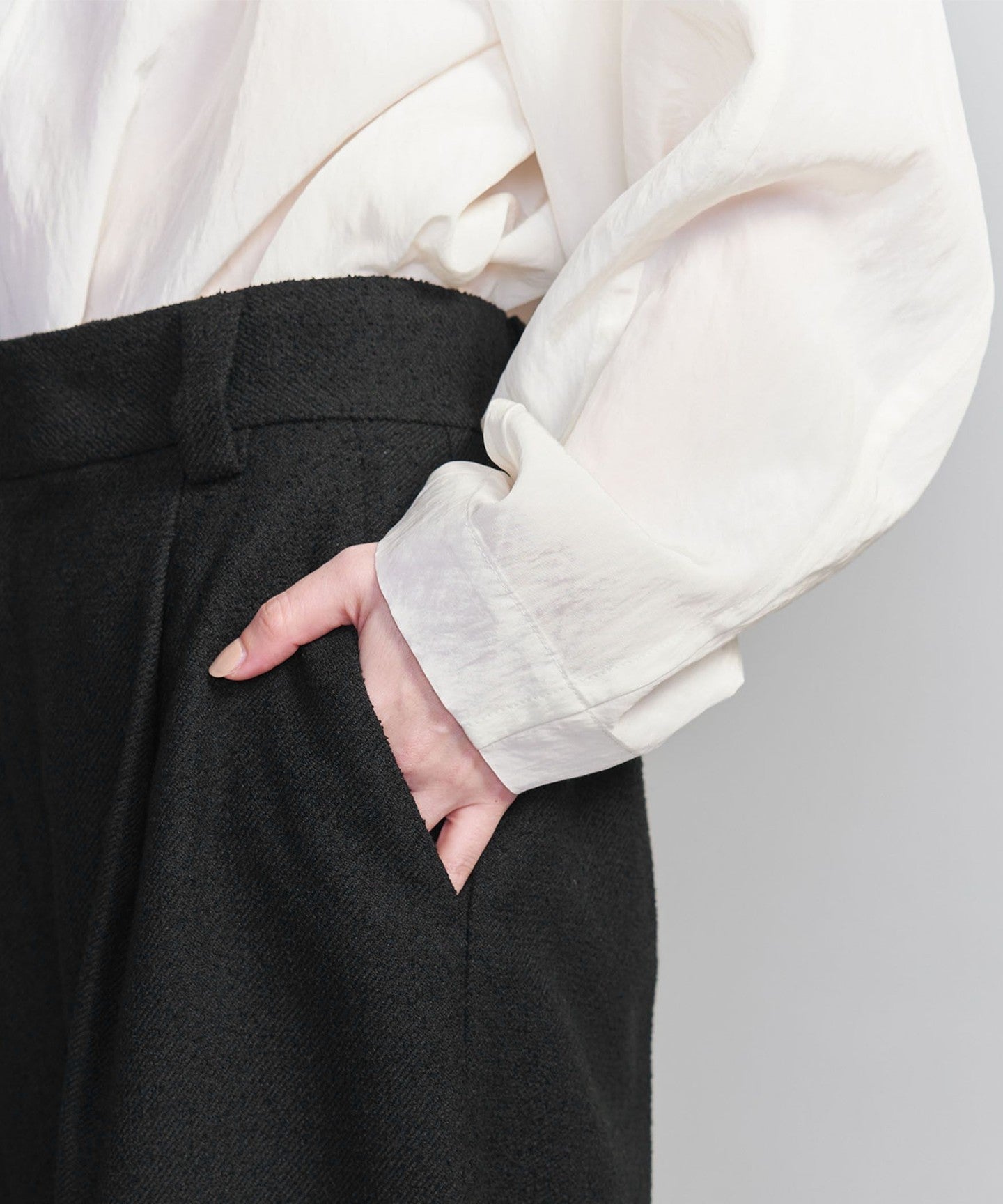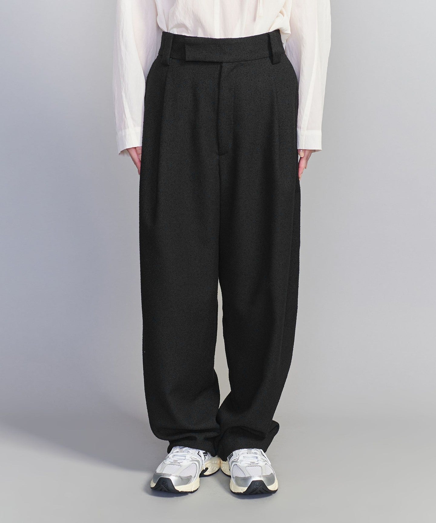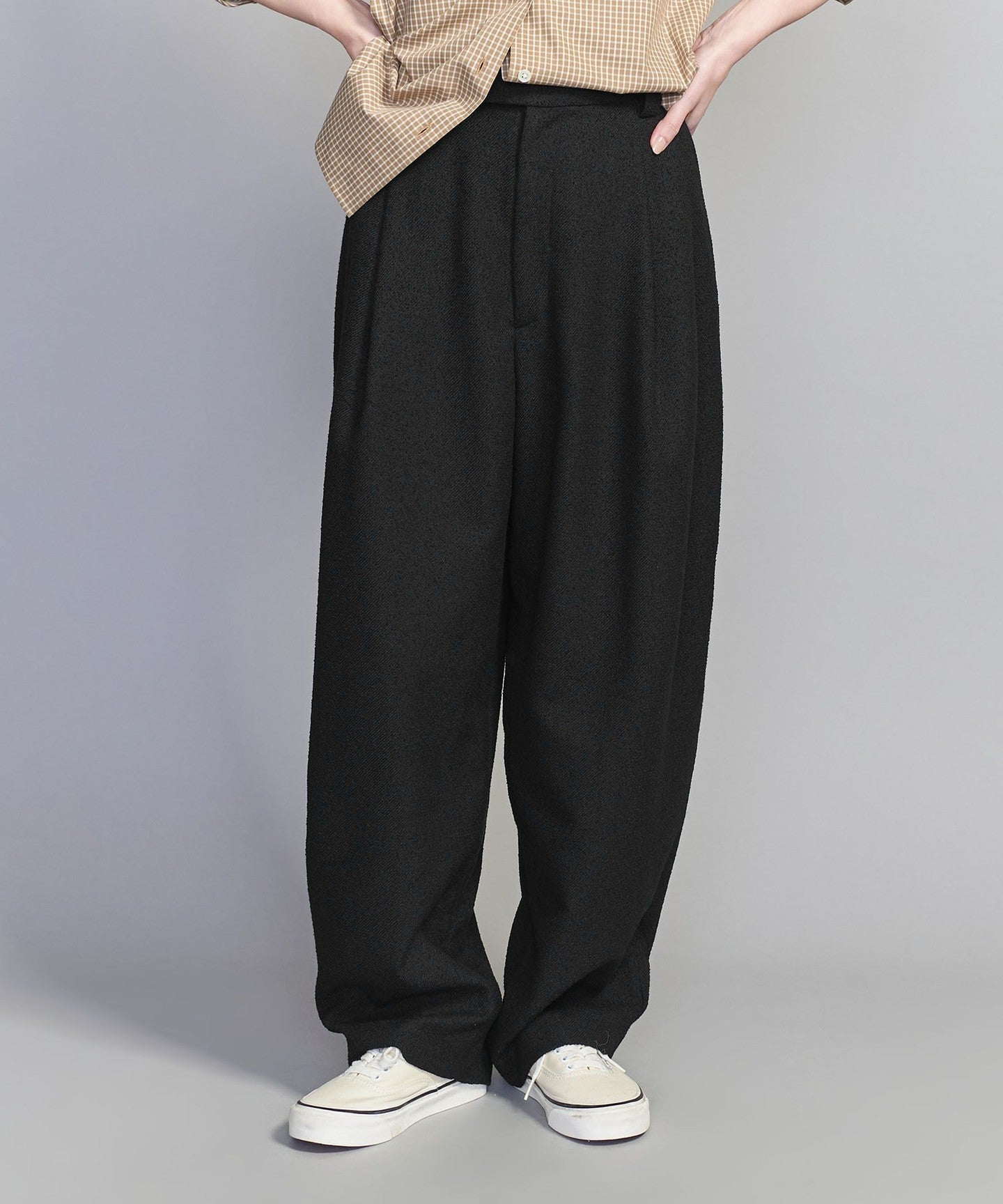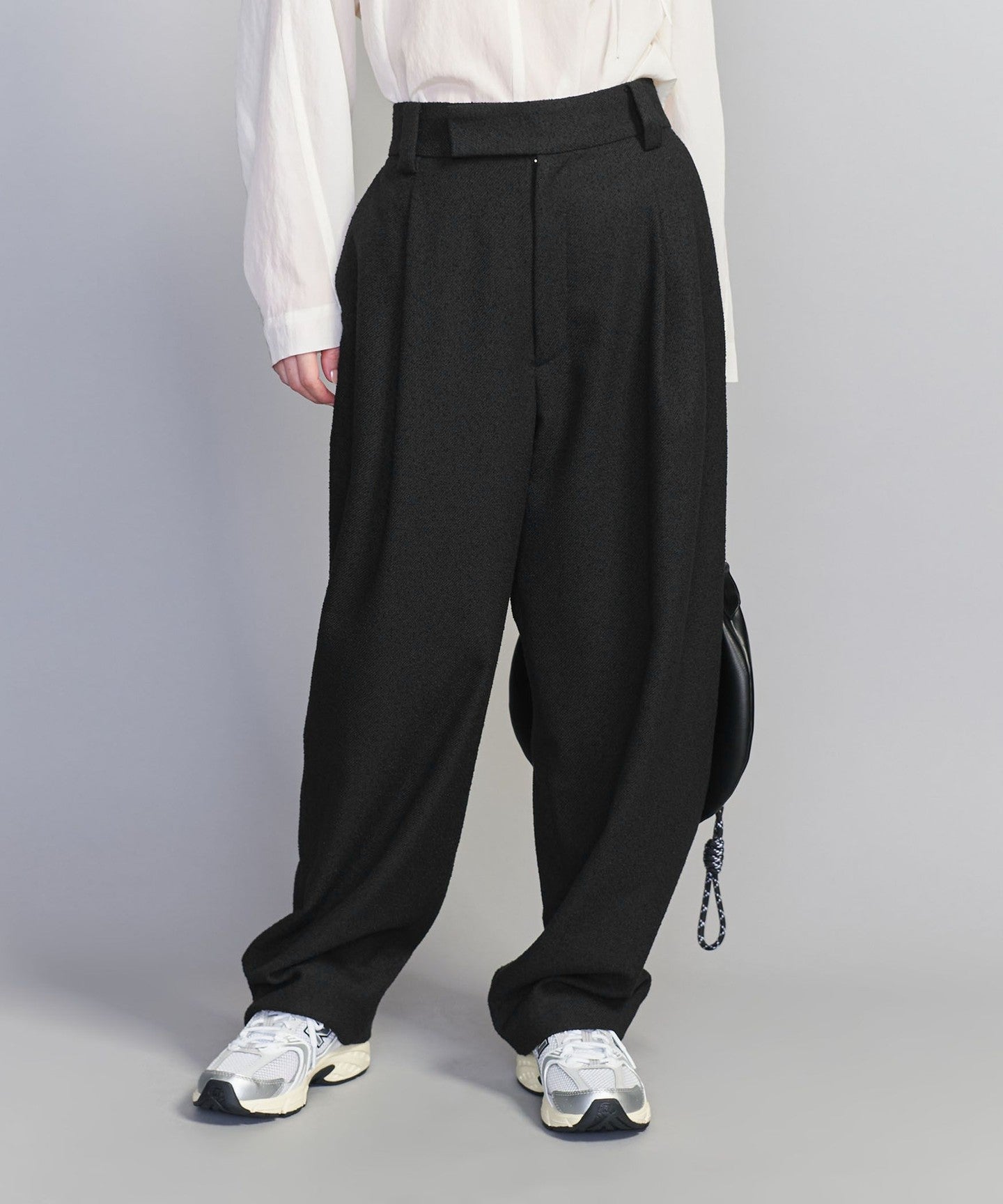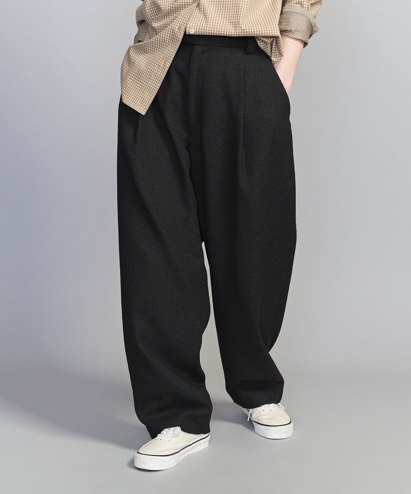 The relaxed fit around the waist with front tucks and the rounded leg line towards the hem create a style that exudes a trendy mood.