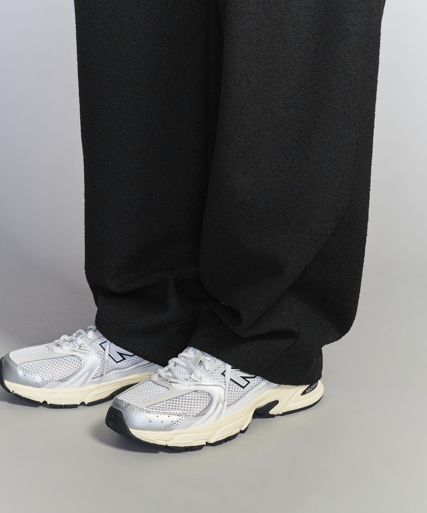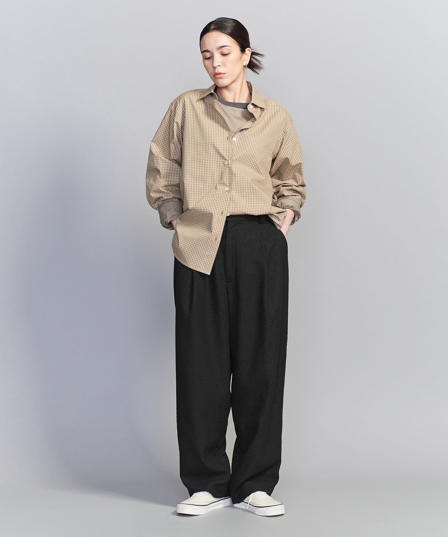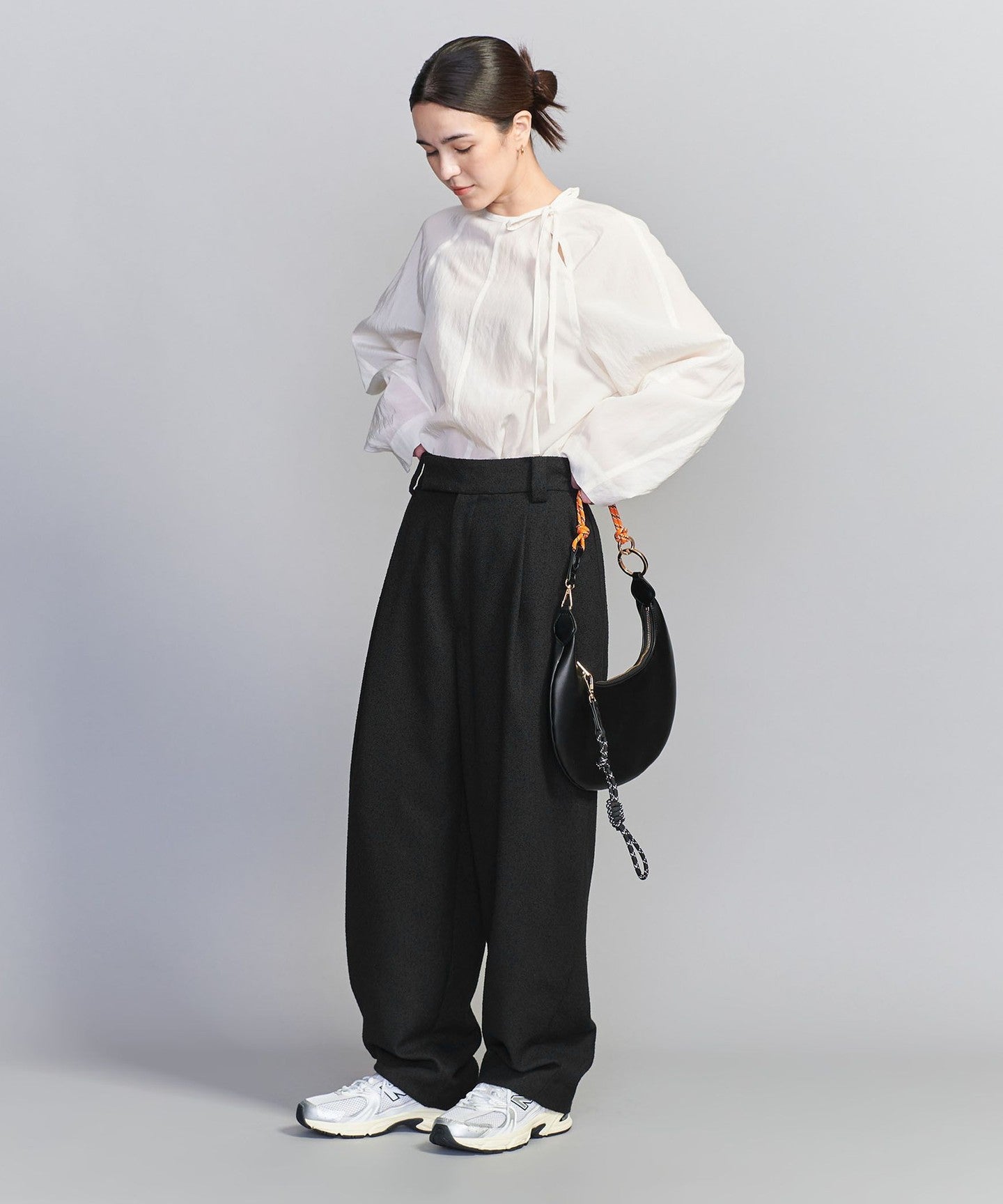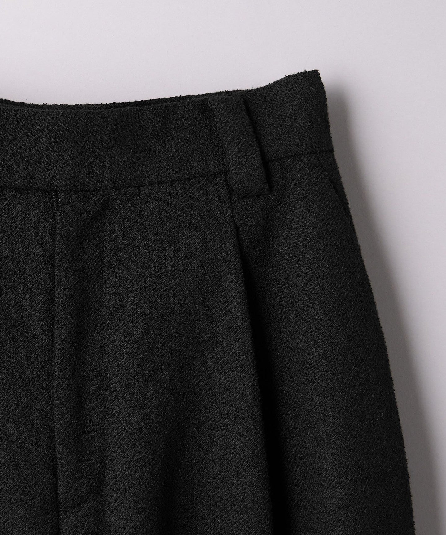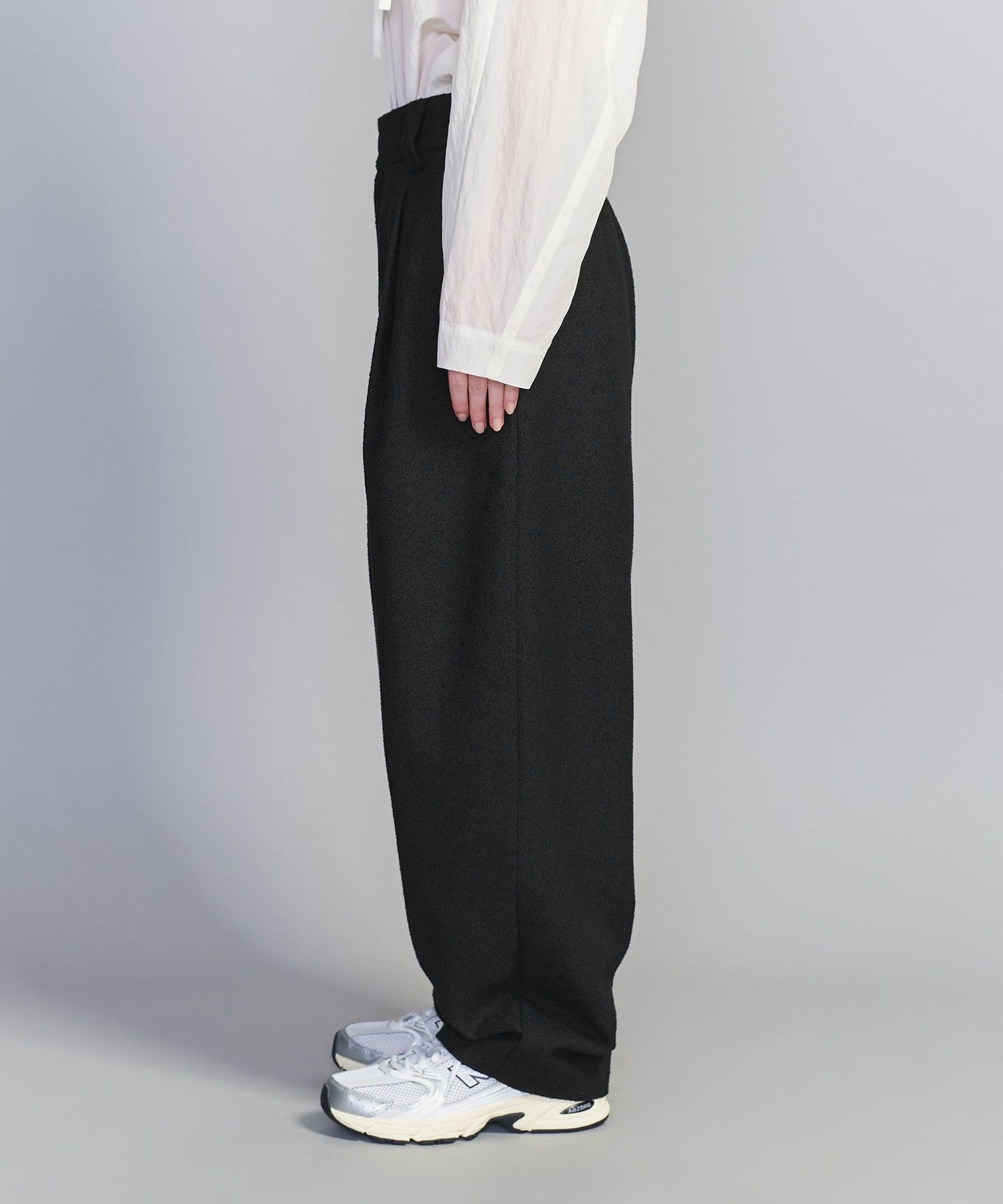 The relaxed fit around the waist with front tucks and the rounded leg line towards the hem create a style that exudes a trendy mood.