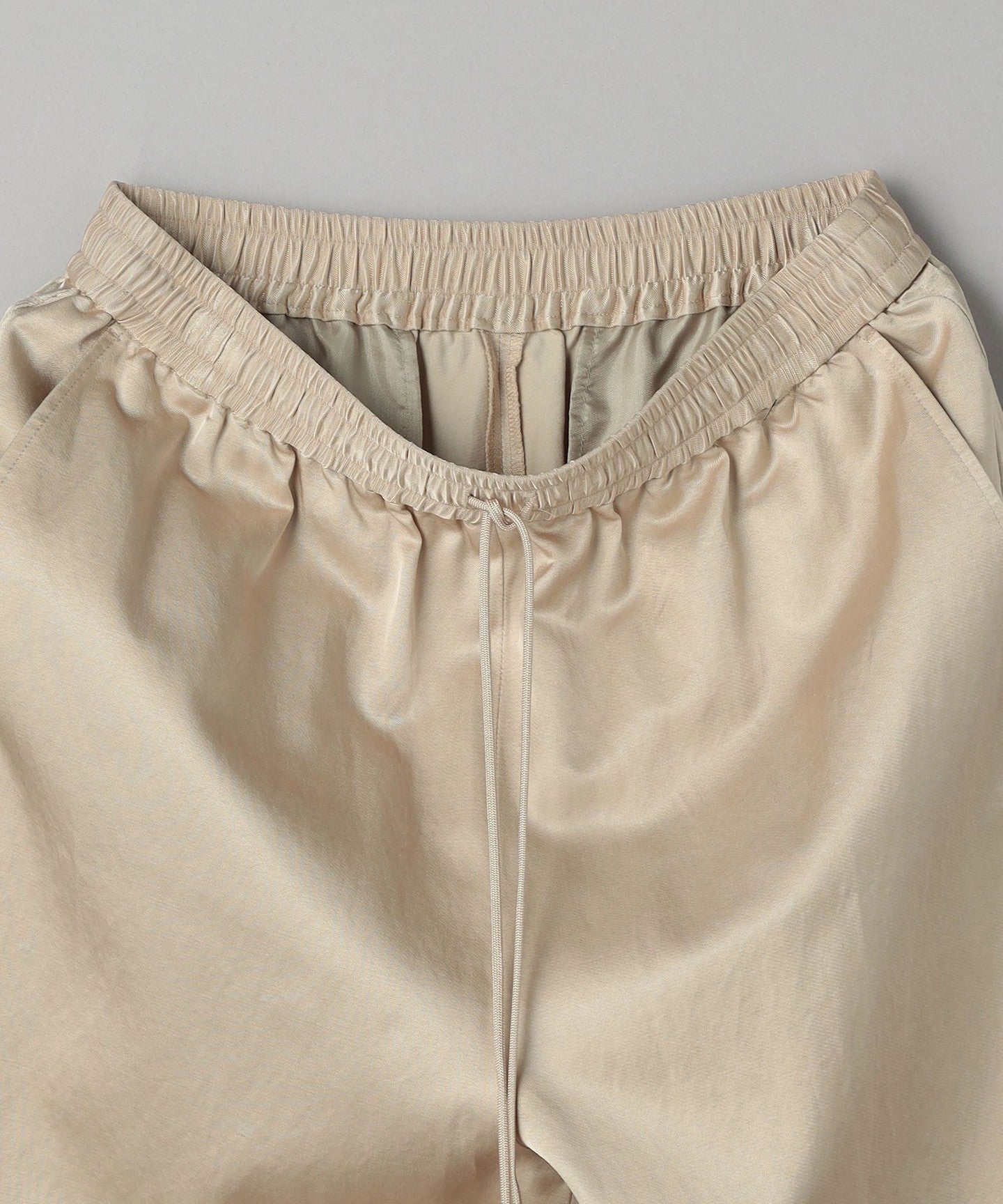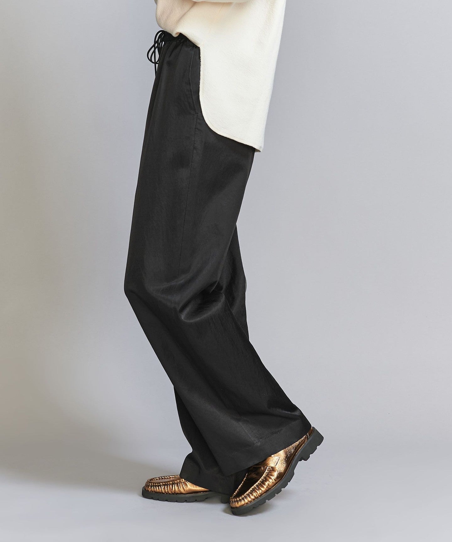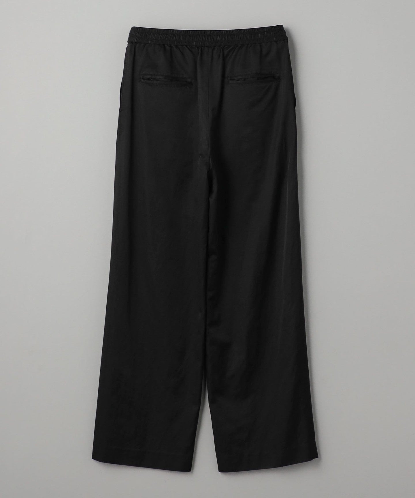 A new model that features classic satin tapered pants with a wide silhouette.
