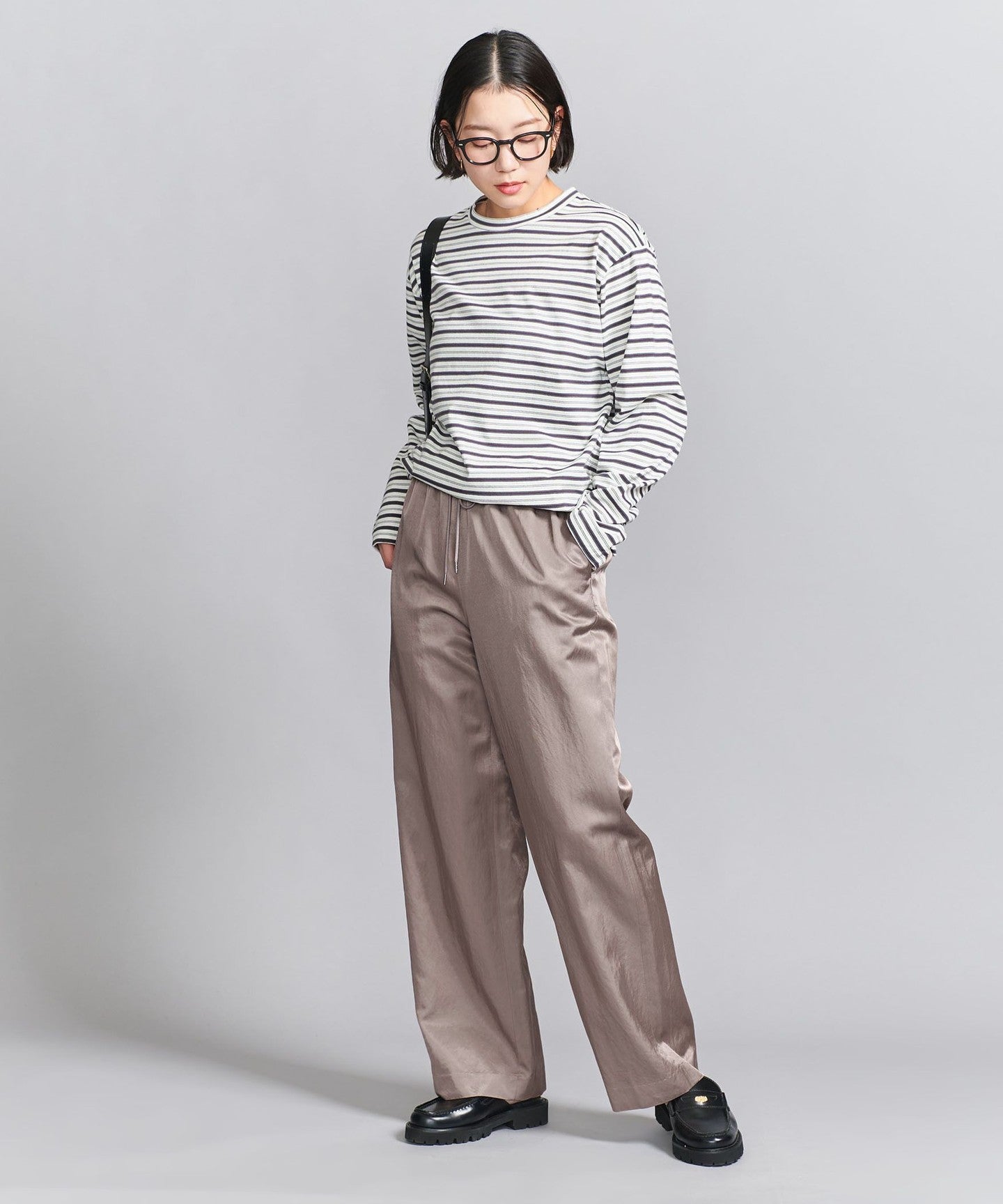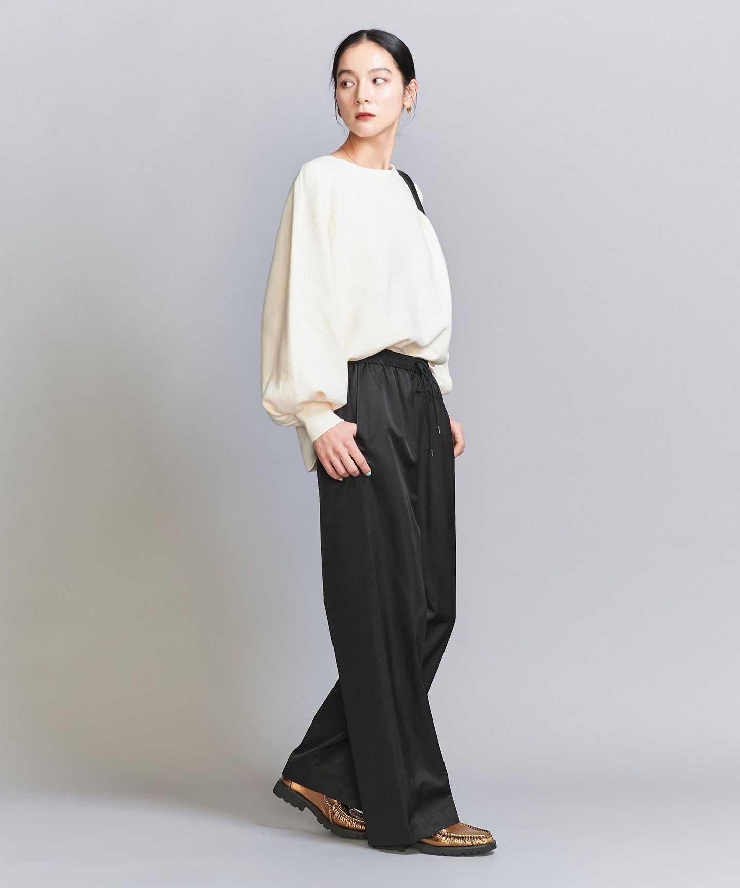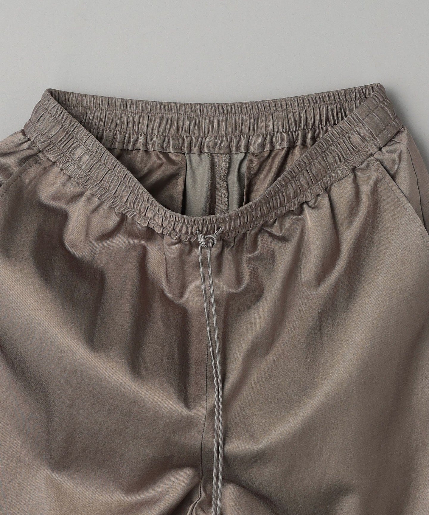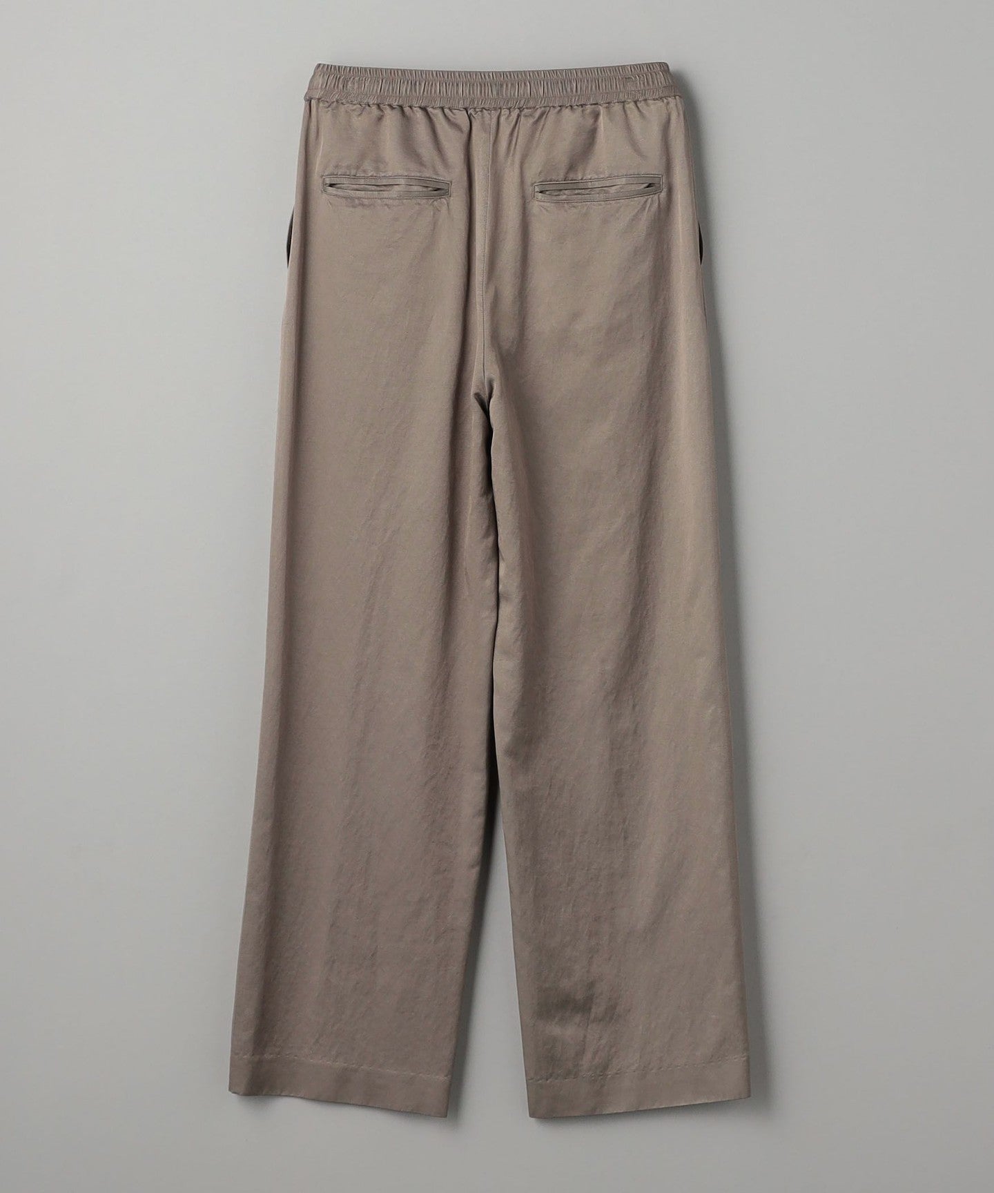 A new model that features classic satin tapered pants with a wide silhouette.