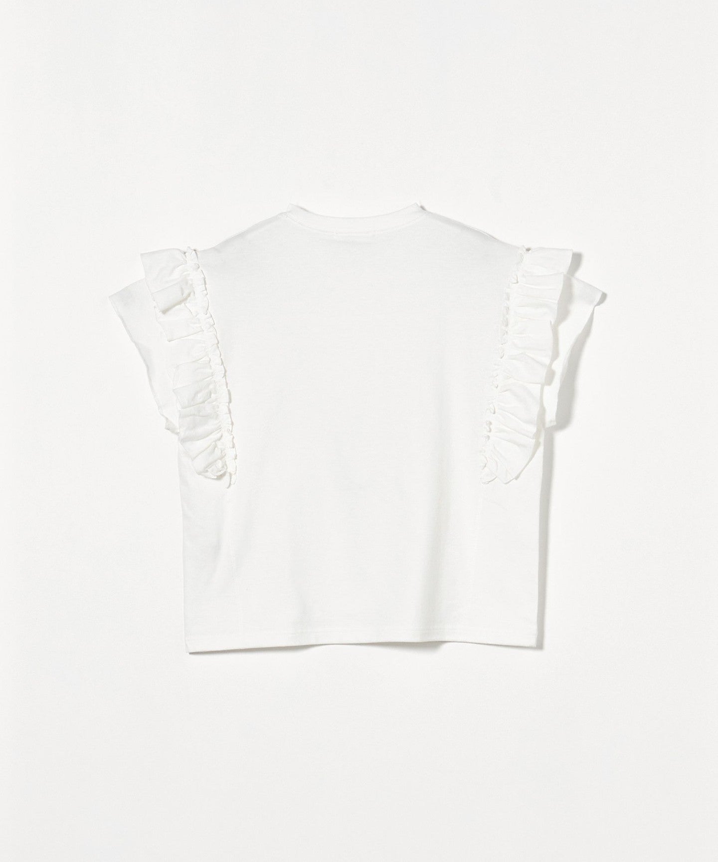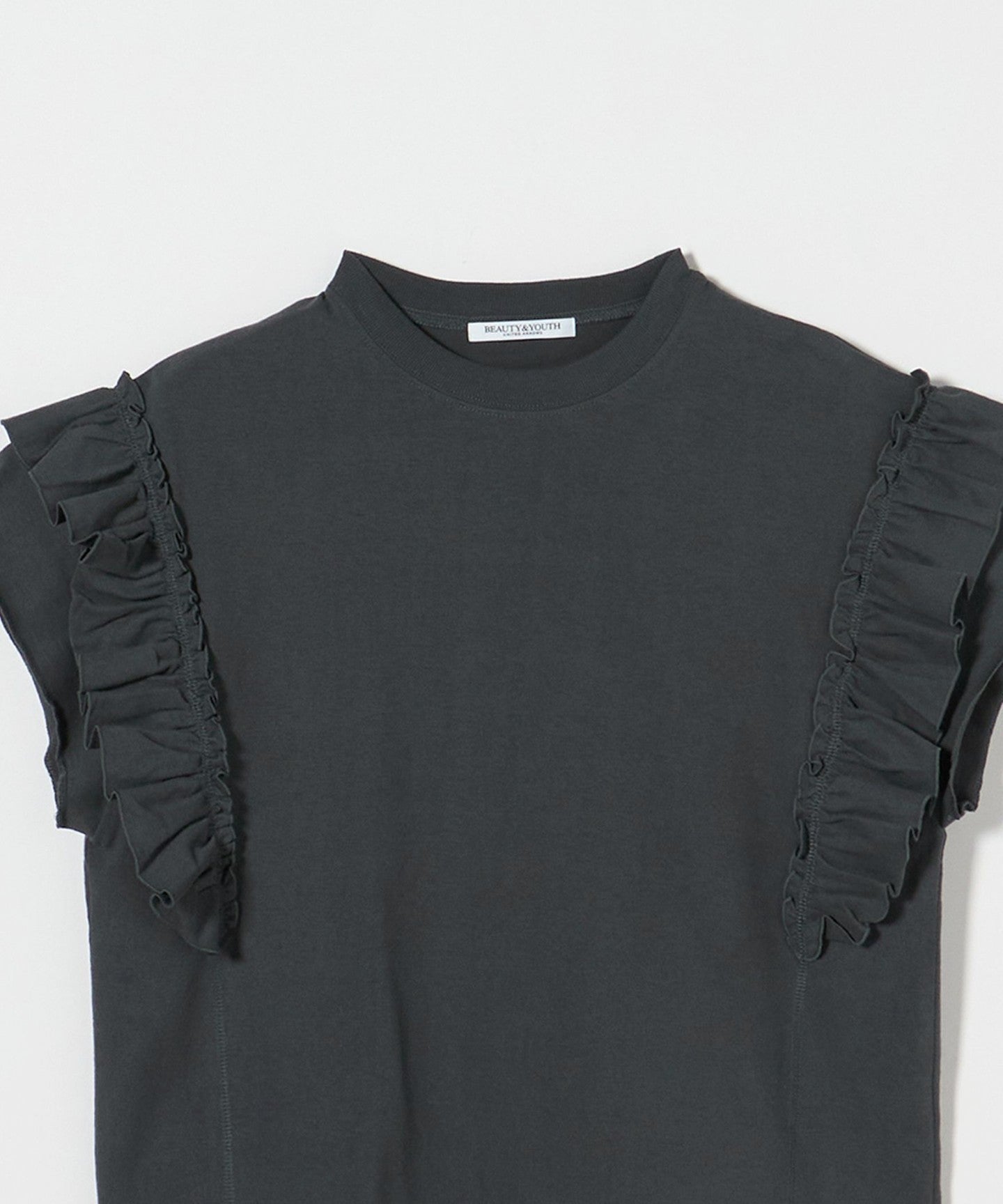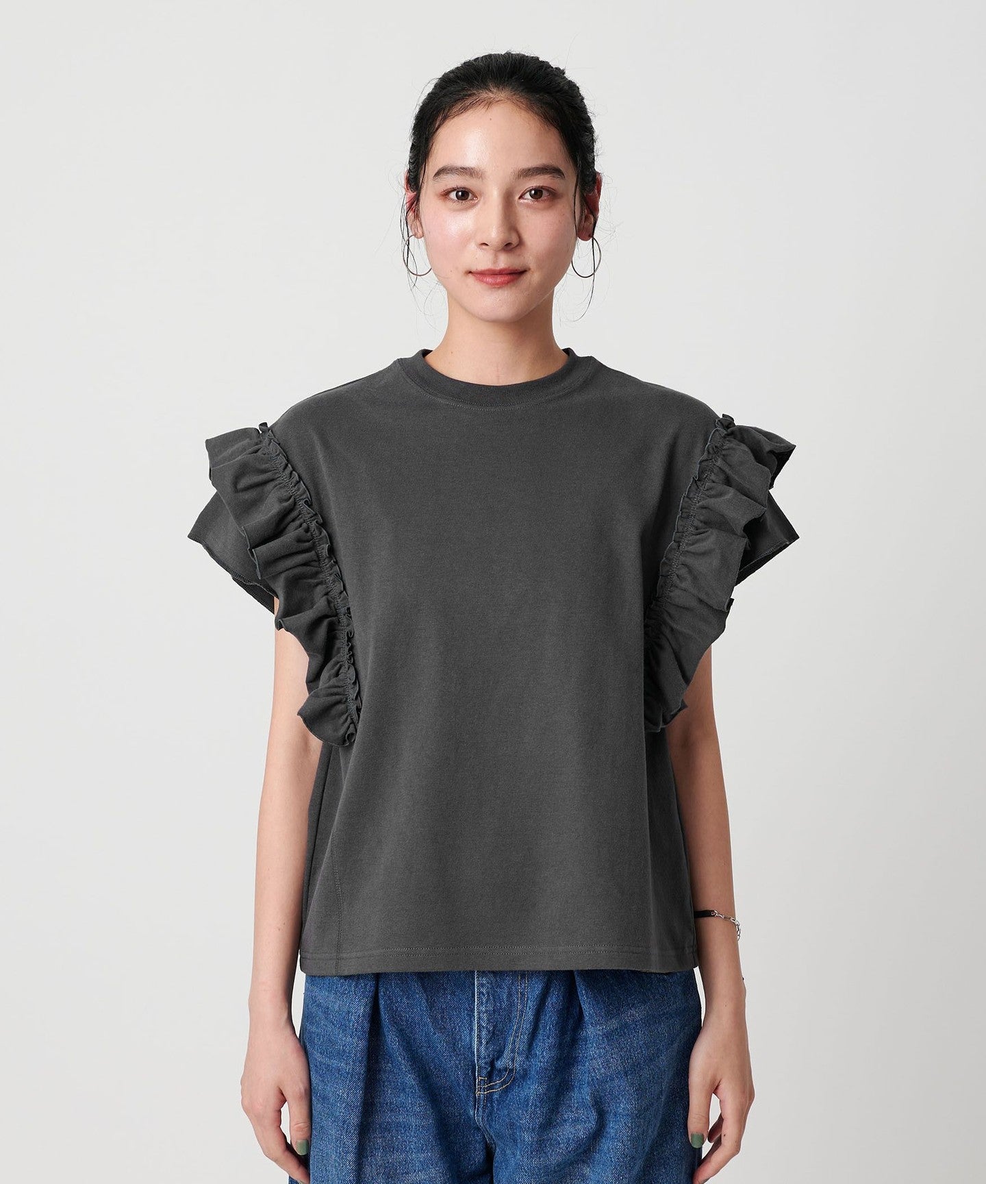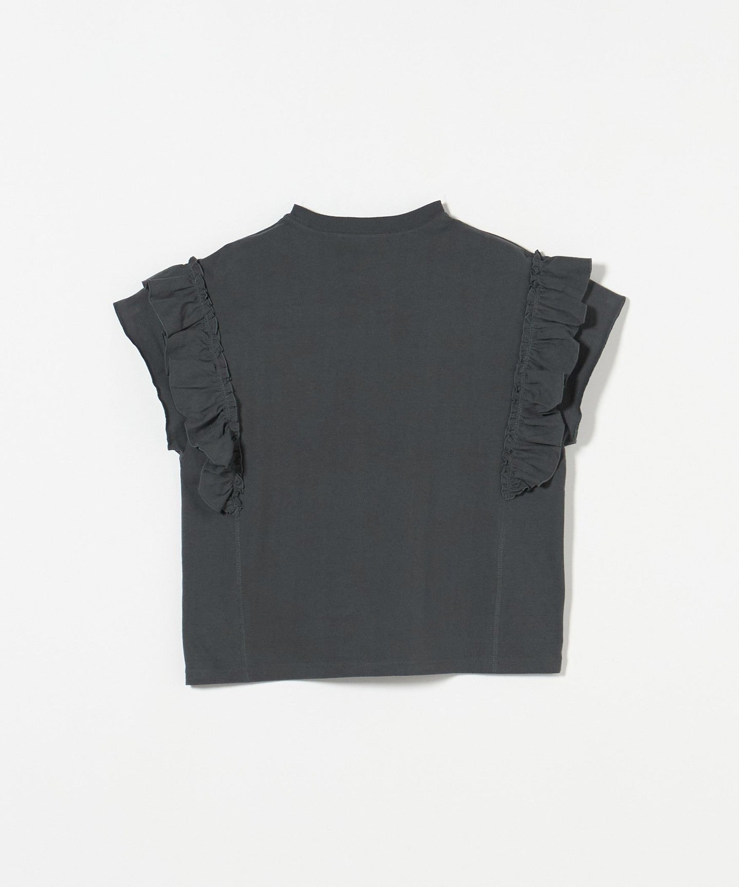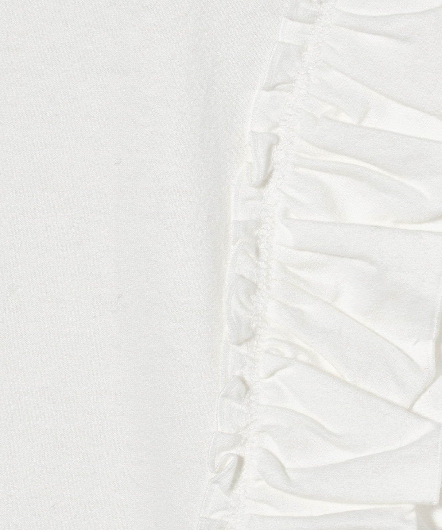 The ribbing around the neck and faded fabric, which are elements of a T-shirt, reduce the sweetness of the ruffles, giving it a casual impression.