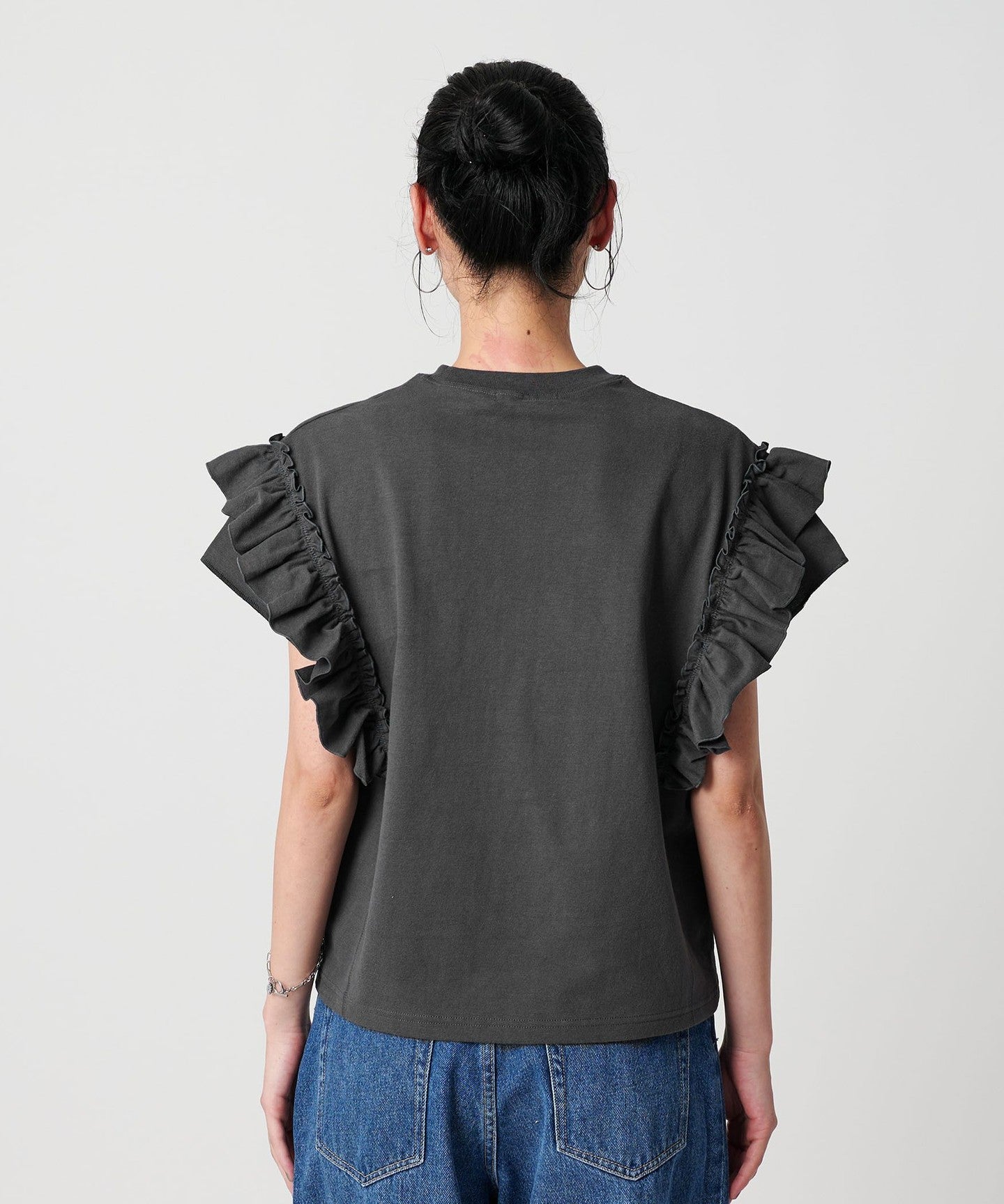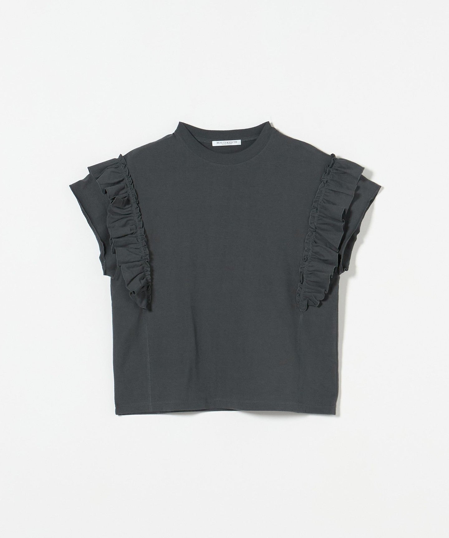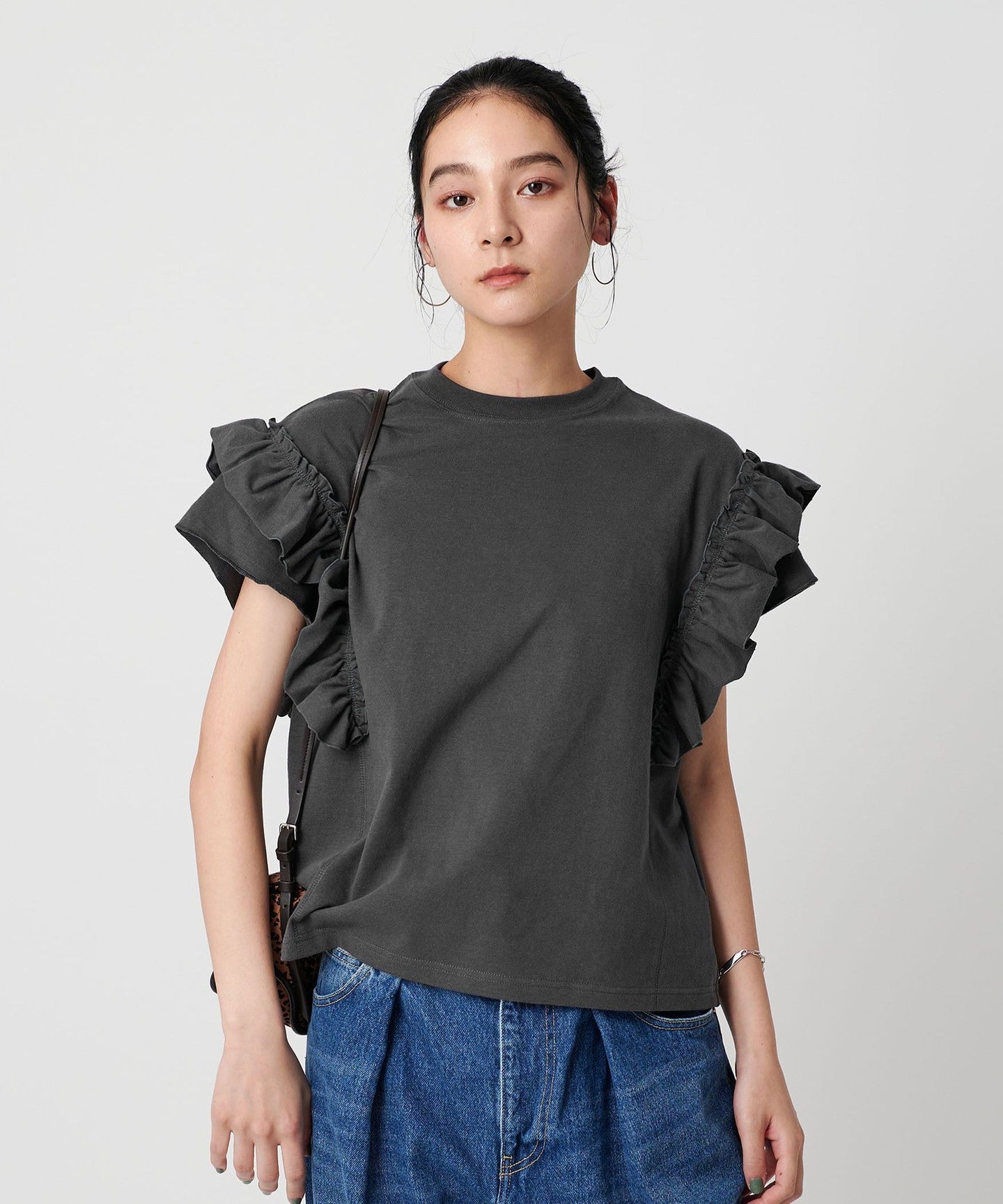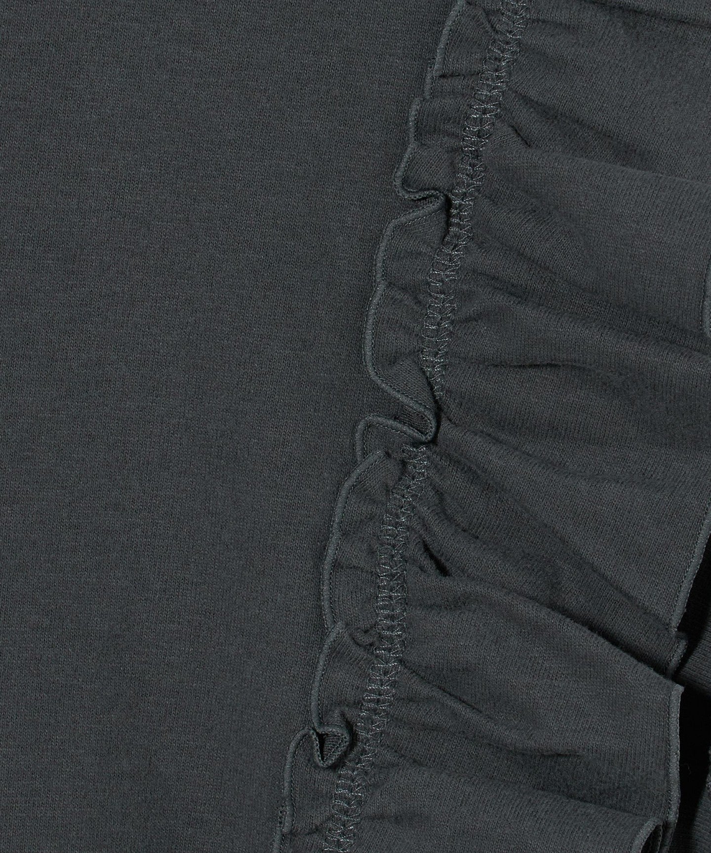 The ribbing around the neck and faded fabric, which are elements of a T-shirt, reduce the sweetness of the ruffles, giving it a casual impression.