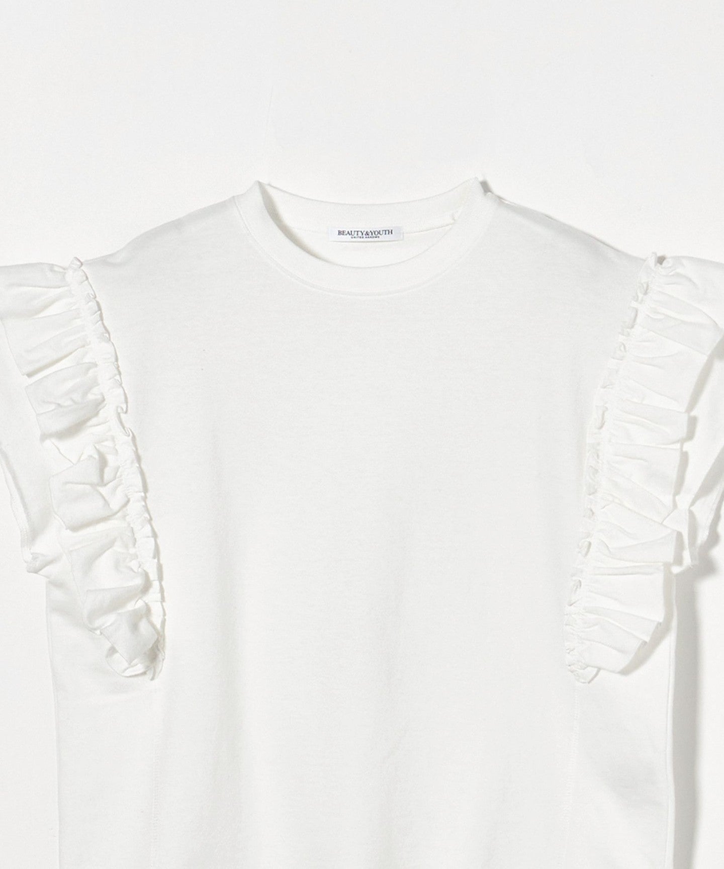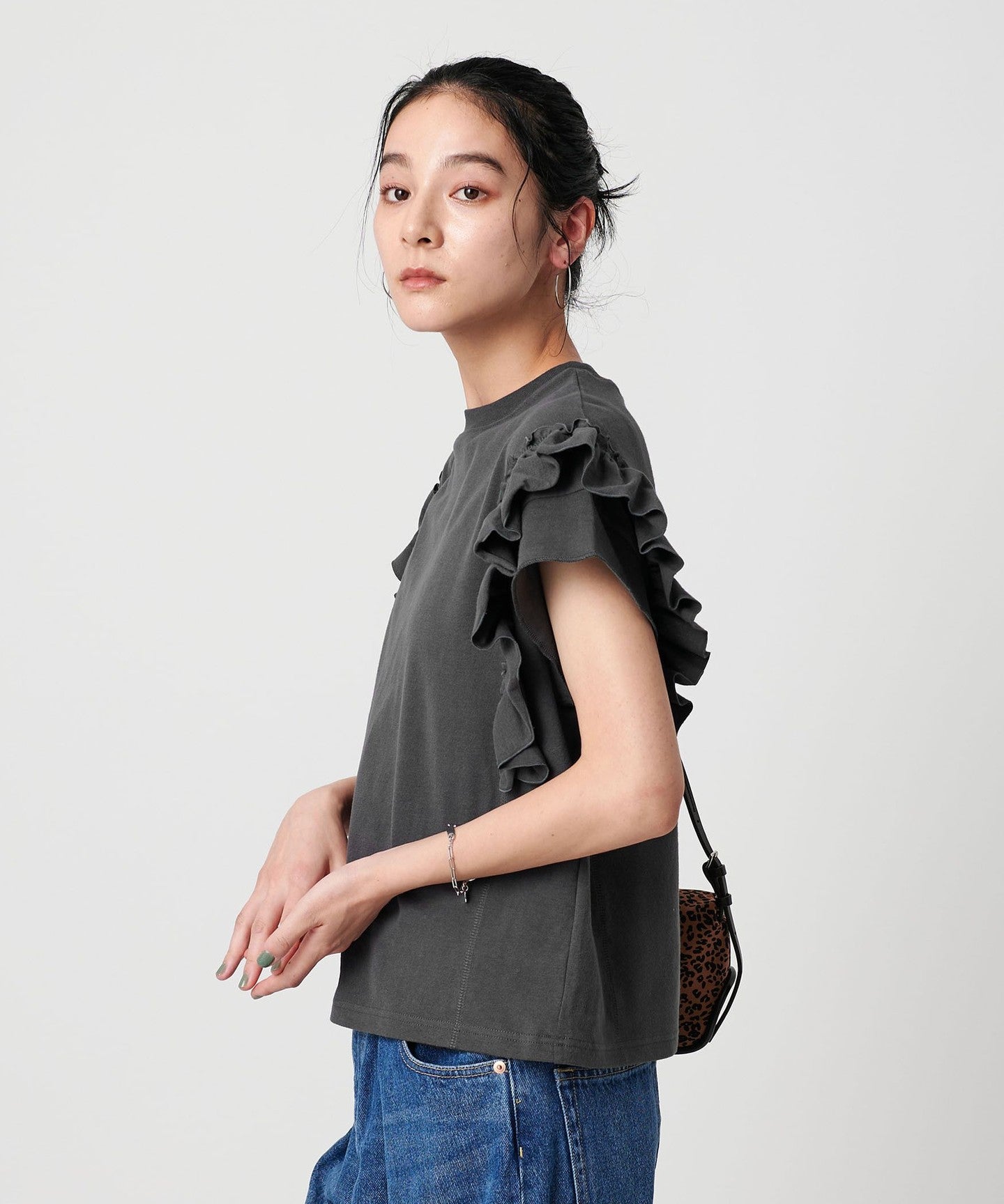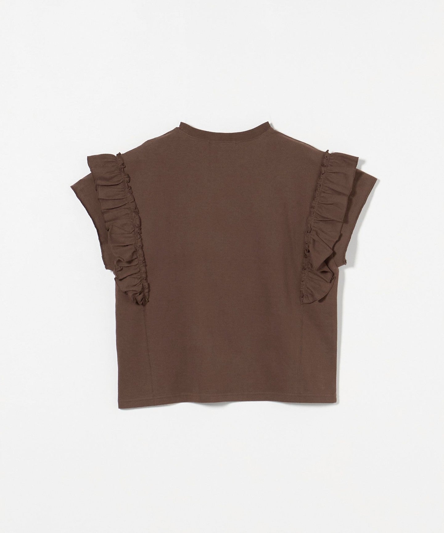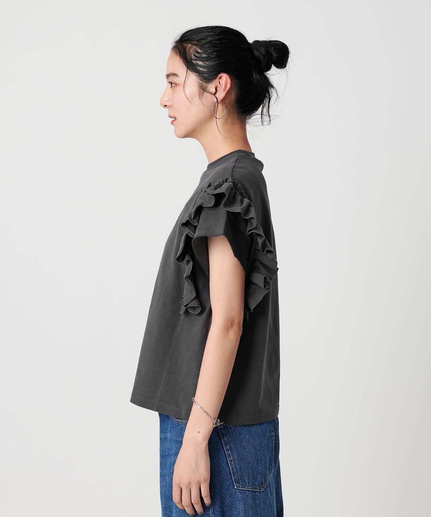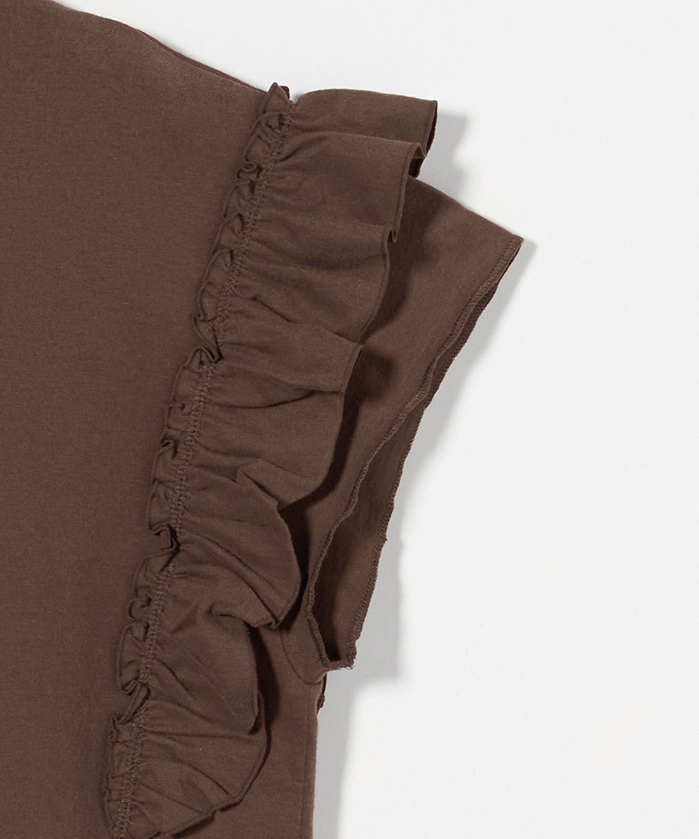 The ribbing around the neck and faded fabric, which are elements of a T-shirt, reduce the sweetness of the ruffles, giving it a casual impression.
