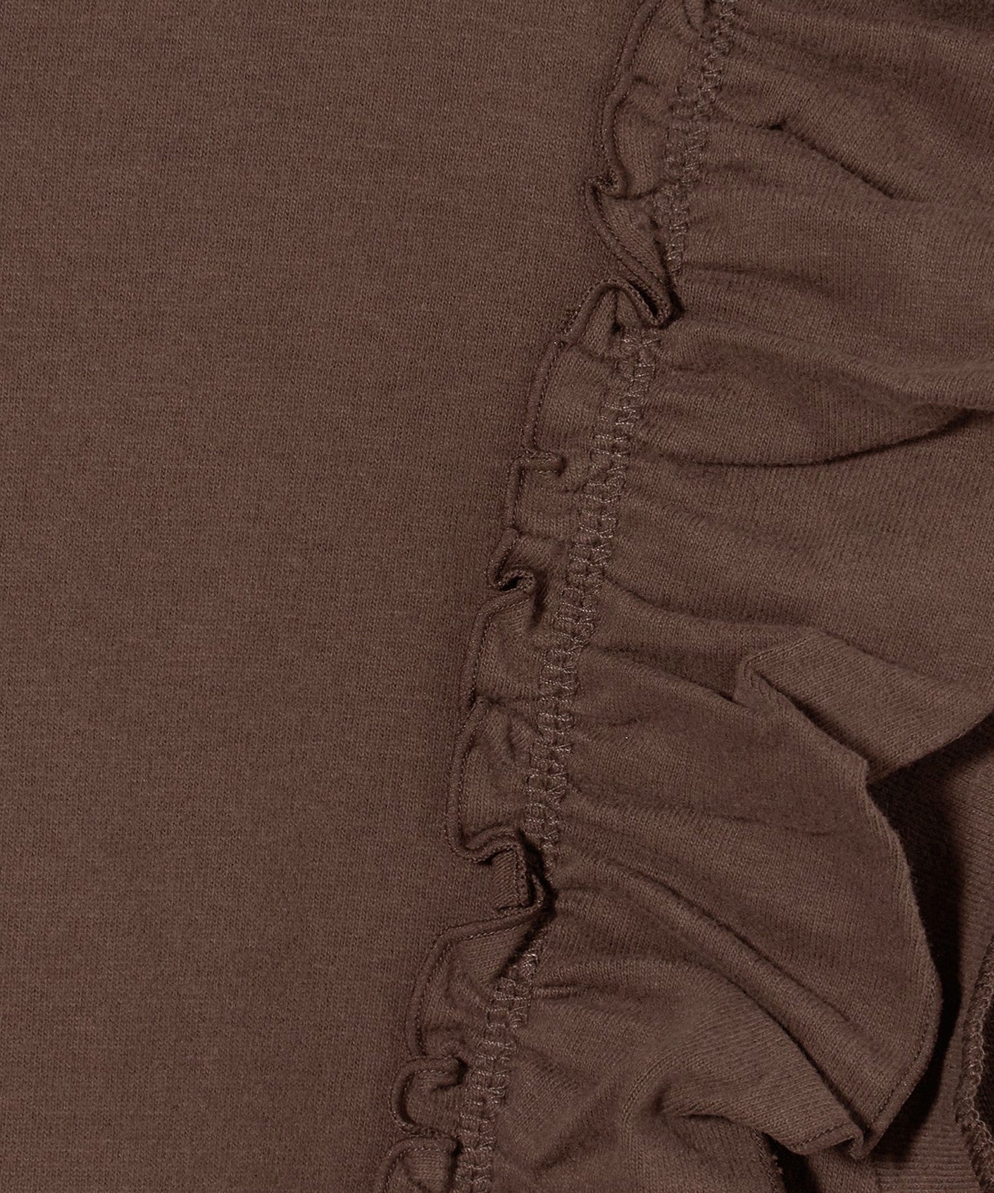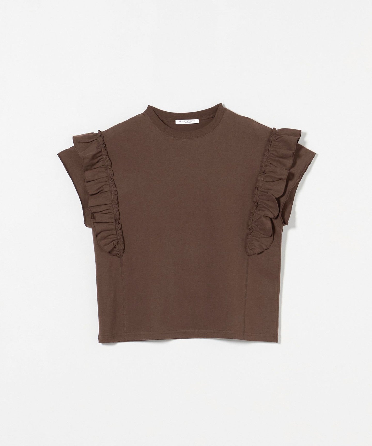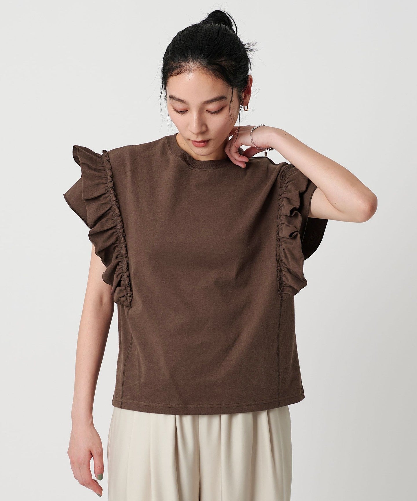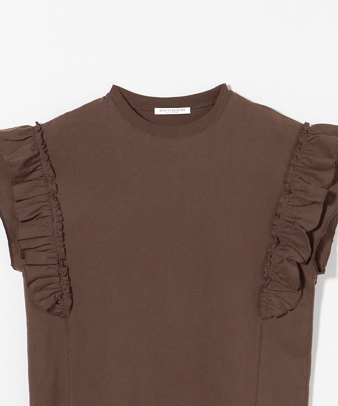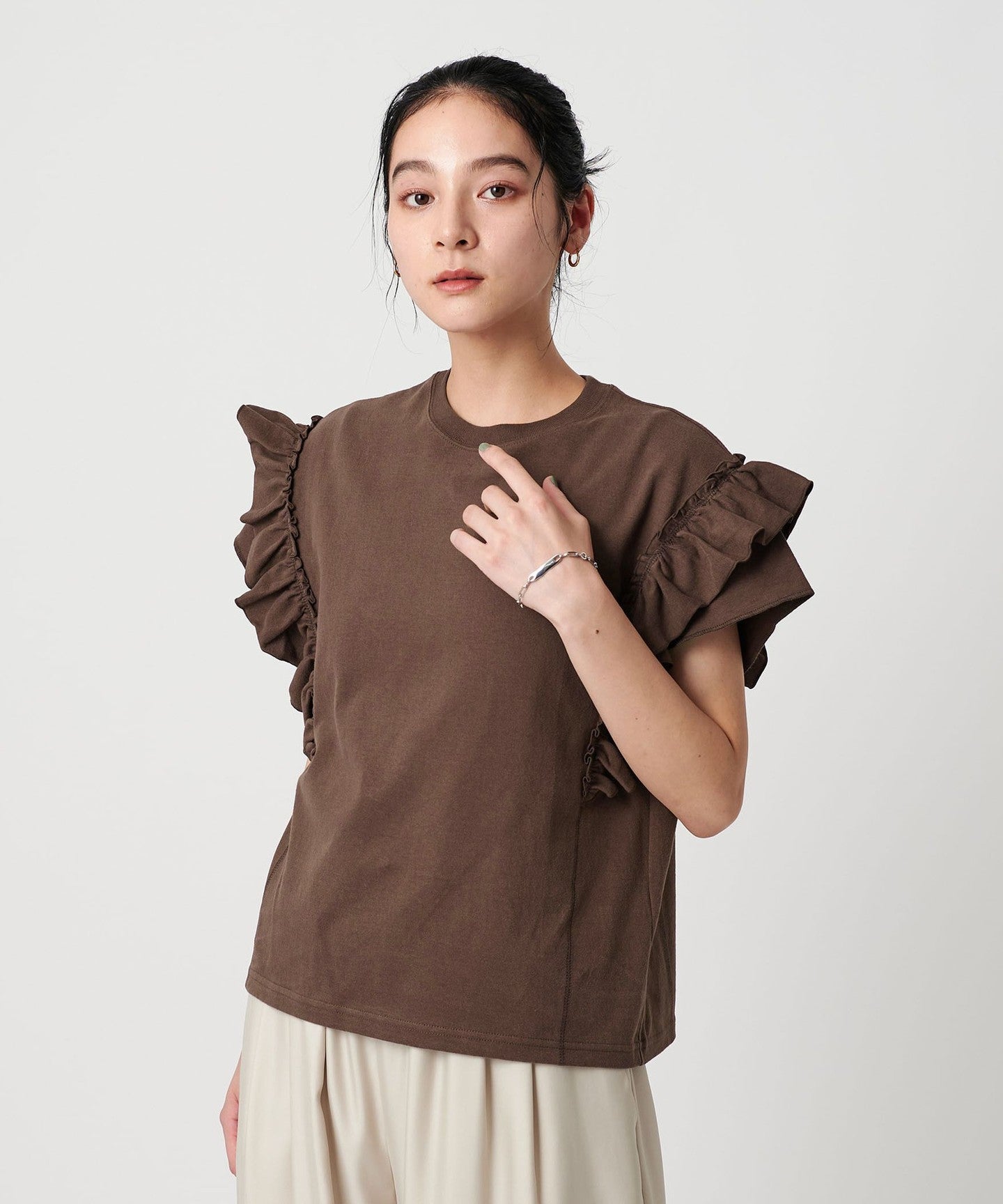 The ribbing around the neck and faded fabric, which are elements of a T-shirt, reduce the sweetness of the ruffles, giving it a casual impression.