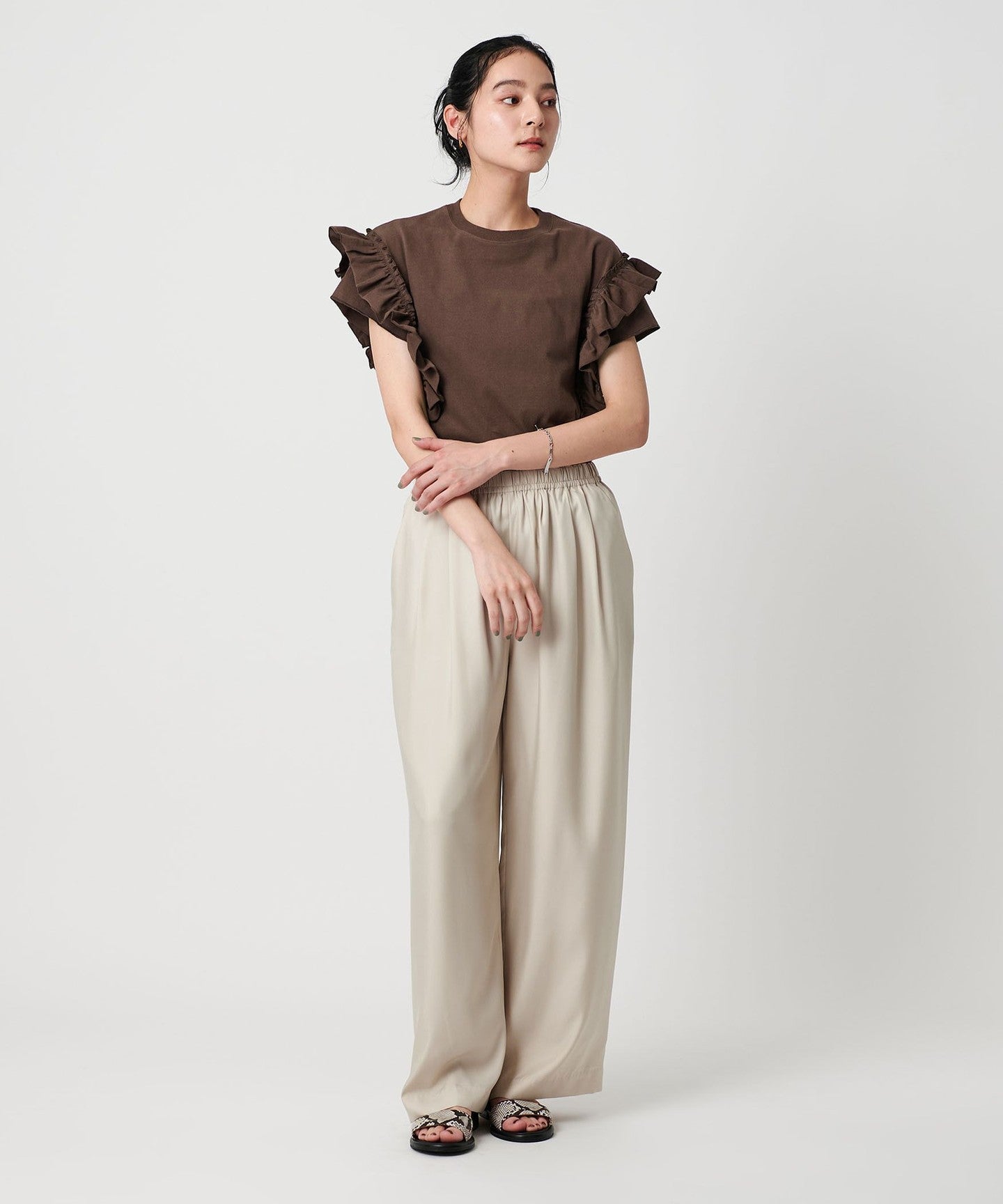 A feminine and casual cut-and-sew with striking ruffled sleeves