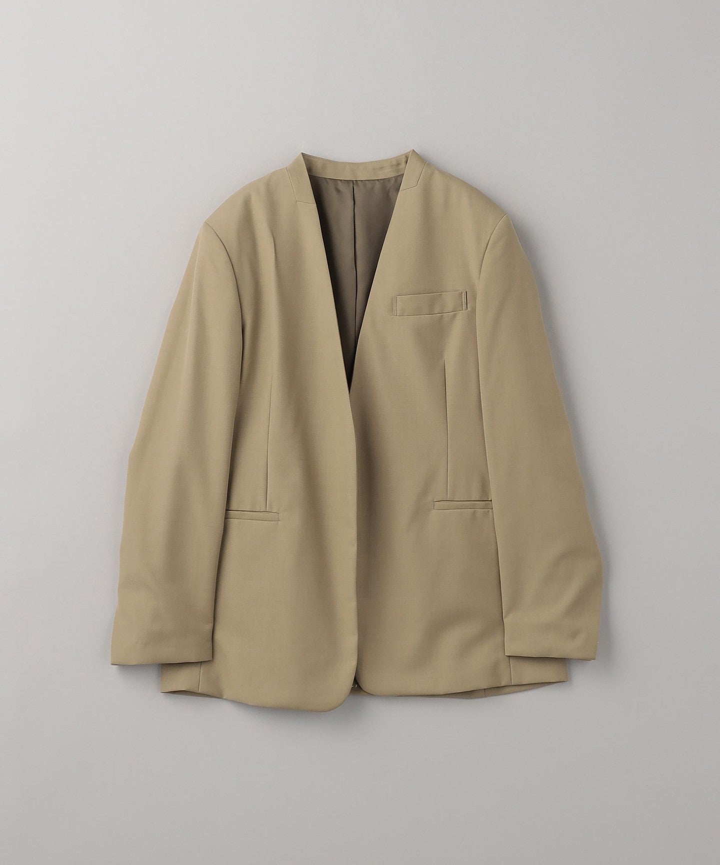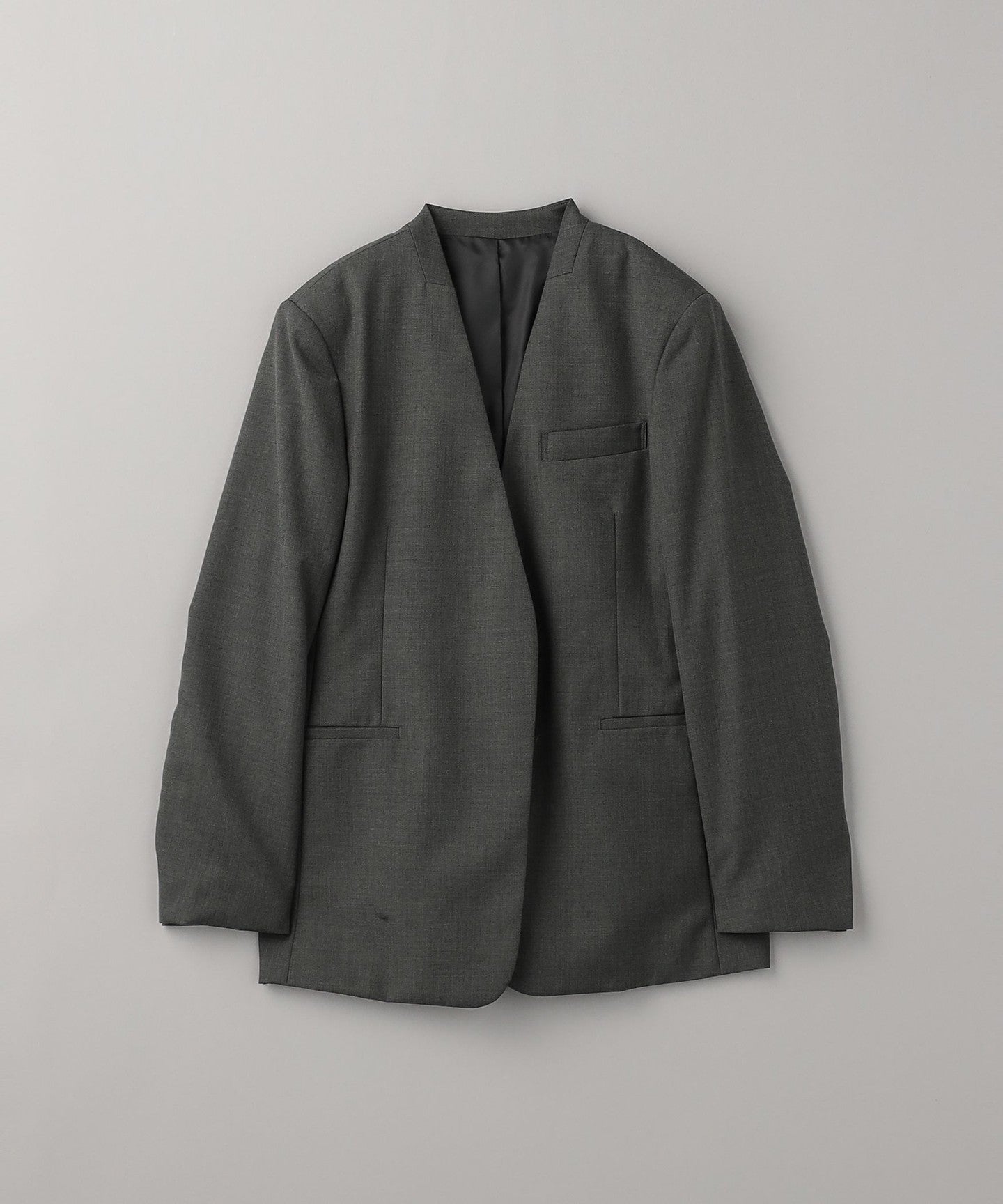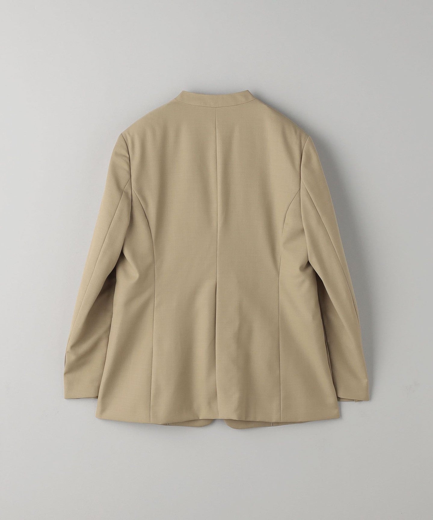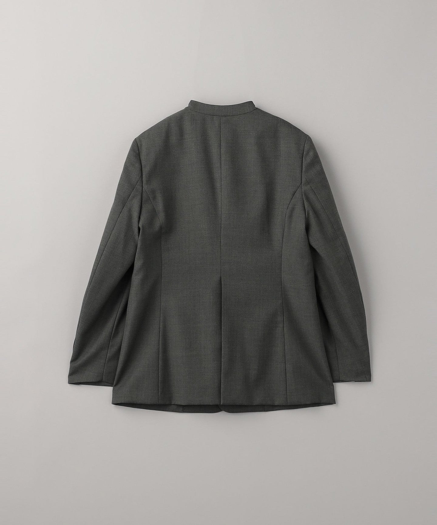 The colorless collar, open back vent, and loose silhouette combine to create a relaxed look.