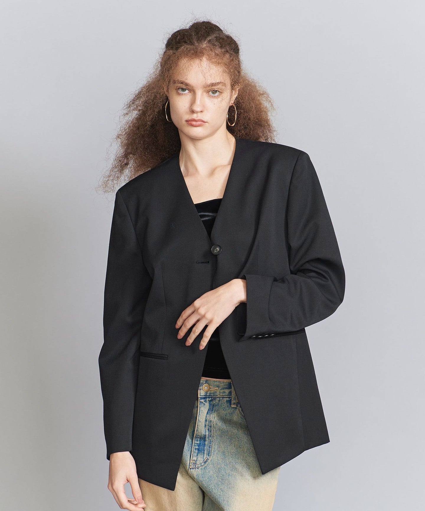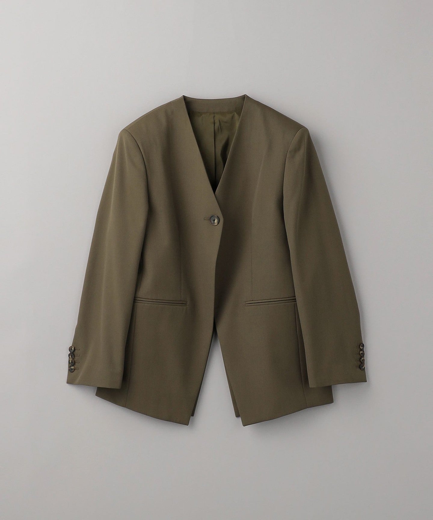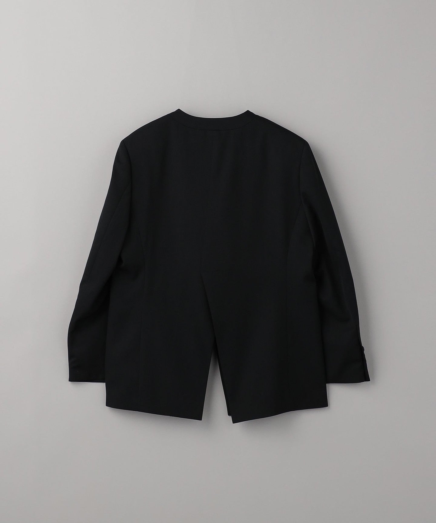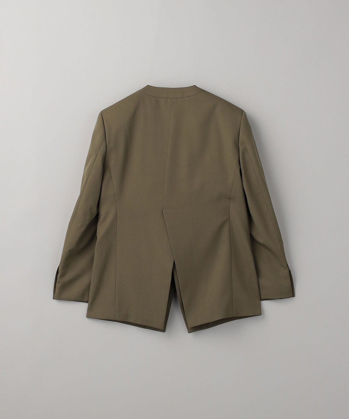 This is a collarless jacket with wide shoulders and a high front that gives it a modern look.
