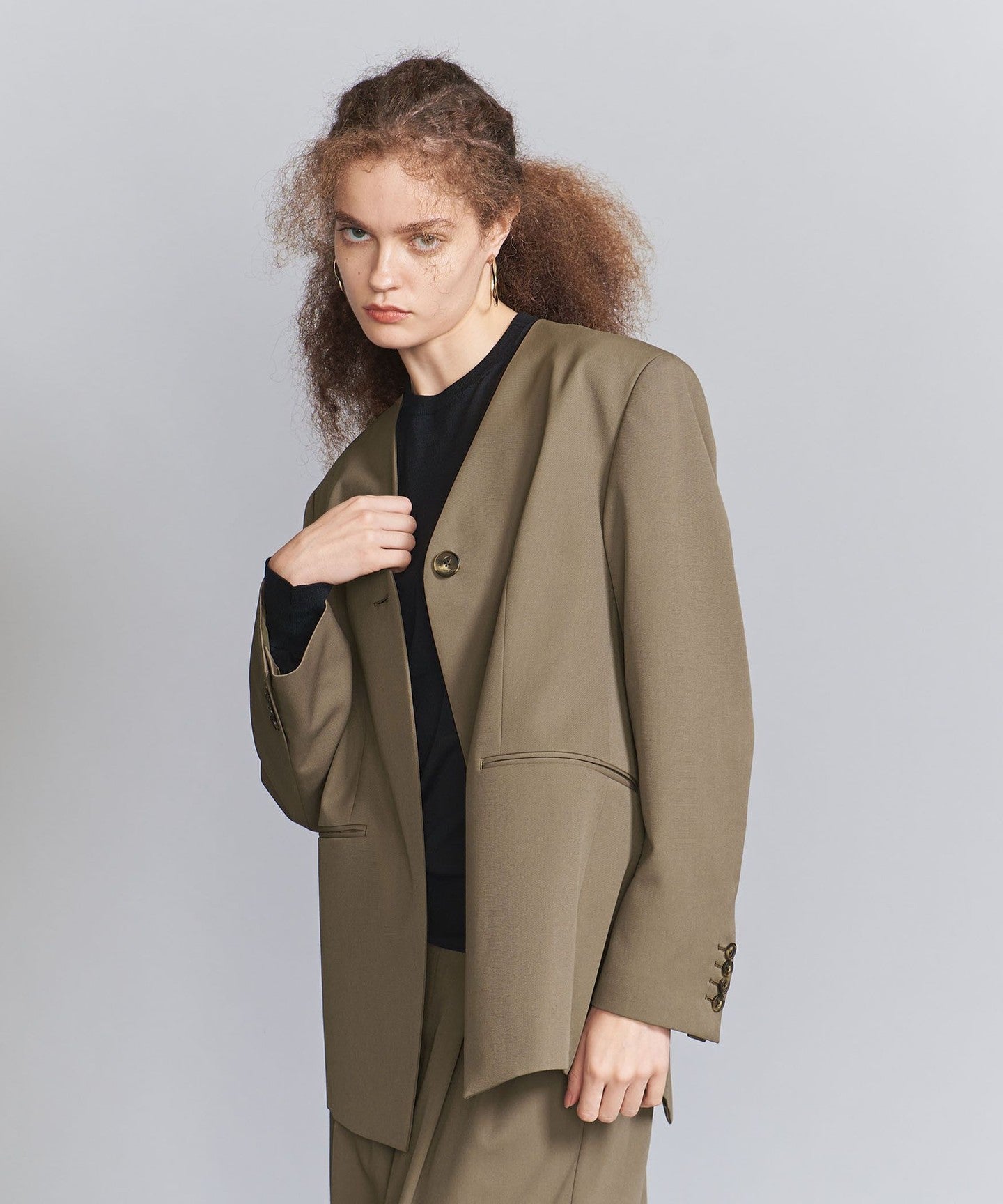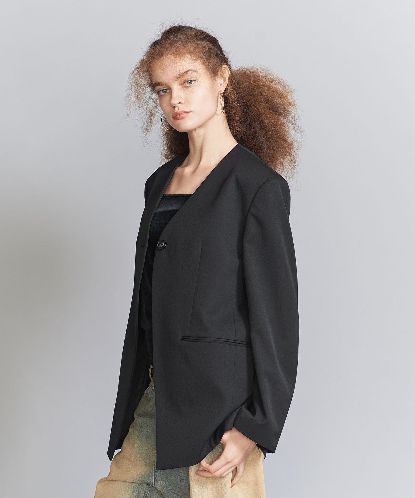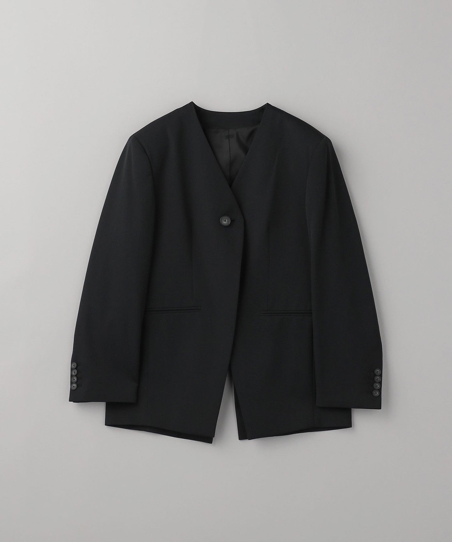 This is a collarless jacket with wide shoulders and a high front that gives it a modern look.