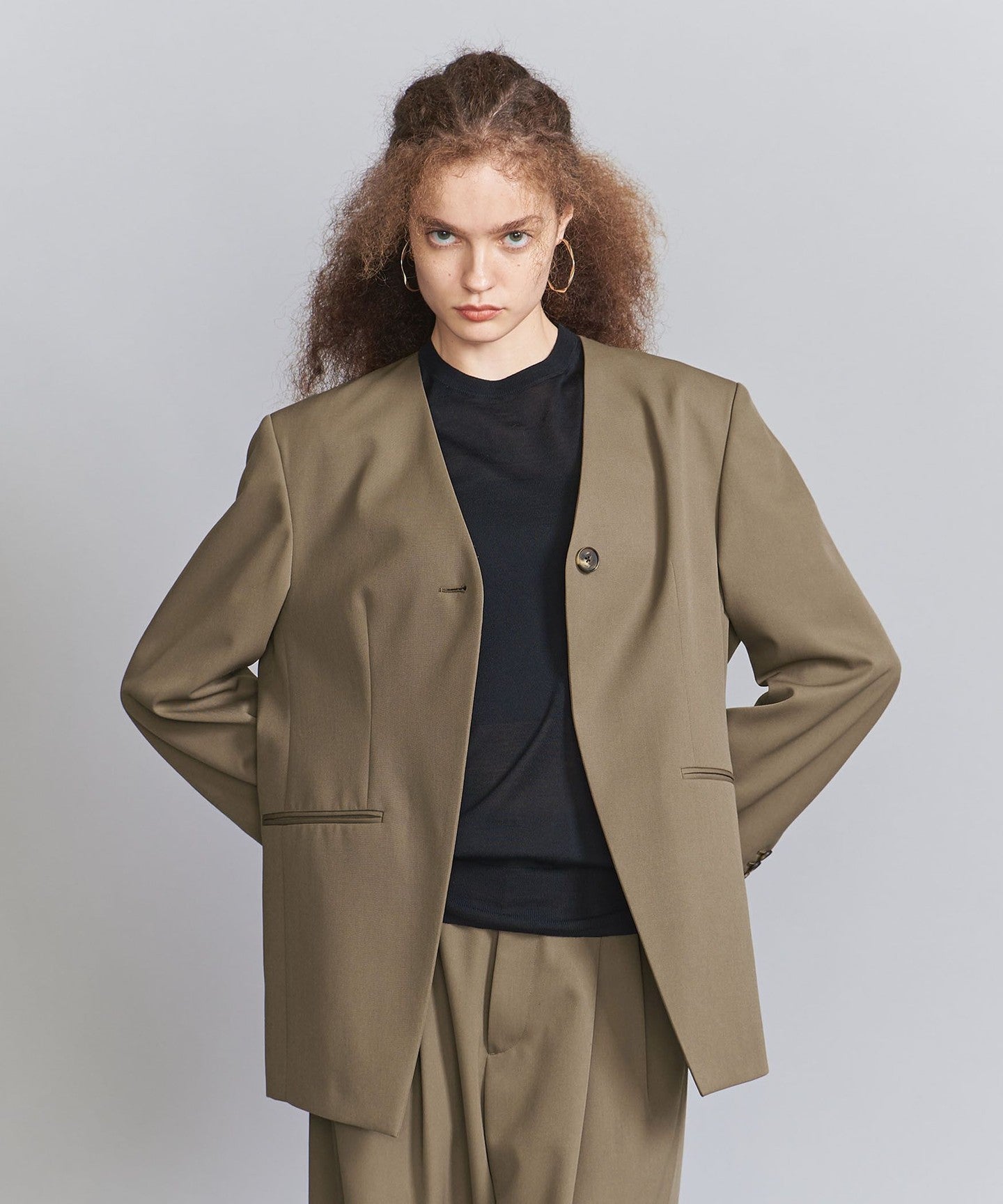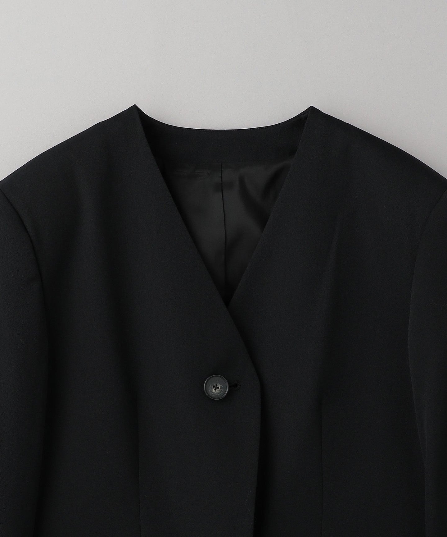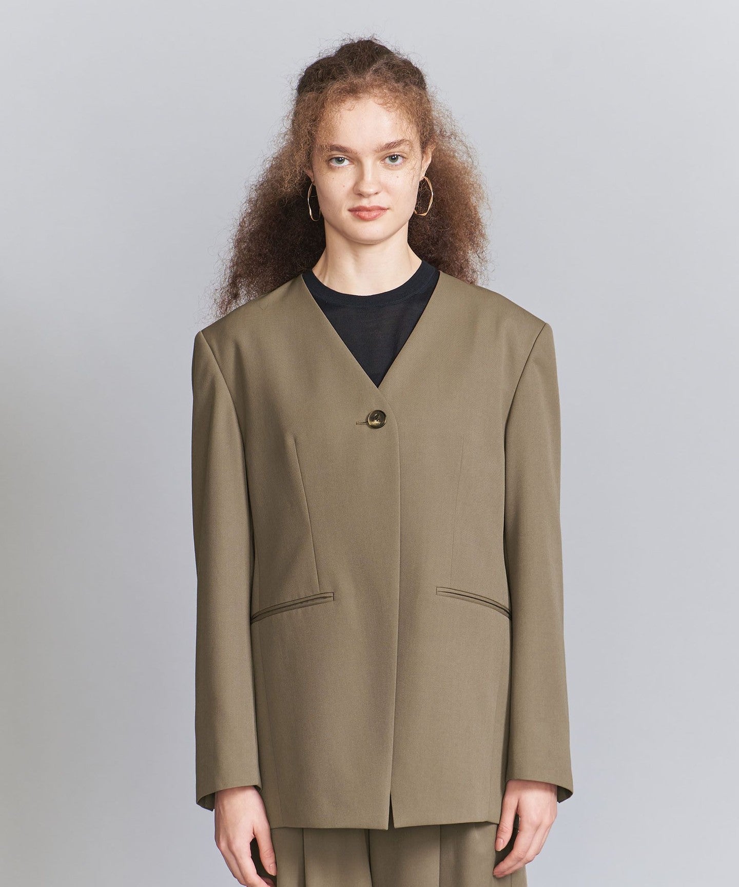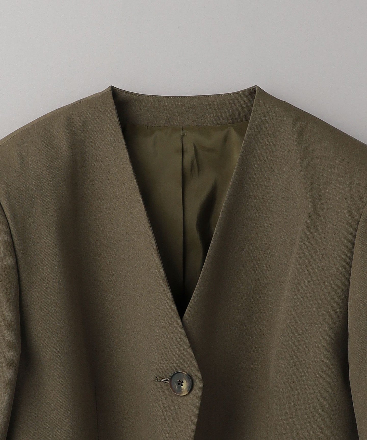 This is a collarless jacket with wide shoulders and a high front that gives it a modern look.