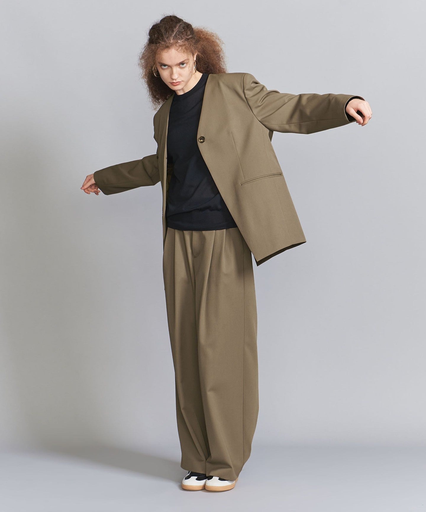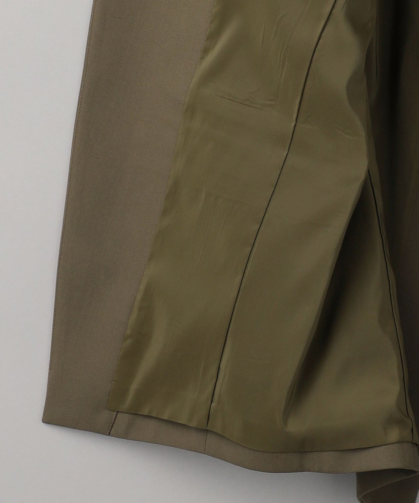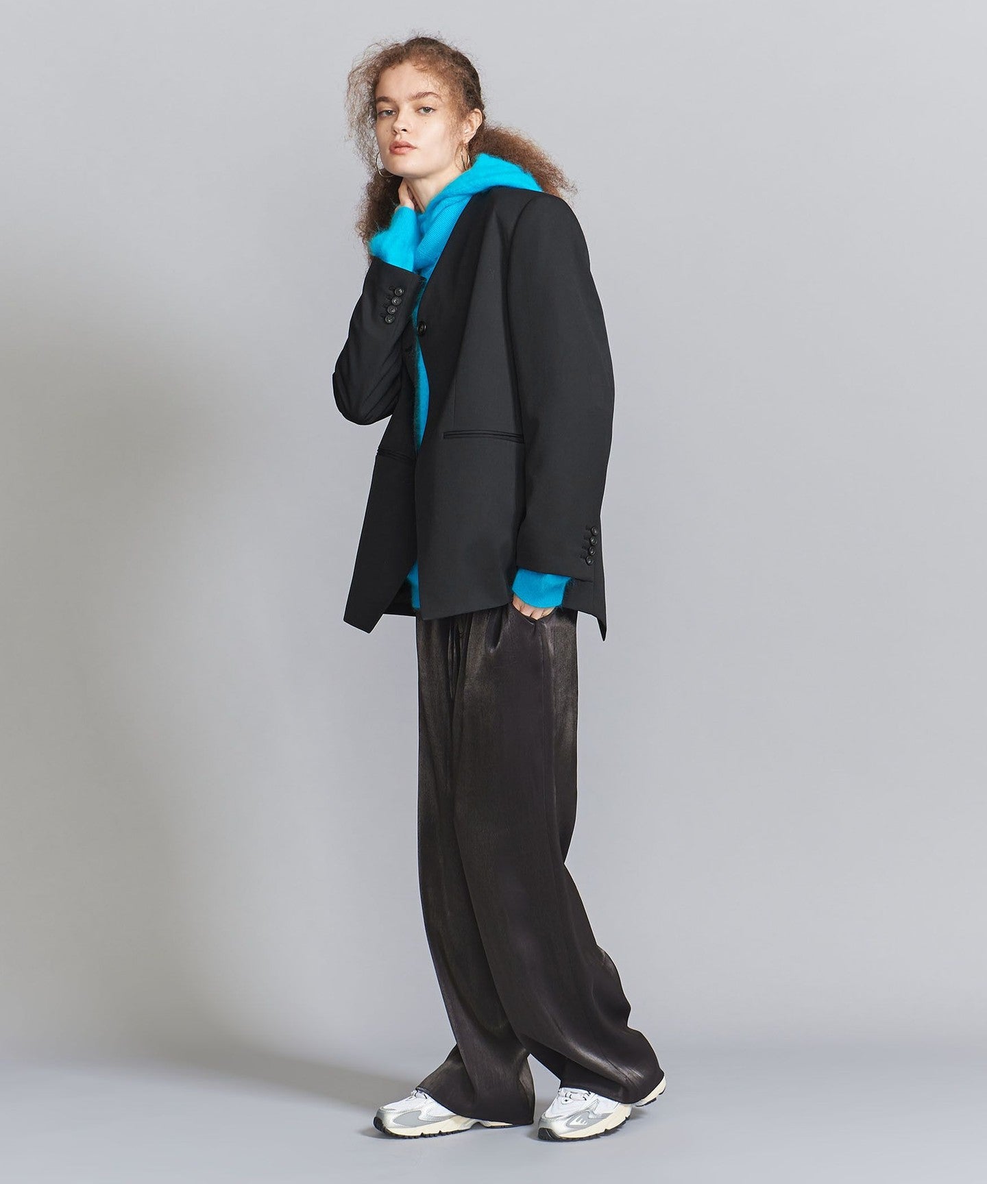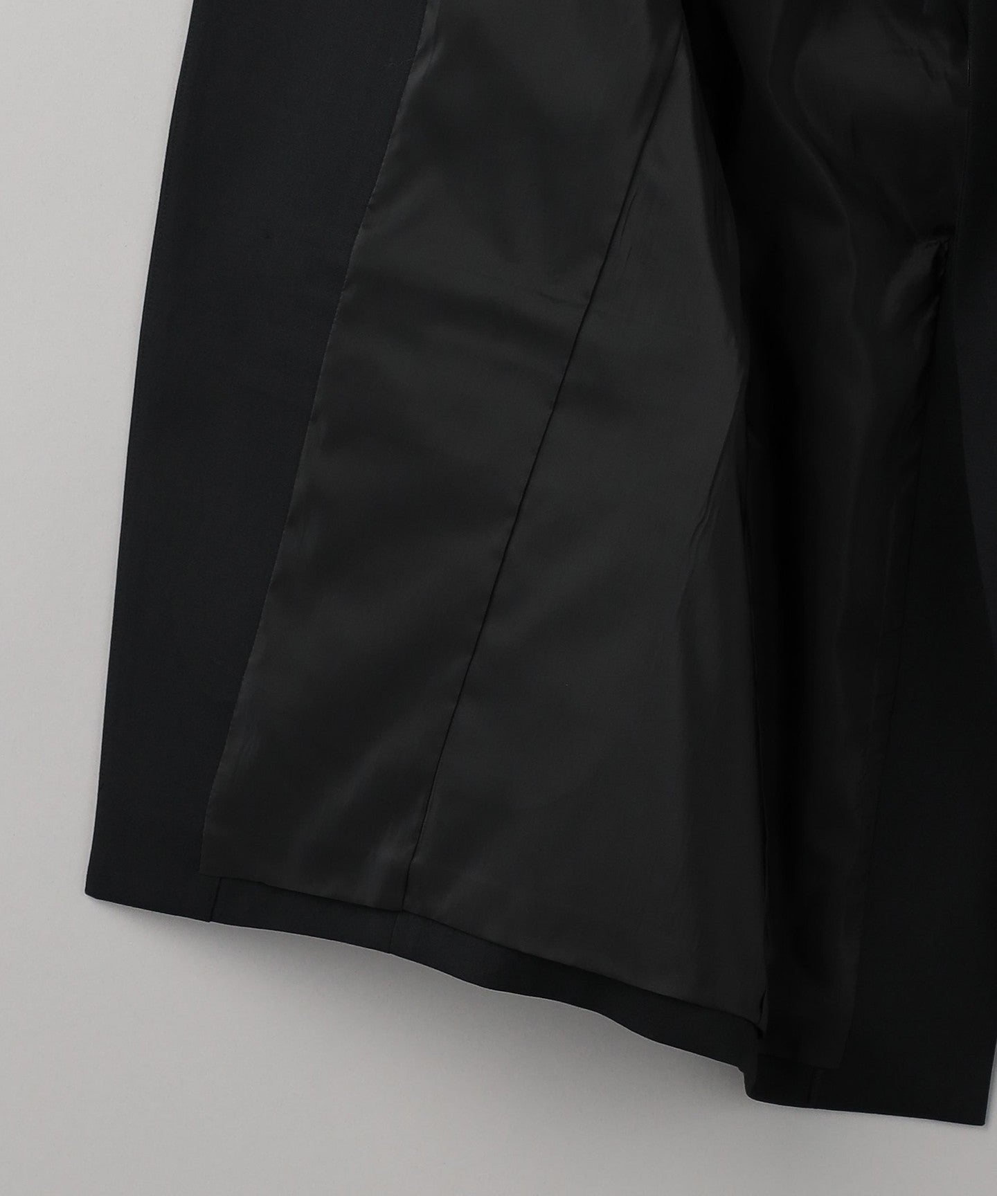 When paired with pants made of the same material, the unique design makes it appear as if the back slit and the tucks of the pants are connected.