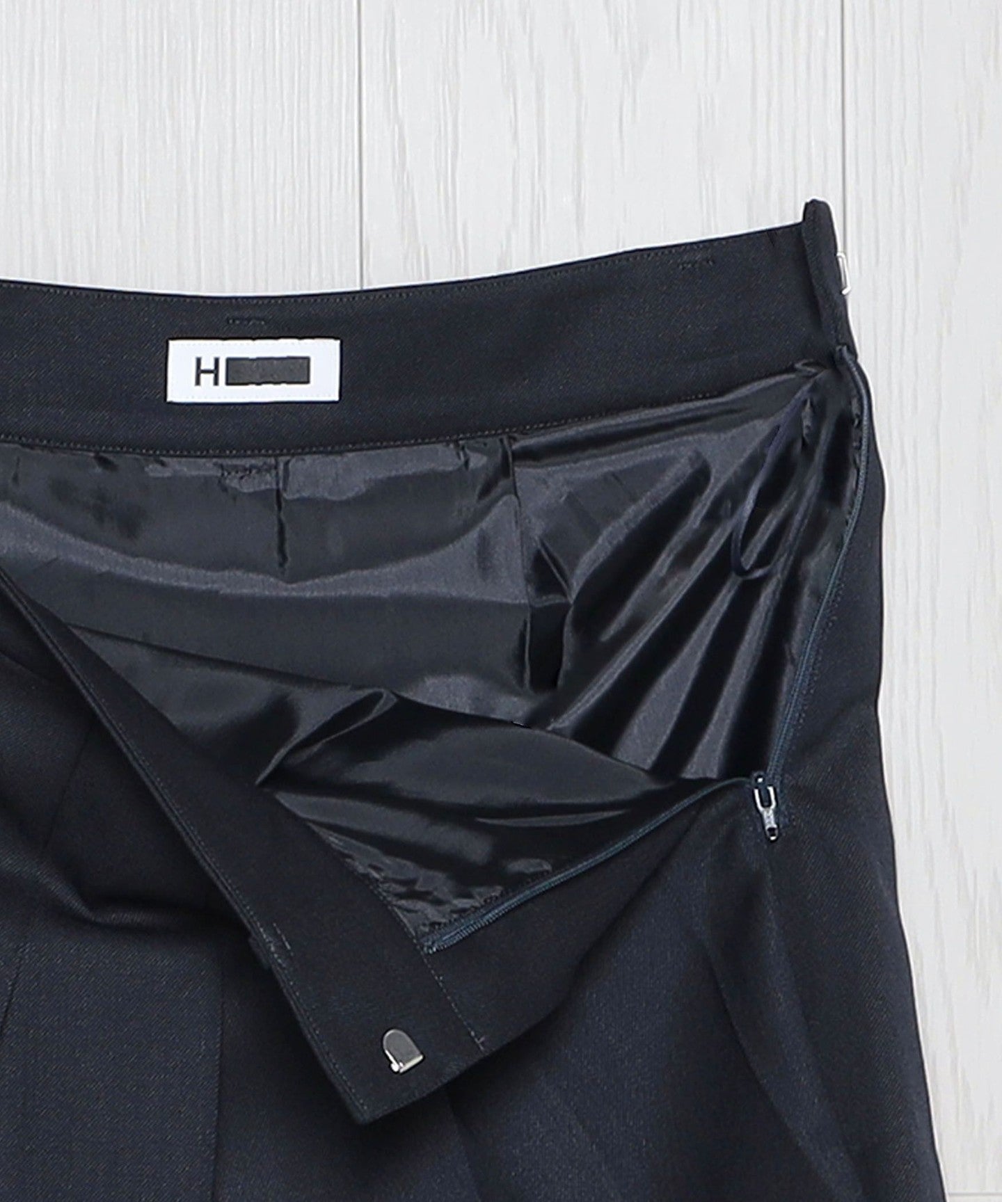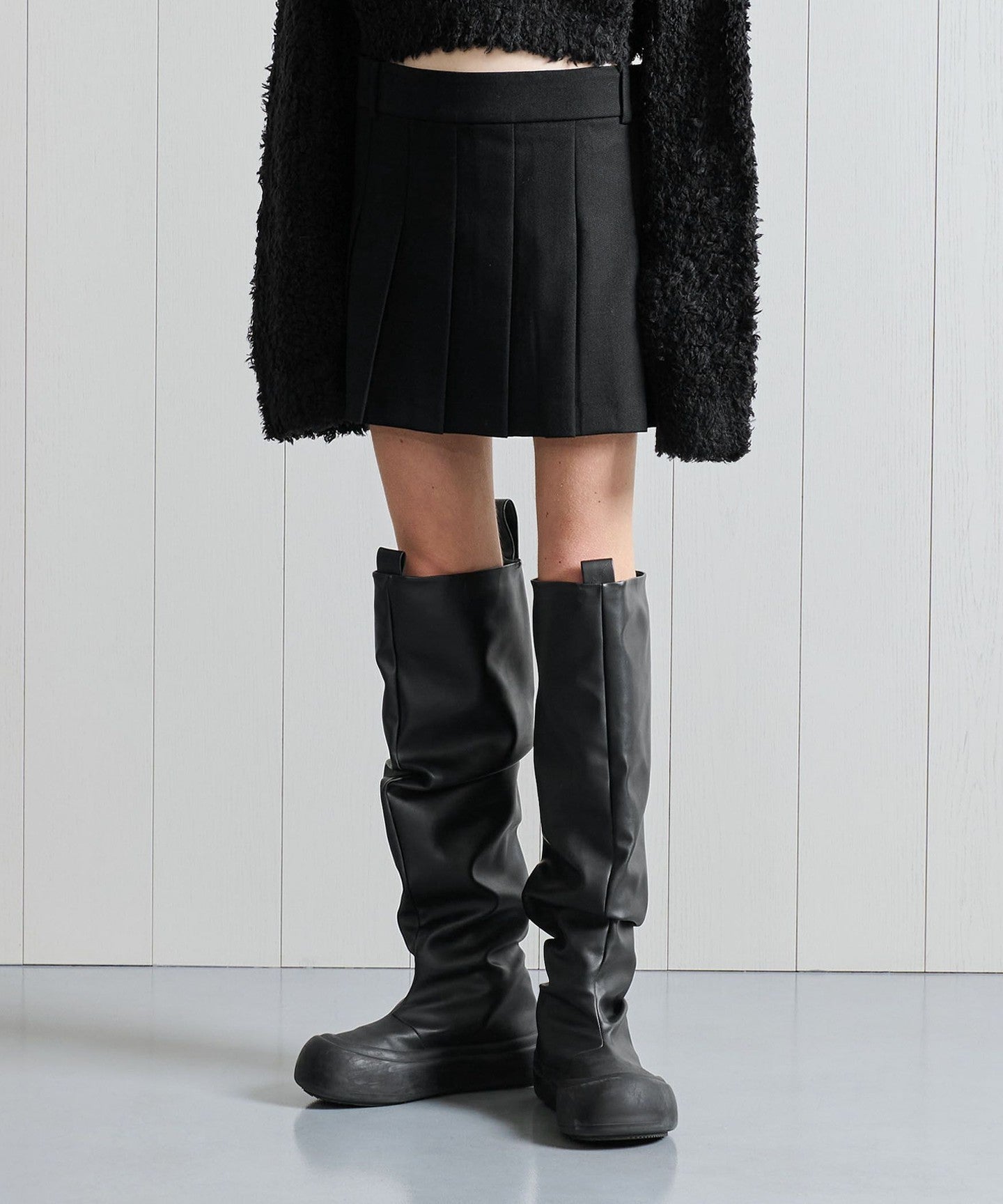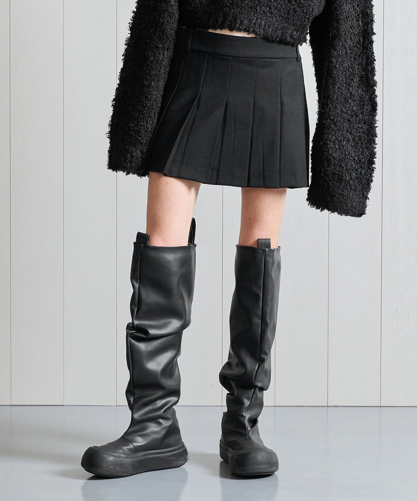 This pleated skirt is crafted from a firm, firm twill fabric. It sits low at the waist and can also be styled with a belt. The balance of the neat pleats and the mini length creates a fresh look. It pairs well with heavier winter pieces like mid-gauge knitwear and leather. This playful skirt exudes a classic mood while also achieving an edgy style.