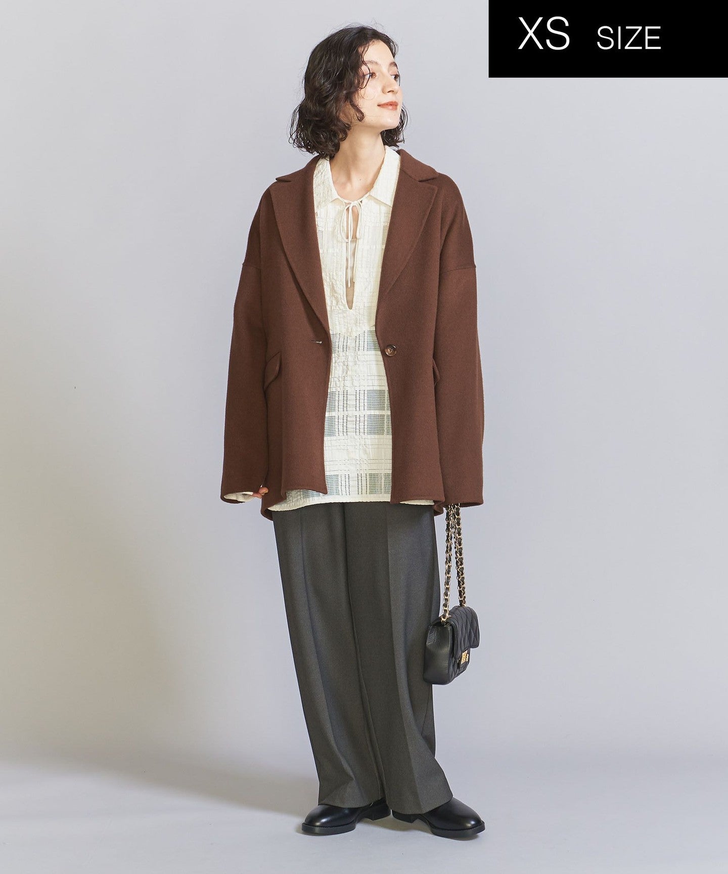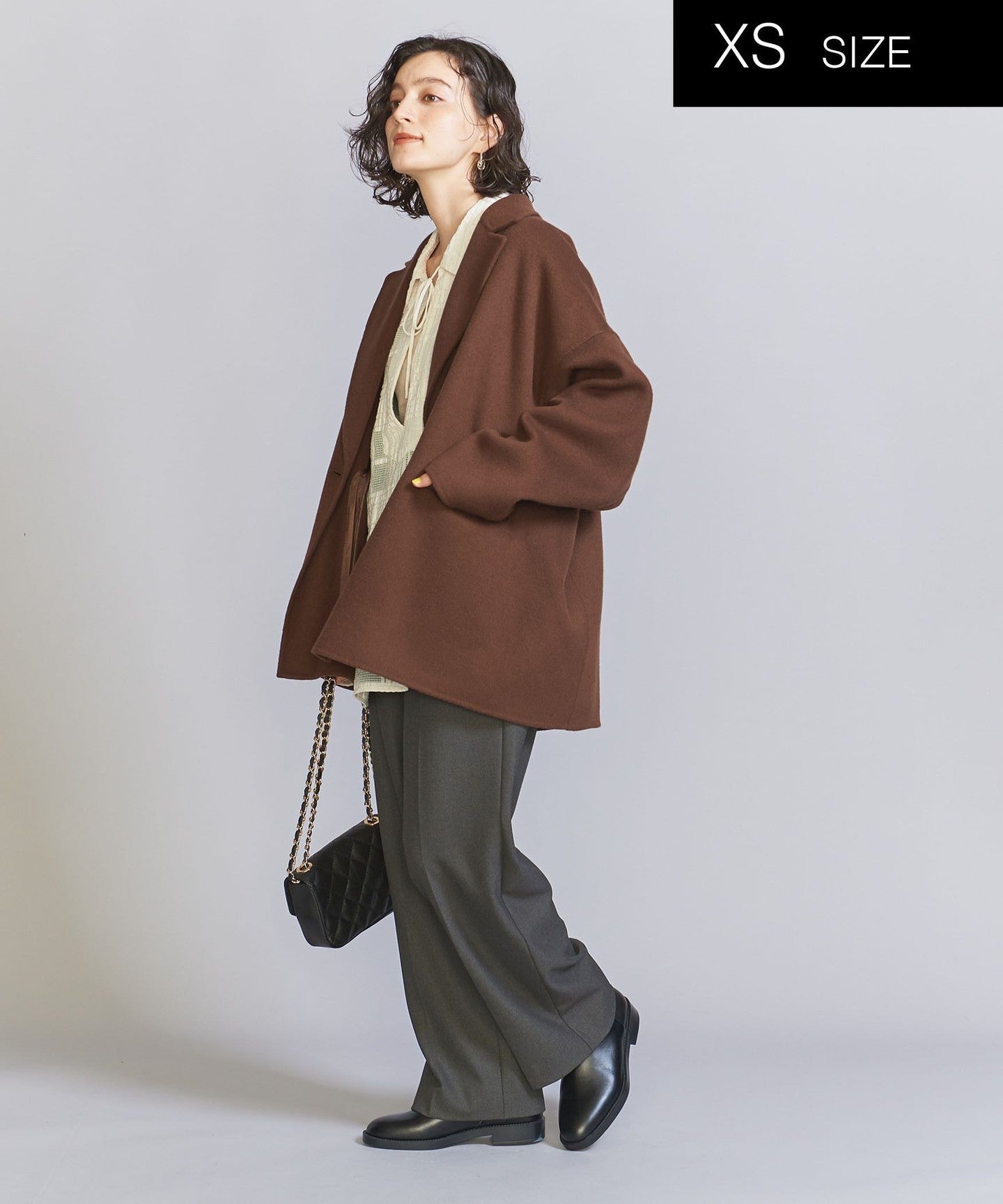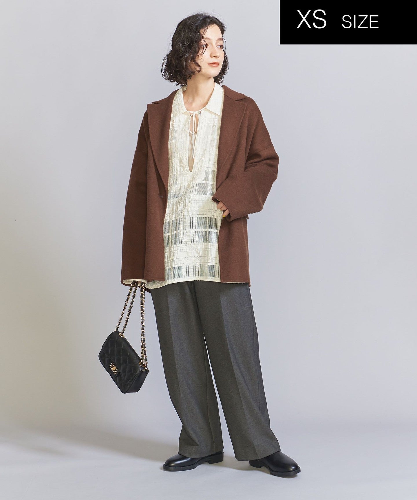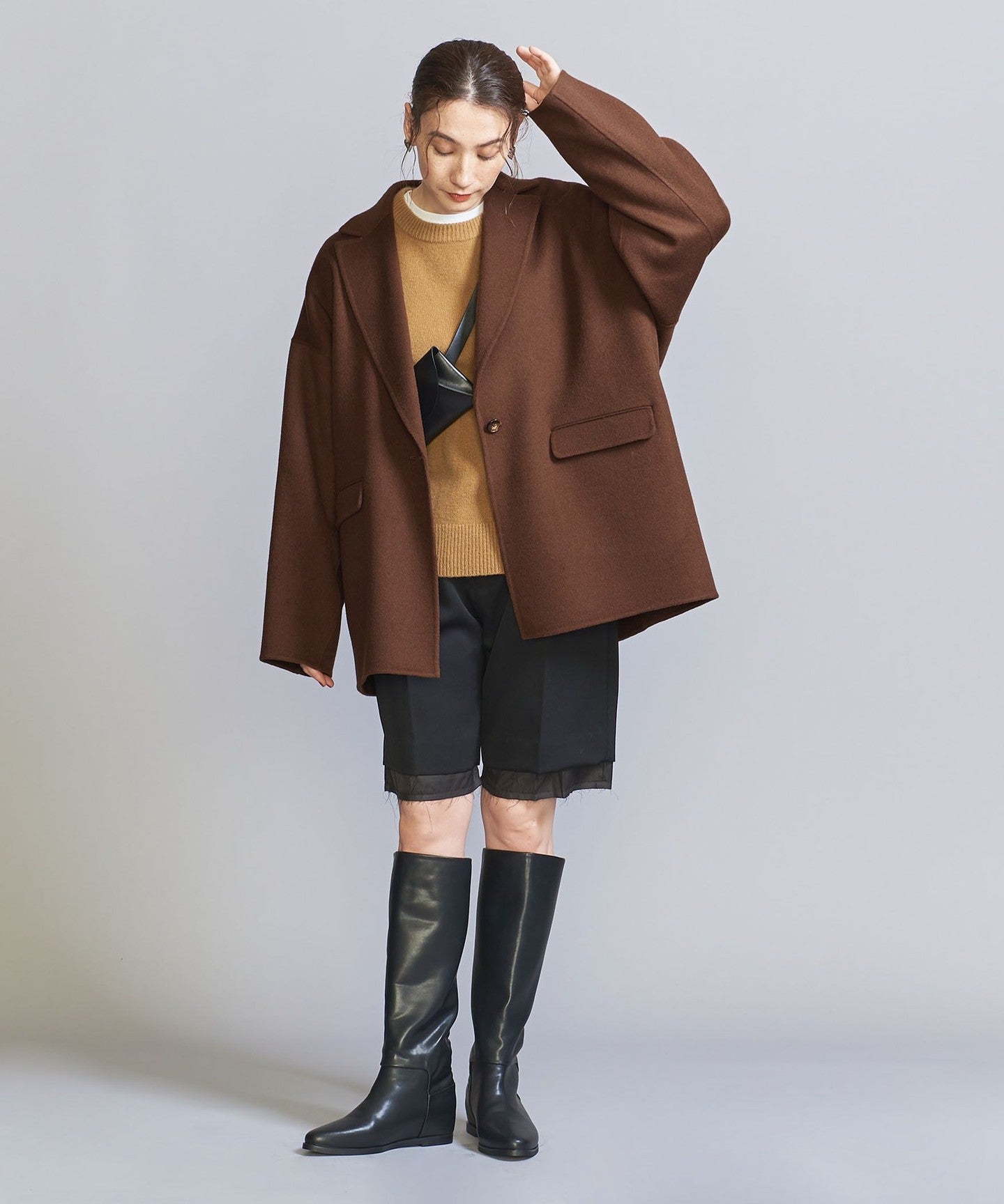 Despite the wide silhouette, the length covers the buttocks and is tucked in at the back.