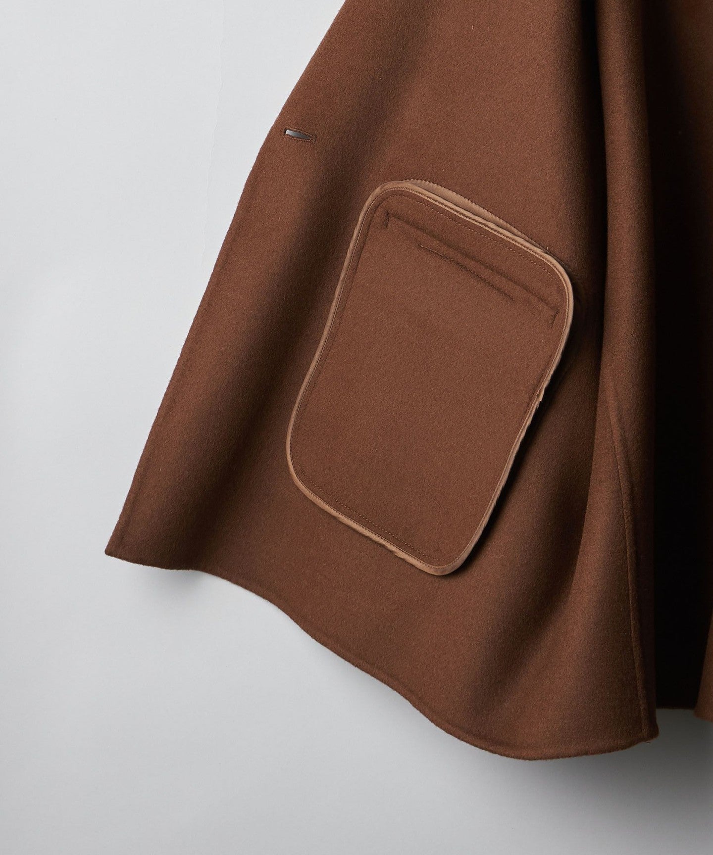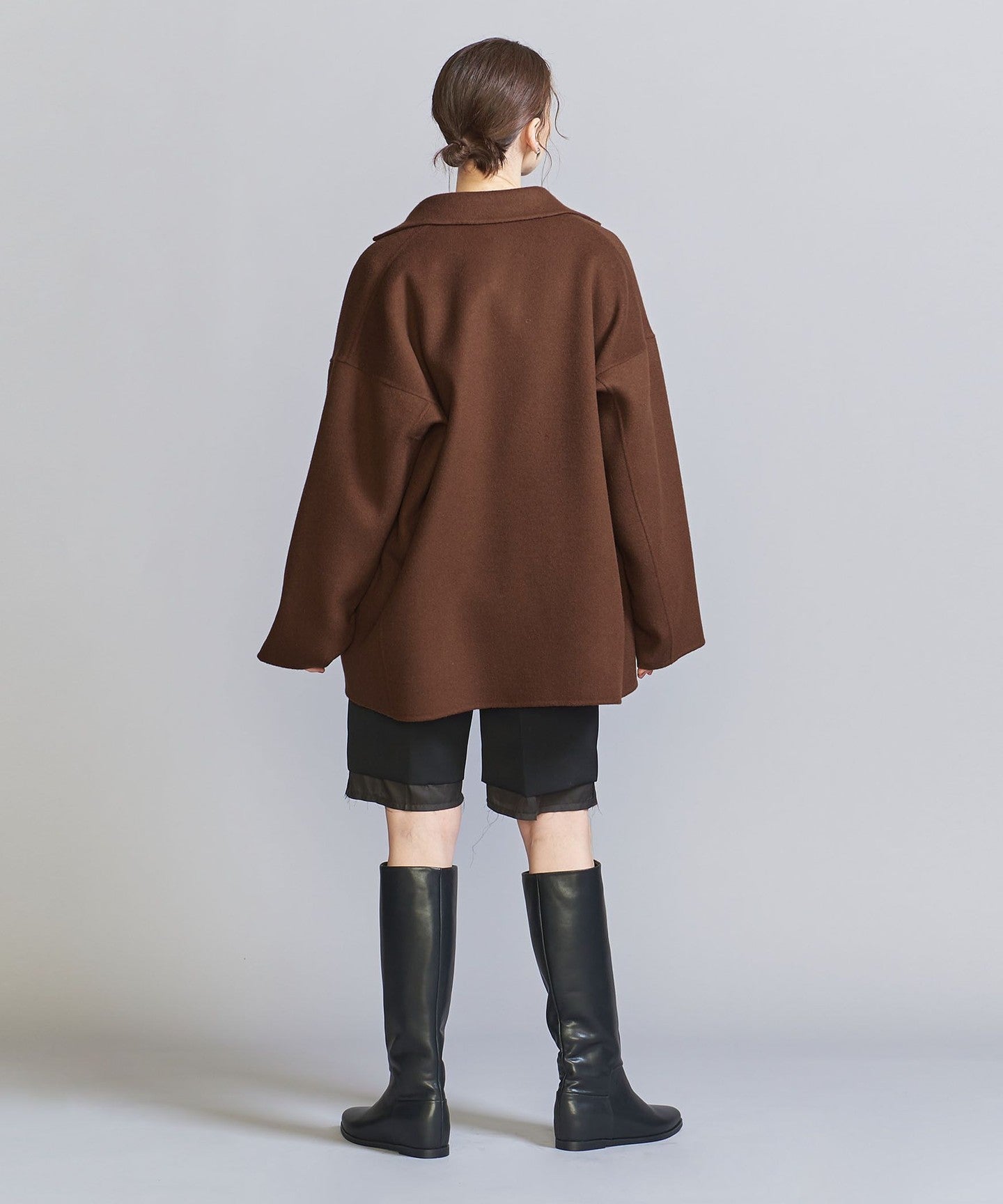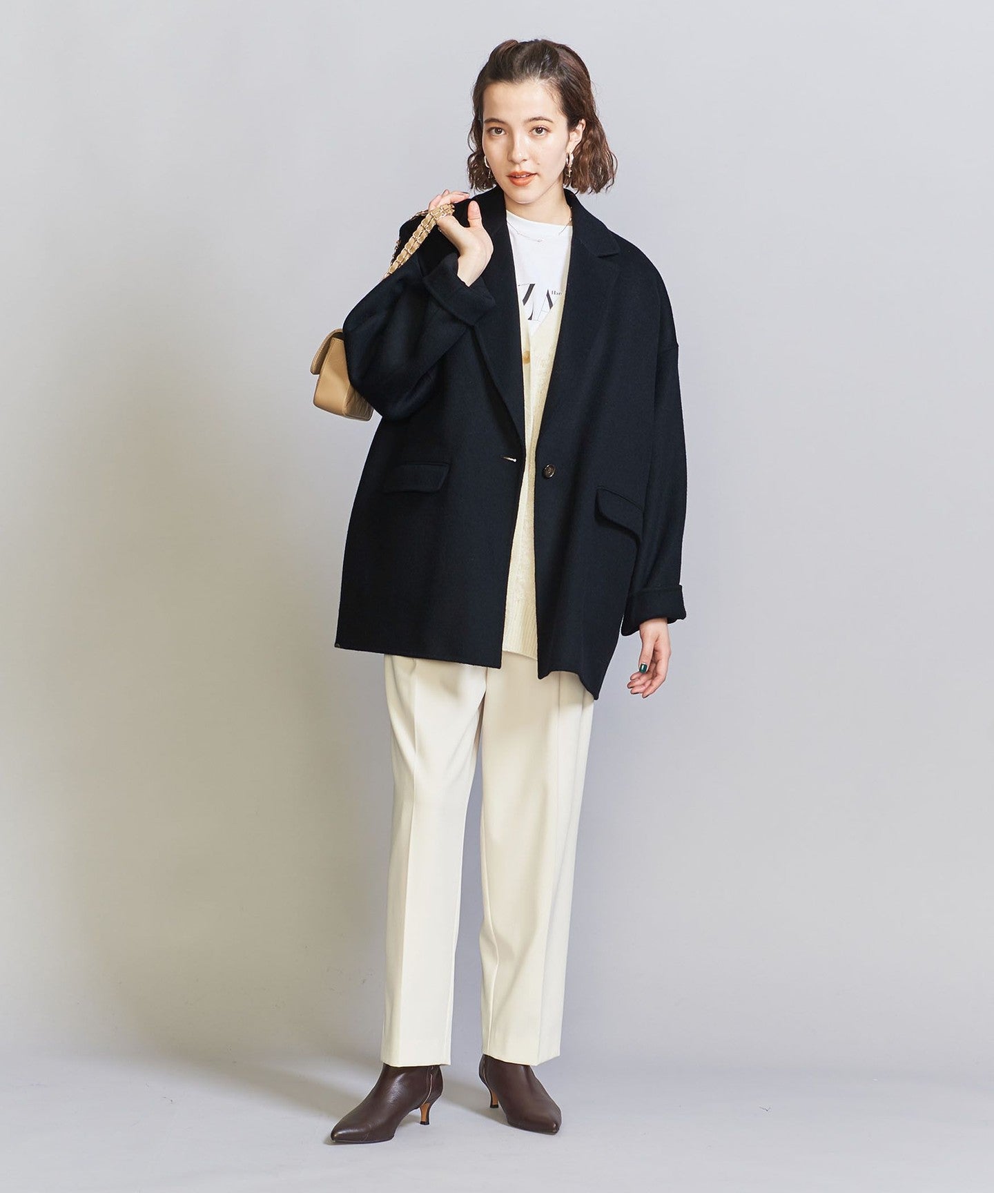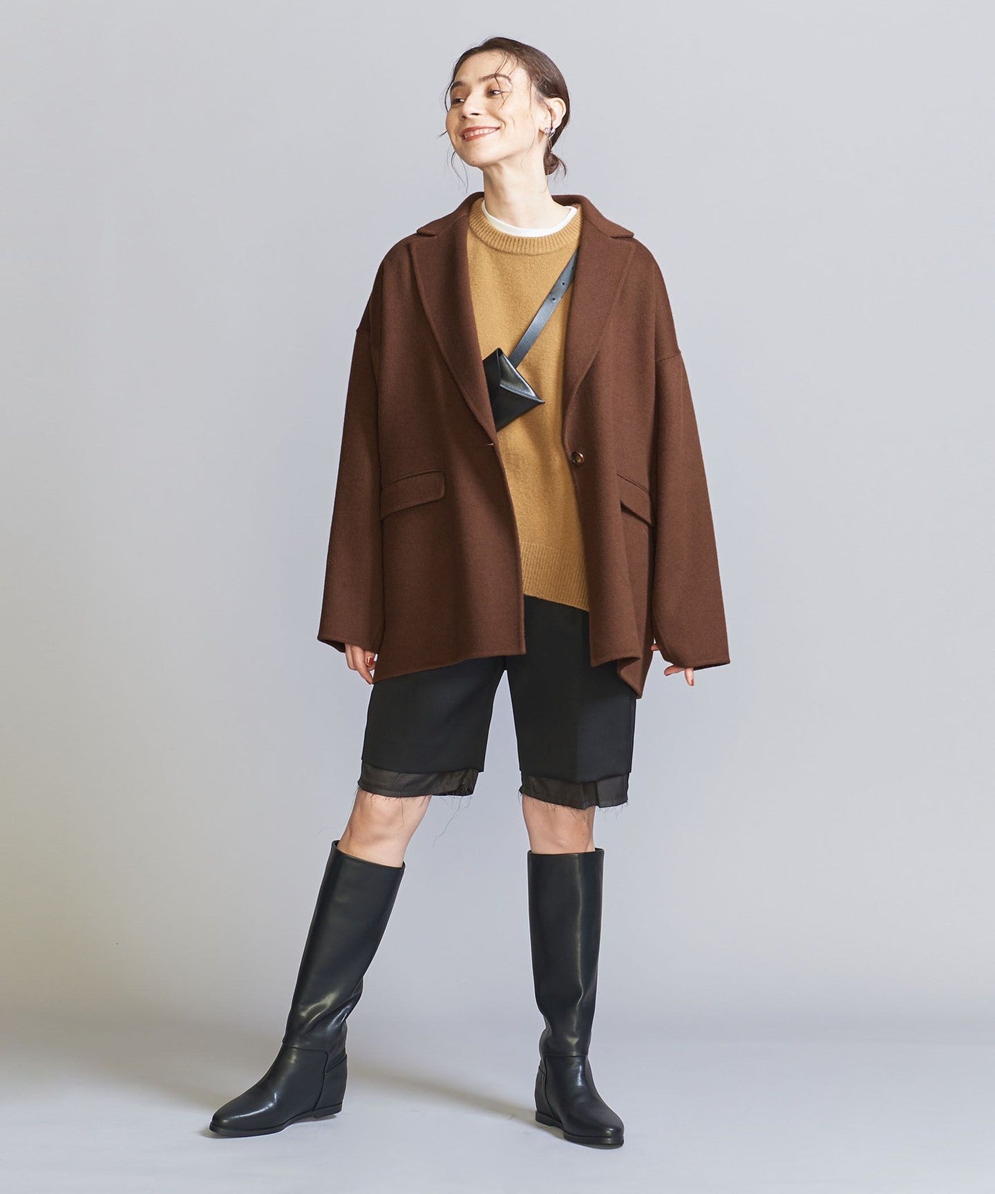 Despite the wide silhouette, the length covers the buttocks and is tucked in at the back.