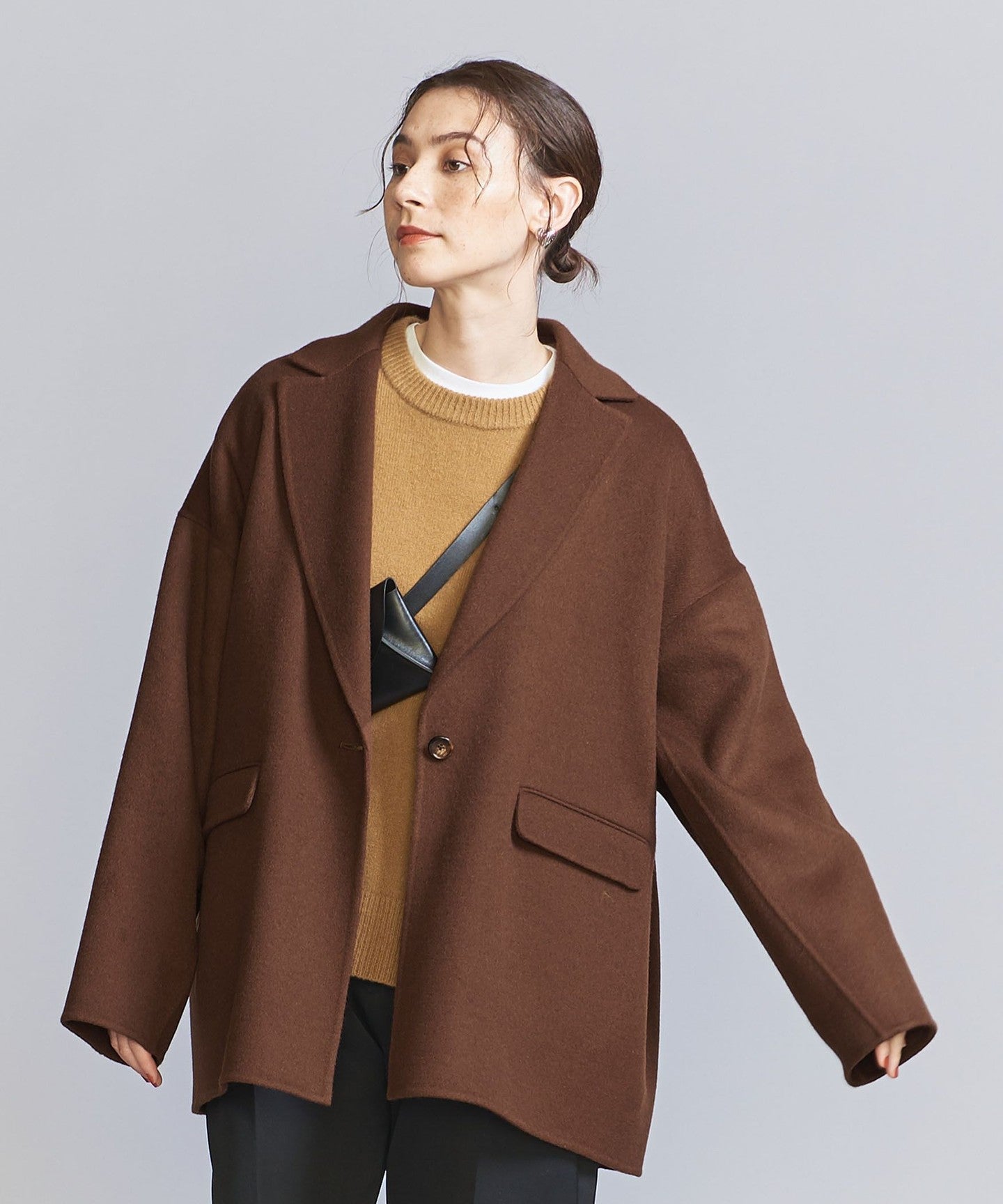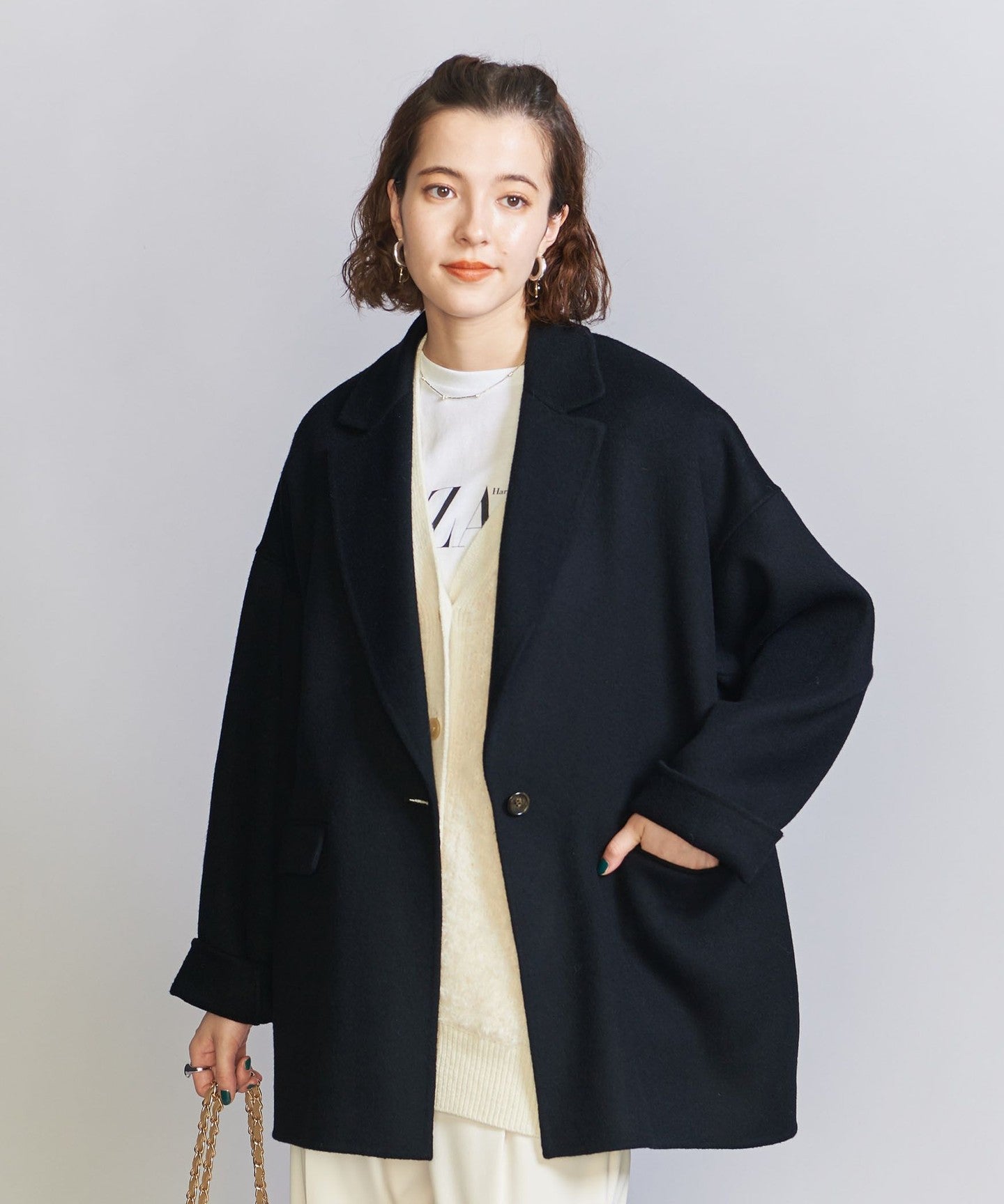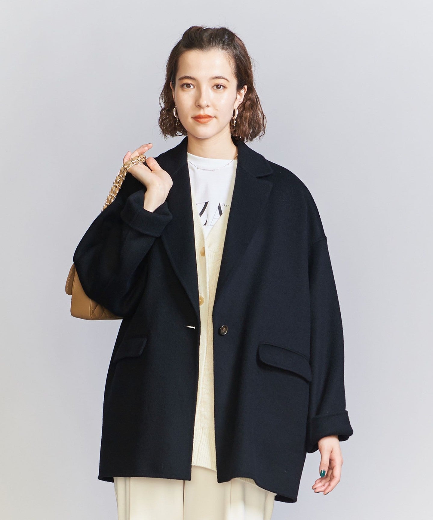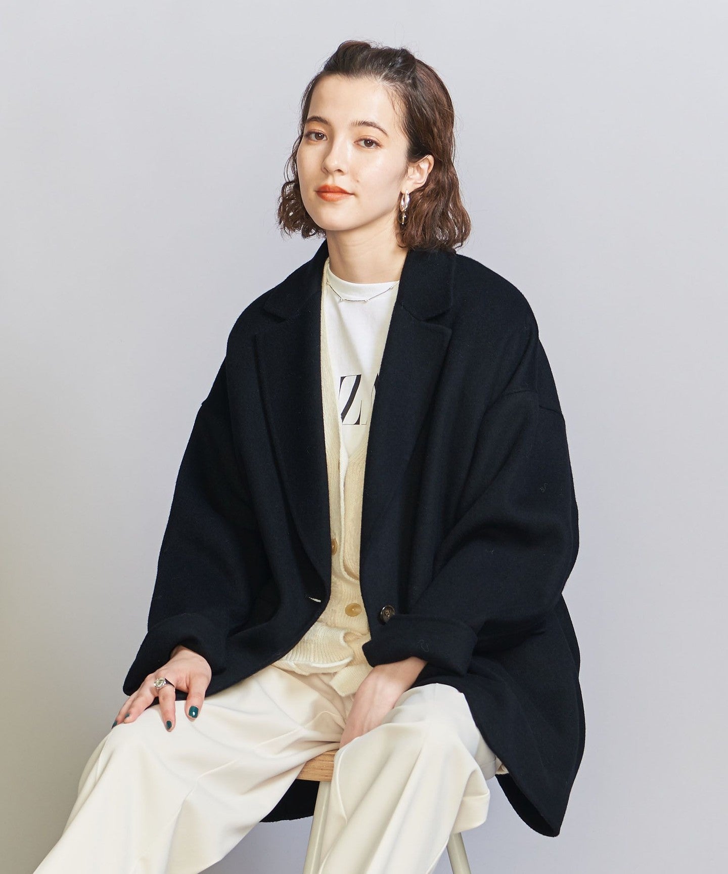 Despite the wide silhouette, the length covers the buttocks and is tucked in at the back.