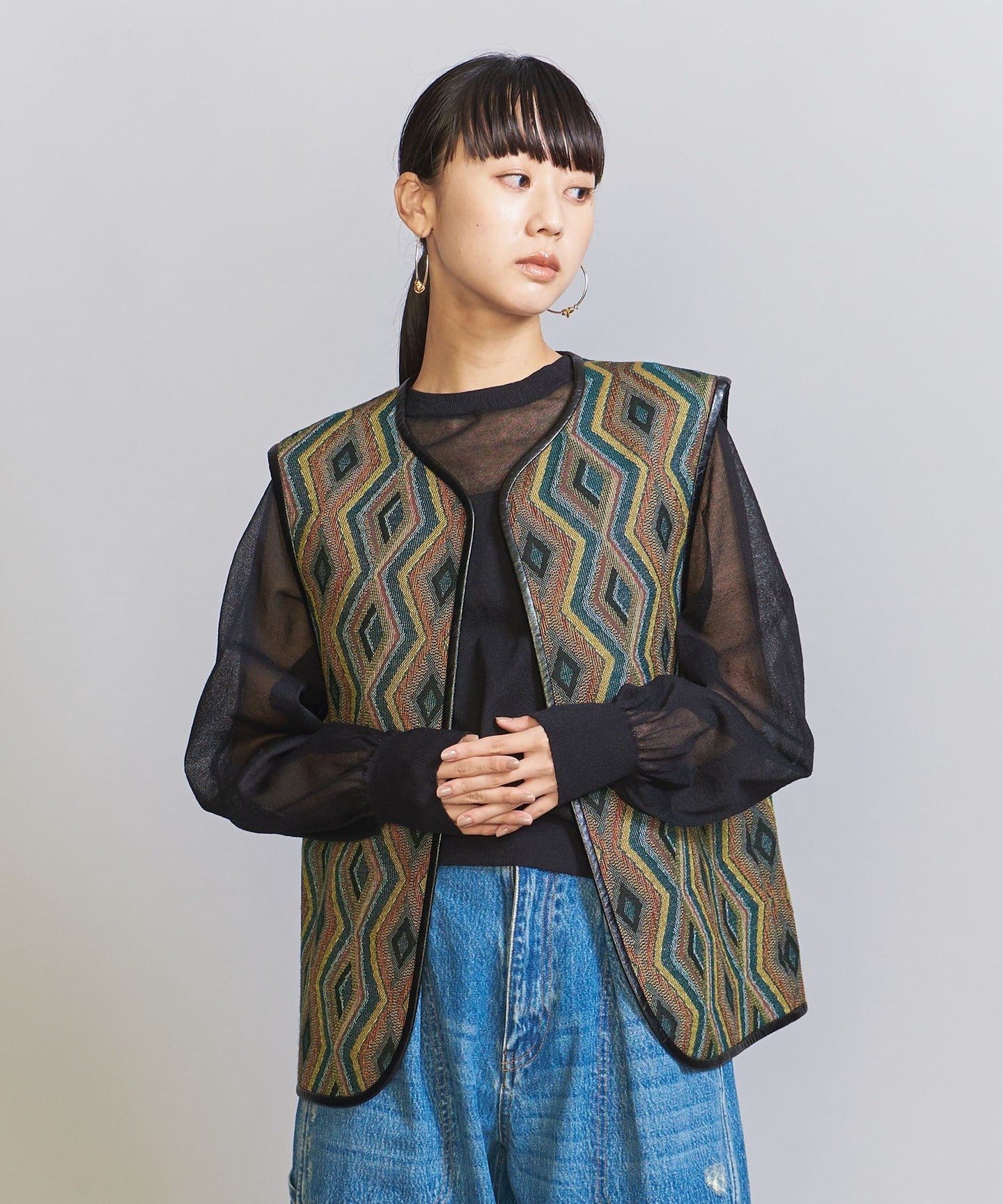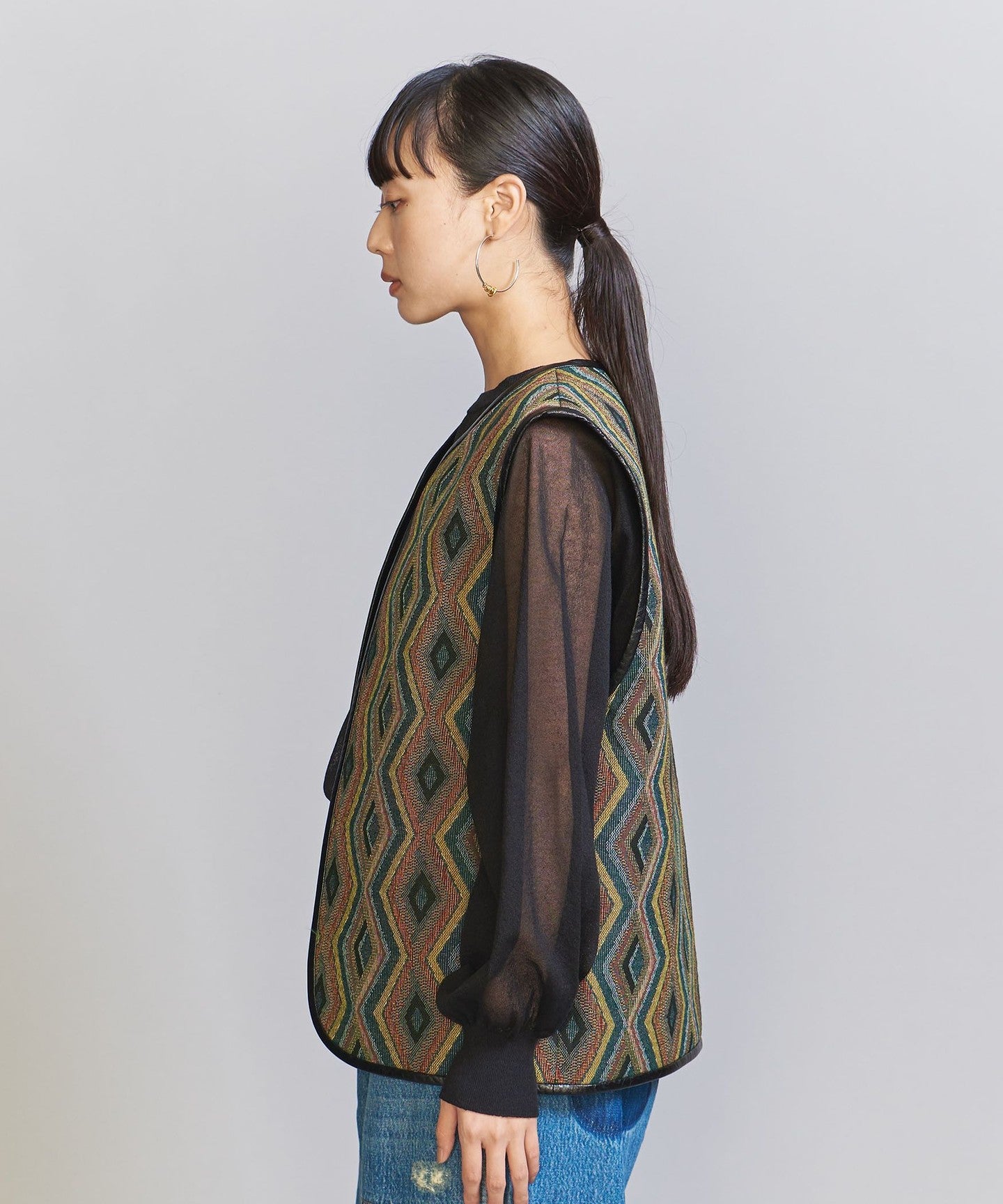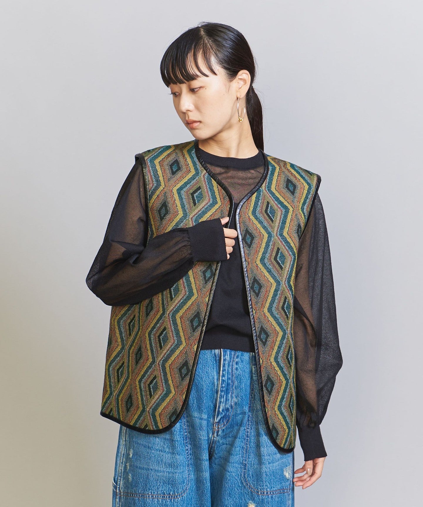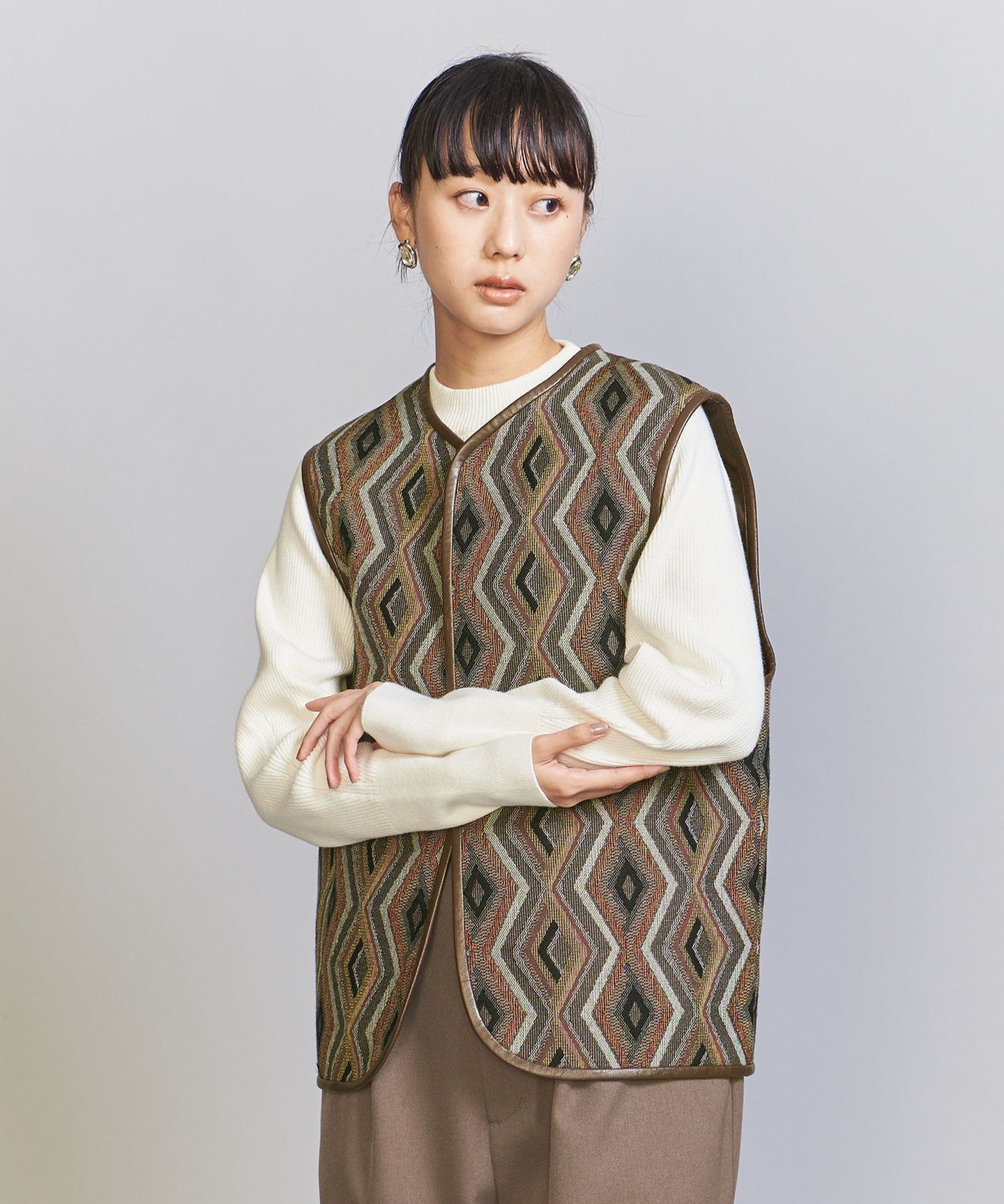 The chic color jacquard pattern is perfect for the season.TIE A 2-way vest that's perfect for everyday wear.