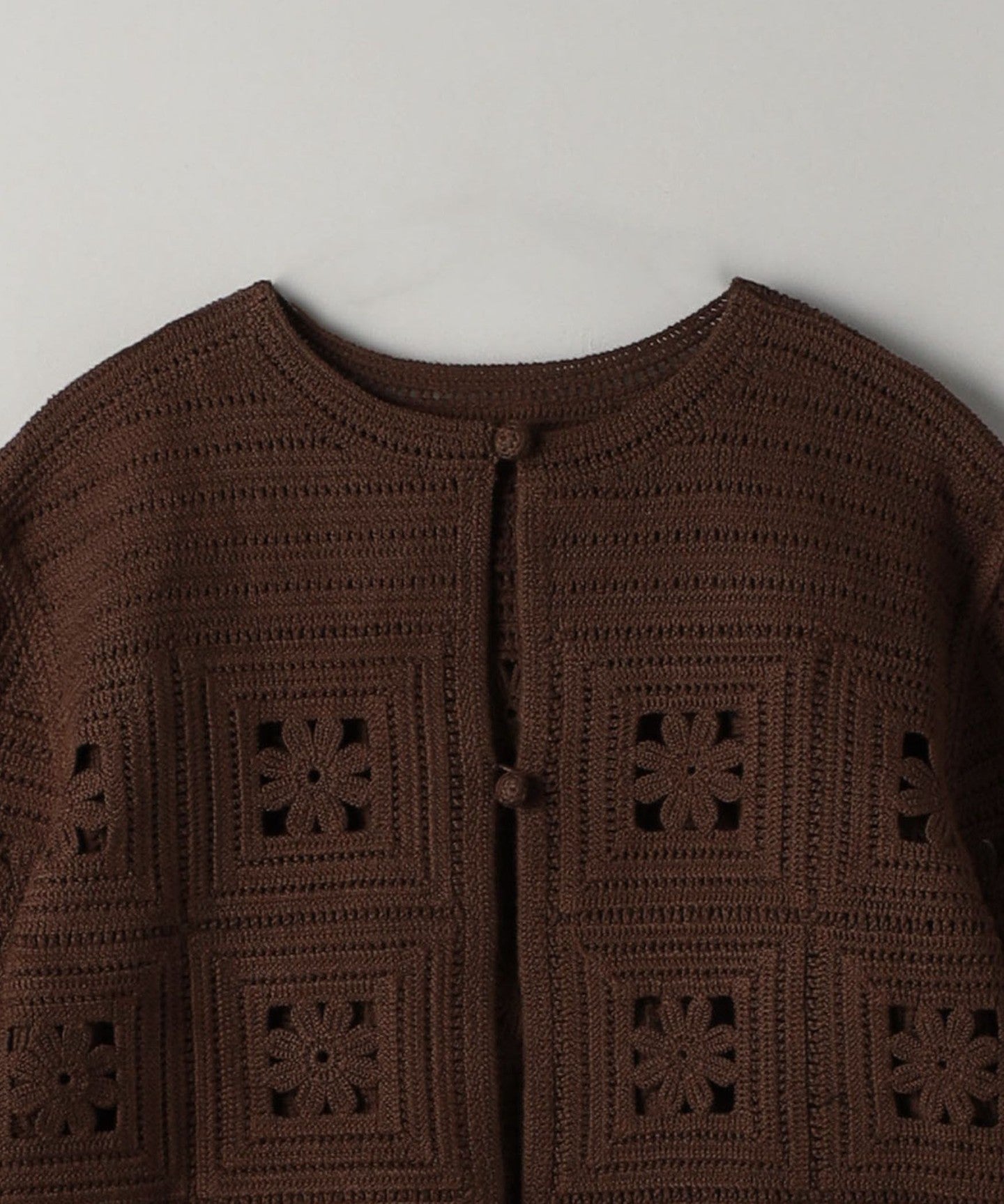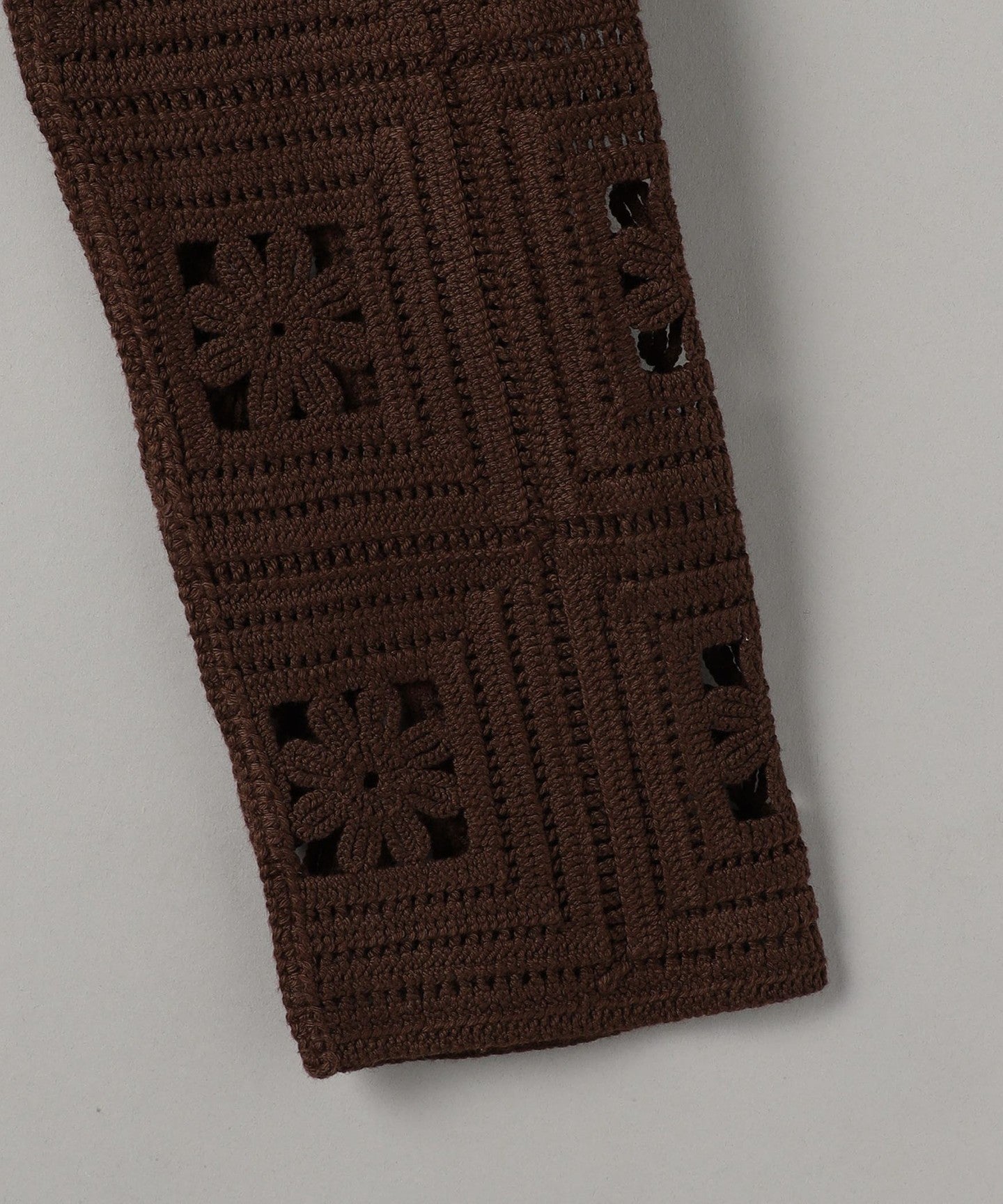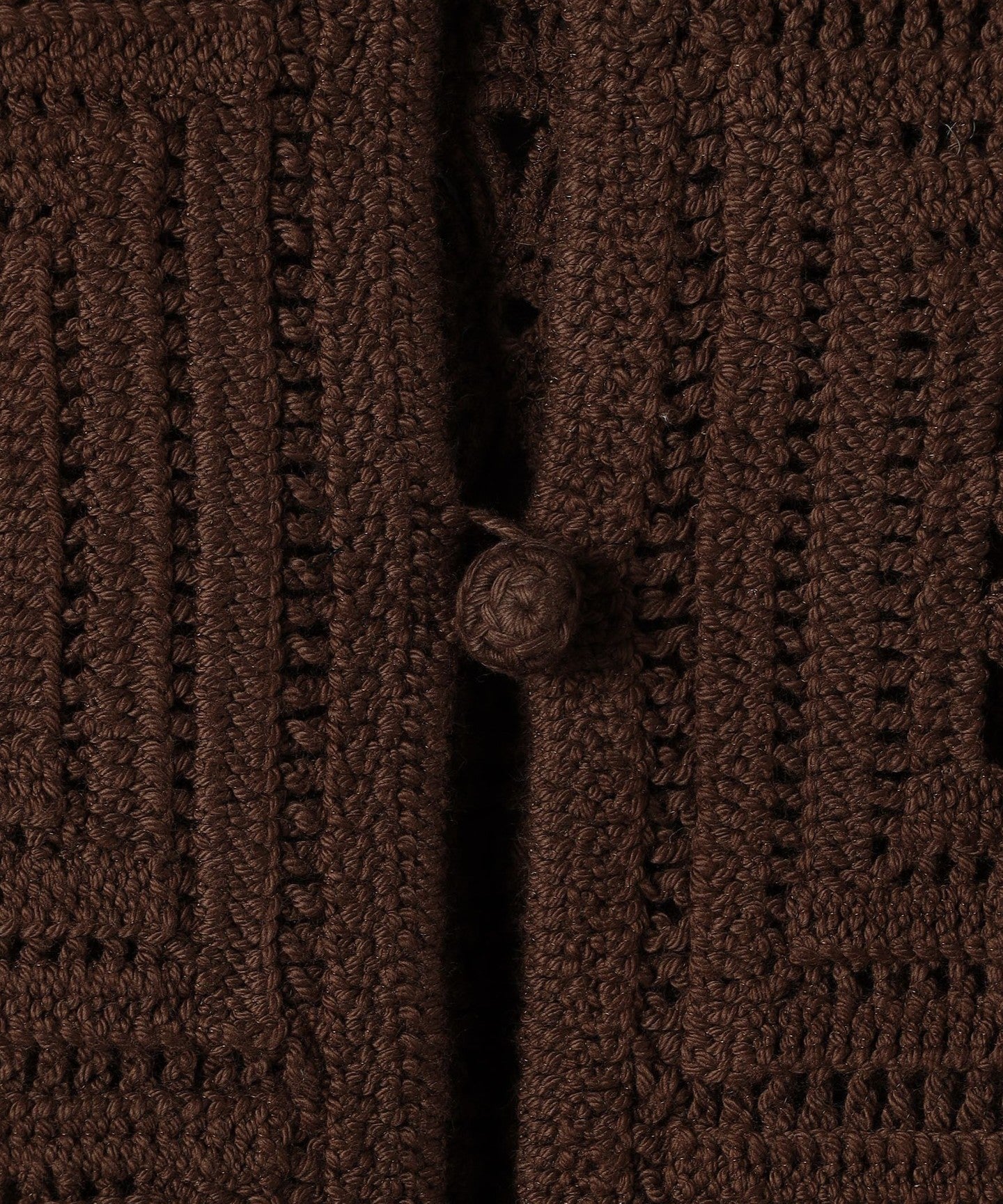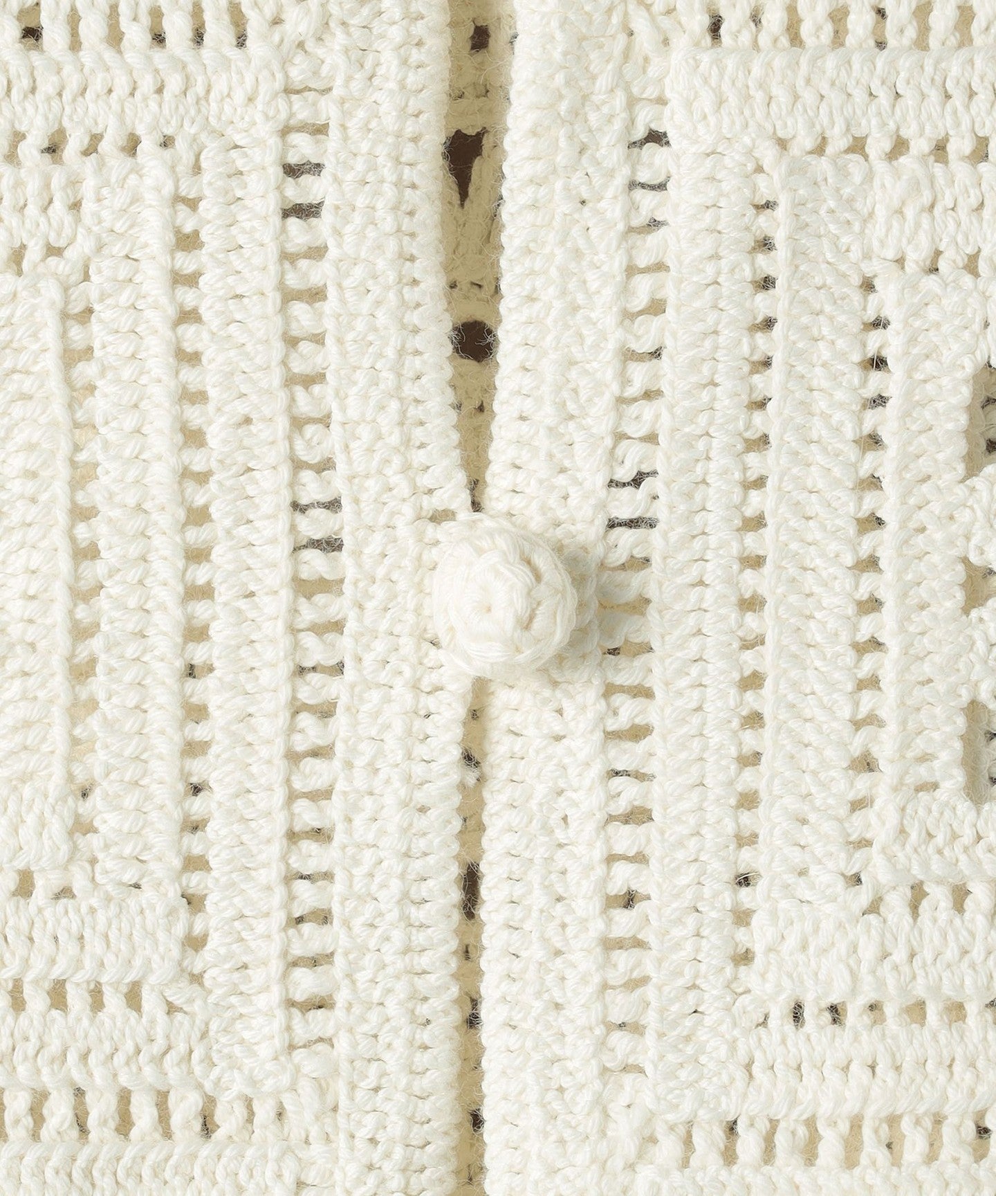 A crochet-style cardigan featuring a continuous square motif pattern.
