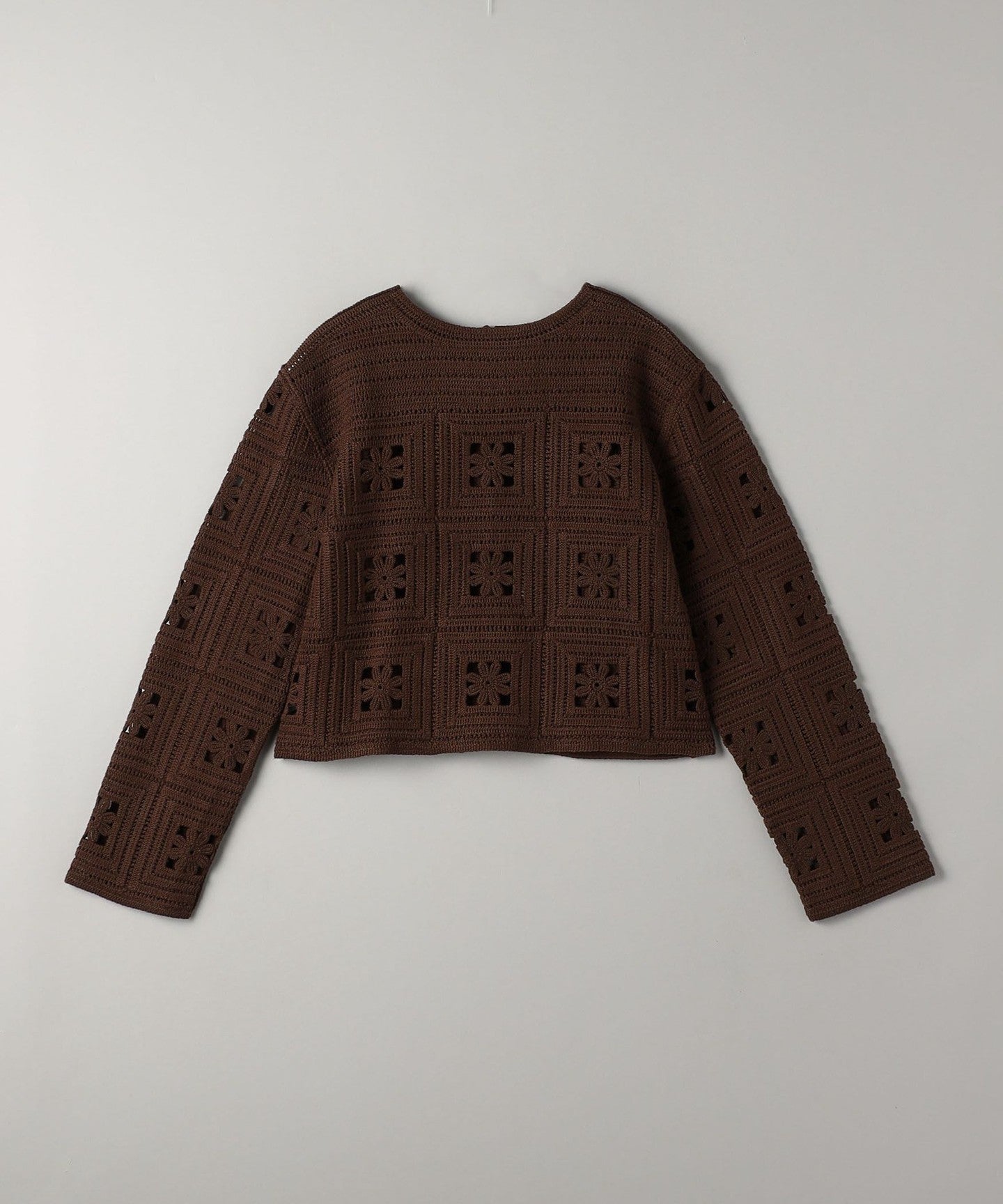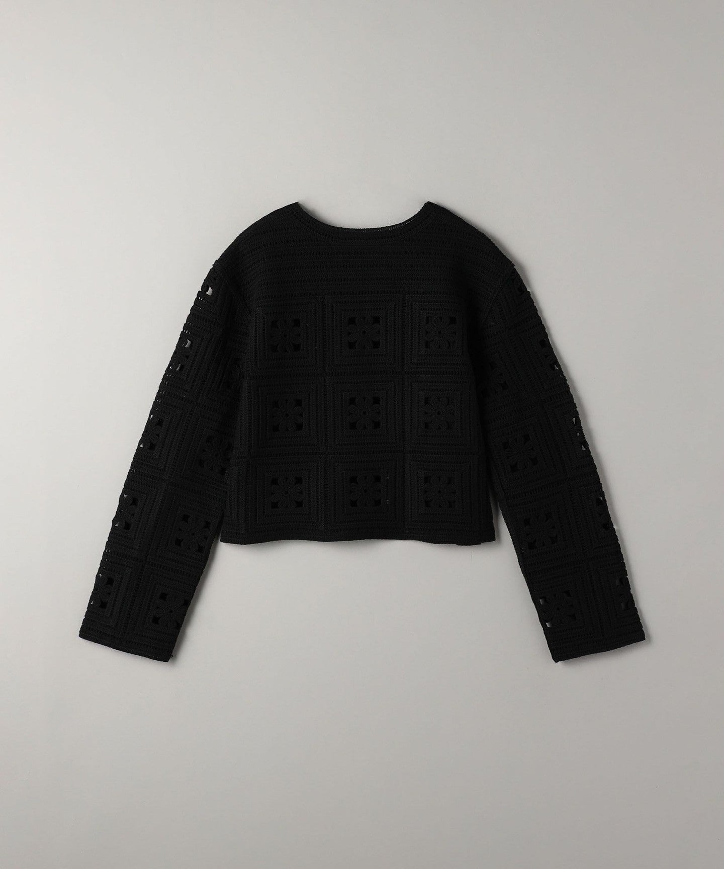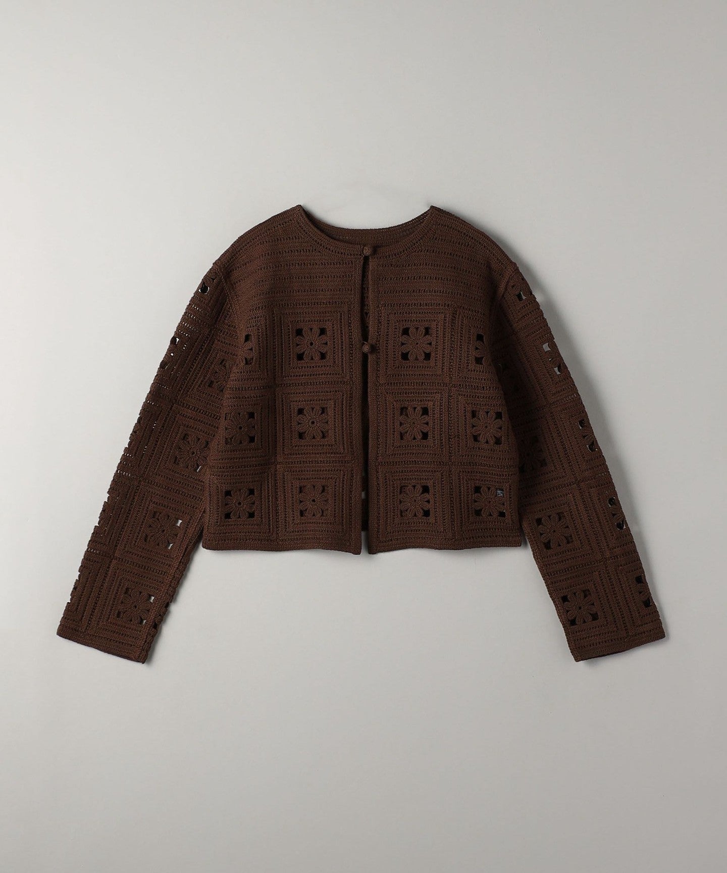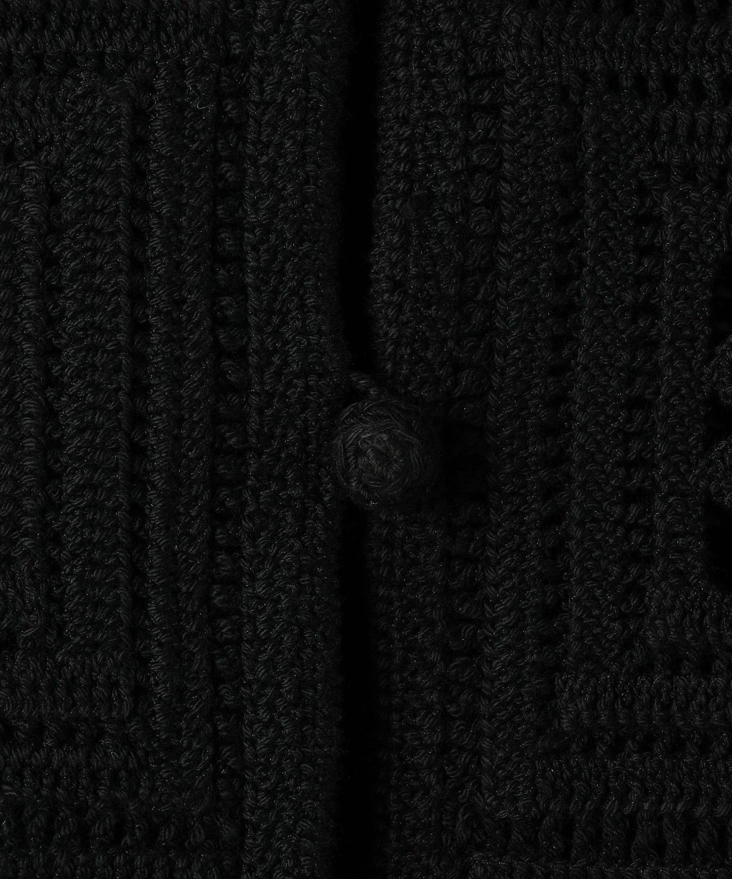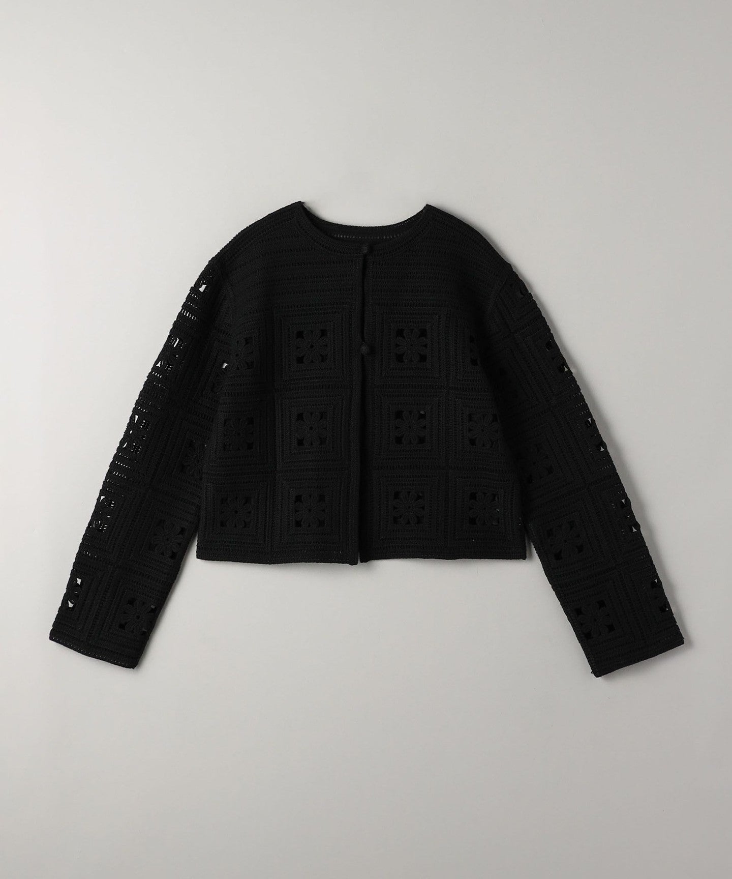 A crochet-style cardigan featuring a continuous square motif pattern.
