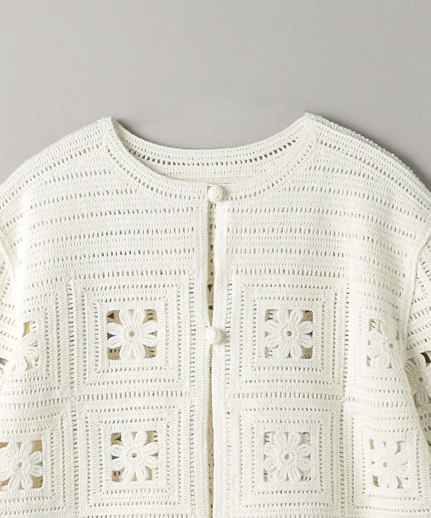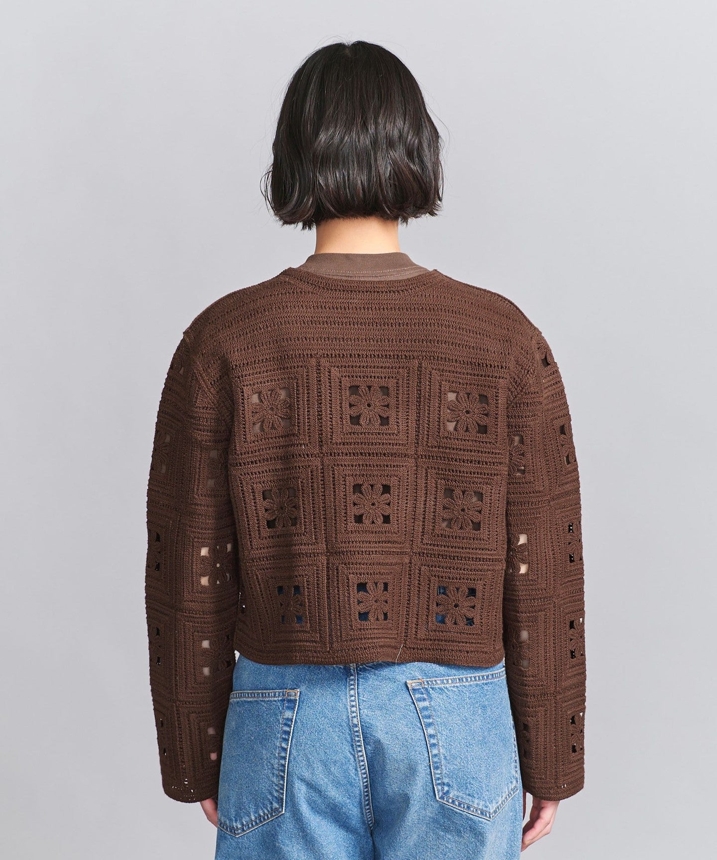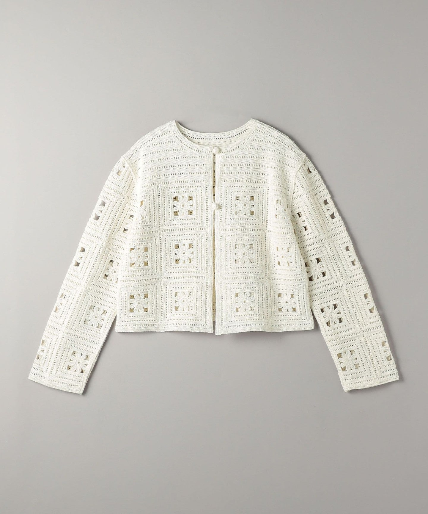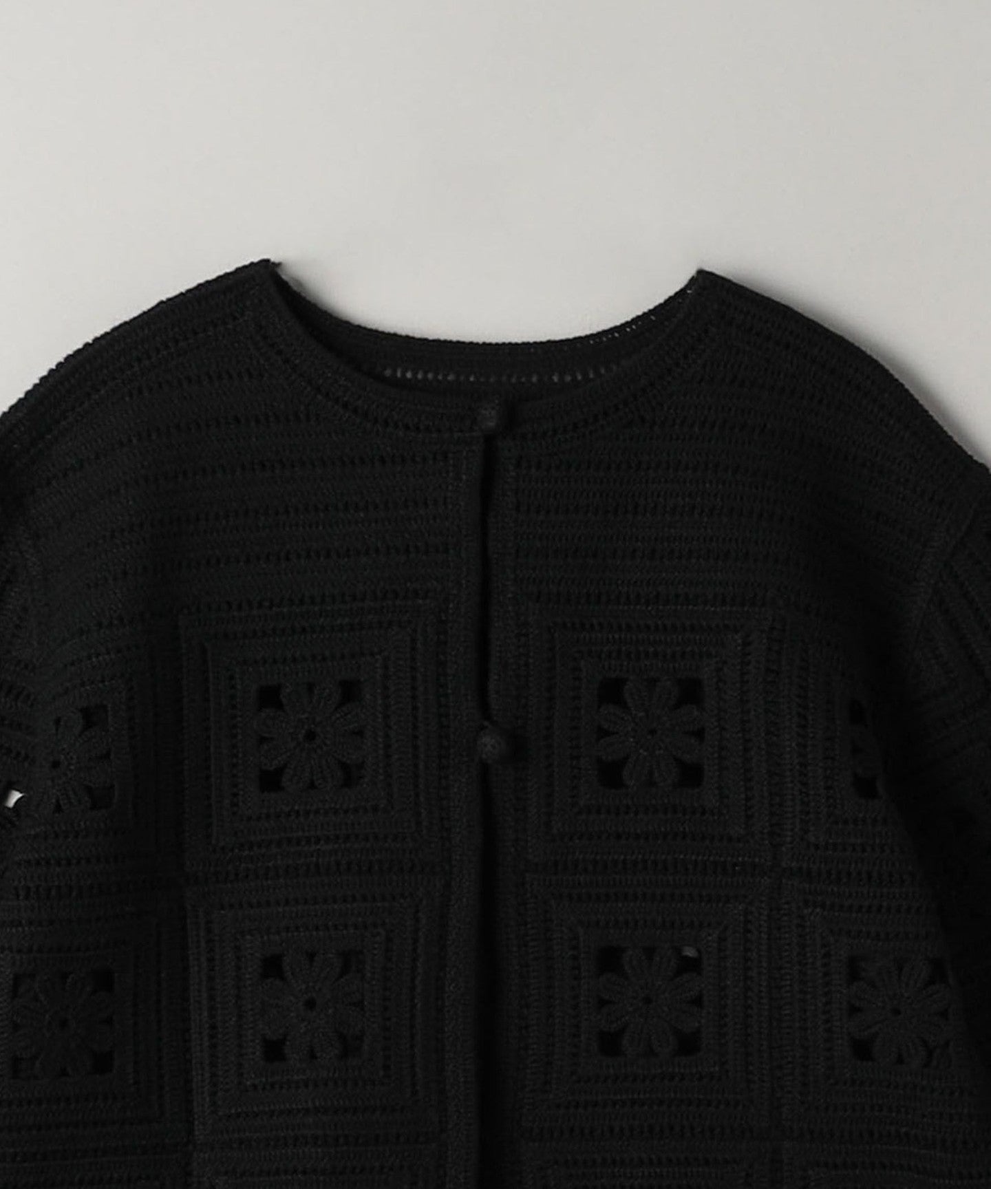 A crochet-style cardigan featuring a continuous square motif pattern.