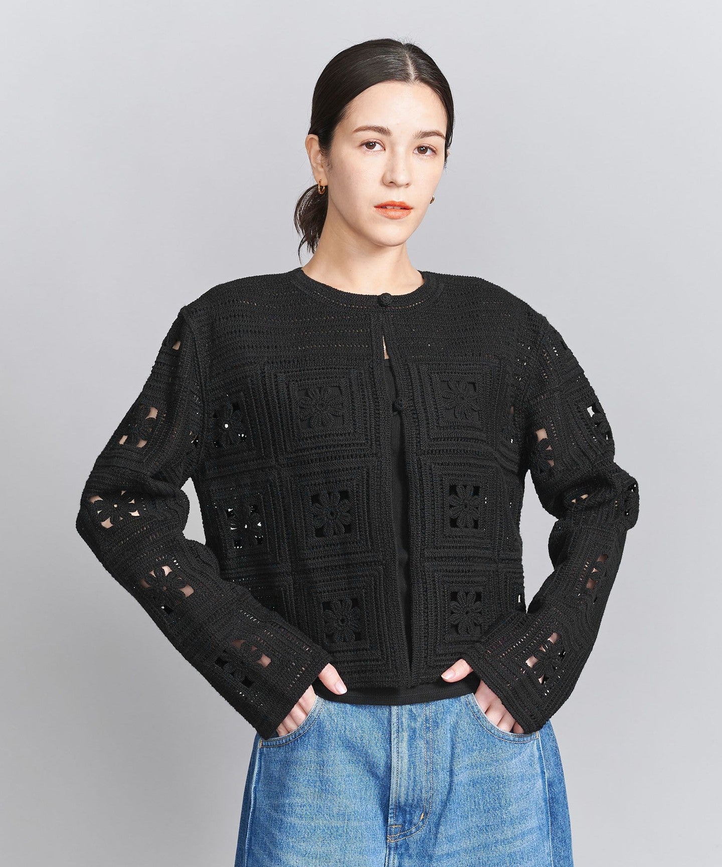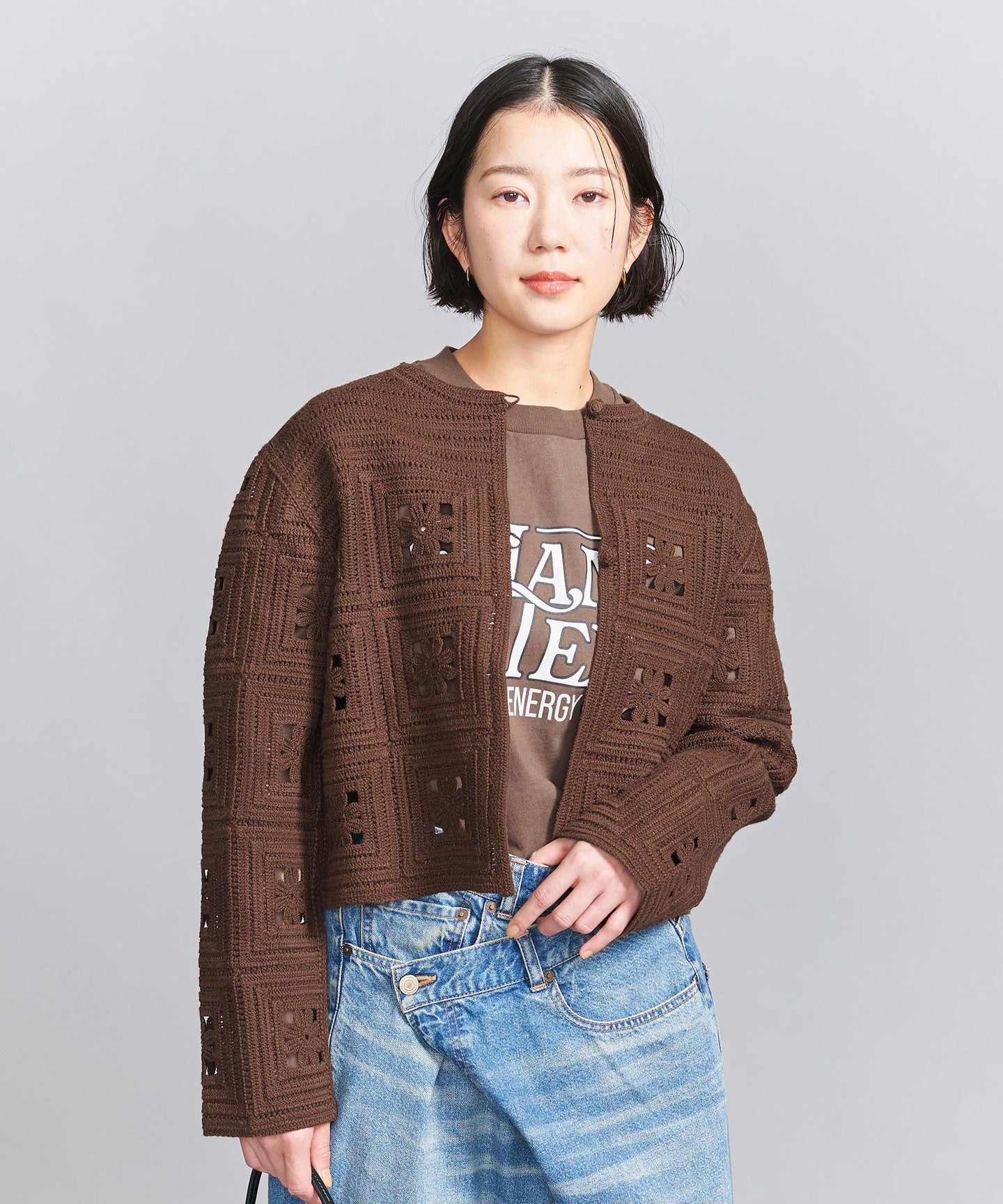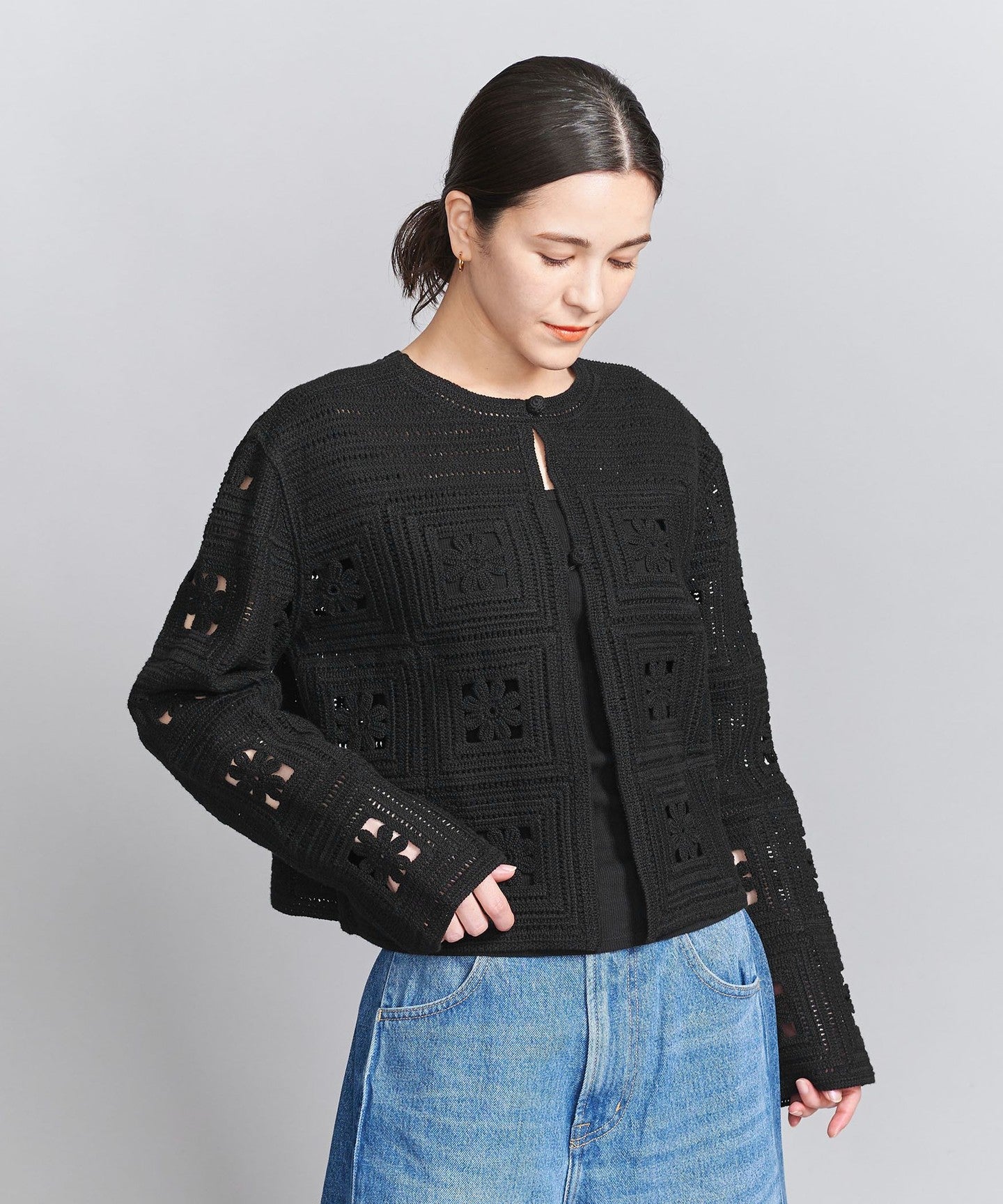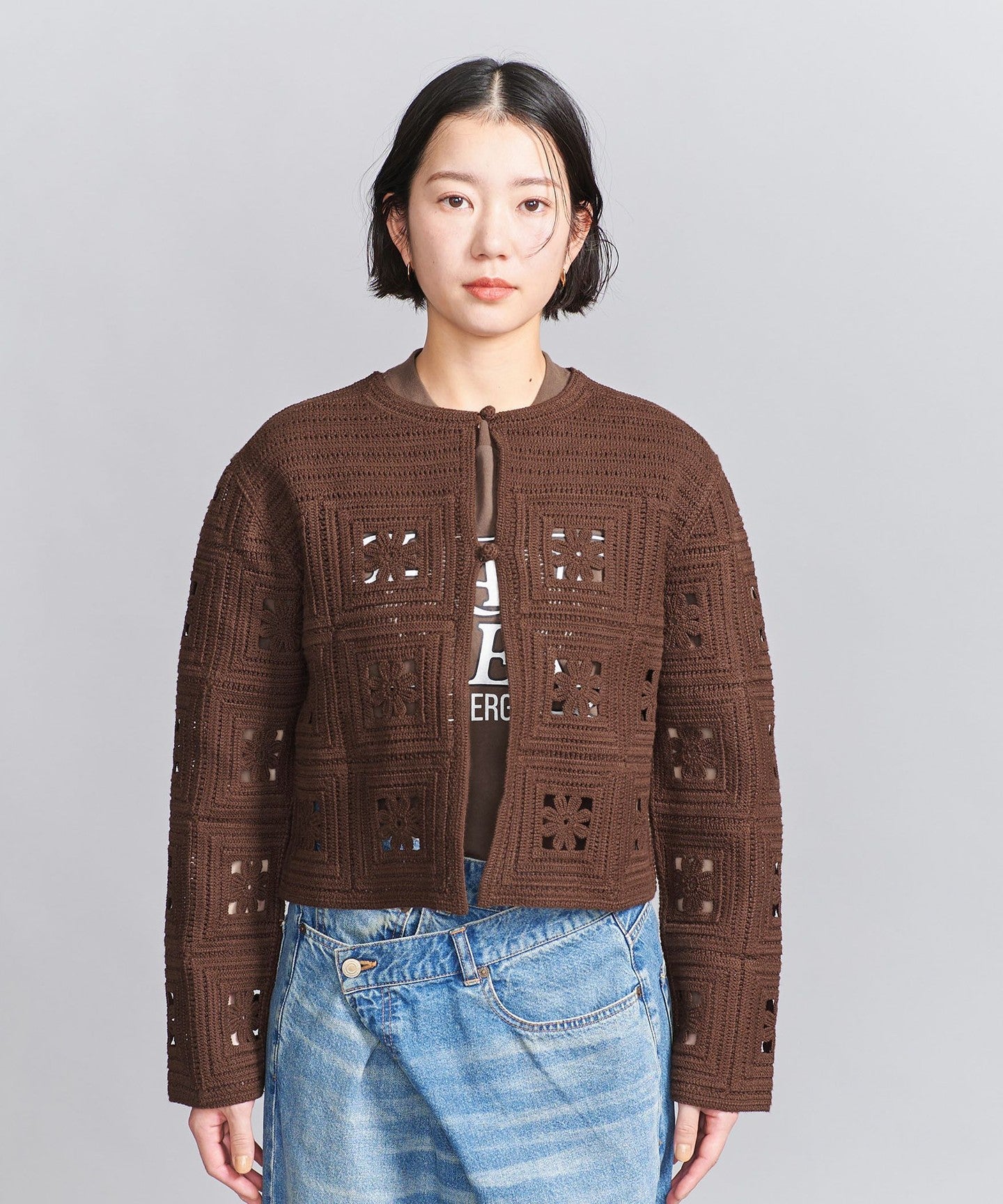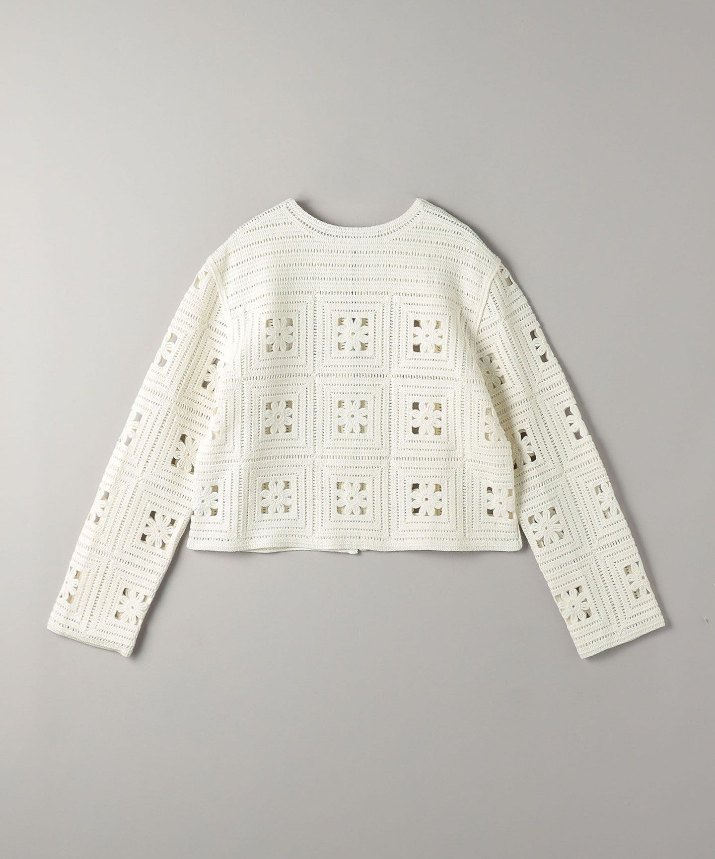 A crochet-style cardigan featuring a continuous square motif pattern.
