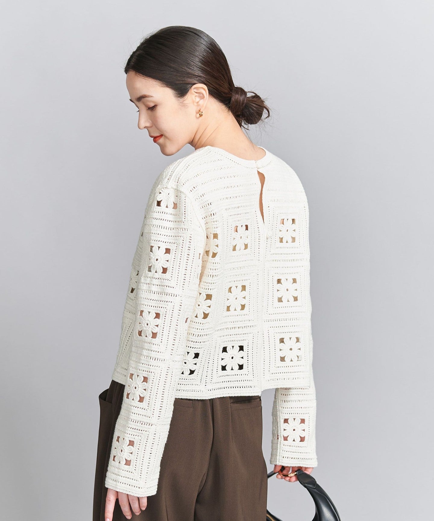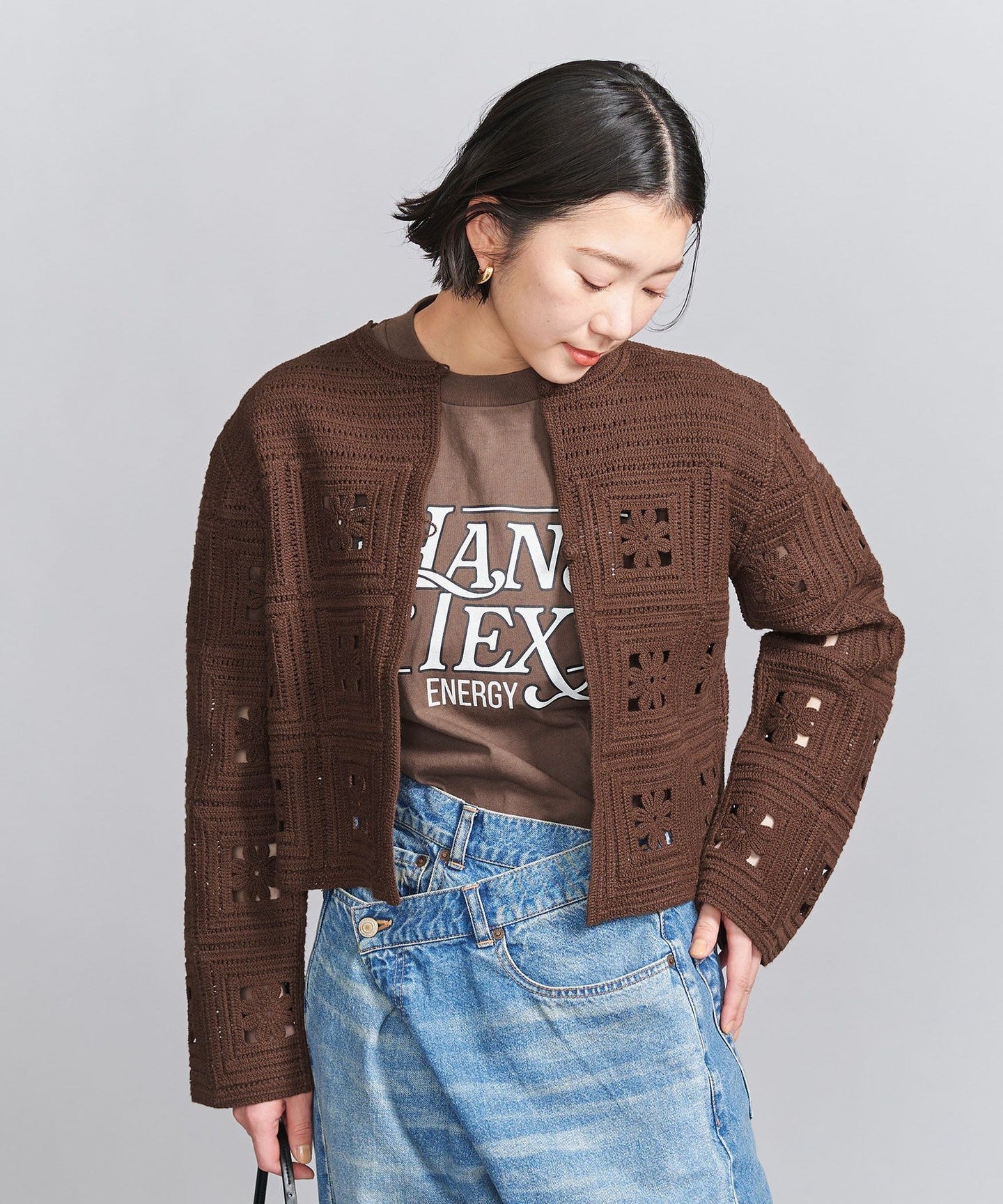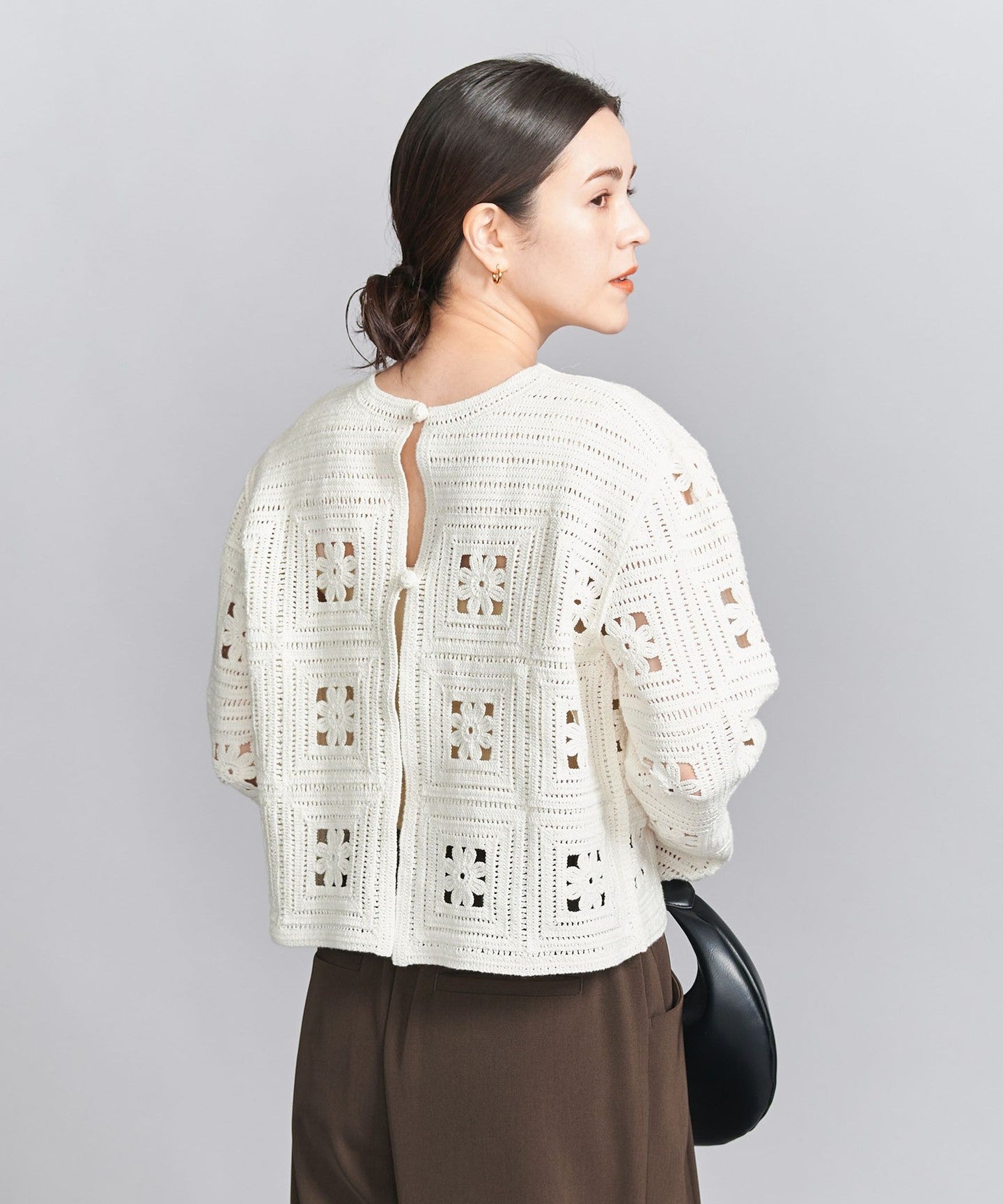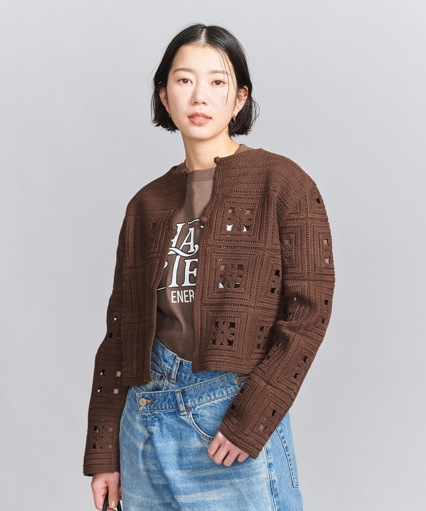 A crochet-style cardigan featuring a continuous square motif pattern.